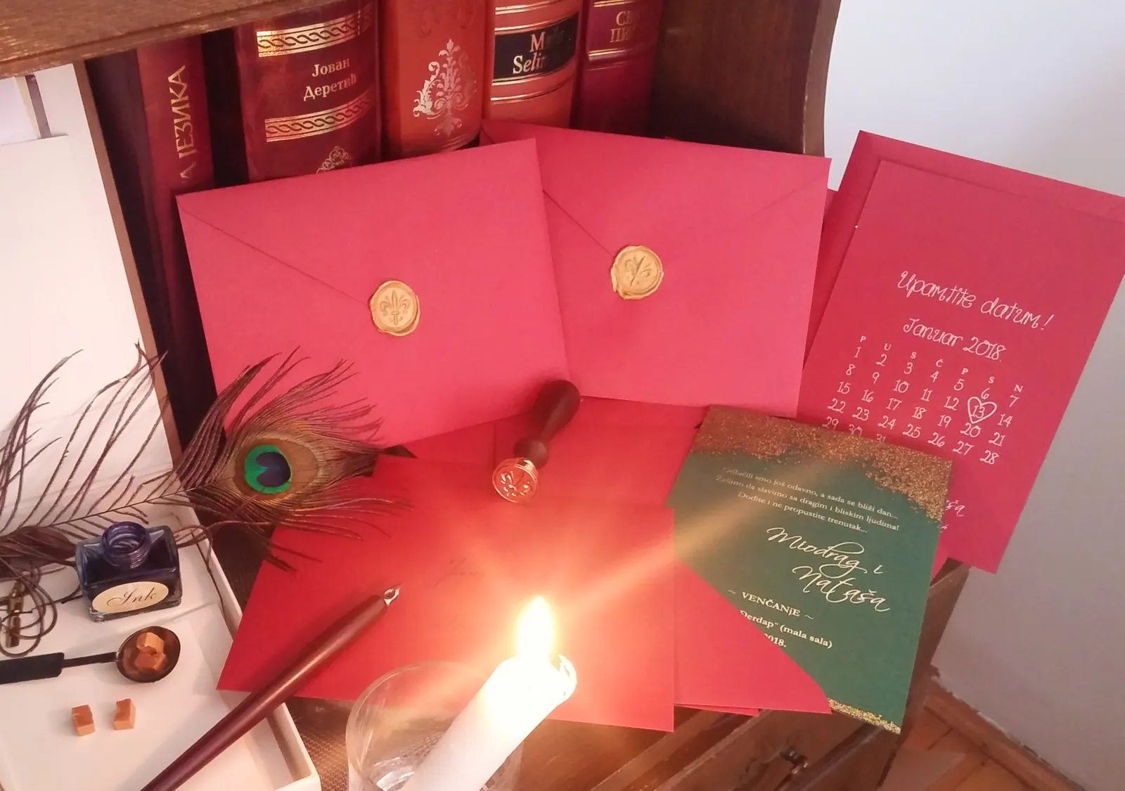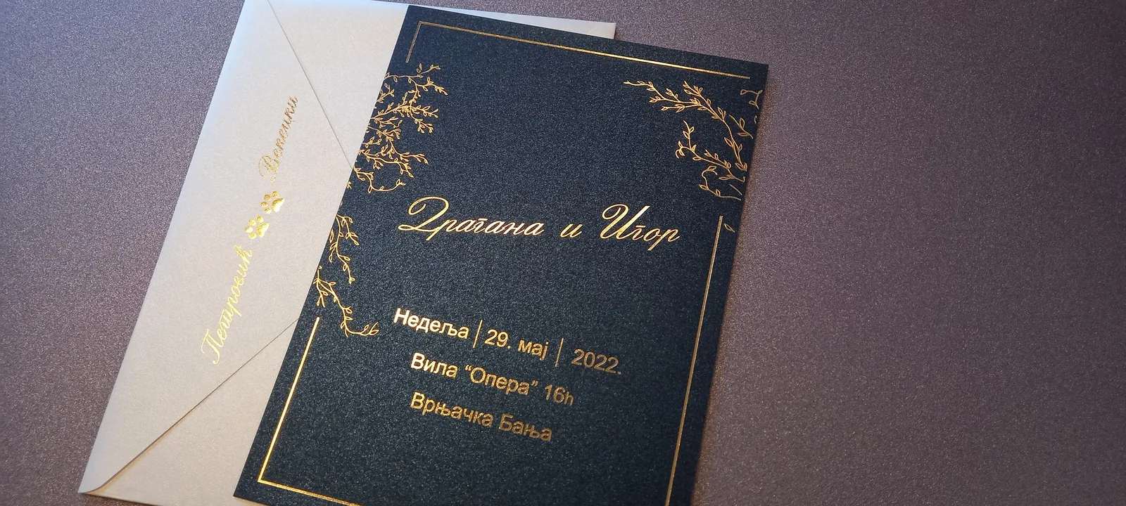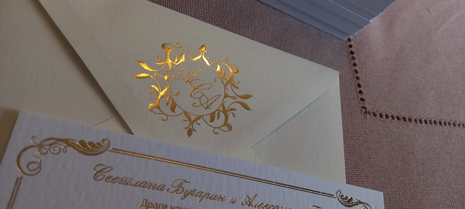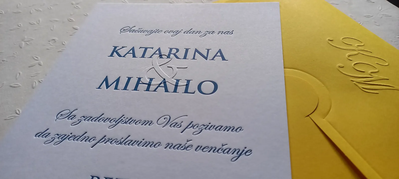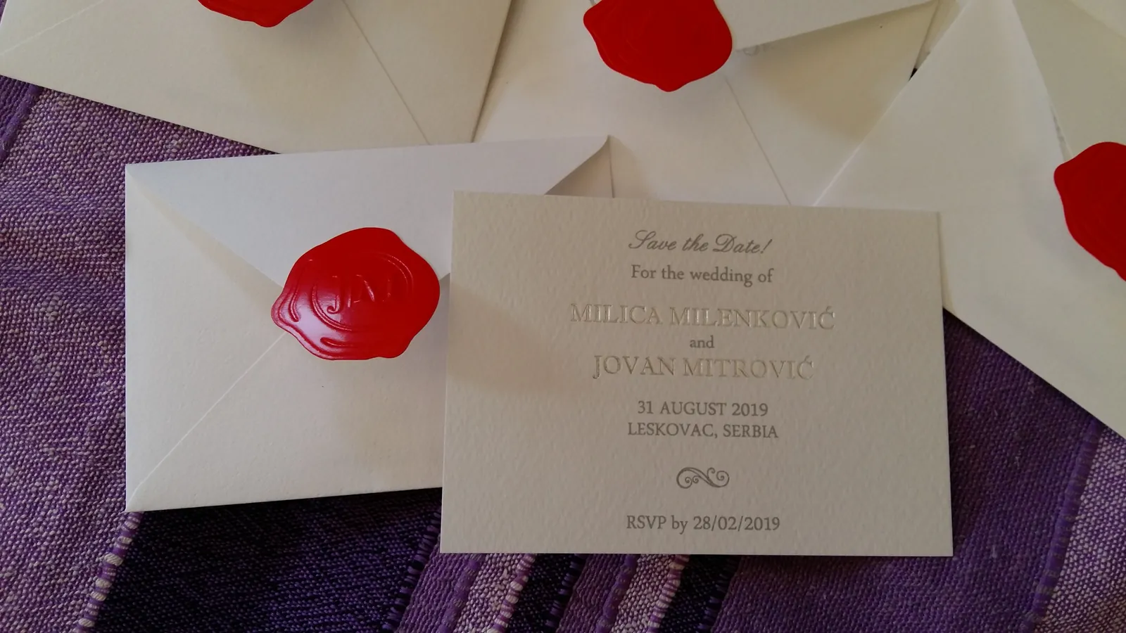 Na kovertama štampamo često inicijale u zlatotisku ili reljefnoj štampi, blindruku. Pečati od voska su prelep ukras za zatvaranje koverata ili pečati od papira sa inicijalima mladencima. Osim naših modela, IZRAĐUJEMO POZIVNICE PO VAŠOJ ŽELJI I VAŠEM DIZAJNU!
