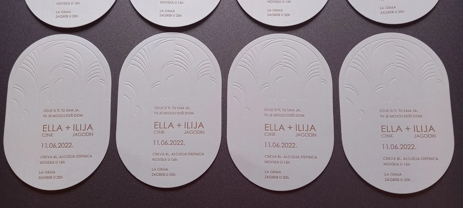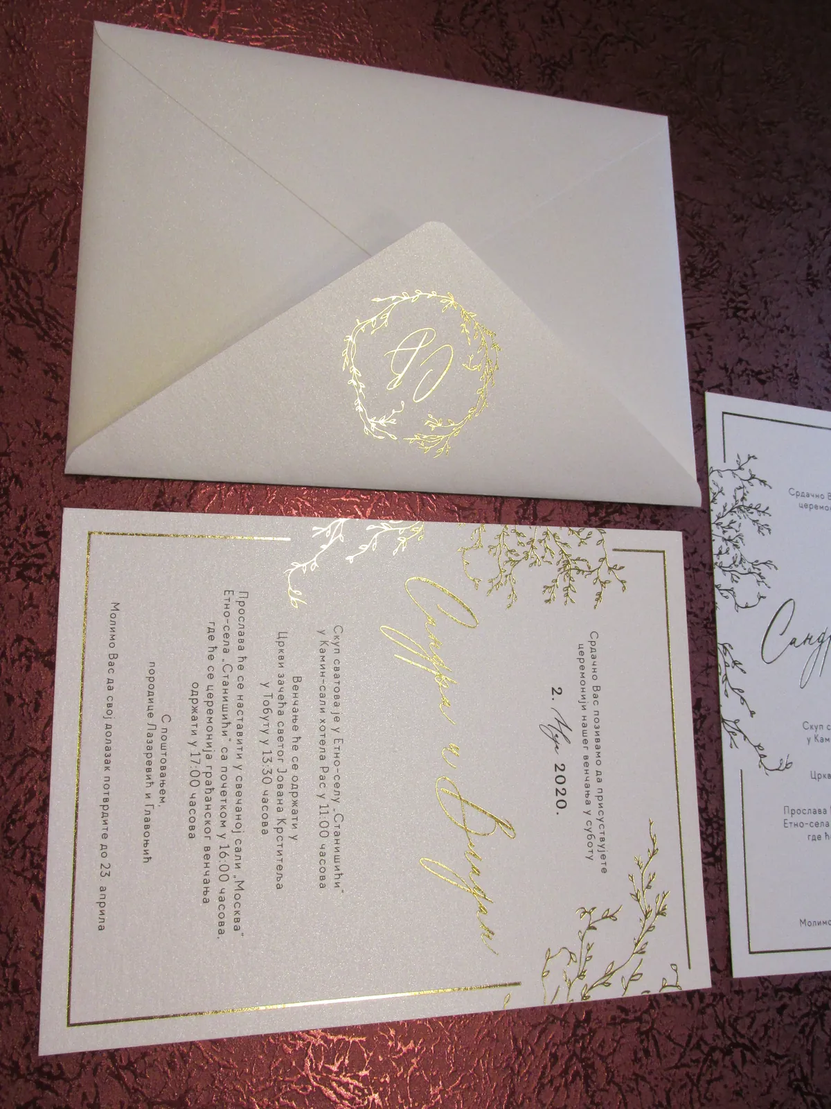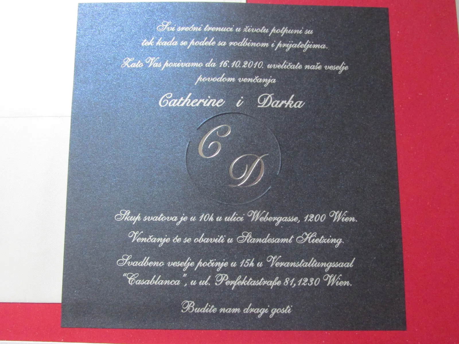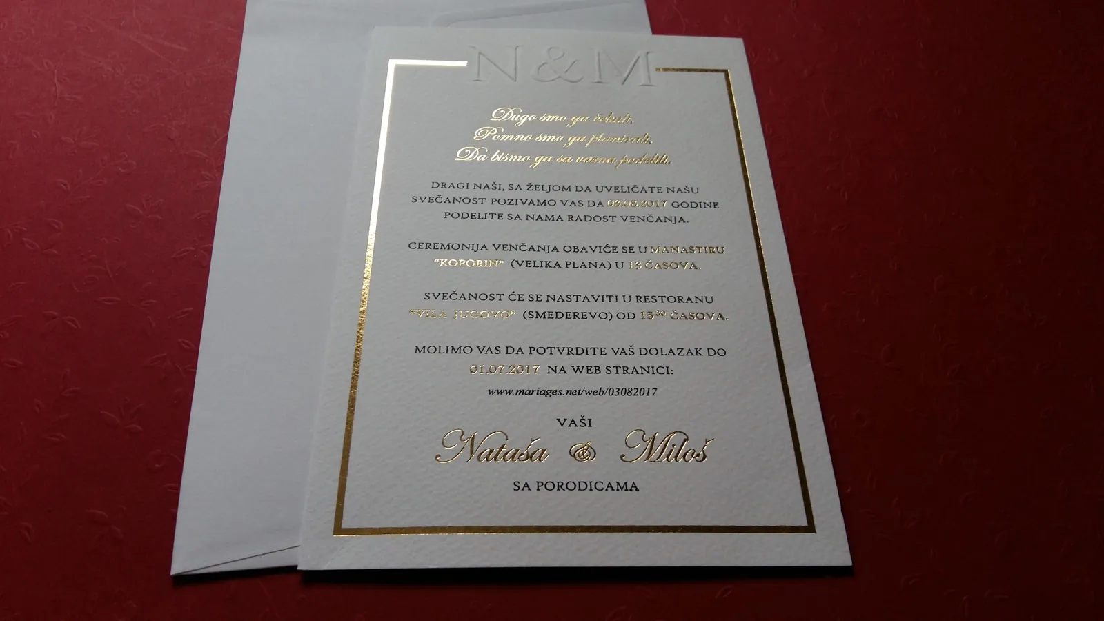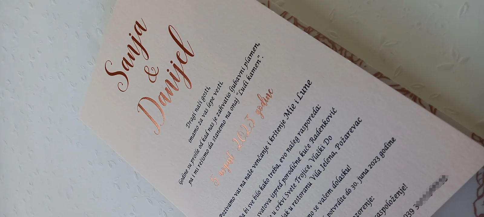 Na kovertama štampamo često inicijale u zlatotisku ili reljefnoj štampi, blindruku. Pečati od voska su prelep ukras za zatvaranje koverata ili pečati od papira sa inicijalima mladencima. Osim naših modela, IZRAĐUJEMO POZIVNICE PO VAŠOJ ŽELJI I VAŠEM DIZAJNU!