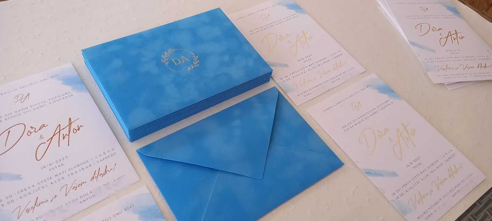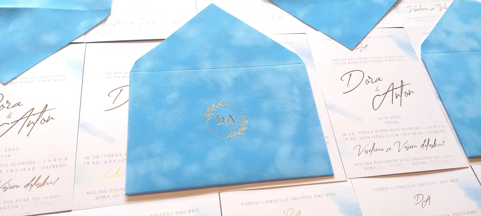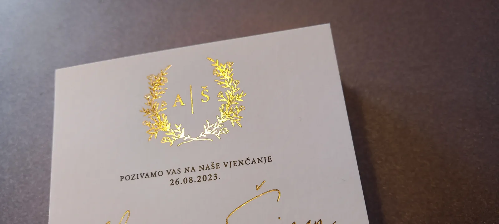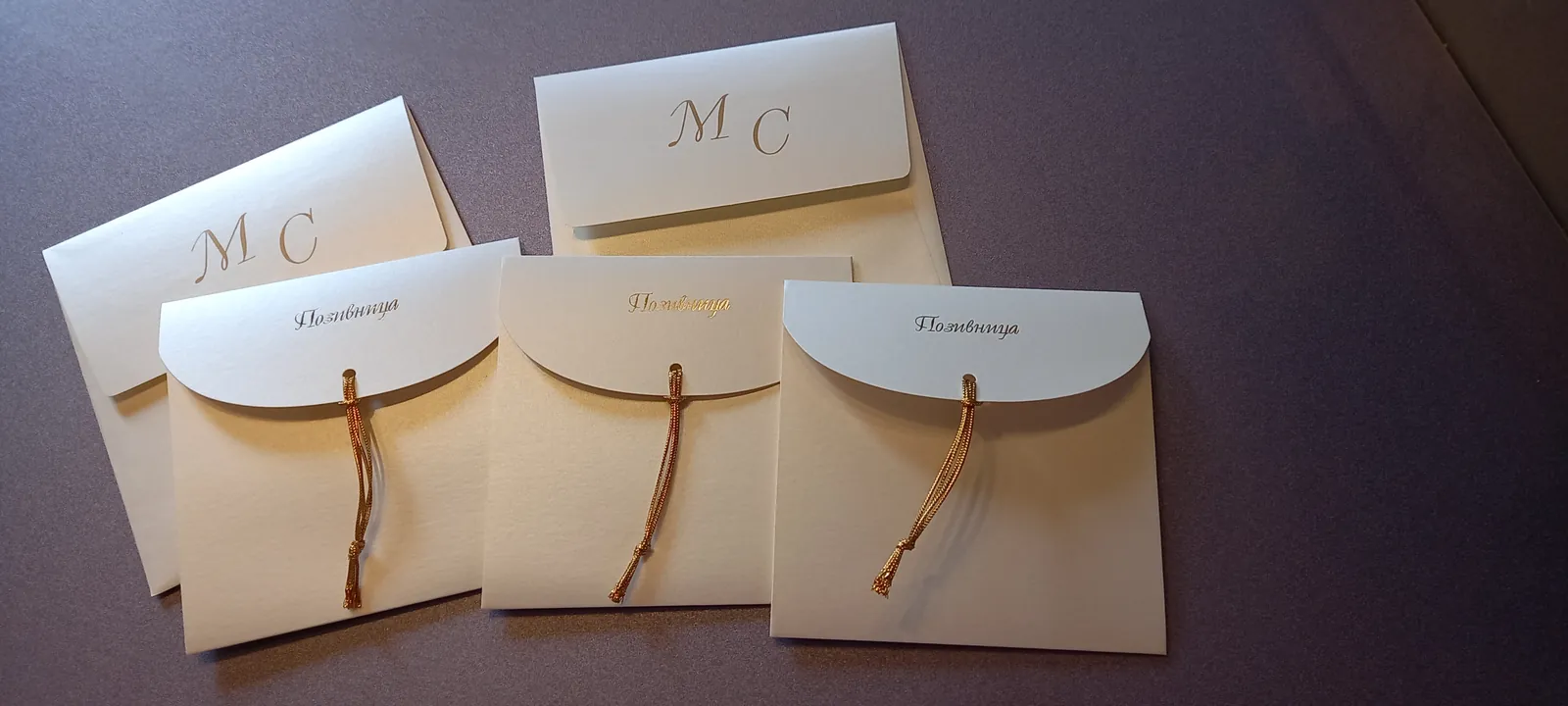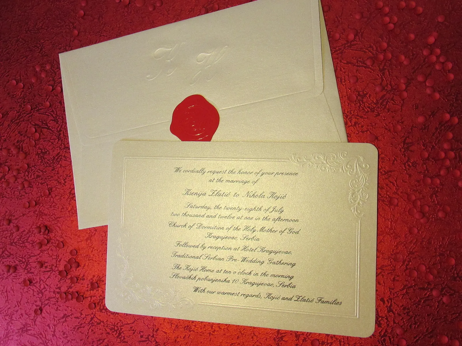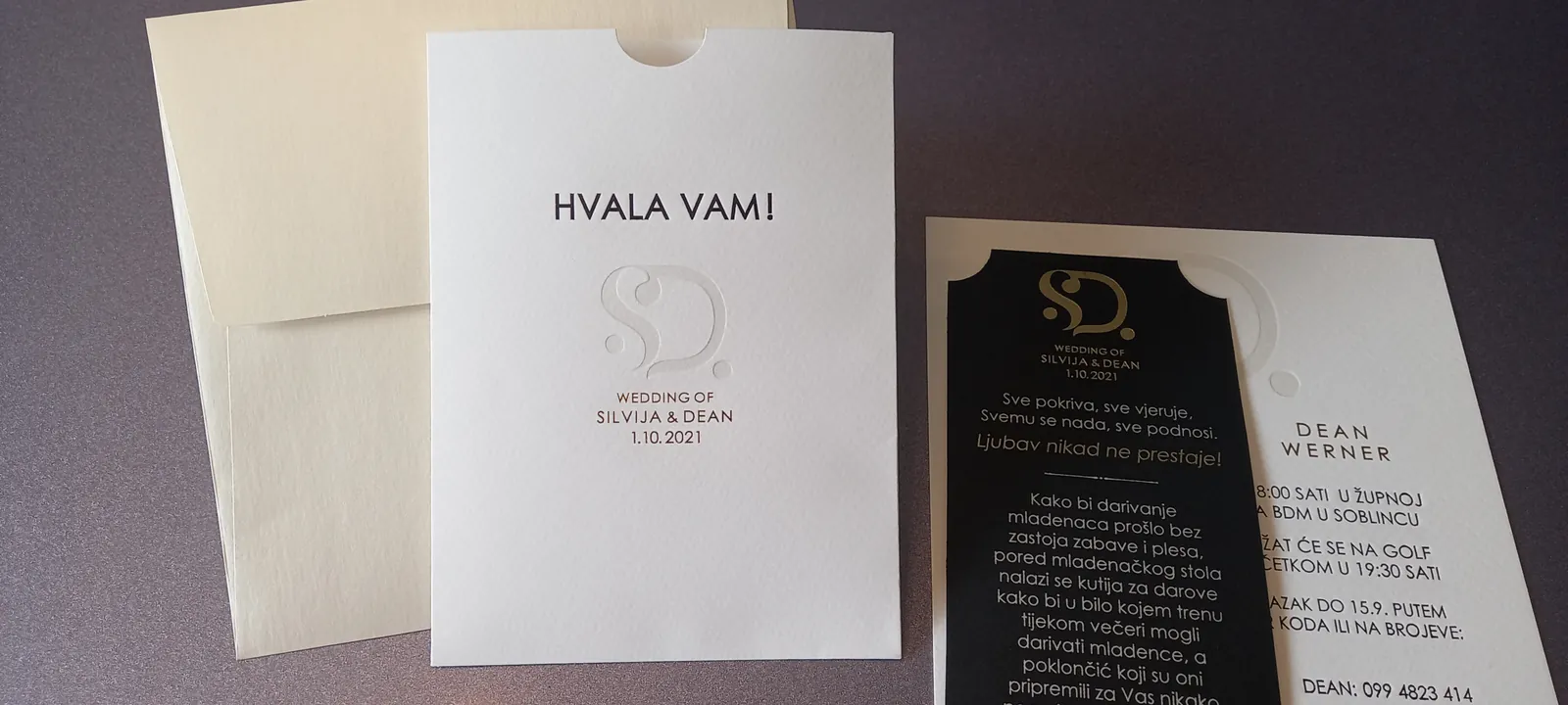 Na kovertama štampamo često inicijale u zlatotisku ili reljefnoj štampi, blindruku. Pečati od voska su prelep ukras za zatvaranje koverata ili pečati od papira sa inicijalima mladencima. Osim naših modela, IZRAĐUJEMO POZIVNICE PO VAŠOJ ŽELJI I VAŠEM DIZAJNU!