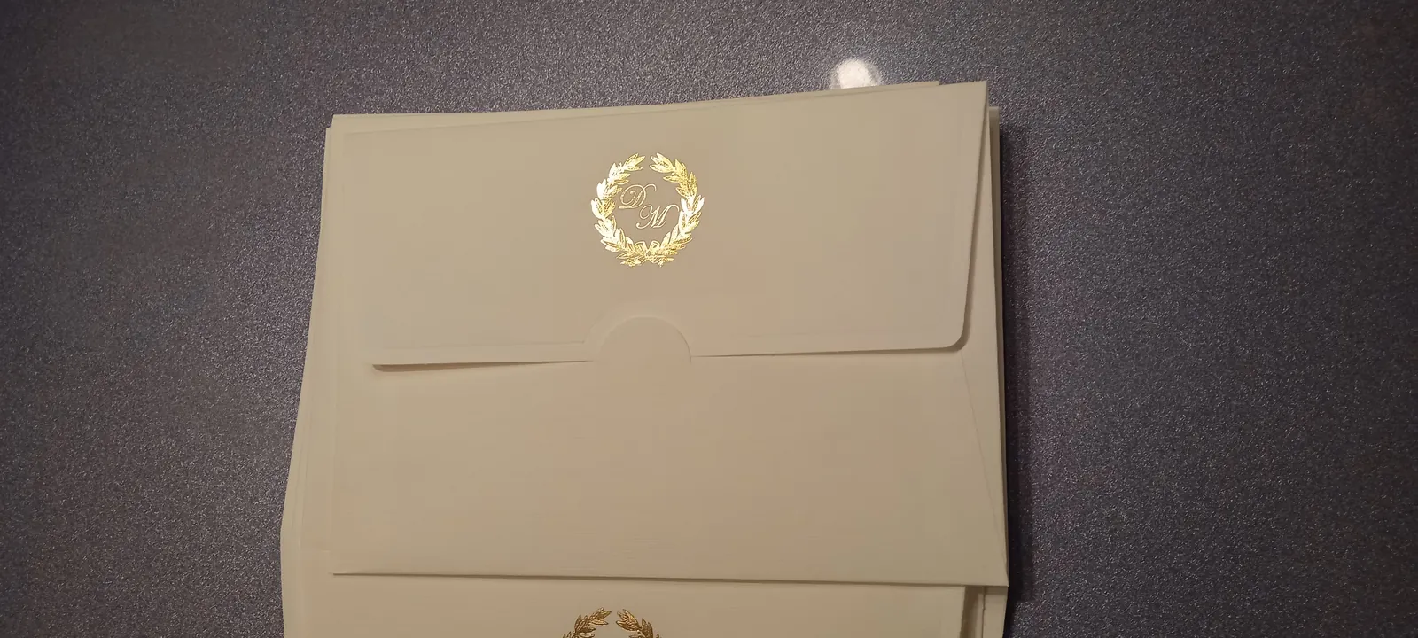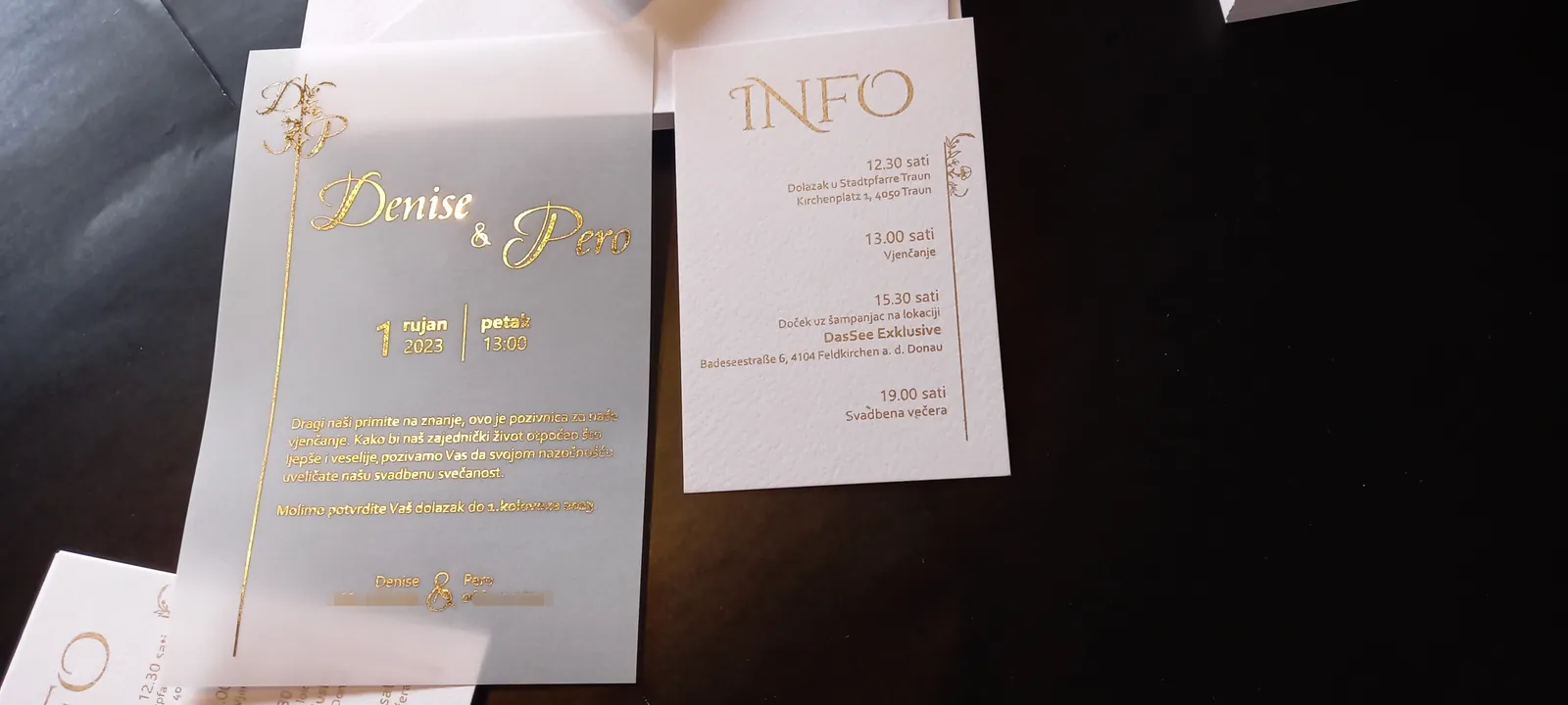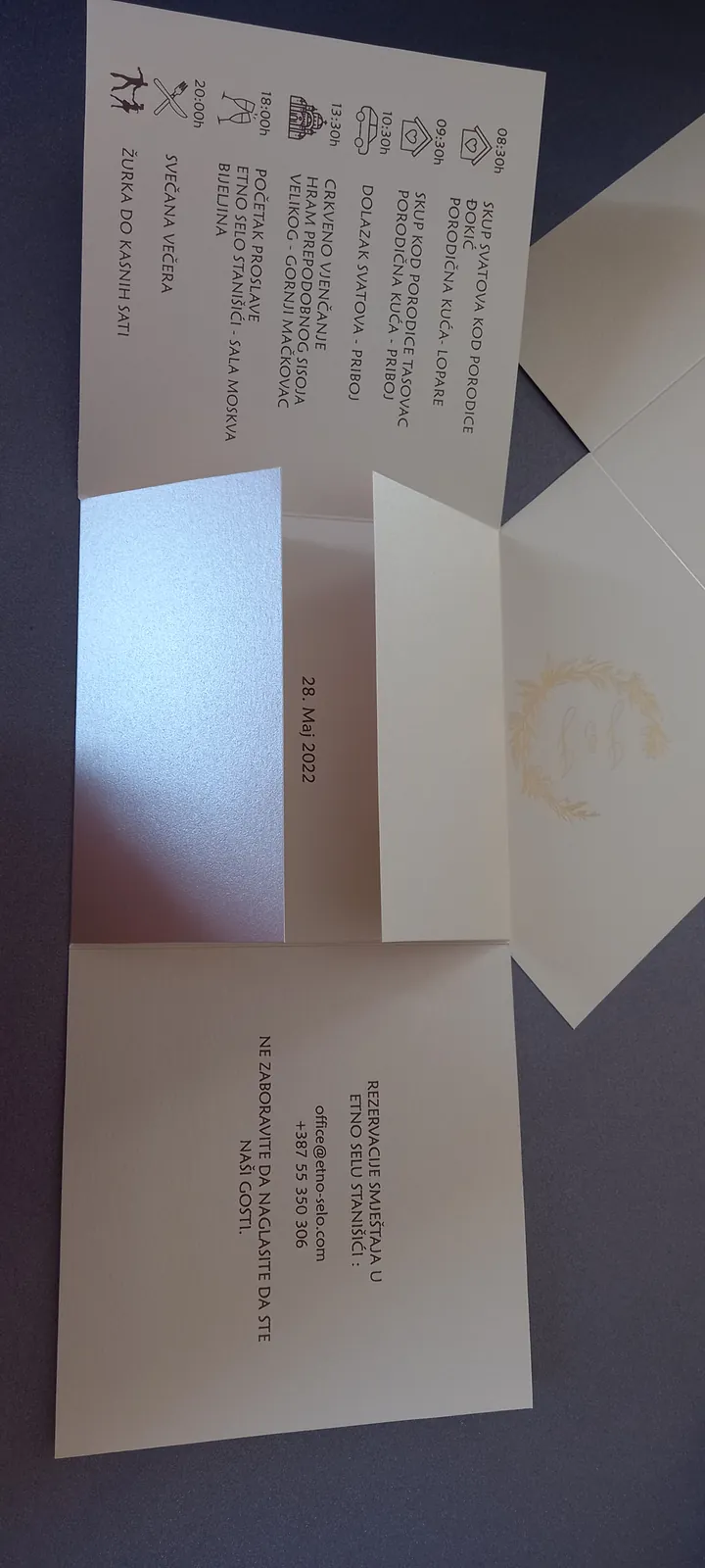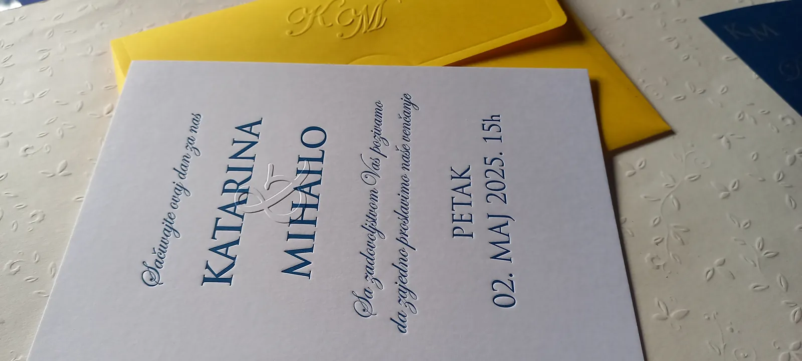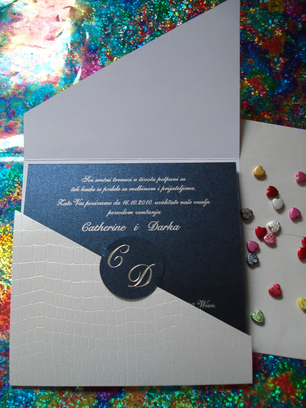 Na kovertama štampamo često inicijale u zlatotisku ili reljefnoj štampi, blindruku. Pečati od voska su prelep ukras za zatvaranje koverata ili pečati od papira sa inicijalima mladencima. Osim naših modela, IZRAĐUJEMO POZIVNICE PO VAŠOJ ŽELJI I VAŠEM DIZAJNU!