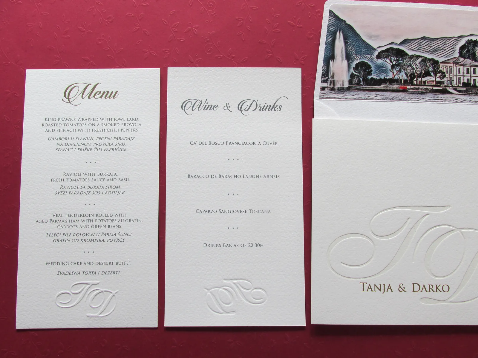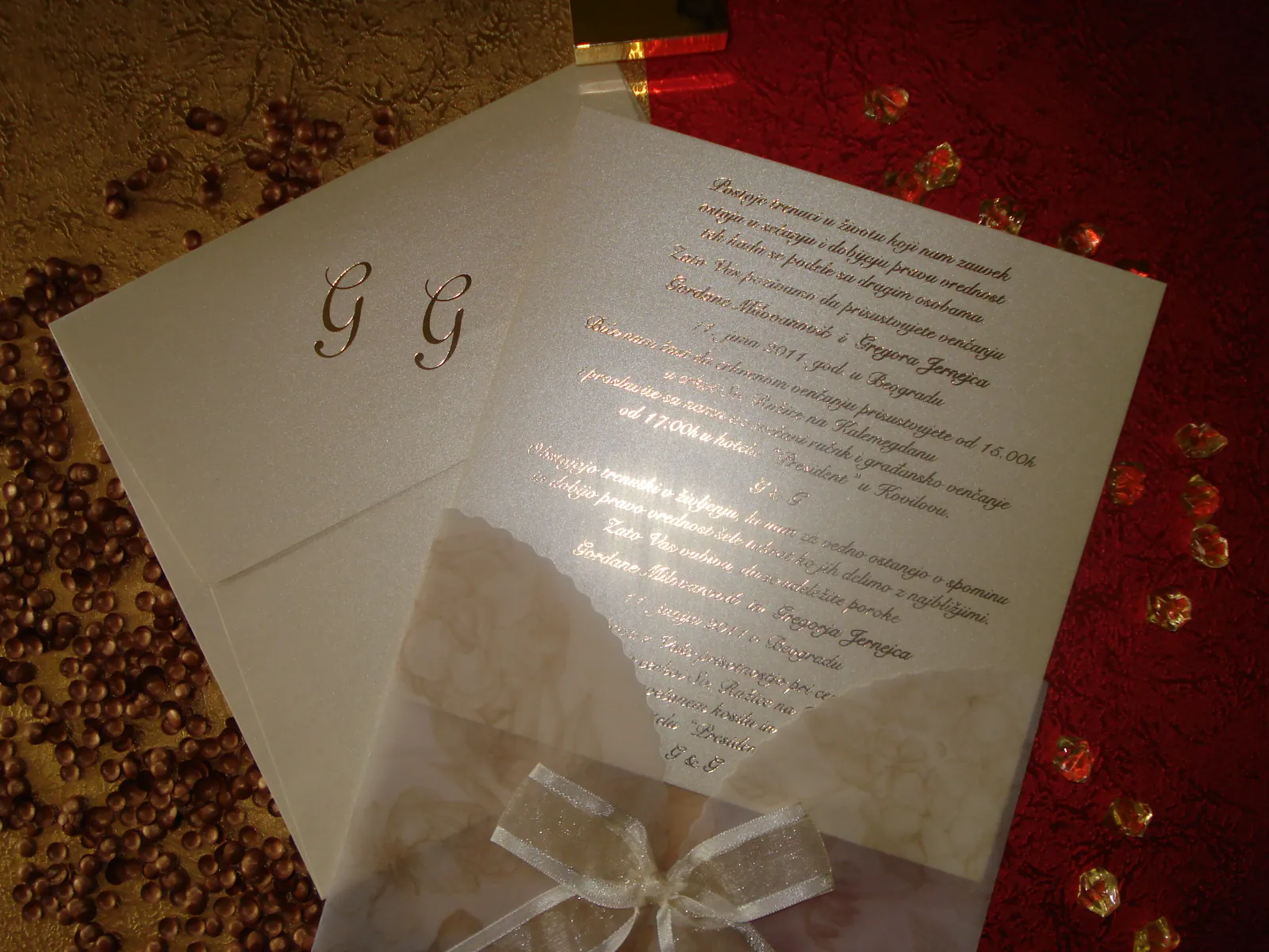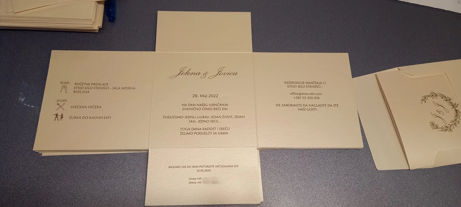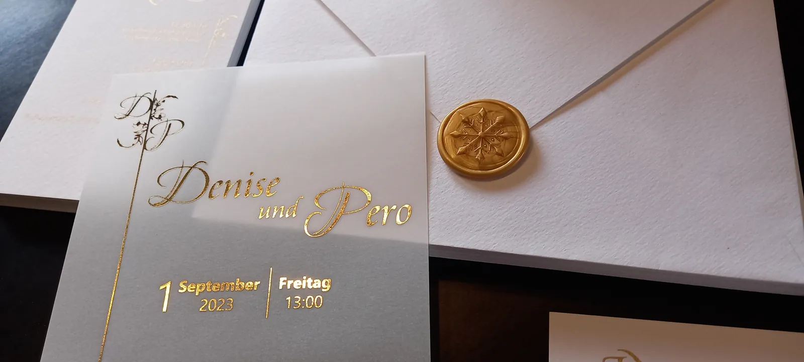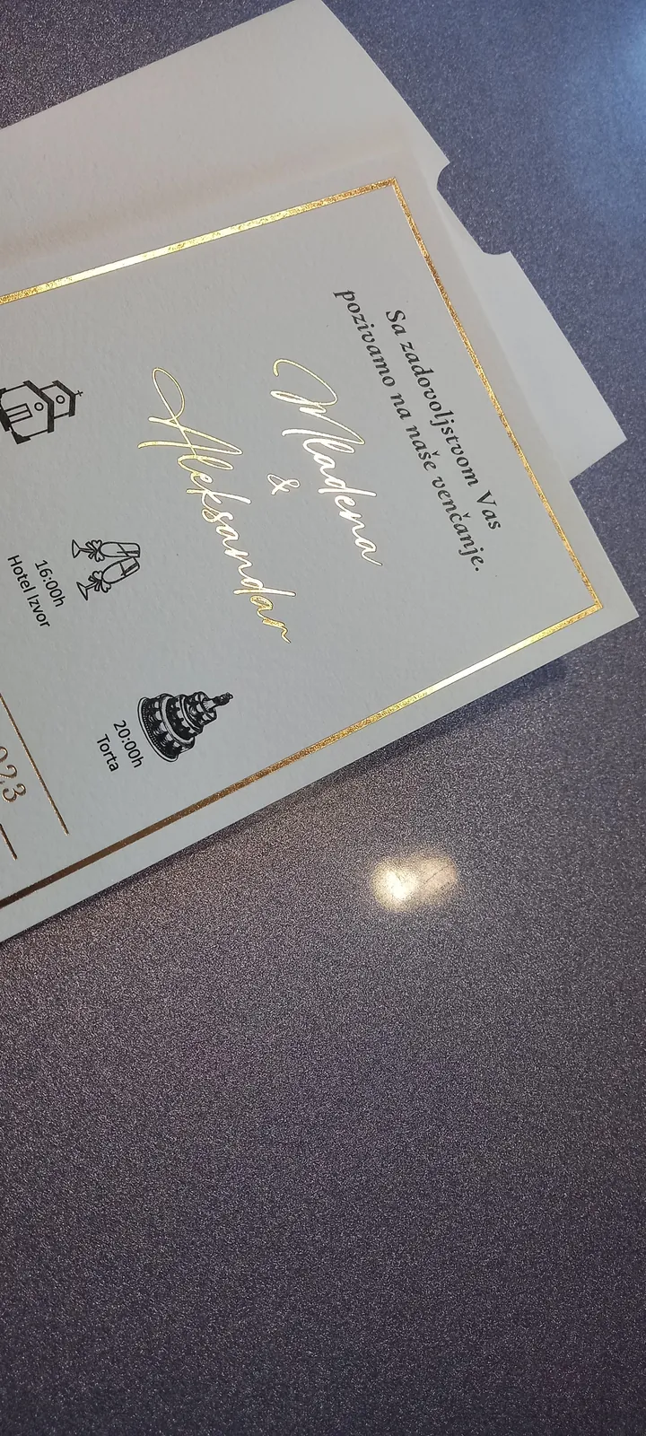 Na kovertama štampamo često inicijale u zlatotisku ili reljefnoj štampi, blindruku. Pečati od voska su prelep ukras za zatvaranje koverata ili pečati od papira sa inicijalima mladencima. Osim naših modela, IZRAĐUJEMO POZIVNICE PO VAŠOJ ŽELJI I VAŠEM DIZAJNU!
