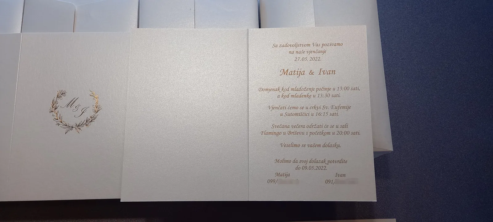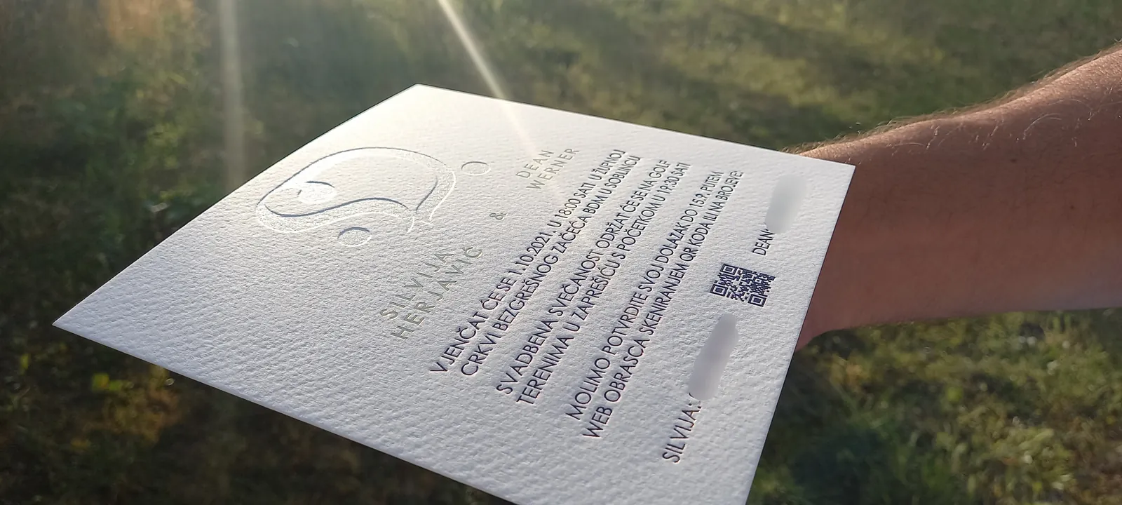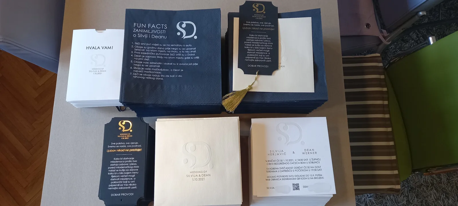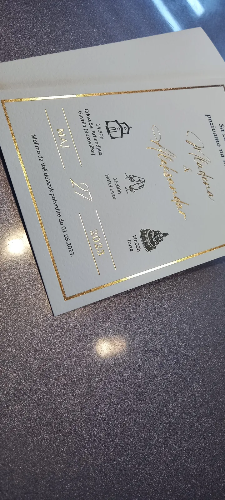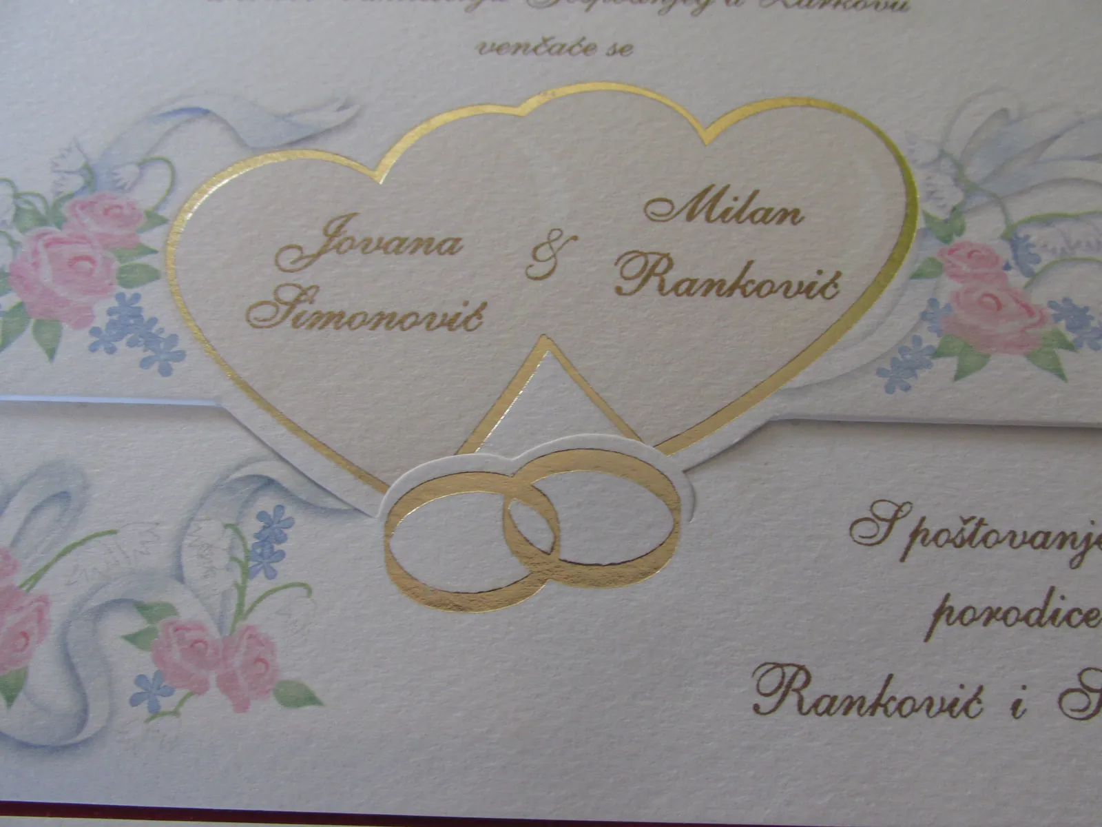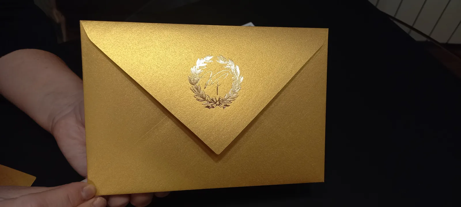 Na kovertama štampamo često inicijale u zlatotisku ili reljefnoj štampi, blindruku. Pečati od voska su prelep ukras za zatvaranje koverata ili pečati od papira sa inicijalima mladencima. Osim naših modela, IZRAĐUJEMO POZIVNICE PO VAŠOJ ŽELJI I VAŠEM DIZAJNU!