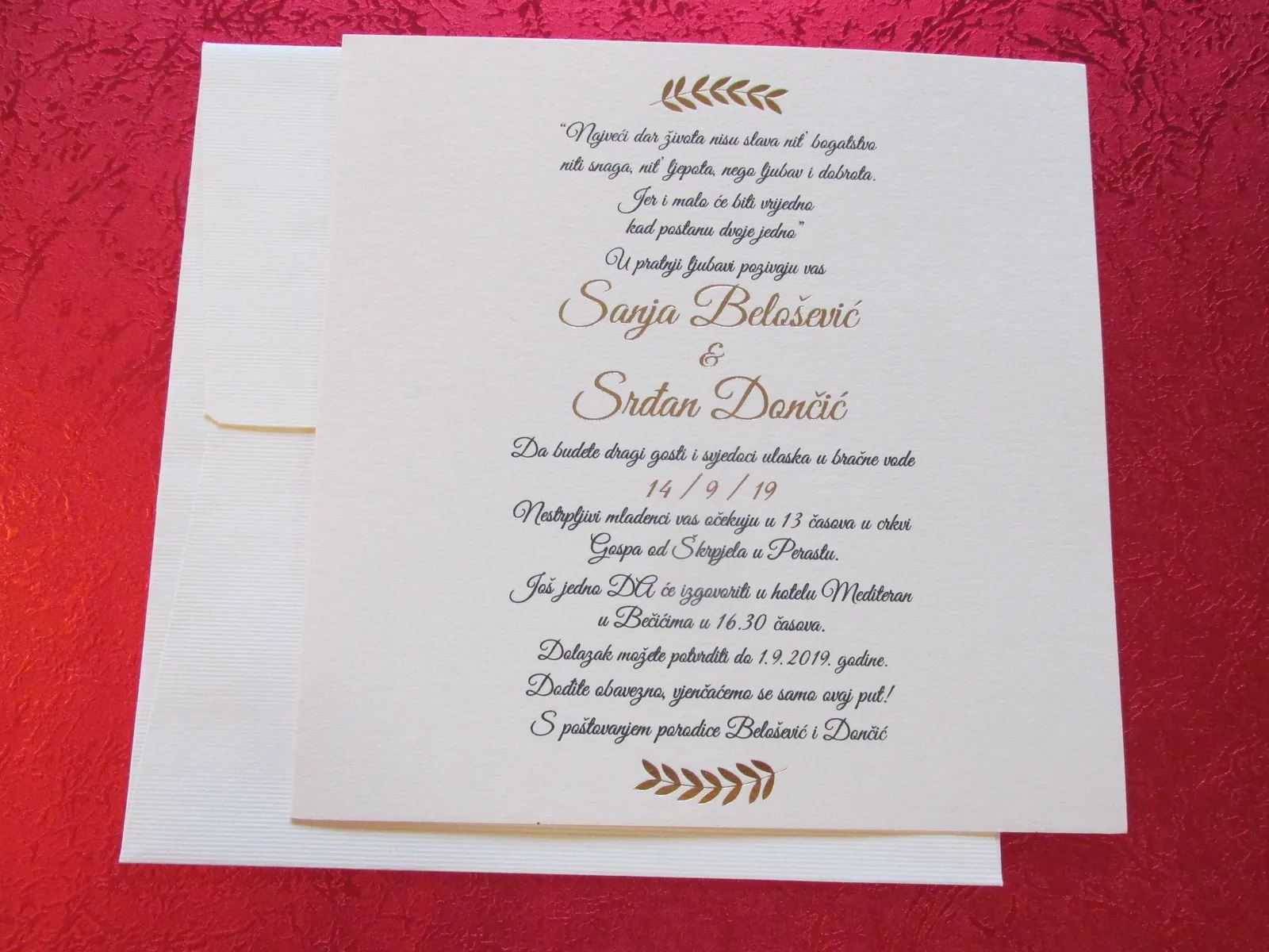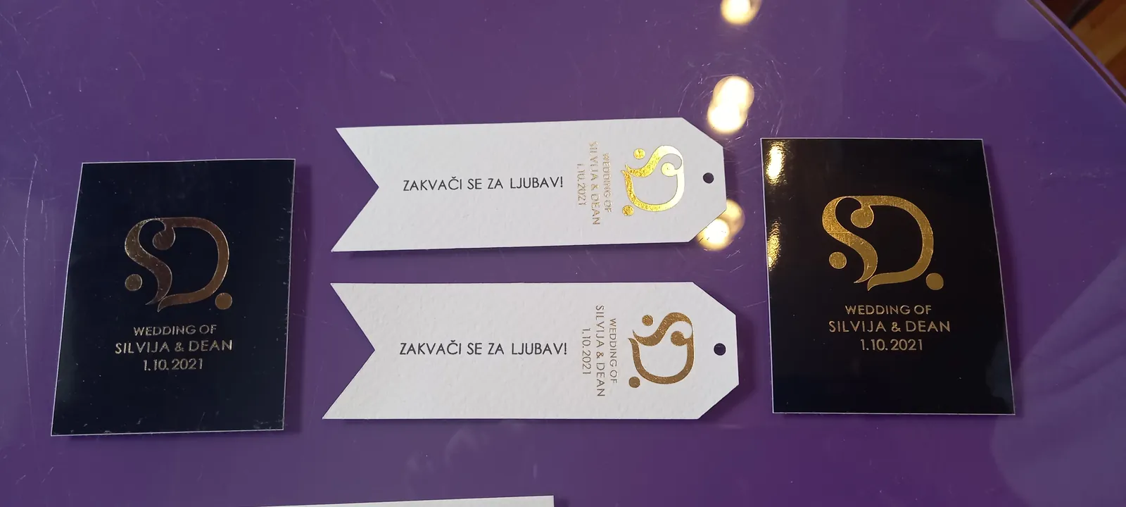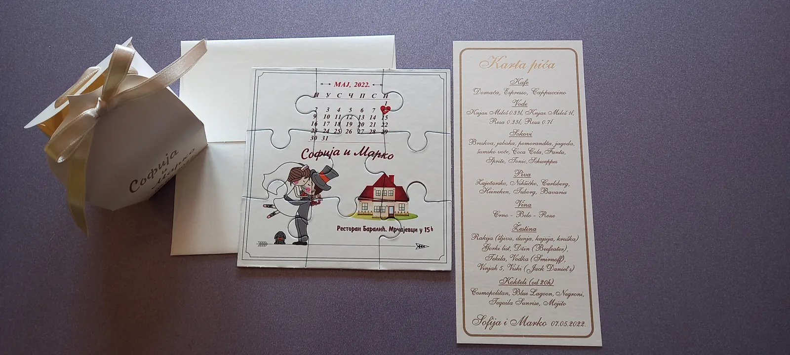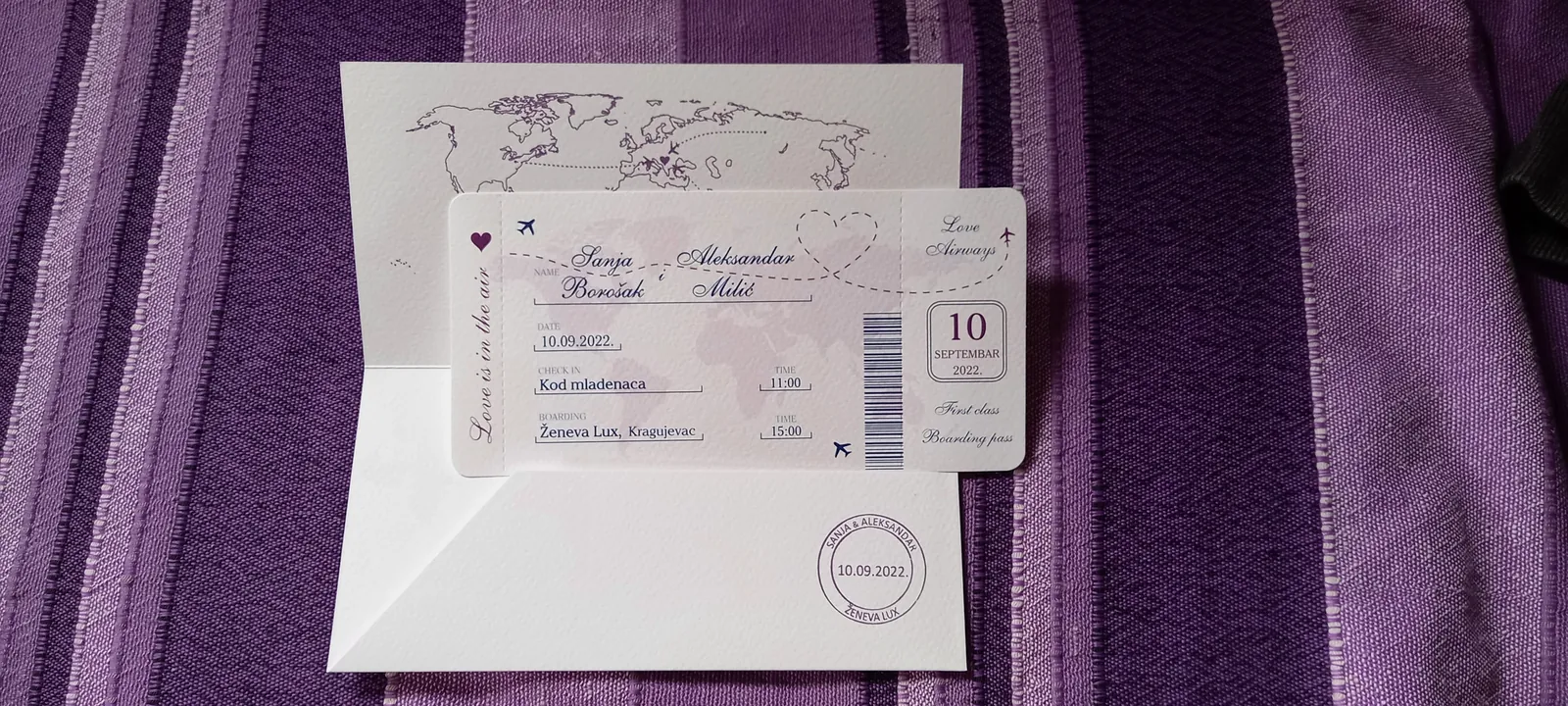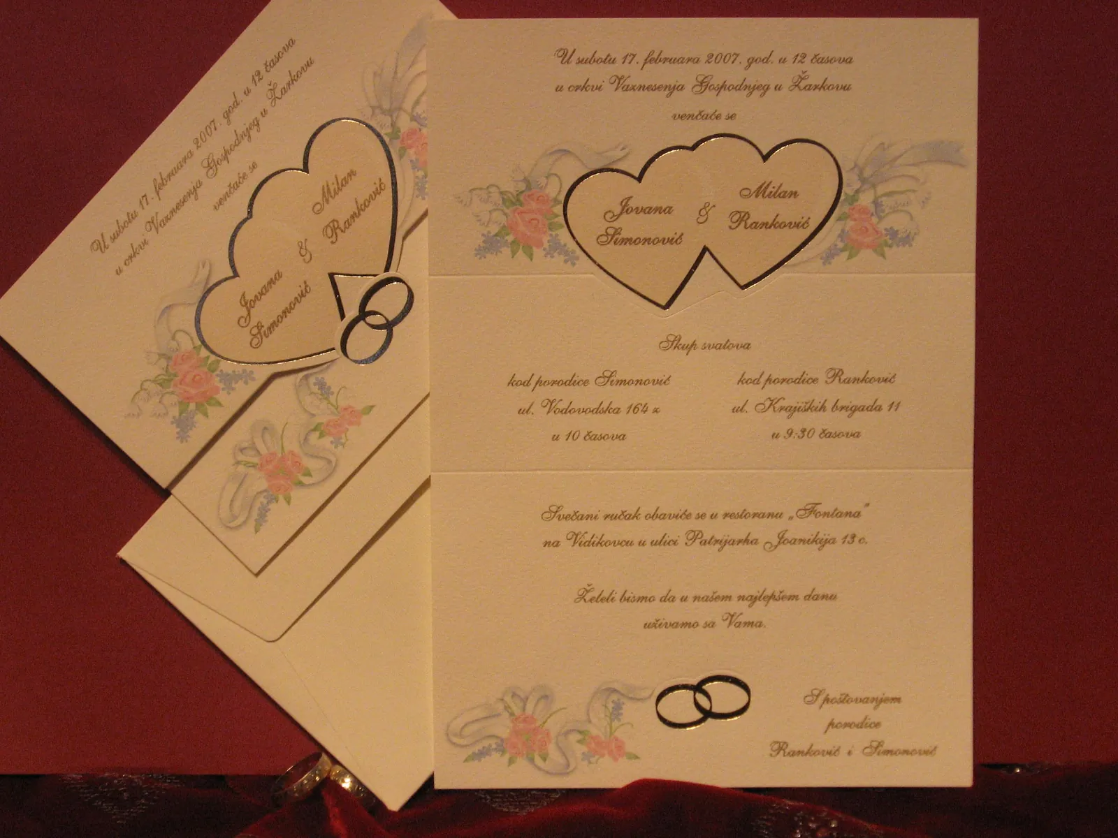Na kovertama štampamo često inicijale u zlatotisku ili reljefnoj štampi, blindruku. Pečati od voska su prelep ukras za zatvaranje koverata ili pečati od papira sa inicijalima mladencima. Osim naših modela, IZRAĐUJEMO POZIVNICE PO VAŠOJ ŽELJI I VAŠEM DIZAJNU!
