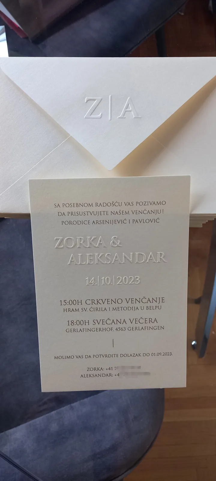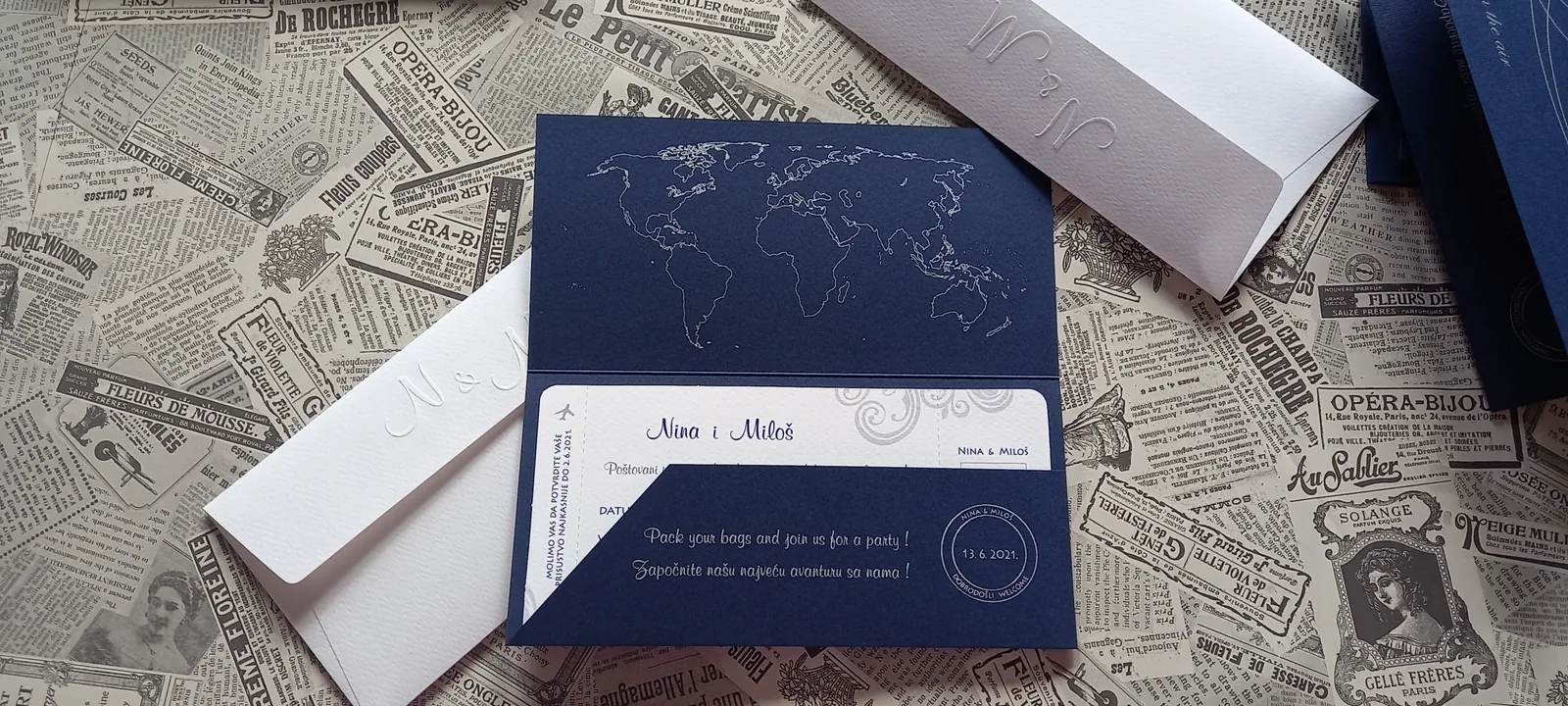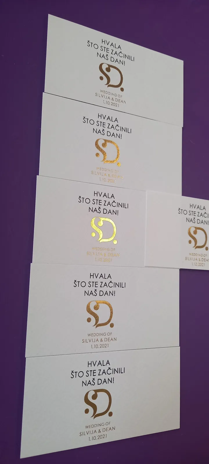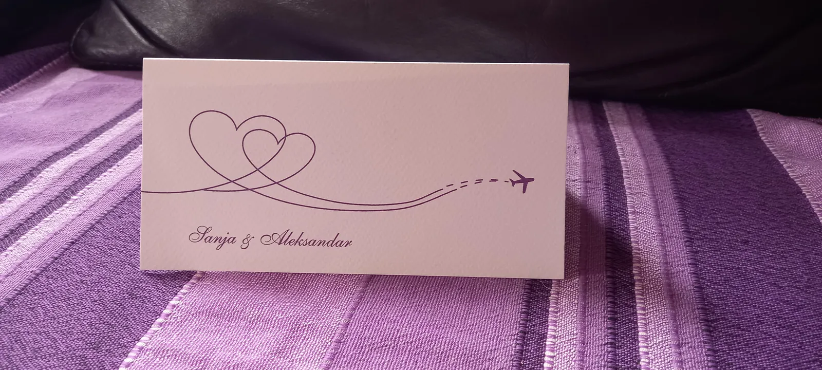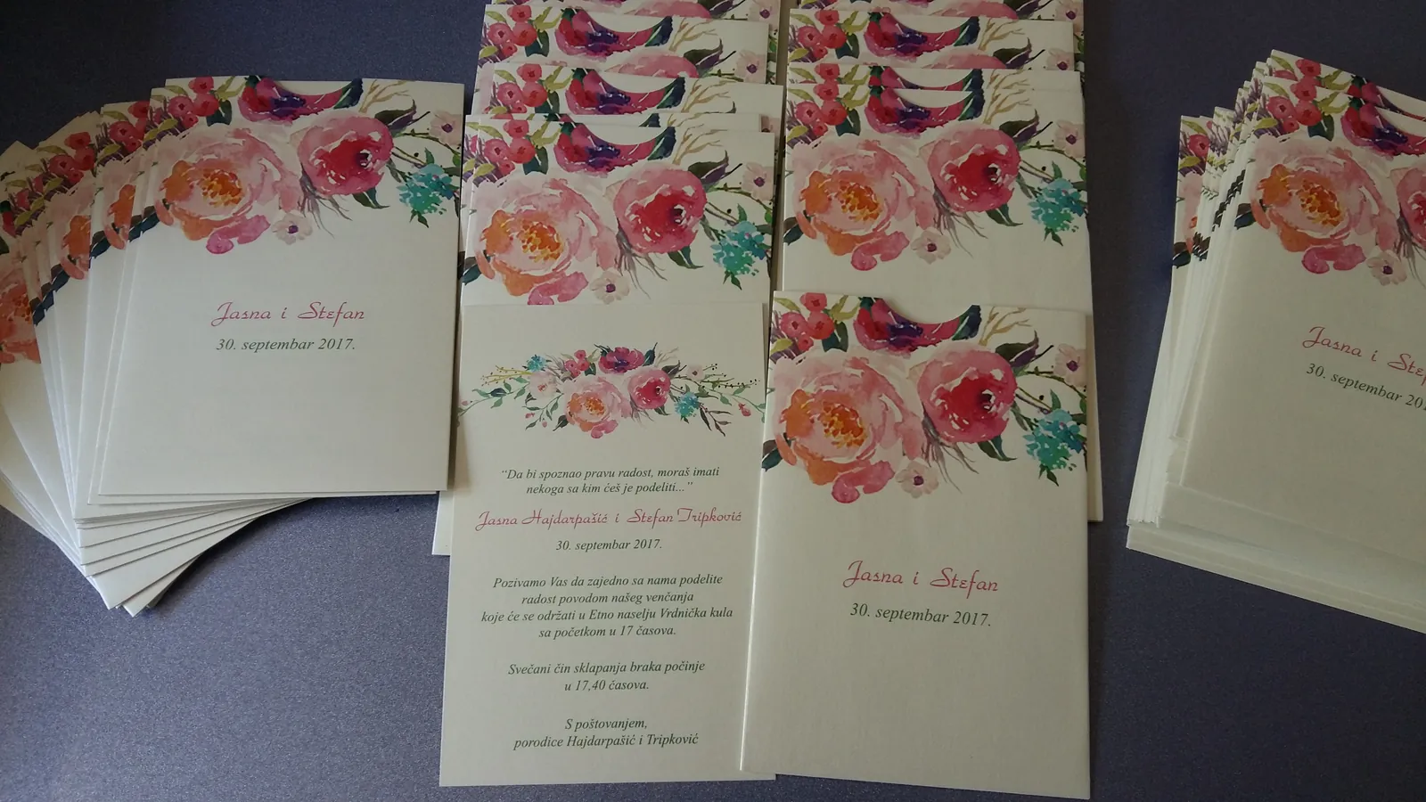 Na kovertama štampamo često inicijale u zlatotisku ili reljefnoj štampi, blindruku. Pečati od voska su prelep ukras za zatvaranje koverata ili pečati od papira sa inicijalima mladencima. Osim naših modela, IZRAĐUJEMO POZIVNICE PO VAŠOJ ŽELJI I VAŠEM DIZAJNU!