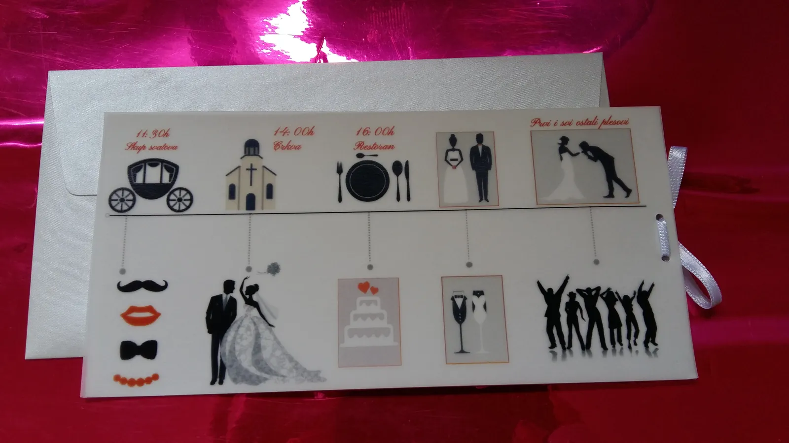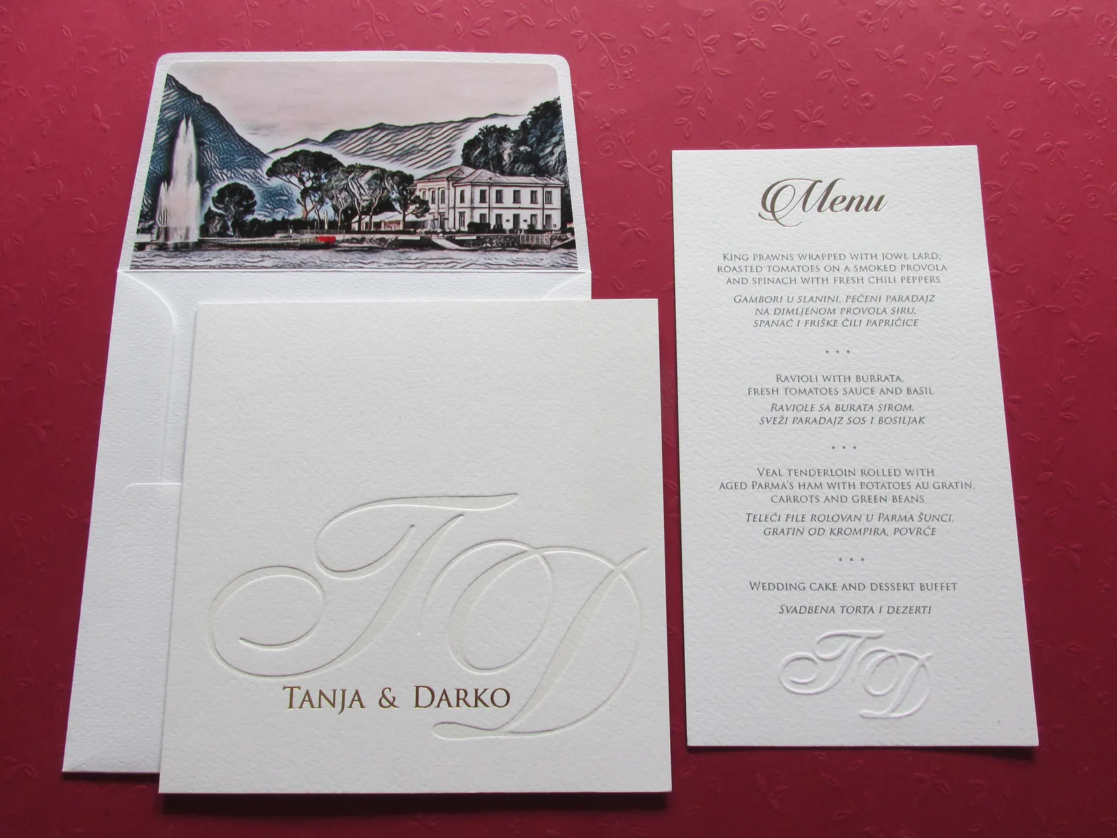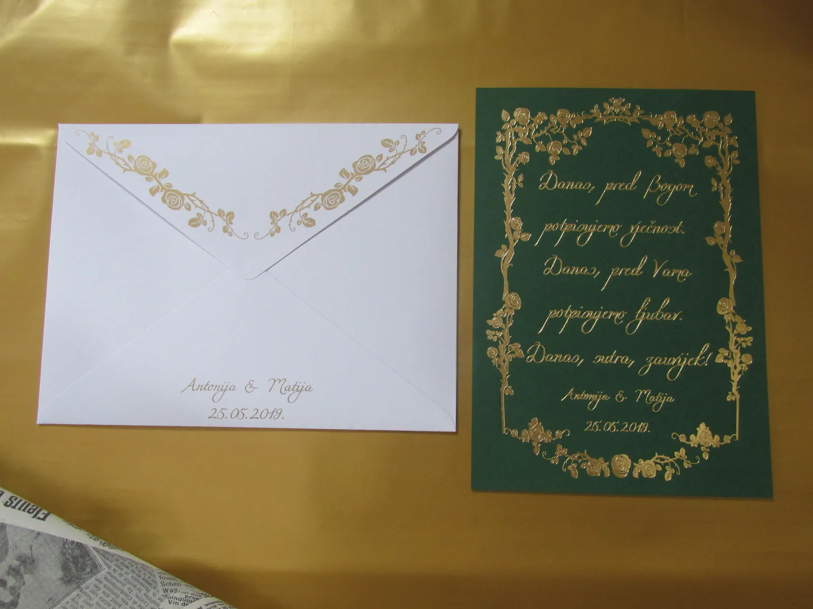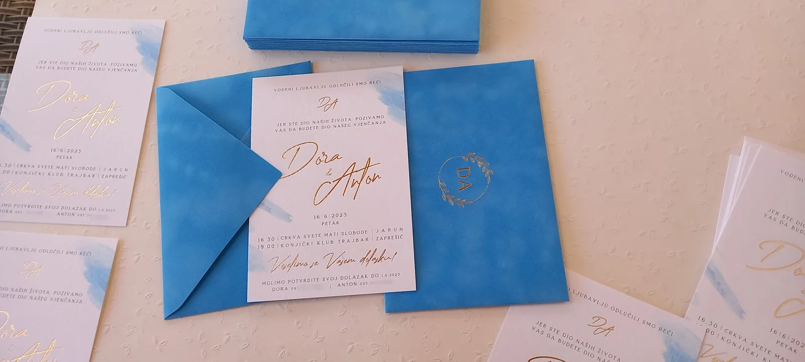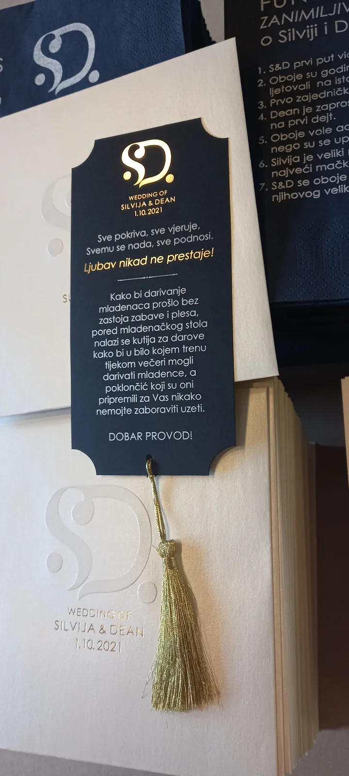 Na kovertama štampamo često inicijale u zlatotisku ili reljefnoj štampi, blindruku. Pečati od voska su prelep ukras za zatvaranje koverata ili pečati od papira sa inicijalima mladencima. Osim naših modela, IZRAĐUJEMO POZIVNICE PO VAŠOJ ŽELJI I VAŠEM DIZAJNU!