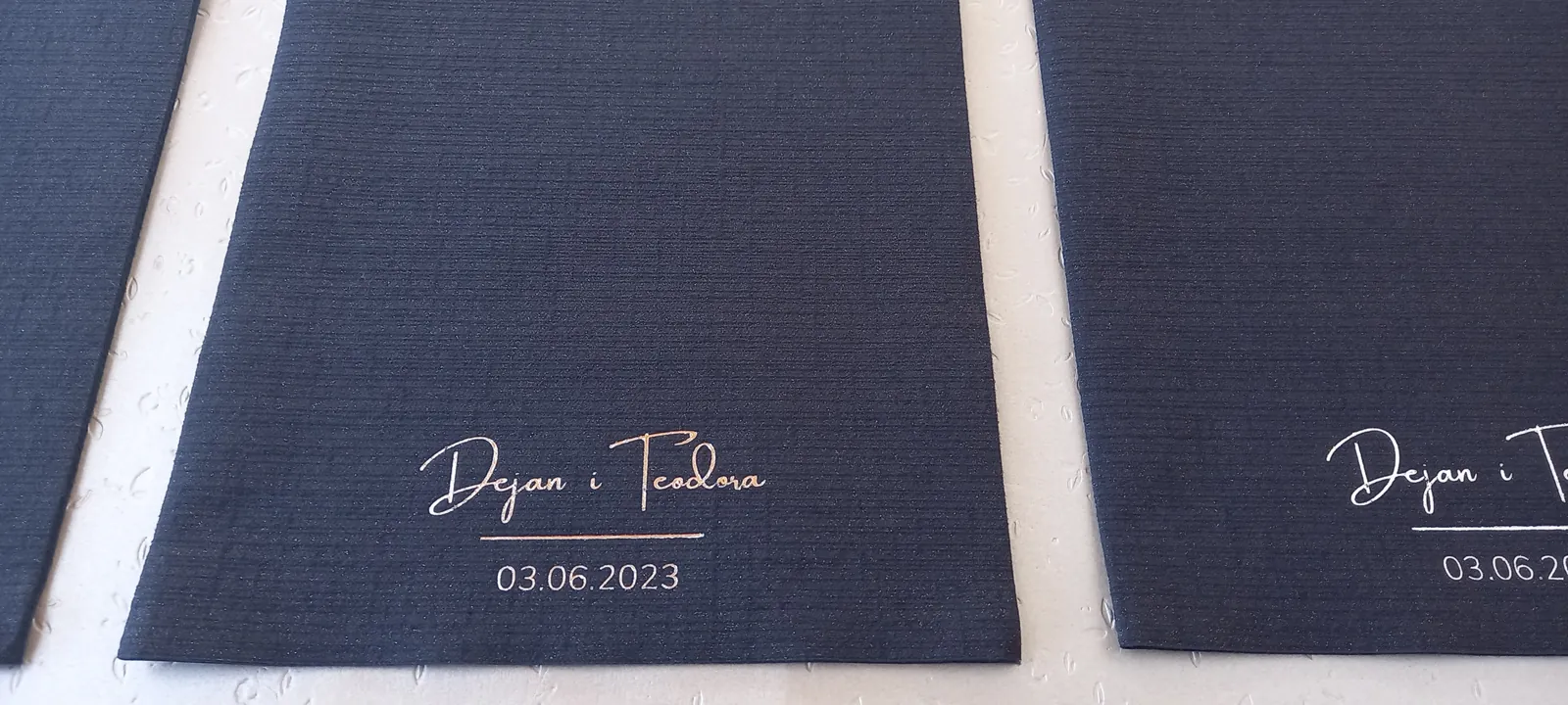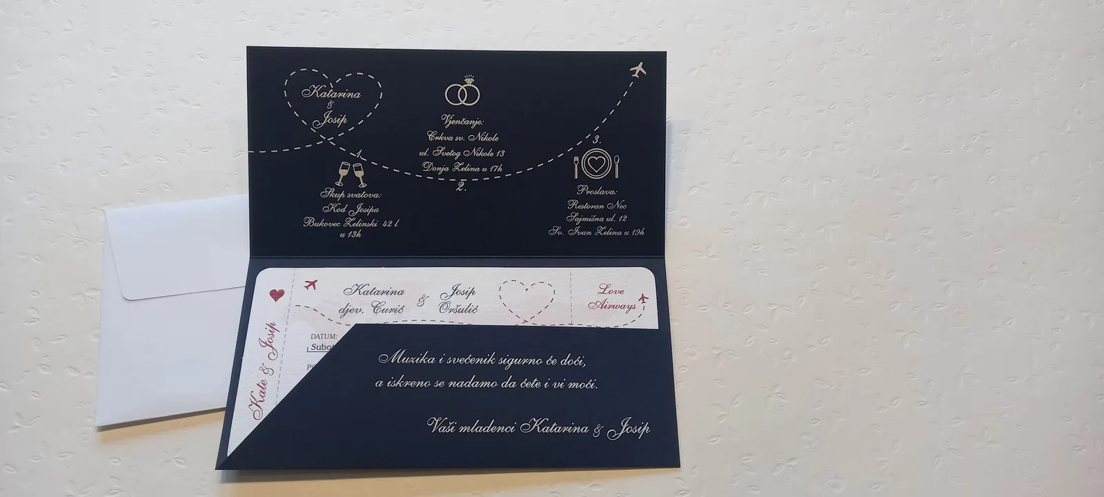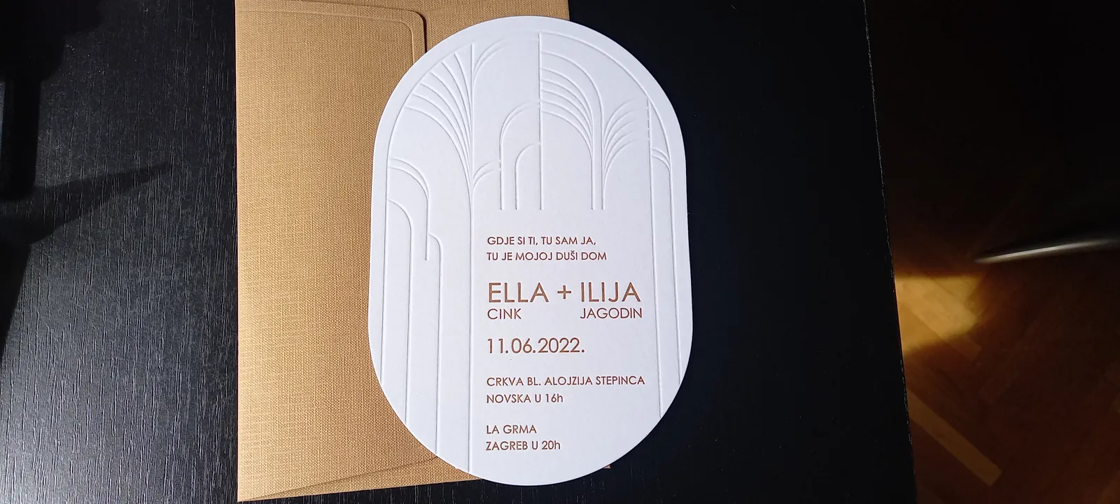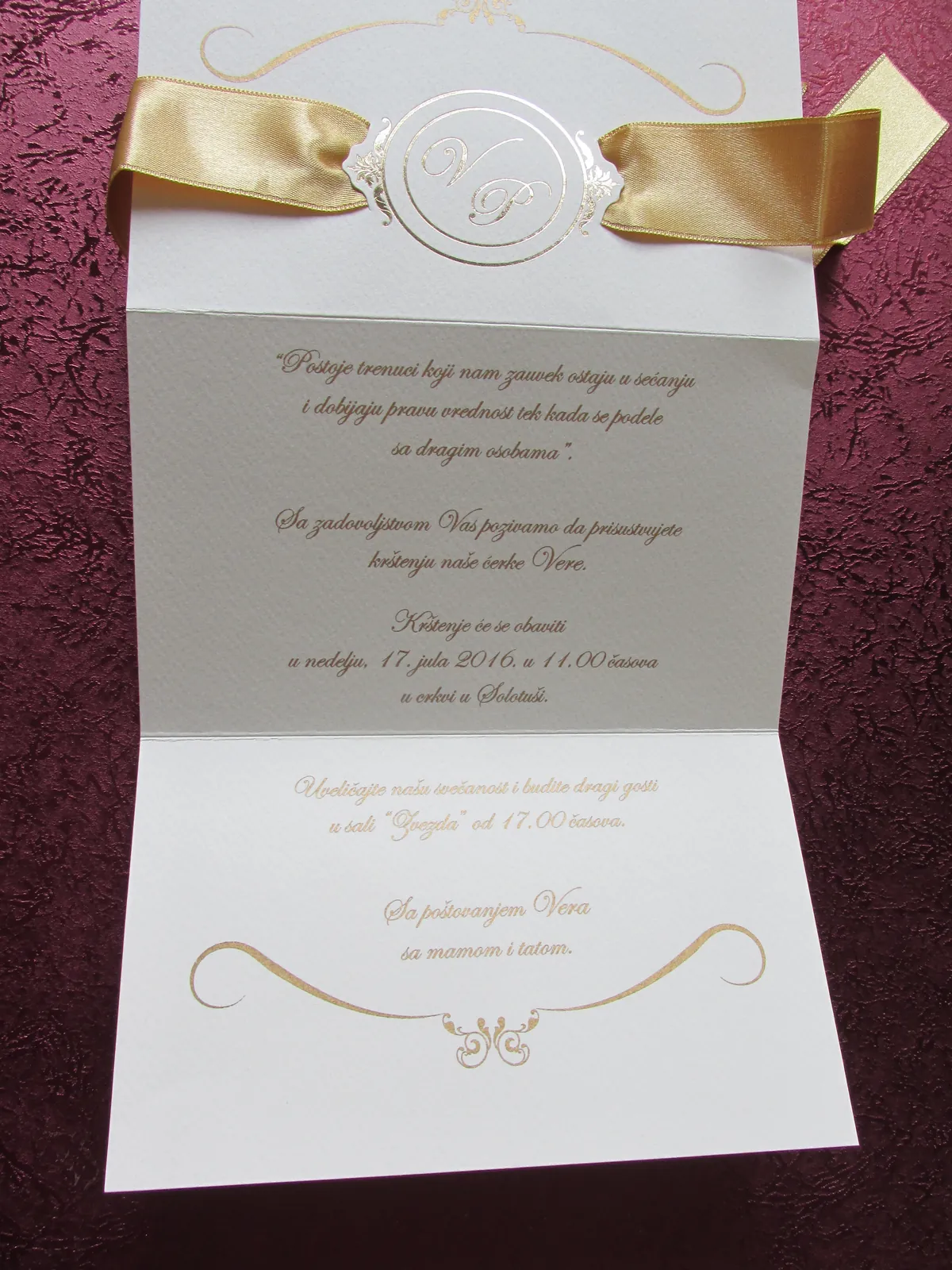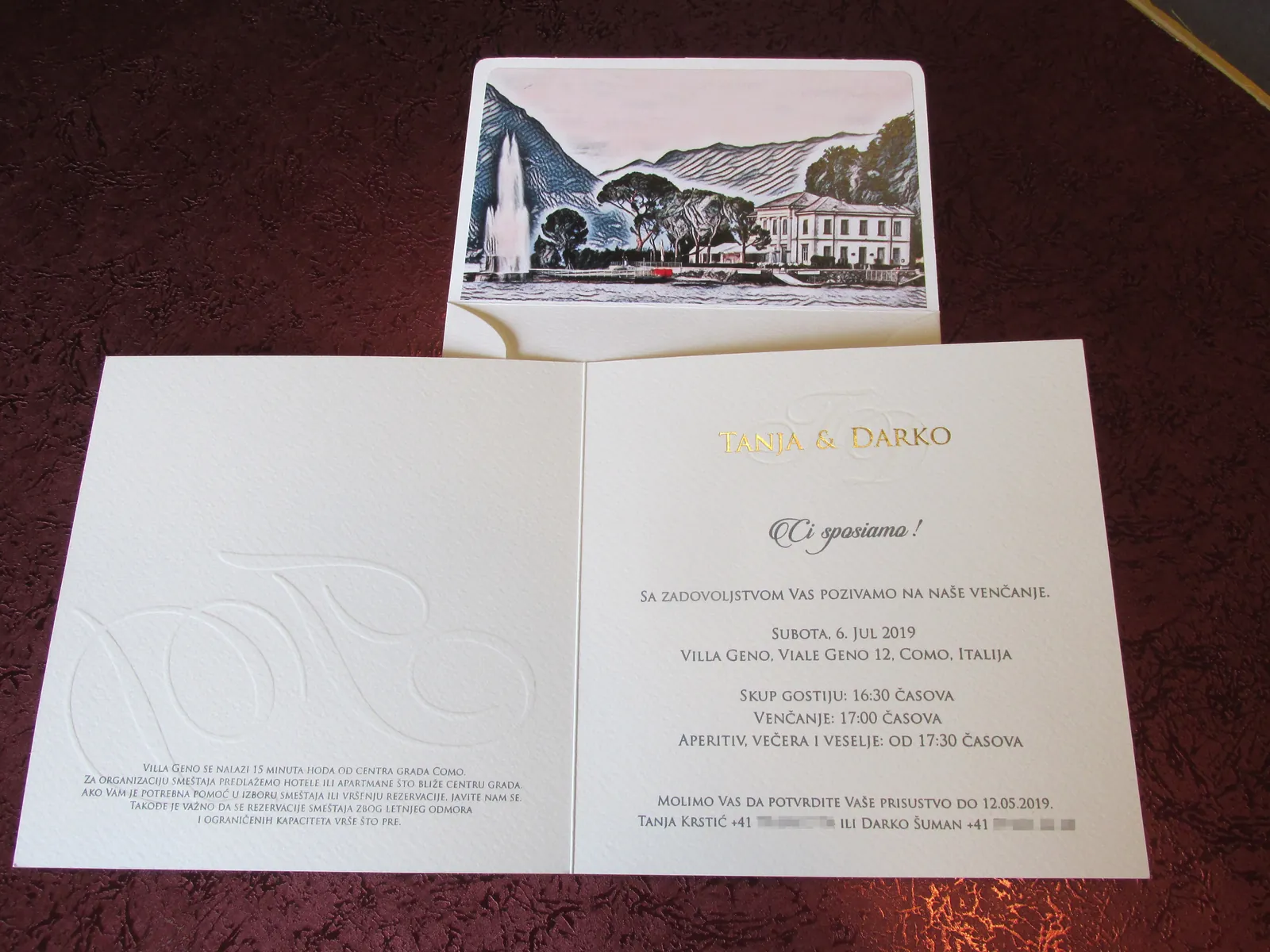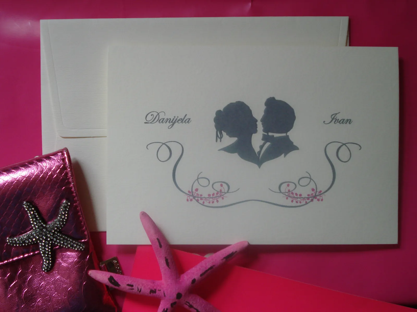 Na kovertama štampamo često inicijale u zlatotisku ili reljefnoj štampi, blindruku. Pečati od voska su prelep ukras za zatvaranje koverata ili pečati od papira sa inicijalima mladencima. Osim naših modela, IZRAĐUJEMO POZIVNICE PO VAŠOJ ŽELJI I VAŠEM DIZAJNU!