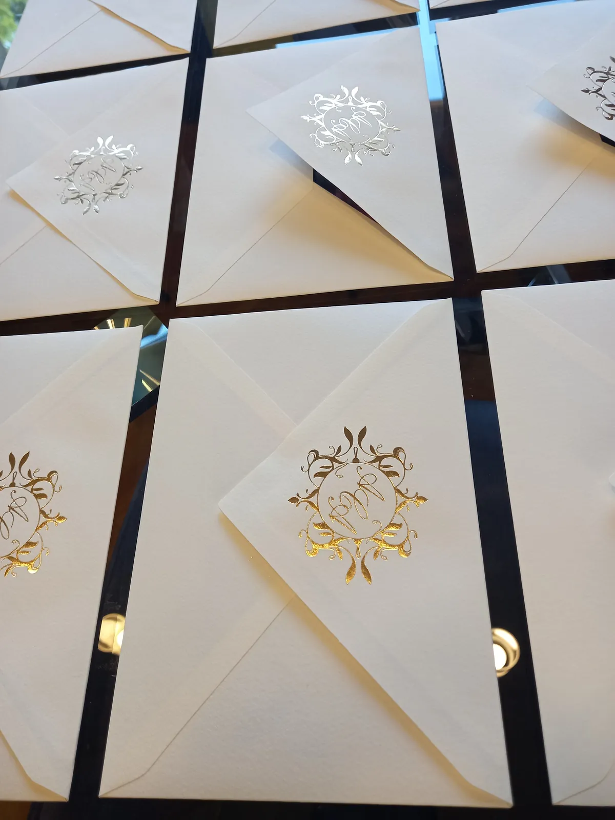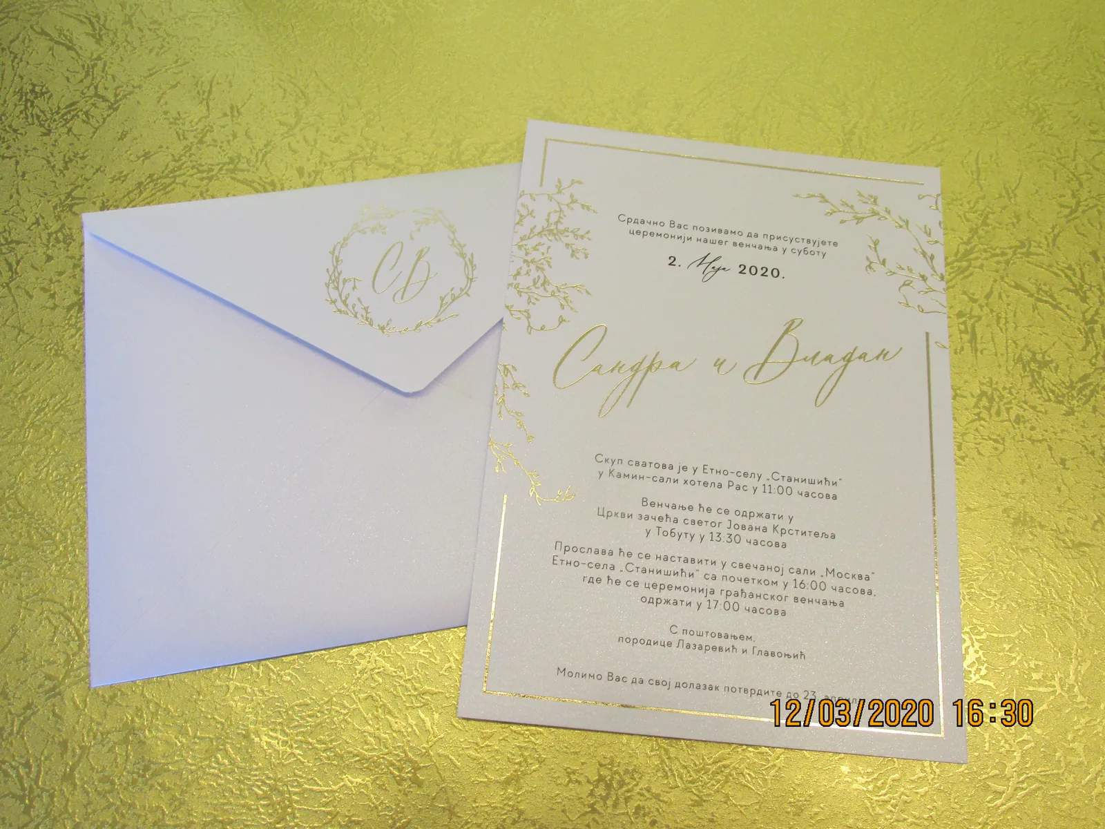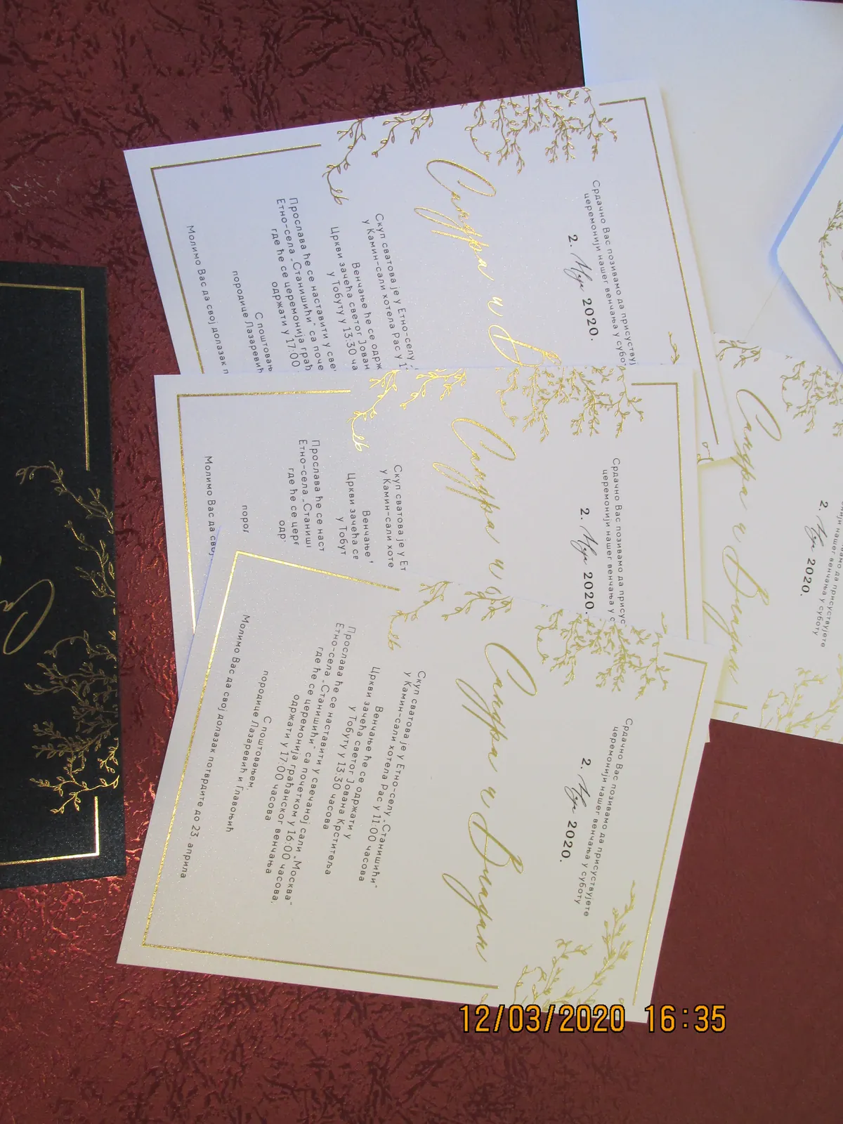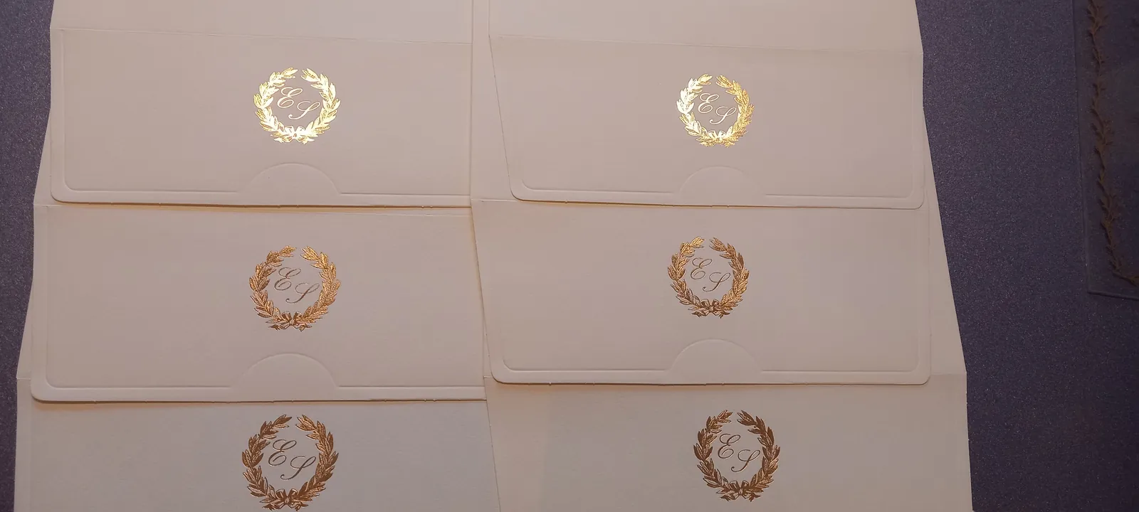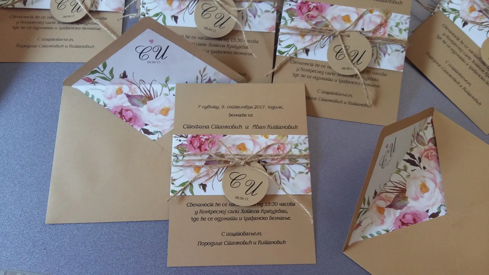Na kovertama štampamo često inicijale u zlatotisku ili reljefnoj štampi, blindruku. Pečati od voska su prelep ukras za zatvaranje koverata ili pečati od papira sa inicijalima mladencima. Osim naših modela, IZRAĐUJEMO POZIVNICE PO VAŠOJ ŽELJI I VAŠEM DIZAJNU!