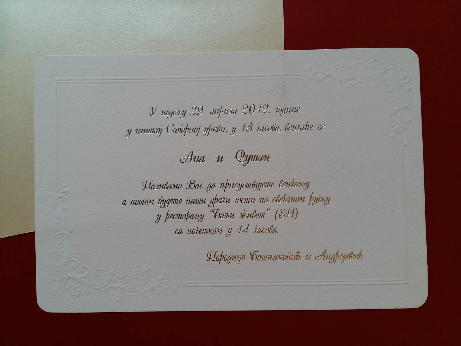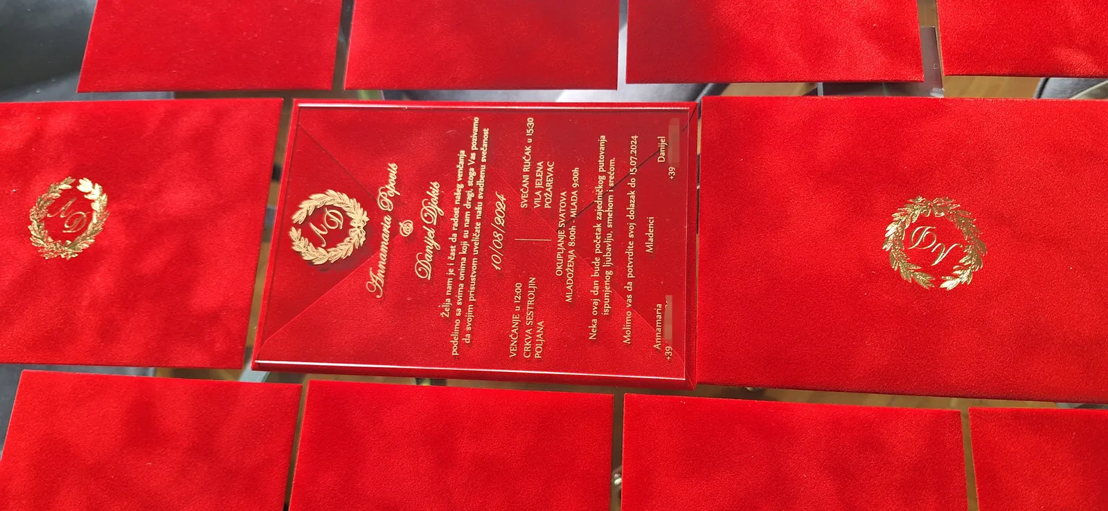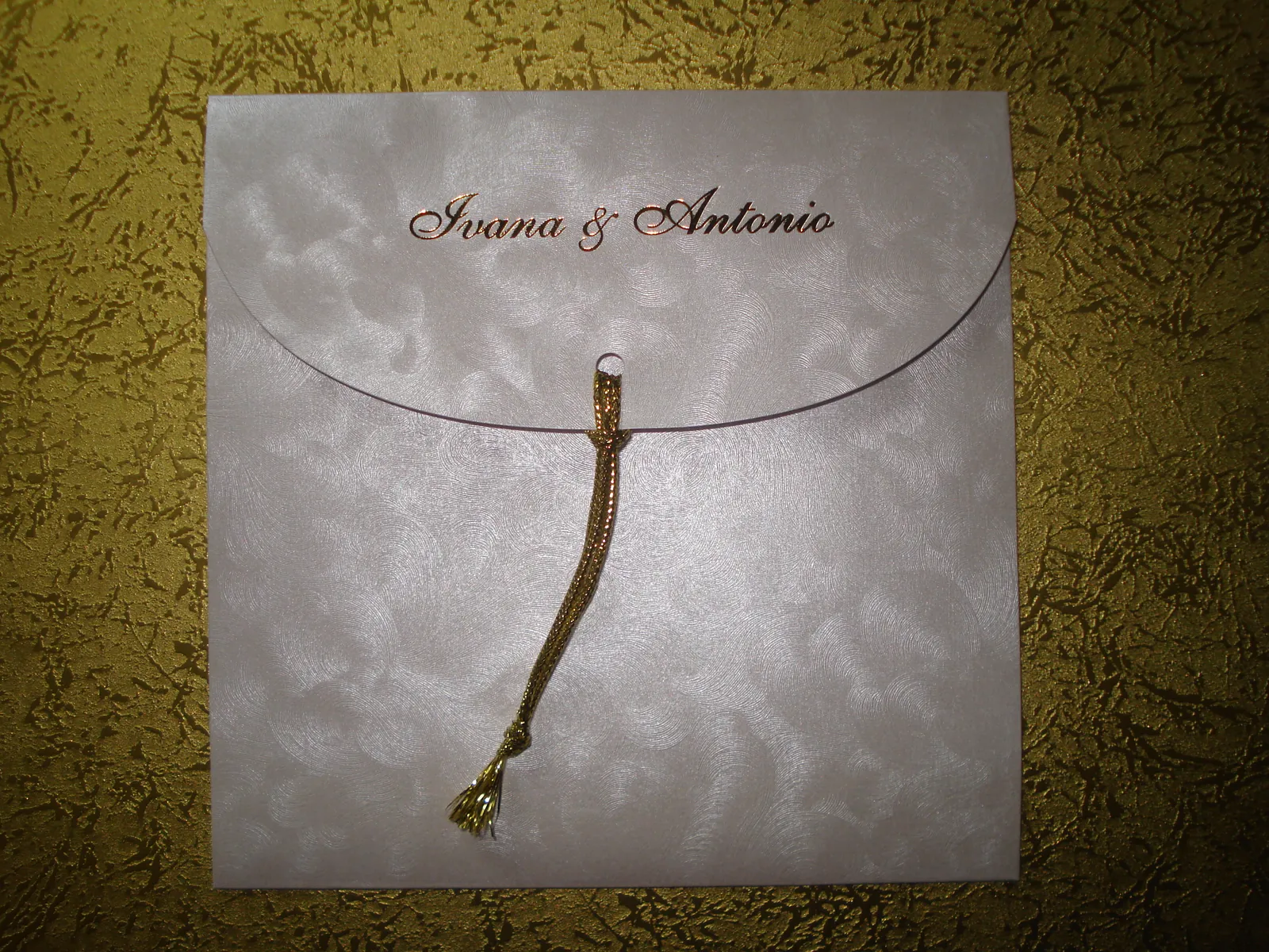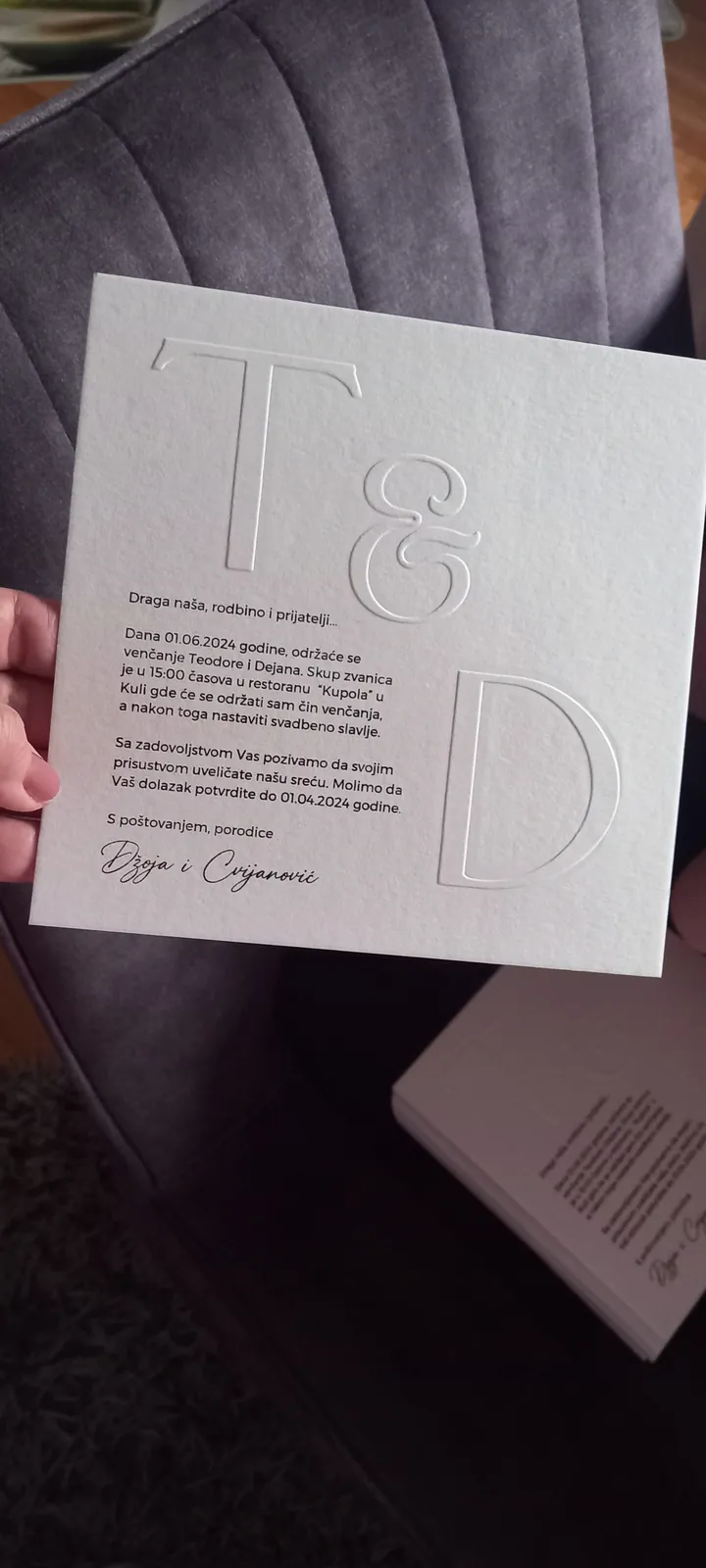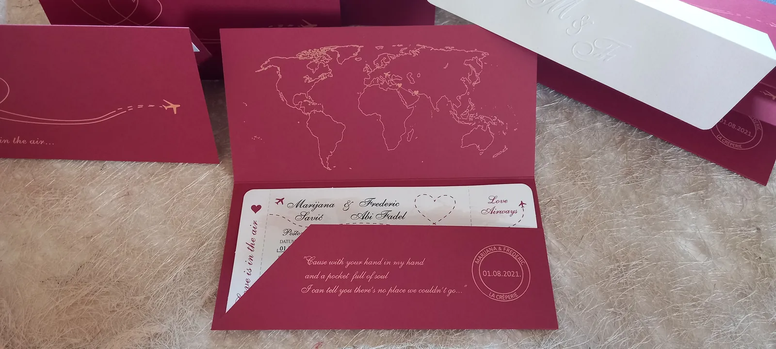 Na kovertama štampamo često inicijale u zlatotisku ili reljefnoj štampi, blindruku. Pečati od voska su prelep ukras za zatvaranje koverata ili pečati od papira sa inicijalima mladencima. Osim naših modela, IZRAĐUJEMO POZIVNICE PO VAŠOJ ŽELJI I VAŠEM DIZAJNU!