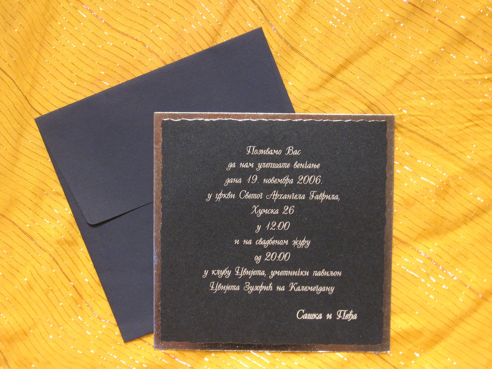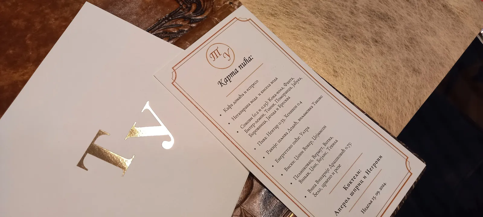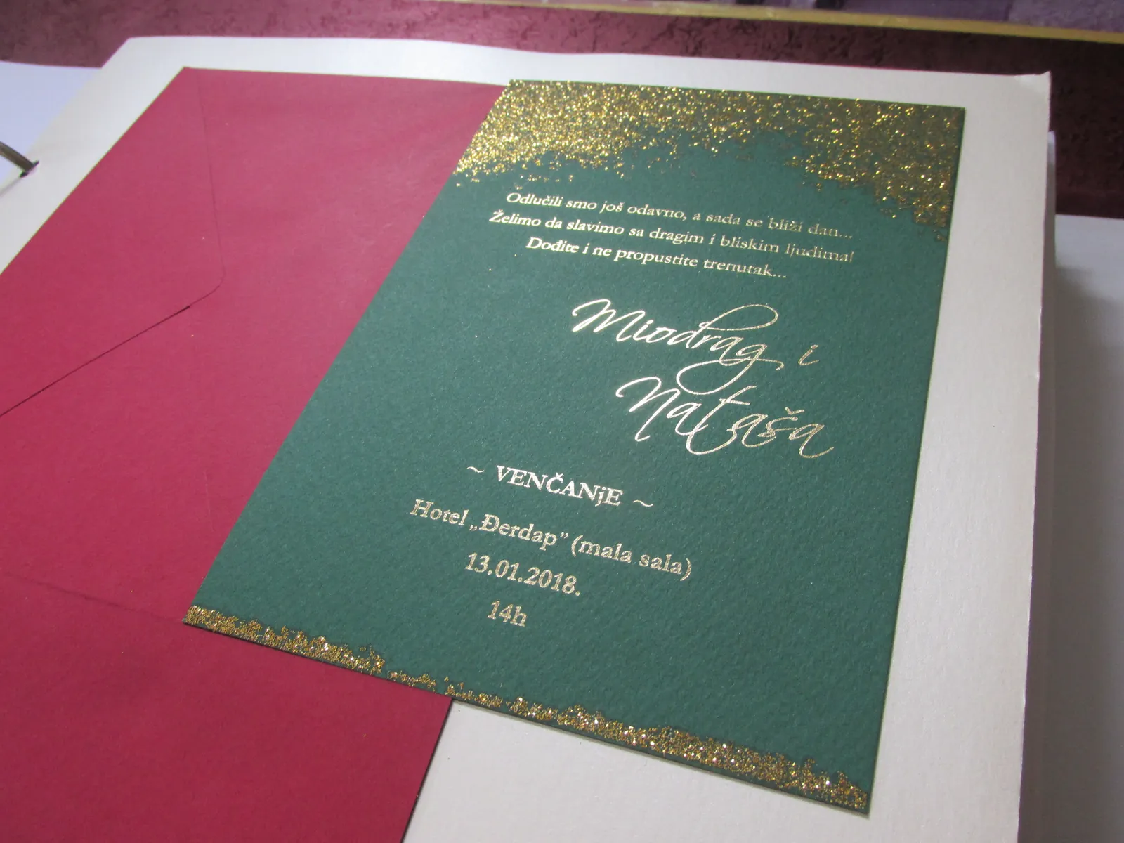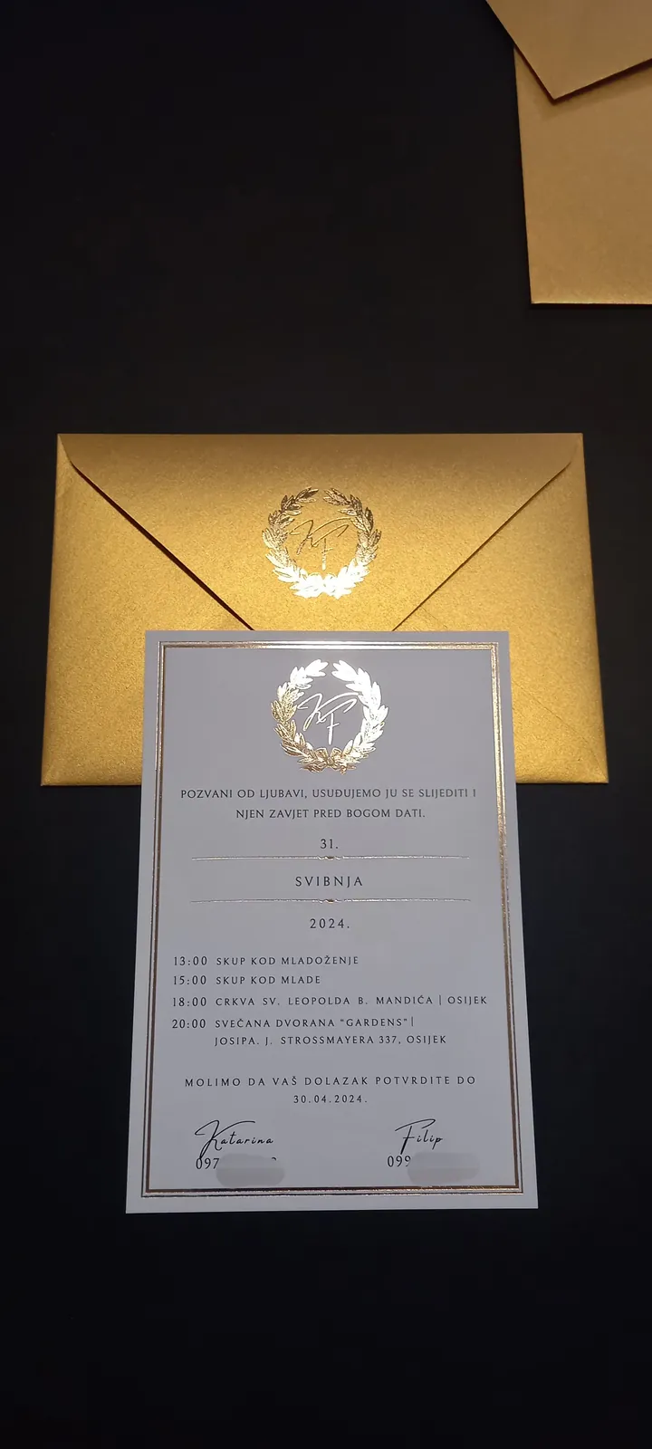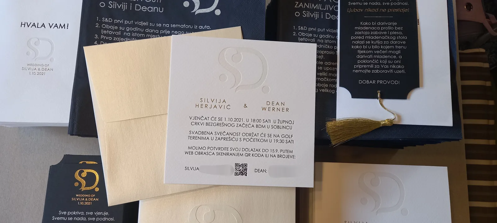 Na kovertama štampamo često inicijale u zlatotisku ili reljefnoj štampi, blindruku. Pečati od voska su prelep ukras za zatvaranje koverata ili pečati od papira sa inicijalima mladencima. Osim naših modela, IZRAĐUJEMO POZIVNICE PO VAŠOJ ŽELJI I VAŠEM DIZAJNU!