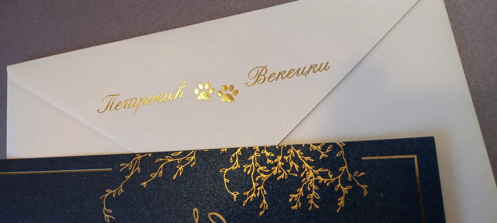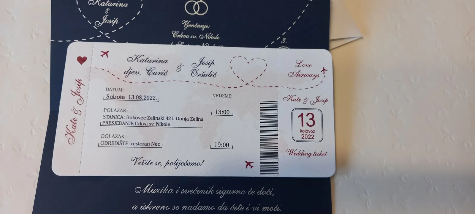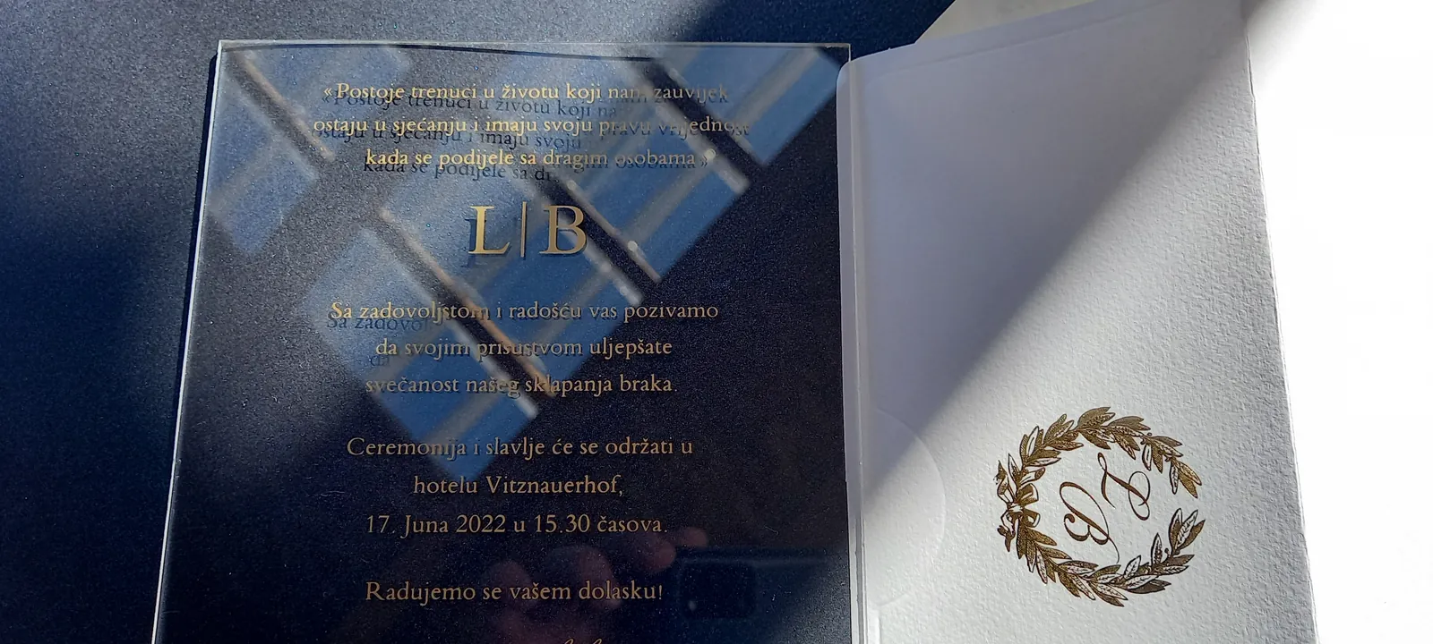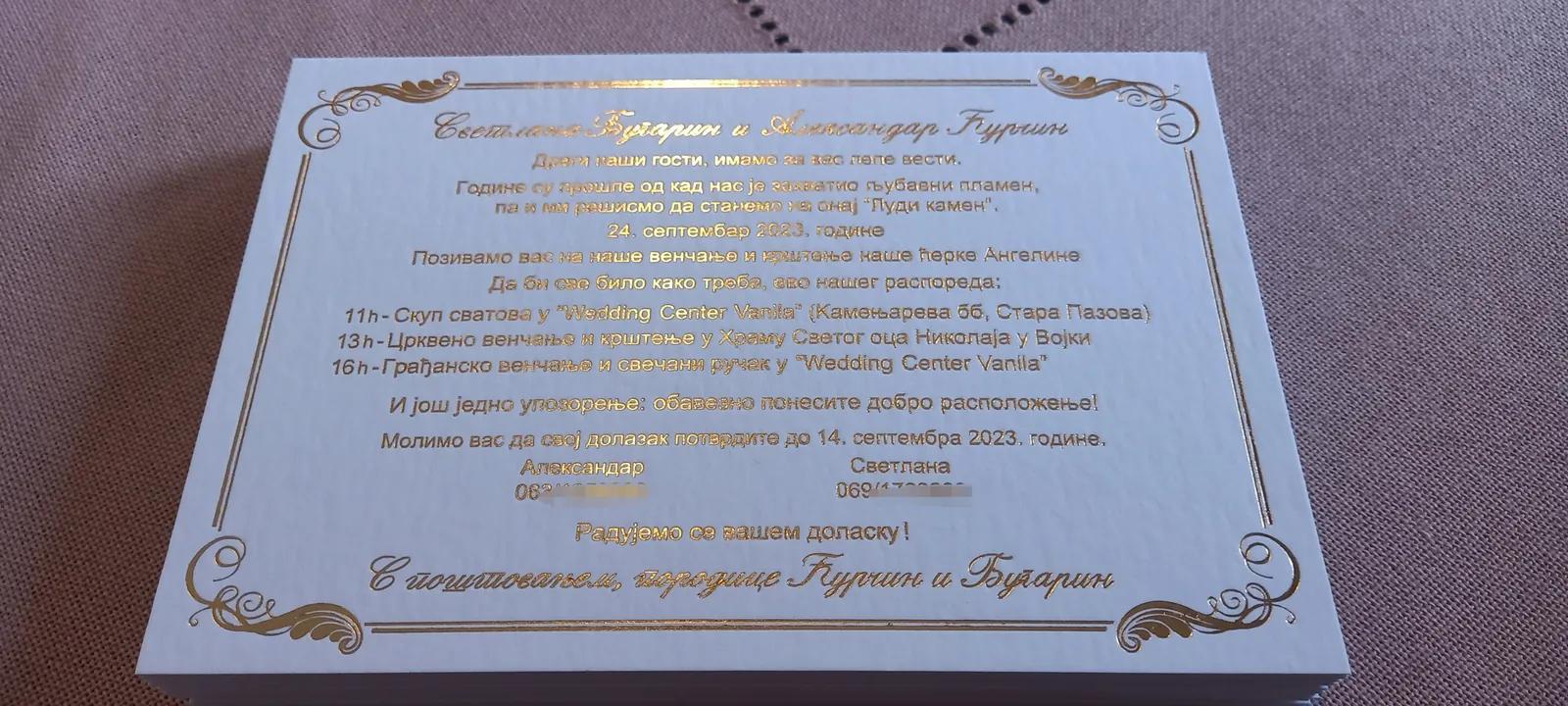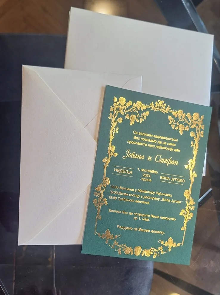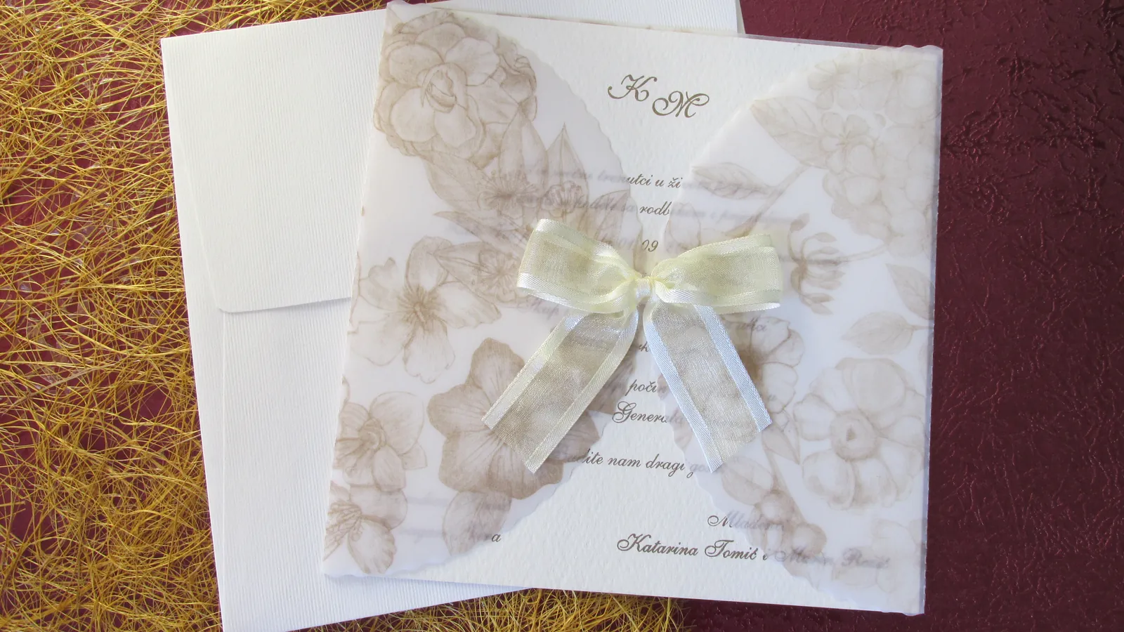 Na kovertama štampamo često inicijale u zlatotisku ili reljefnoj štampi, blindruku. Pečati od voska su prelep ukras za zatvaranje koverata ili pečati od papira sa inicijalima mladencima. Osim naših modela, IZRAĐUJEMO POZIVNICE PO VAŠOJ ŽELJI I VAŠEM DIZAJNU!