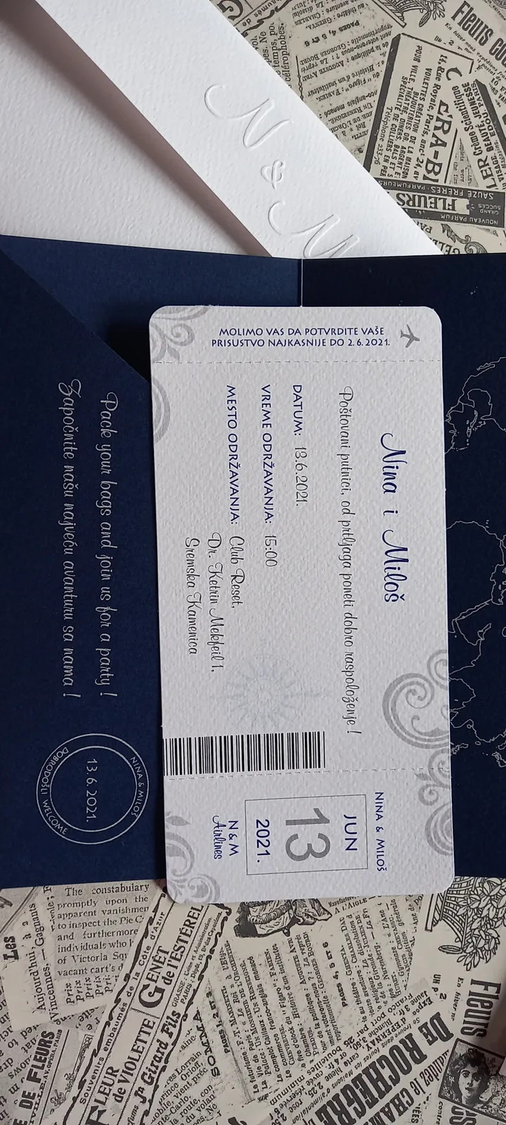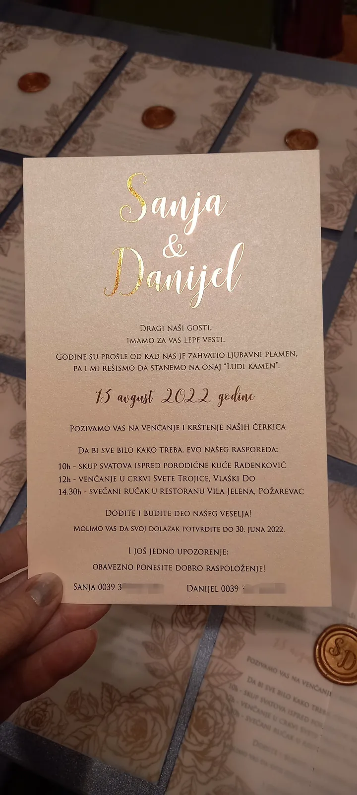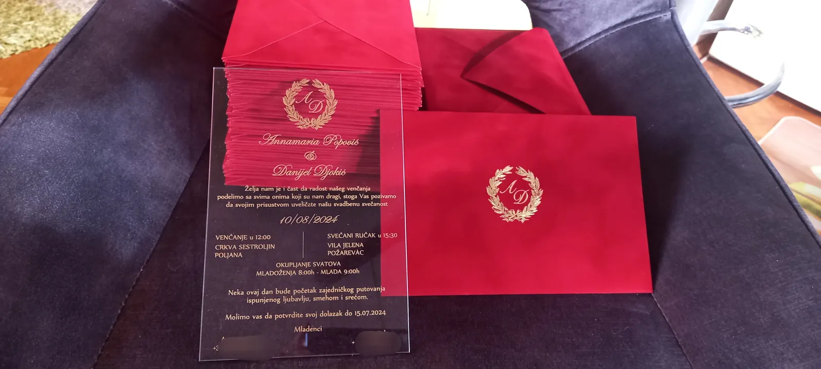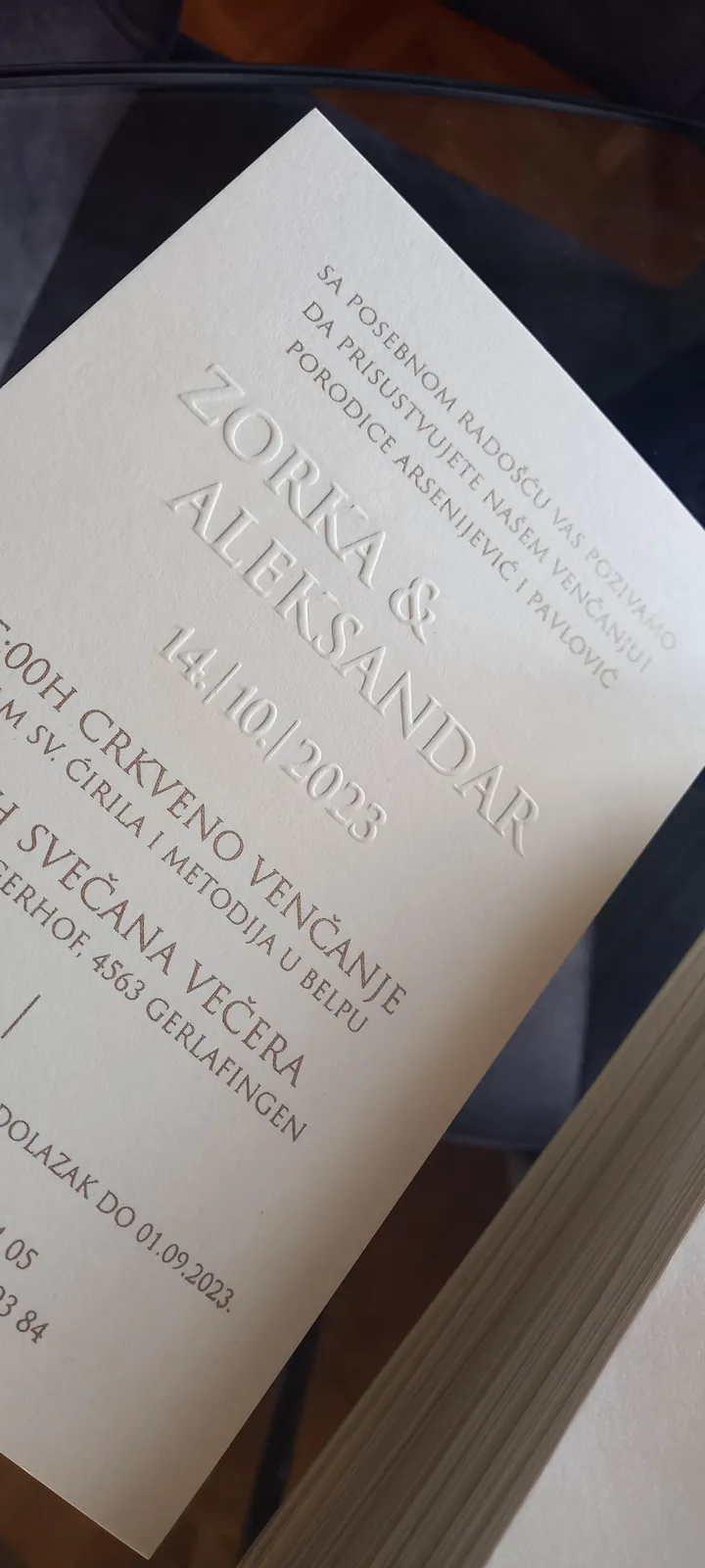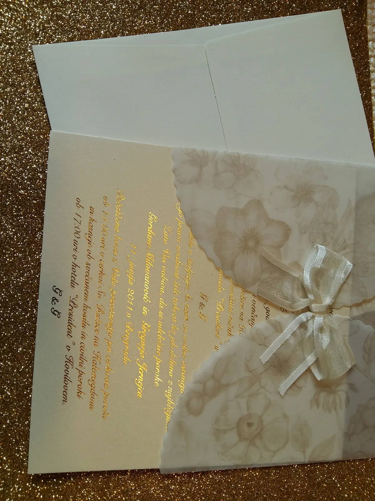Na kovertama štampamo često inicijale u zlatotisku ili reljefnoj štampi, blindruku. Pečati od voska su prelep ukras za zatvaranje koverata ili pečati od papira sa inicijalima mladencima. Osim naših modela, IZRAĐUJEMO POZIVNICE PO VAŠOJ ŽELJI I VAŠEM DIZAJNU!