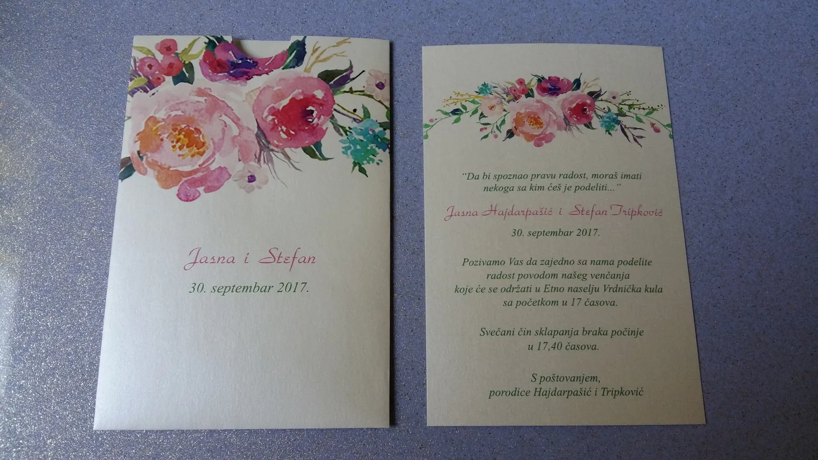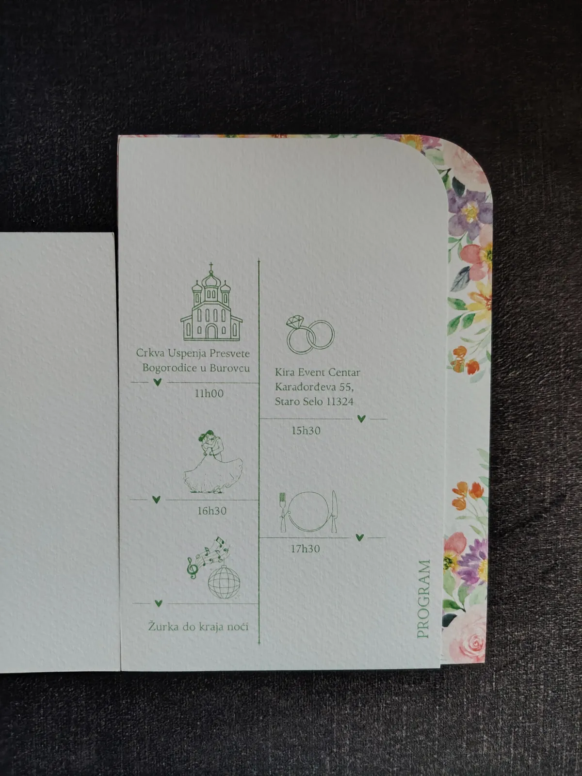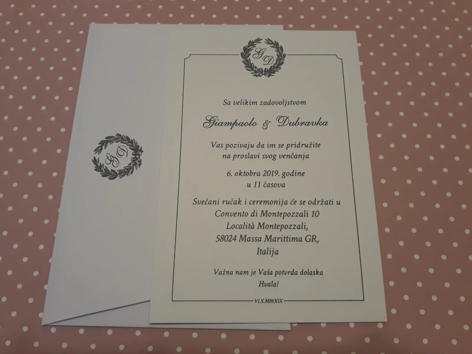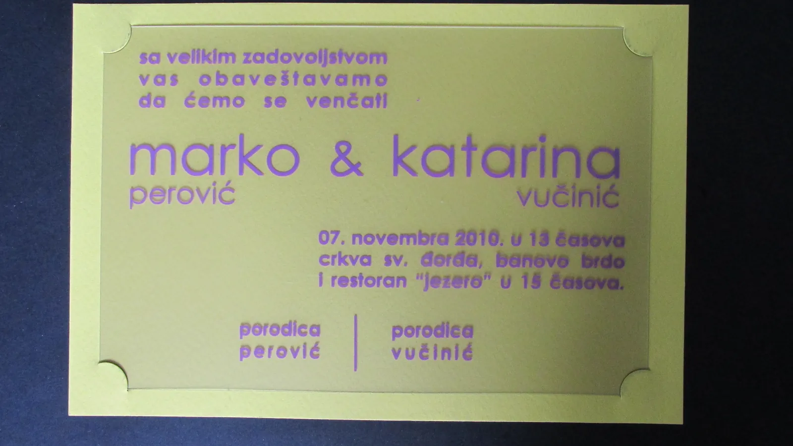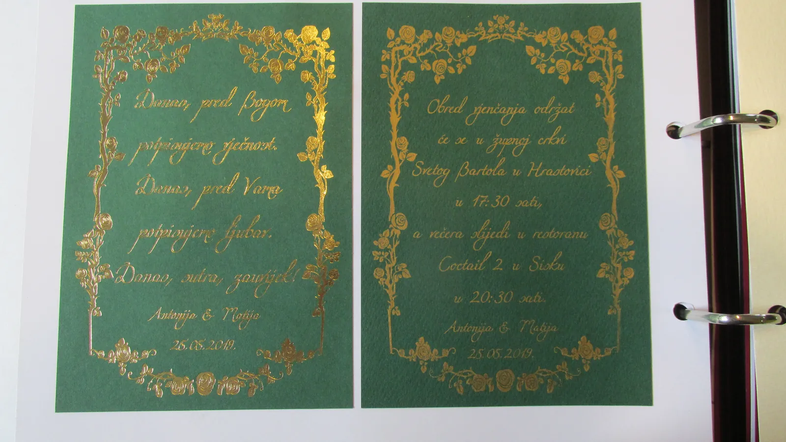 Na kovertama štampamo često inicijale u zlatotisku ili reljefnoj štampi, blindruku. Pečati od voska su prelep ukras za zatvaranje koverata ili pečati od papira sa inicijalima mladencima. Osim naših modela, IZRAĐUJEMO POZIVNICE PO VAŠOJ ŽELJI I VAŠEM DIZAJNU!