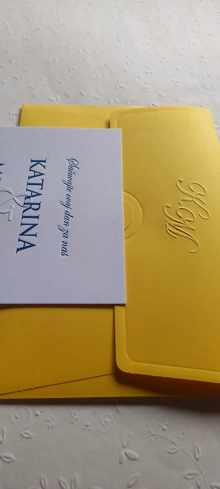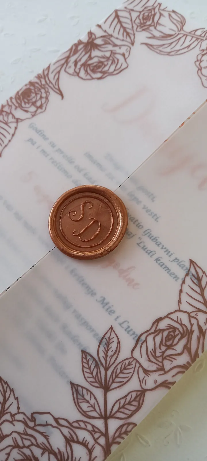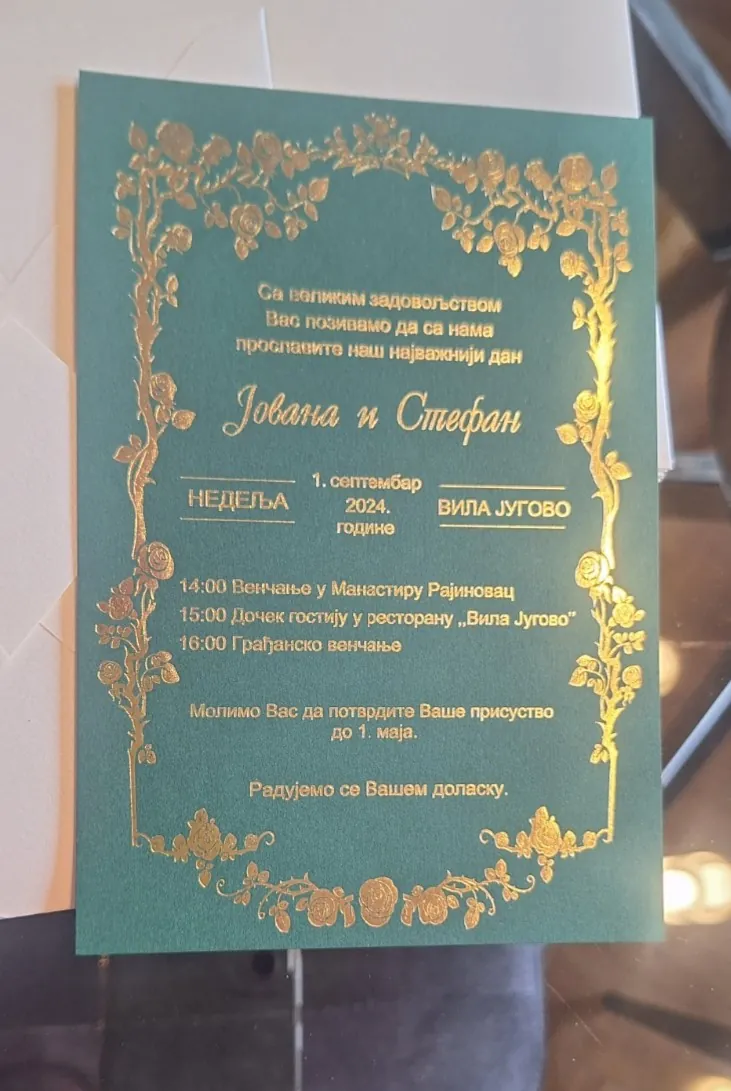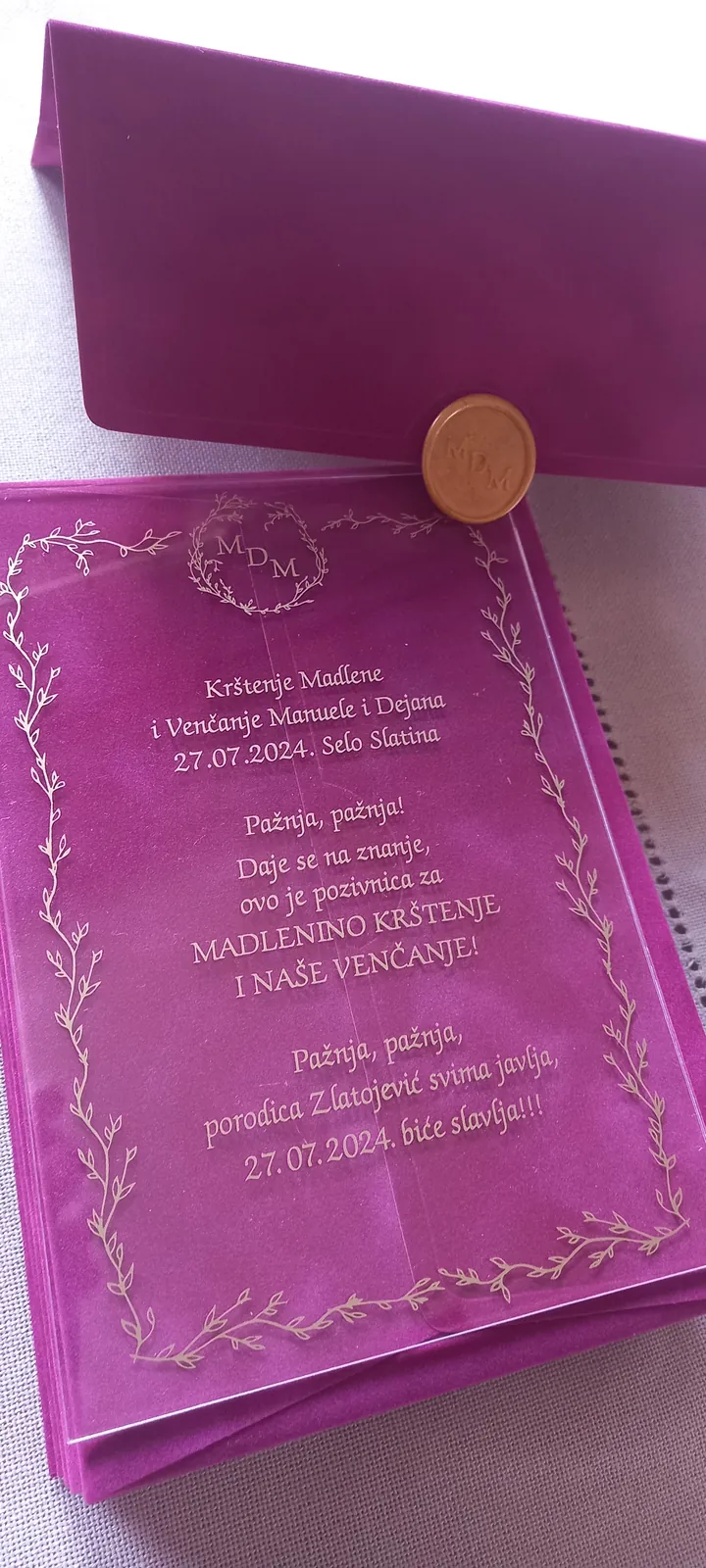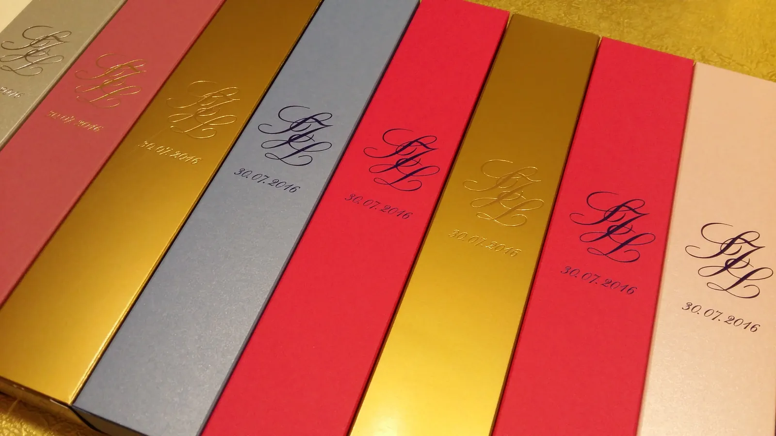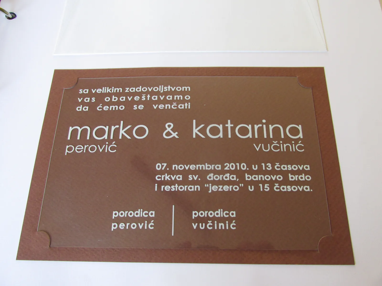 Na kovertama štampamo često inicijale u zlatotisku ili reljefnoj štampi, blindruku. Pečati od voska su prelep ukras za zatvaranje koverata ili pečati od papira sa inicijalima mladencima. Osim naših modela, IZRAĐUJEMO POZIVNICE PO VAŠOJ ŽELJI I VAŠEM DIZAJNU!