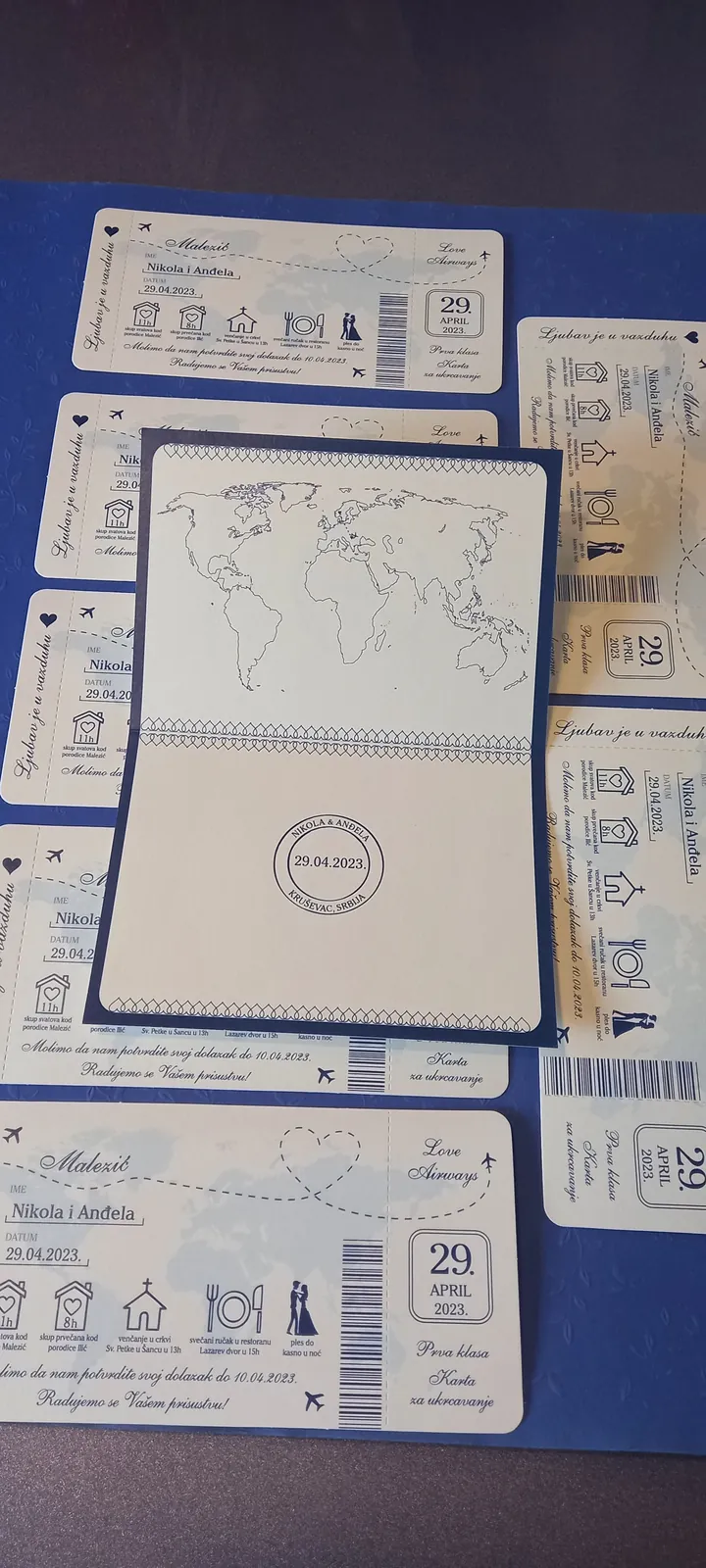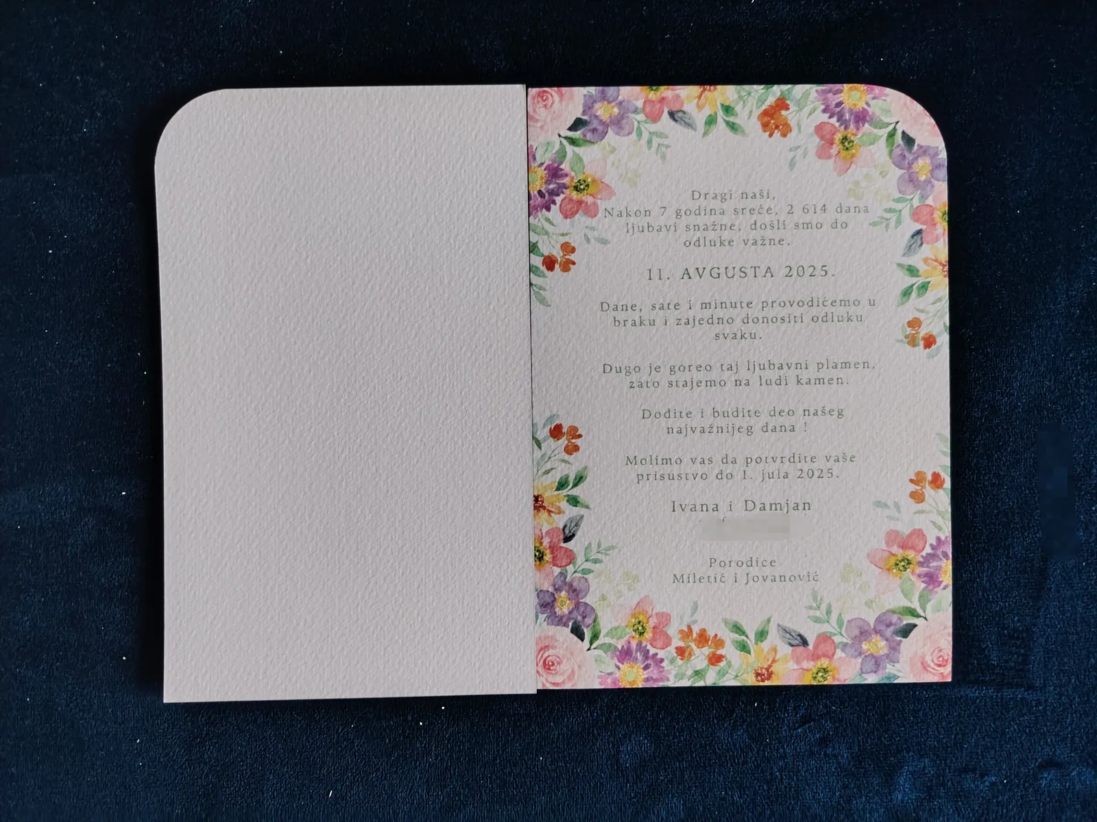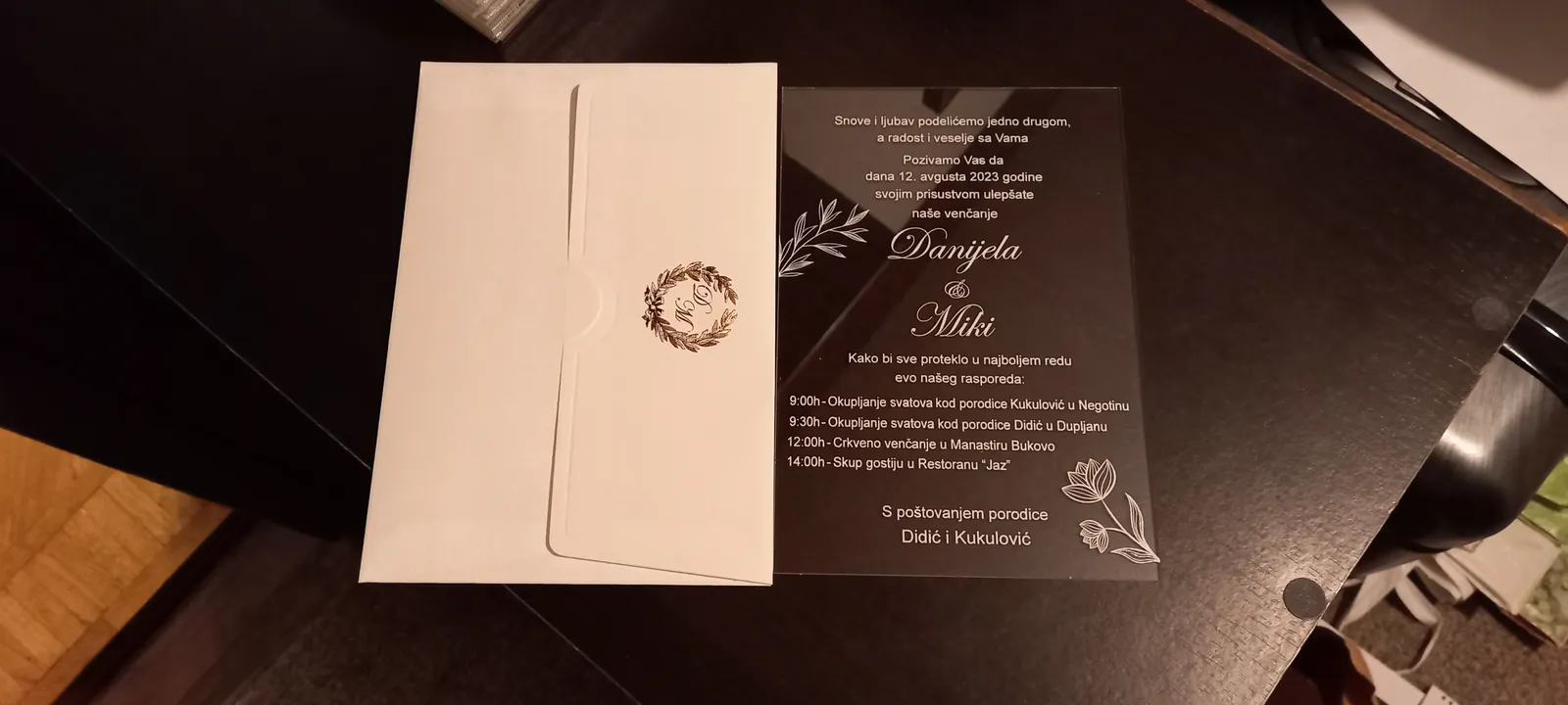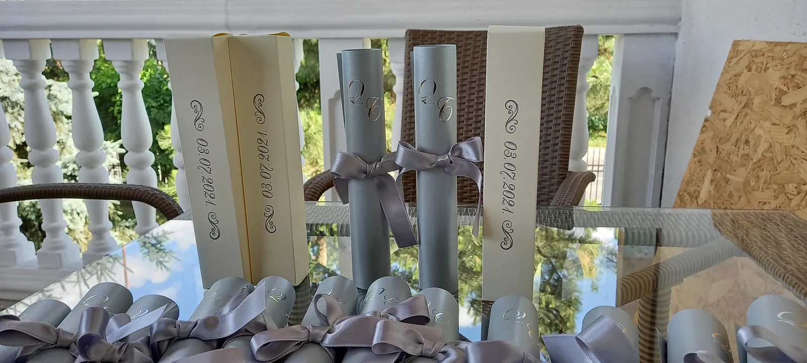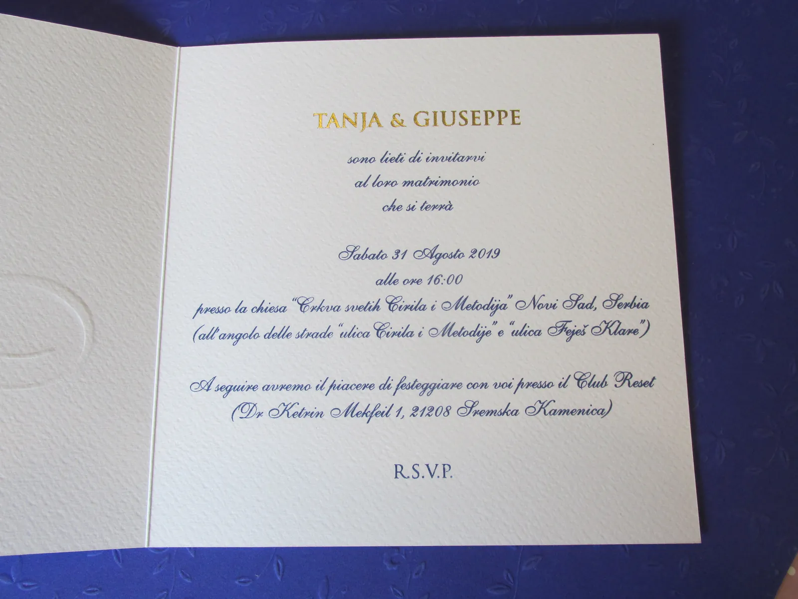 Na kovertama štampamo često inicijale u zlatotisku ili reljefnoj štampi, blindruku. Pečati od voska su prelep ukras za zatvaranje koverata ili pečati od papira sa inicijalima mladencima. Osim naših modela, IZRAĐUJEMO POZIVNICE PO VAŠOJ ŽELJI I VAŠEM DIZAJNU!