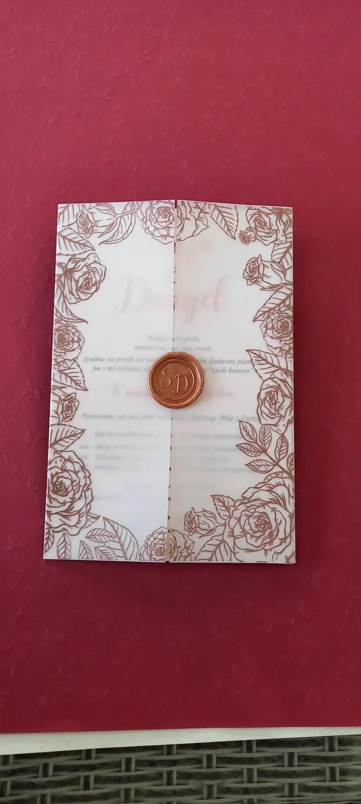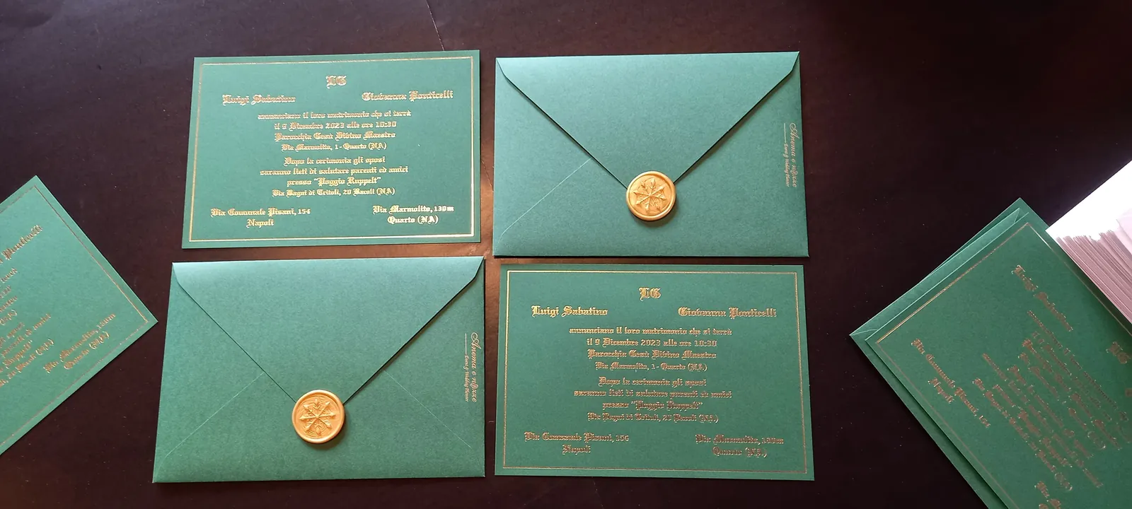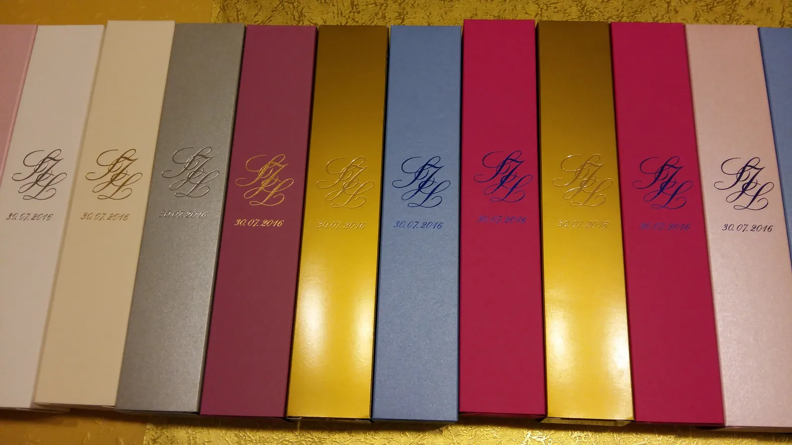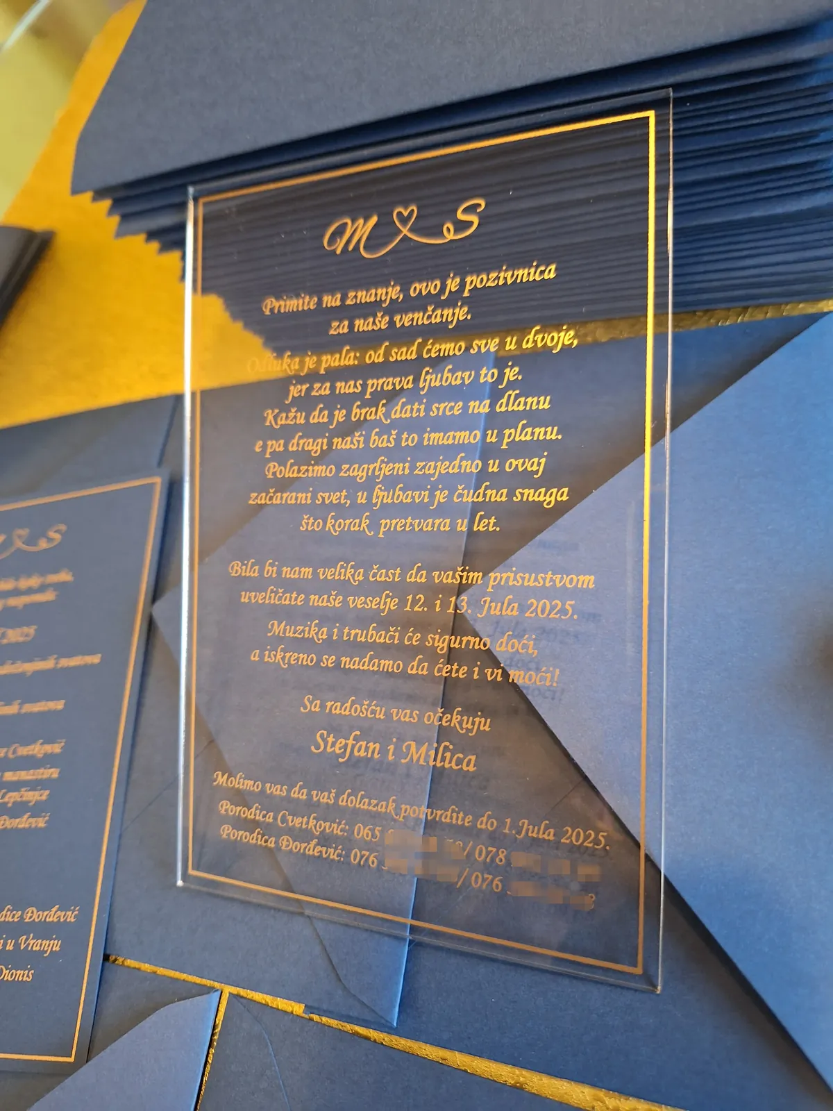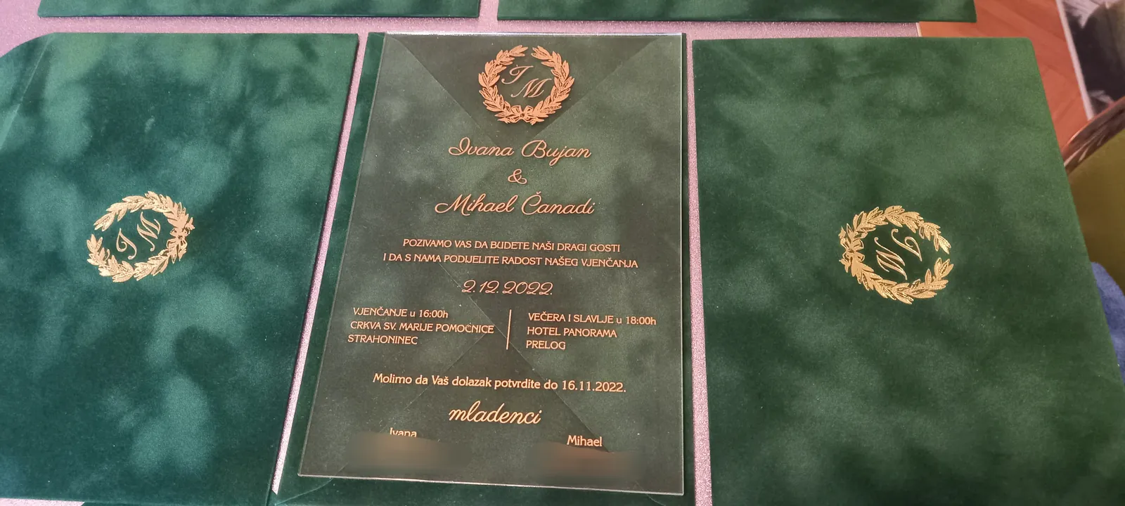 Na kovertama štampamo često inicijale u zlatotisku ili reljefnoj štampi, blindruku. Pečati od voska su prelep ukras za zatvaranje koverata ili pečati od papira sa inicijalima mladencima. Osim naših modela, IZRAĐUJEMO POZIVNICE PO VAŠOJ ŽELJI I VAŠEM DIZAJNU!