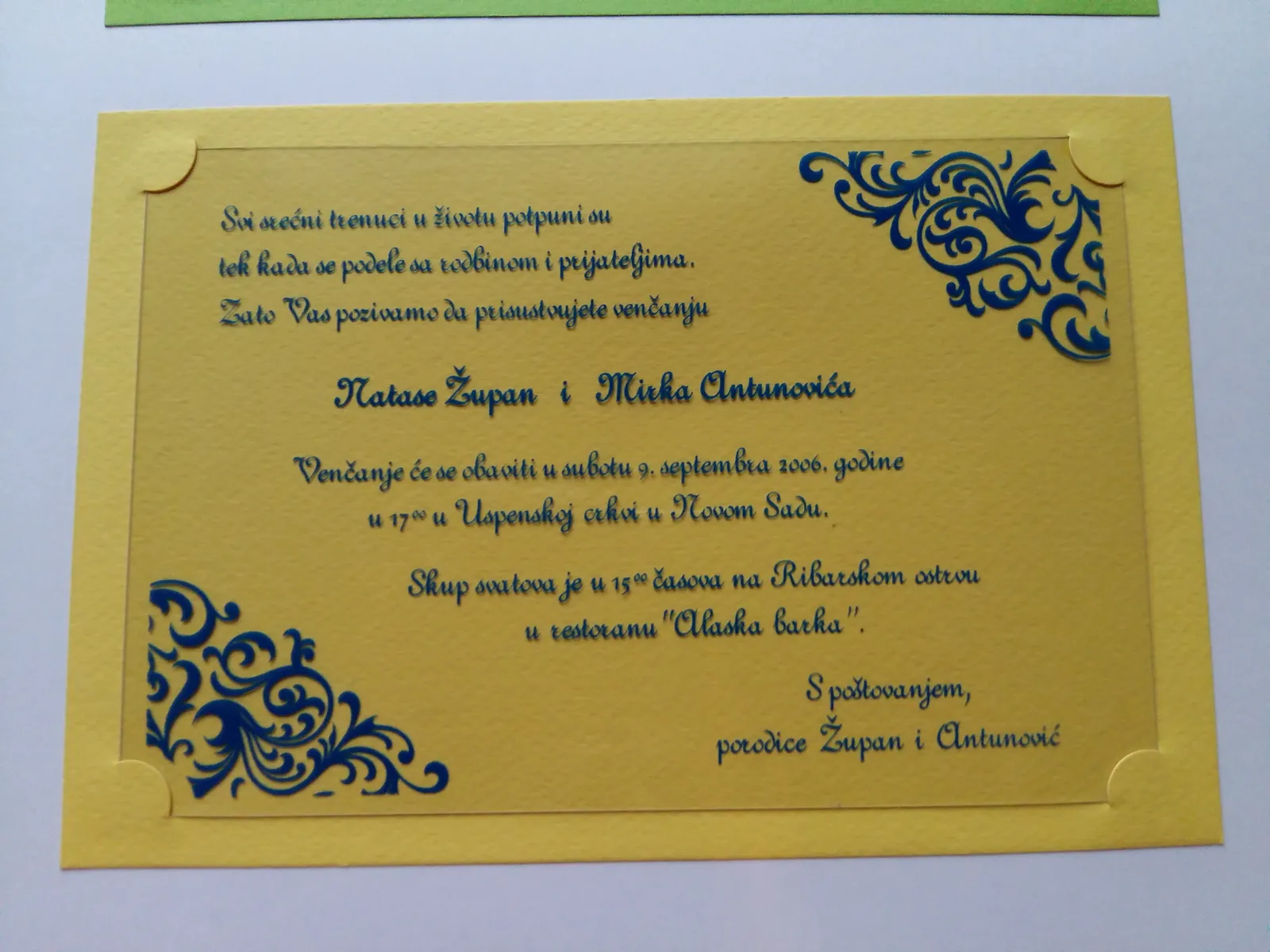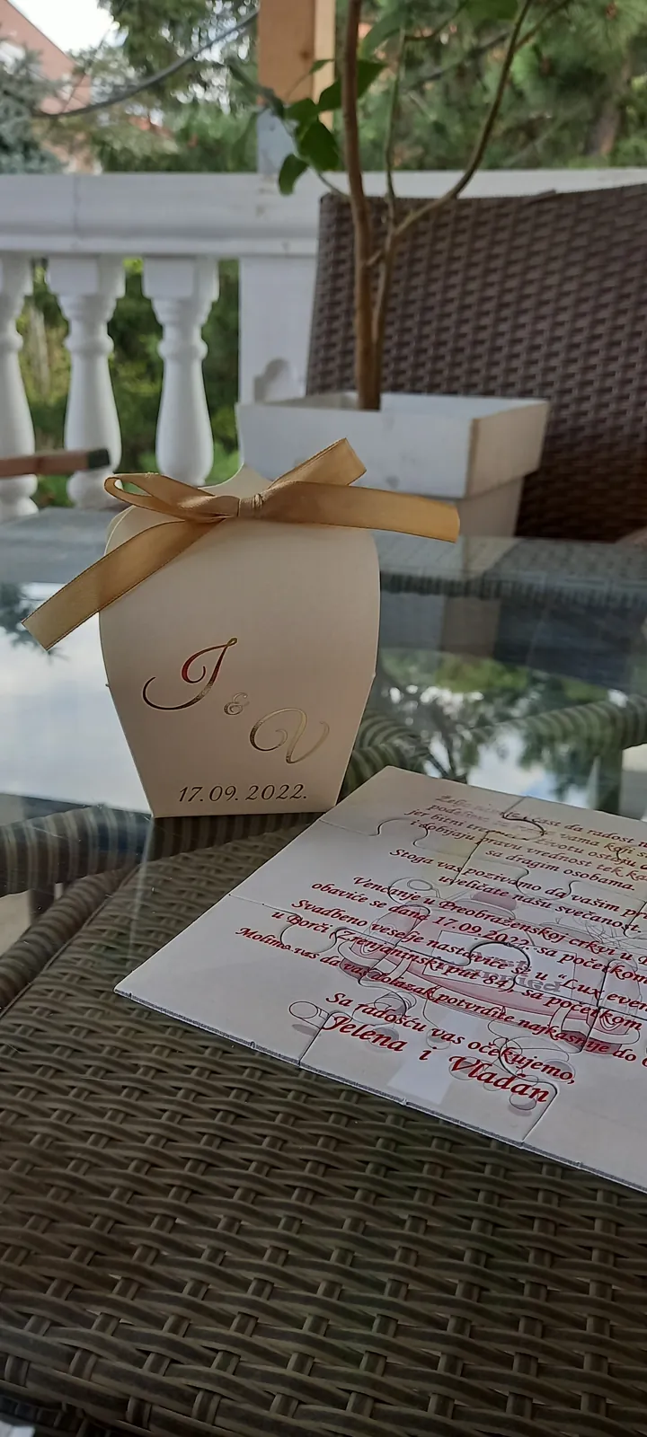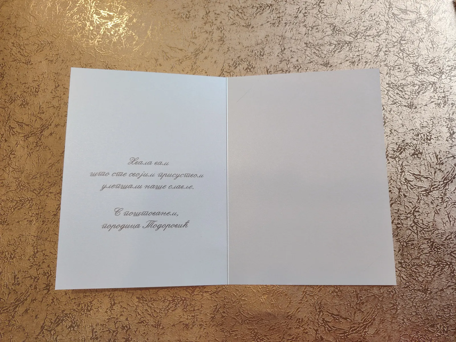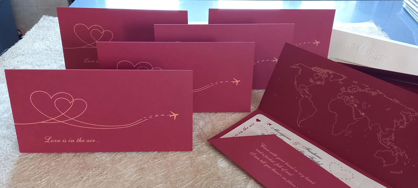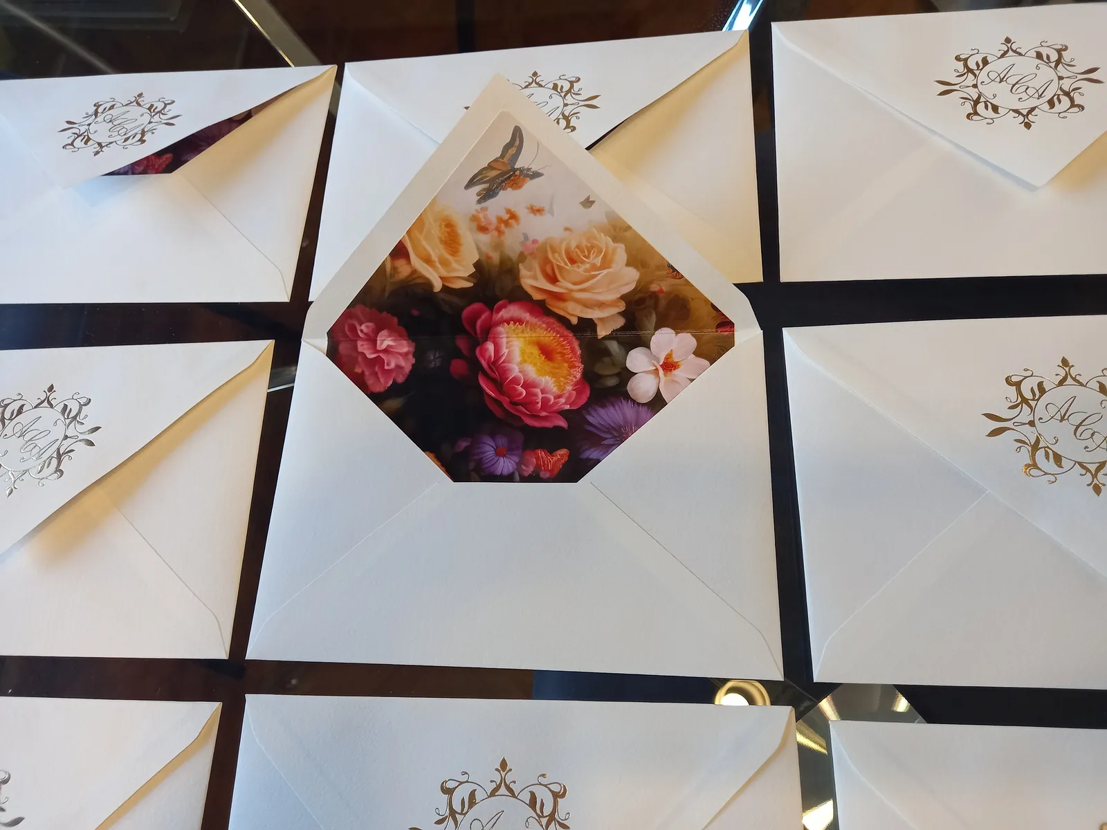 Na kovertama štampamo često inicijale u zlatotisku ili reljefnoj štampi, blindruku. Pečati od voska su prelep ukras za zatvaranje koverata ili pečati od papira sa inicijalima mladencima. Osim naših modela, IZRAĐUJEMO POZIVNICE PO VAŠOJ ŽELJI I VAŠEM DIZAJNU!