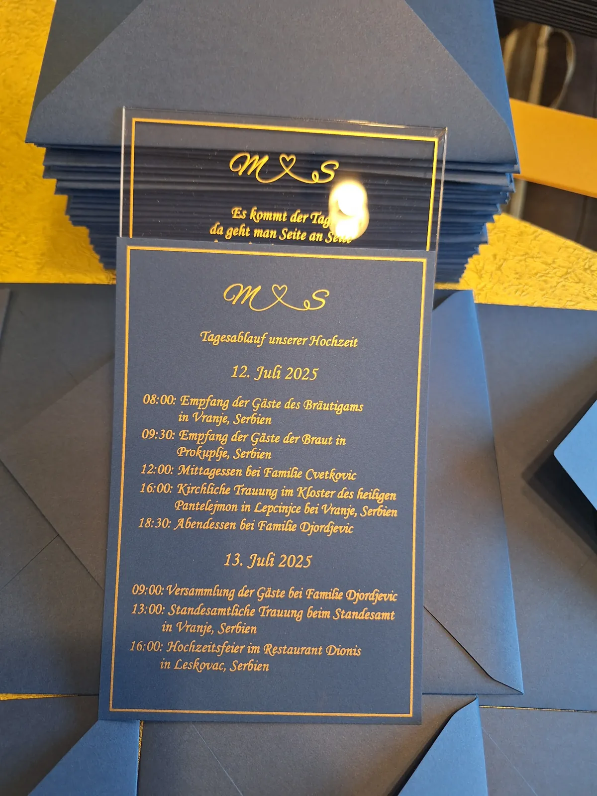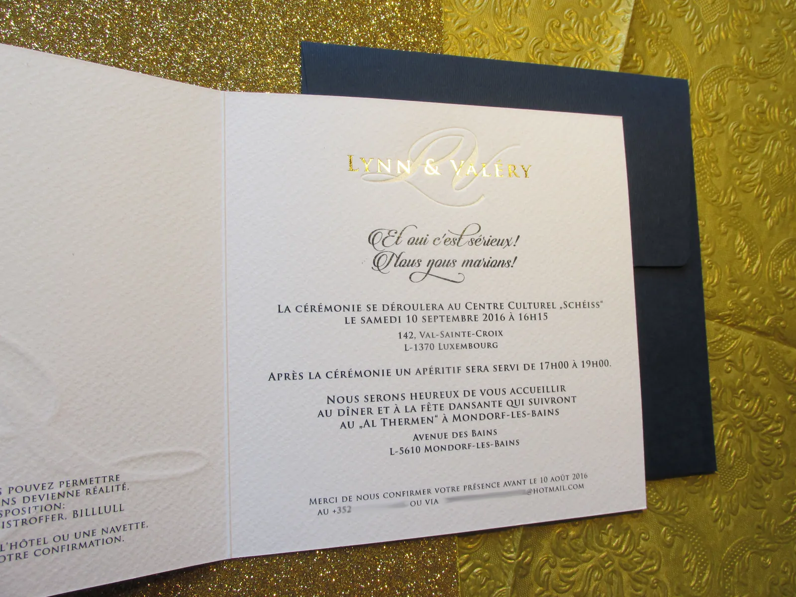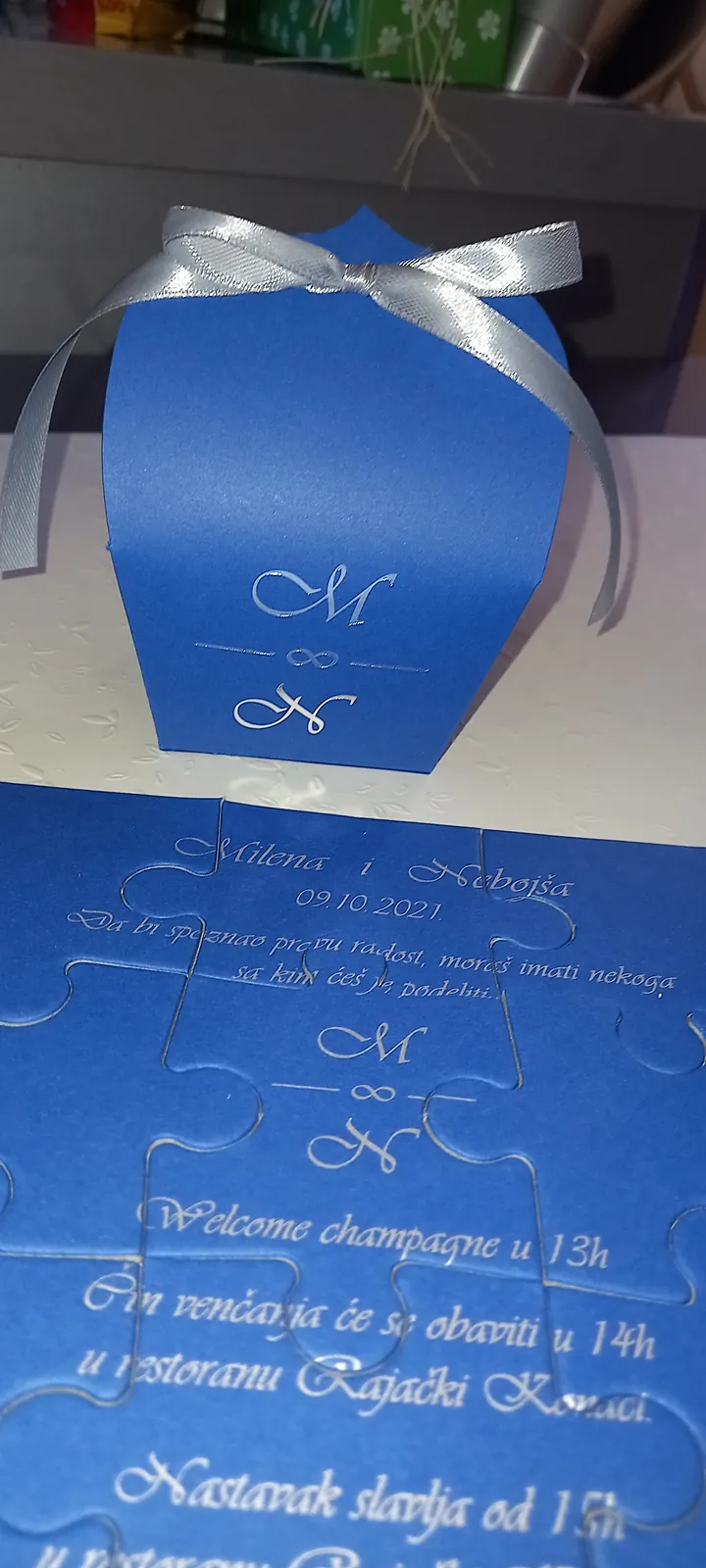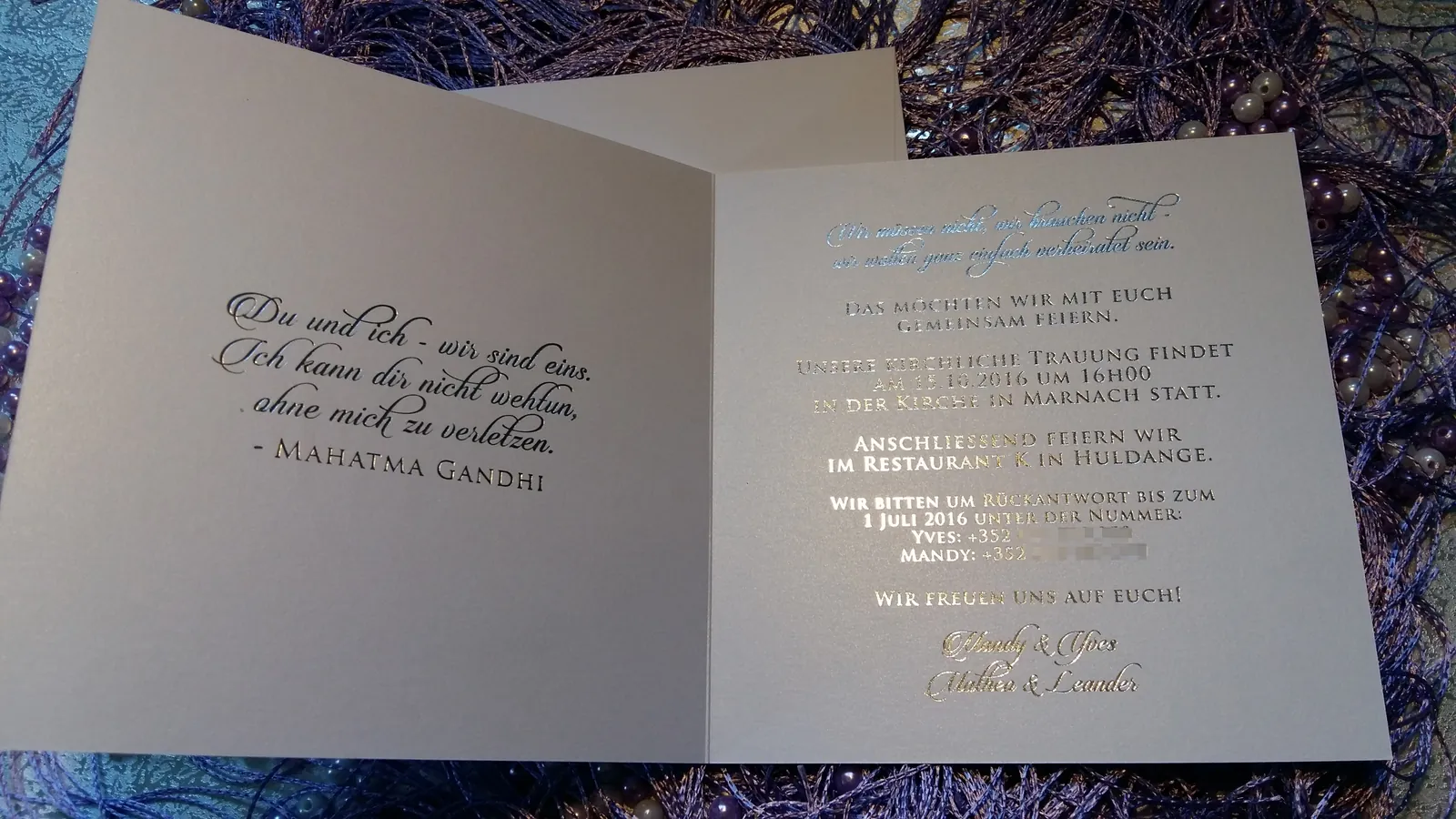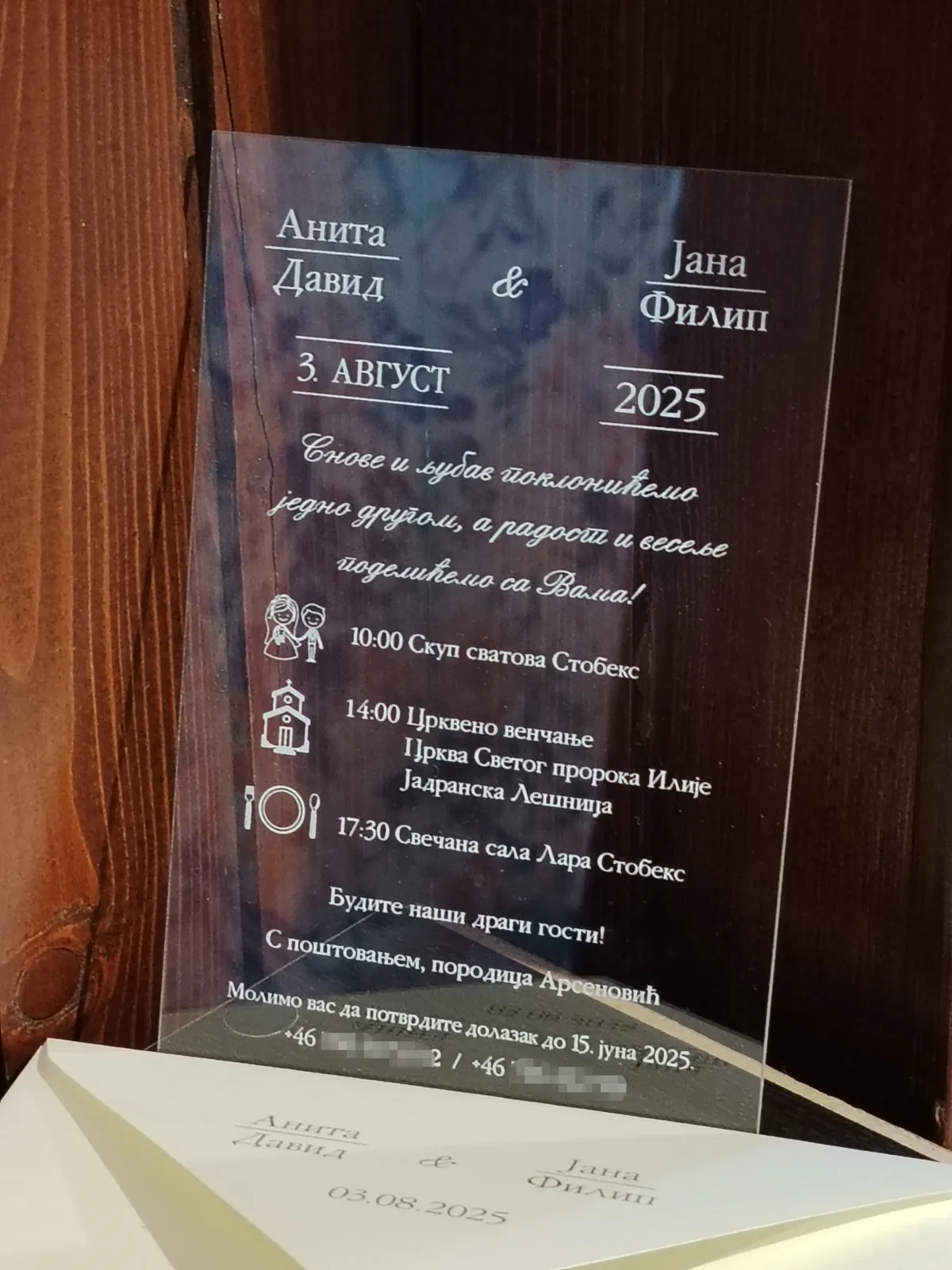 Na kovertama štampamo često inicijale u zlatotisku ili reljefnoj štampi, blindruku. Pečati od voska su prelep ukras za zatvaranje koverata ili pečati od papira sa inicijalima mladencima. Osim naših modela, IZRAĐUJEMO POZIVNICE PO VAŠOJ ŽELJI I VAŠEM DIZAJNU!