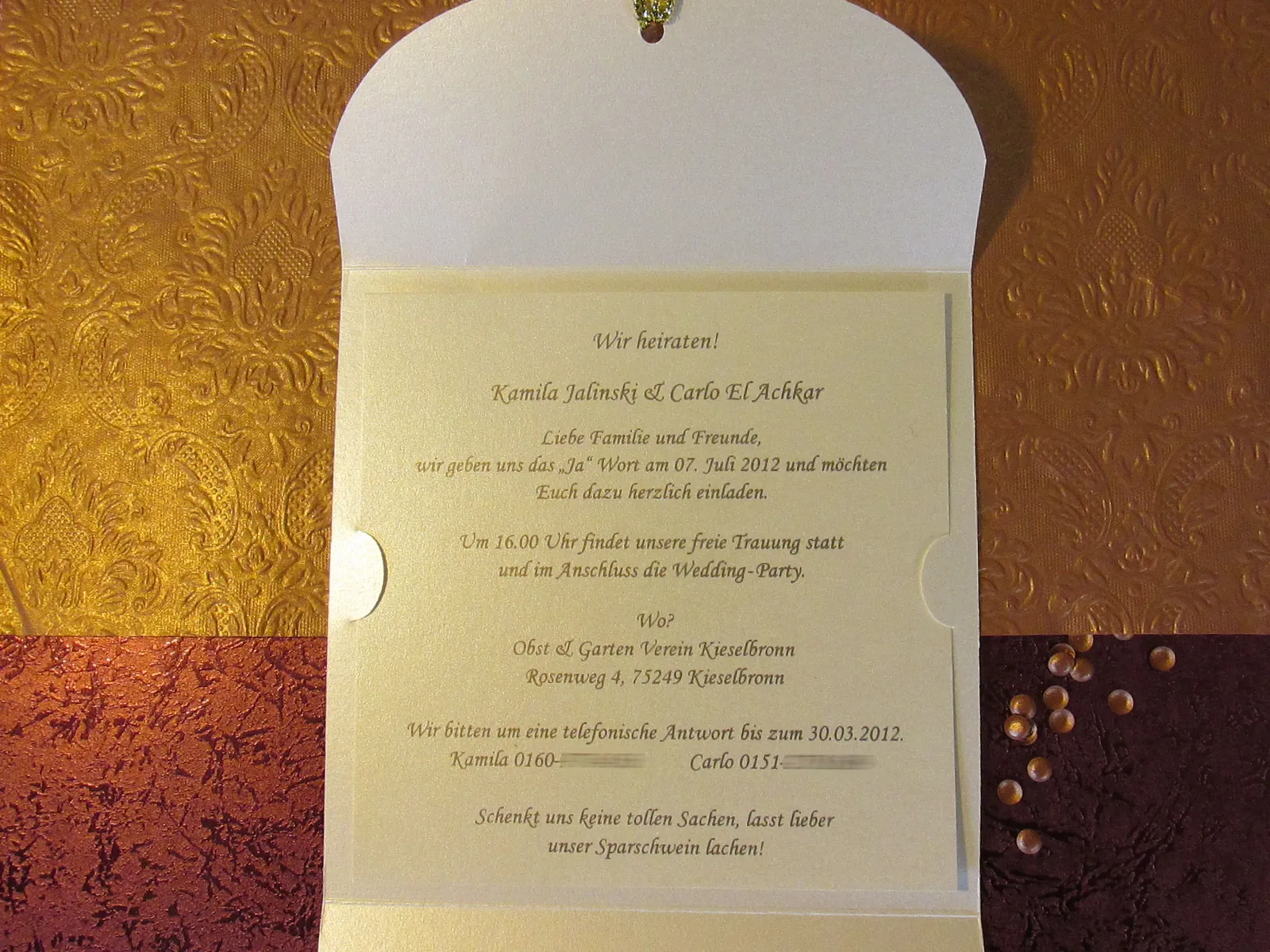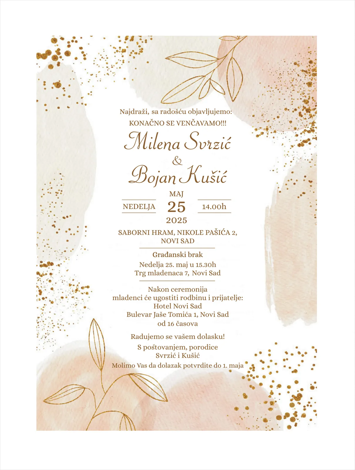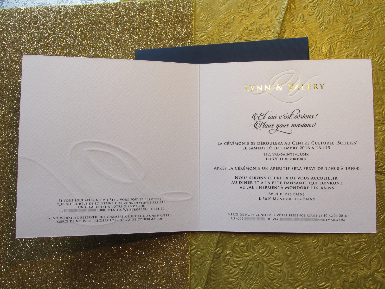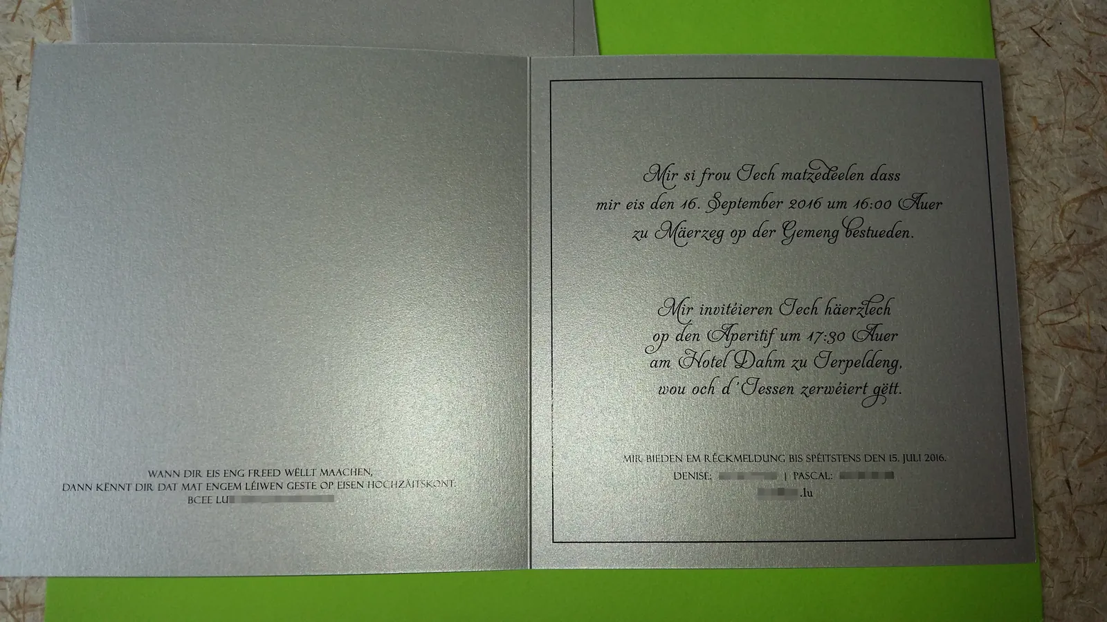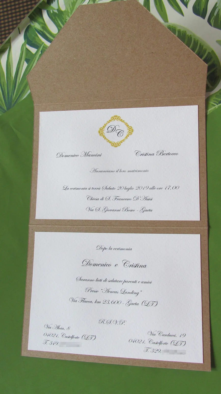 Na kovertama štampamo često inicijale u zlatotisku ili reljefnoj štampi, blindruku. Pečati od voska su prelep ukras za zatvaranje koverata ili pečati od papira sa inicijalima mladencima. Osim naših modela, IZRAĐUJEMO POZIVNICE PO VAŠOJ ŽELJI I VAŠEM DIZAJNU!