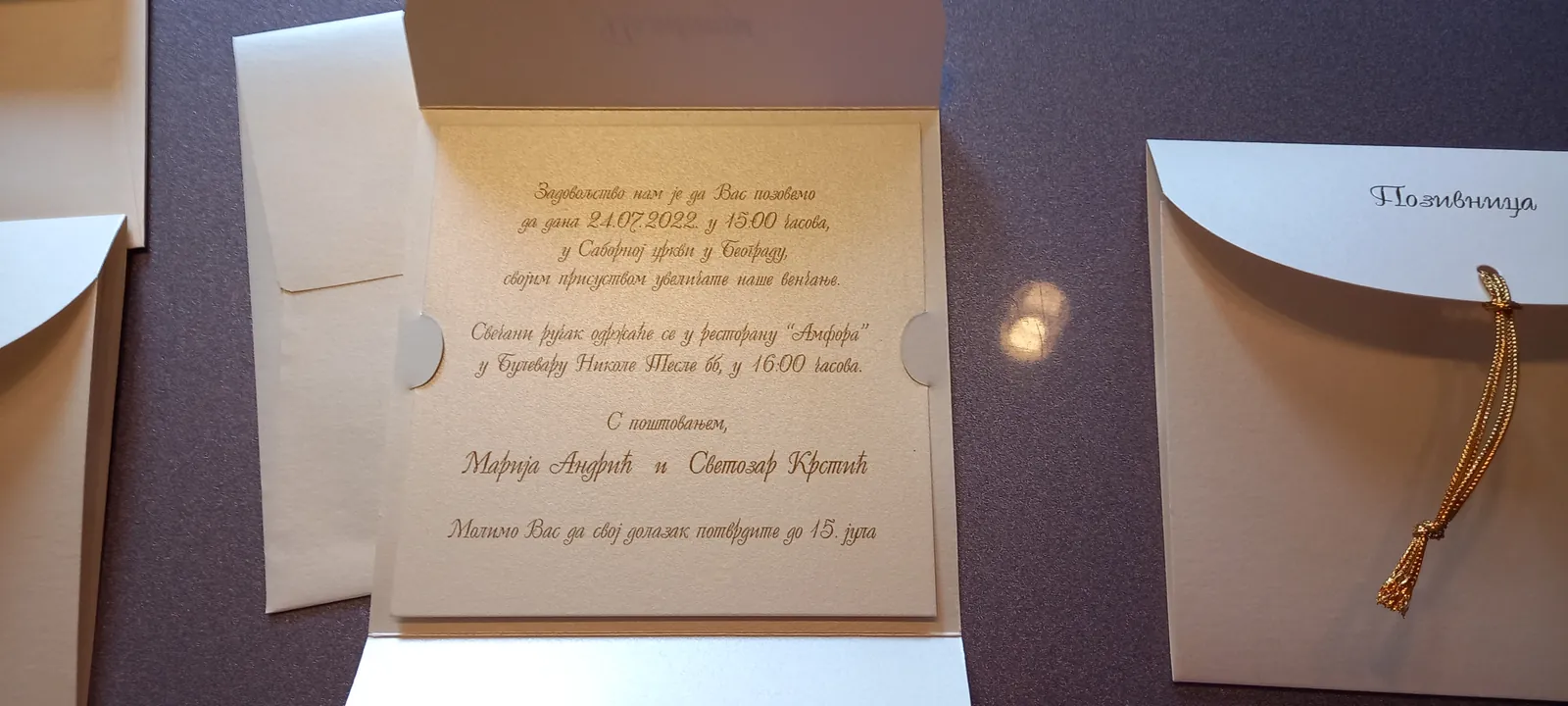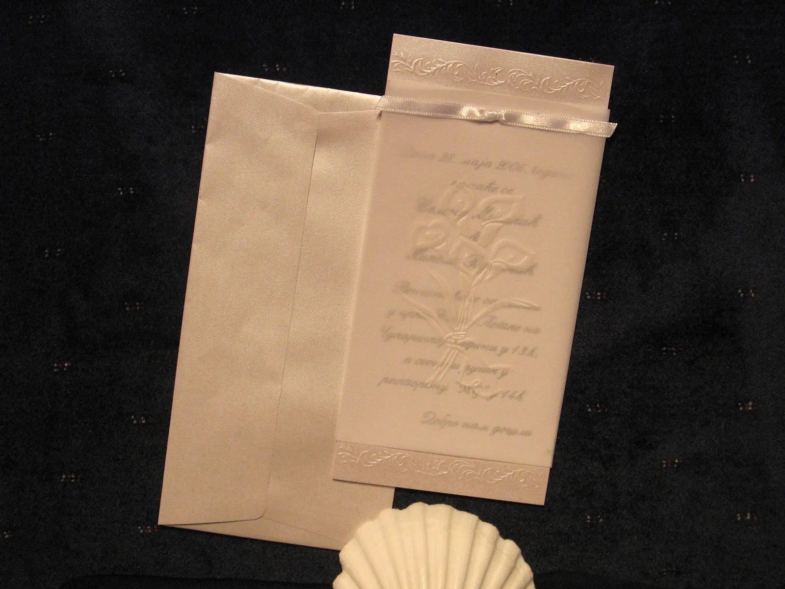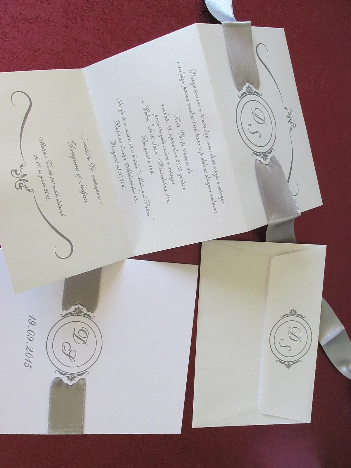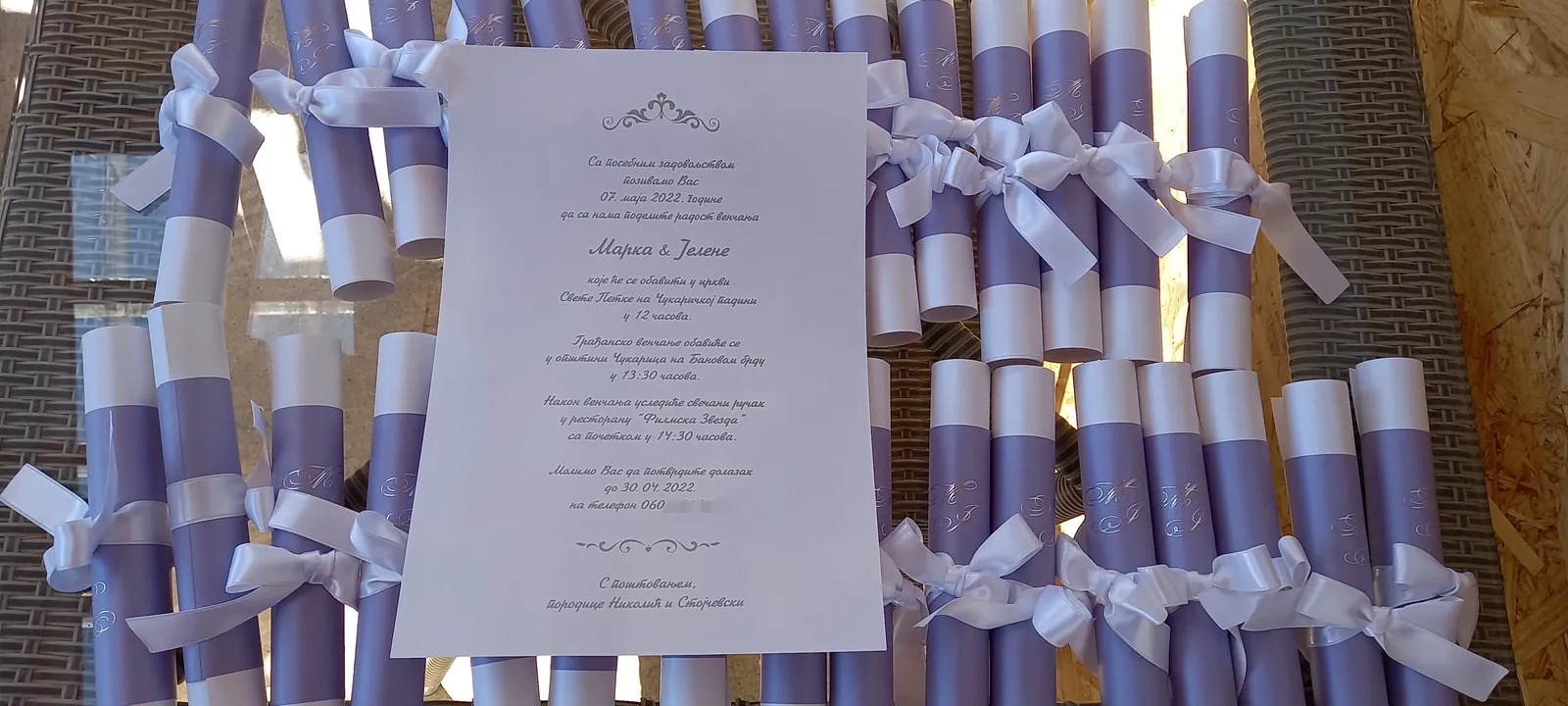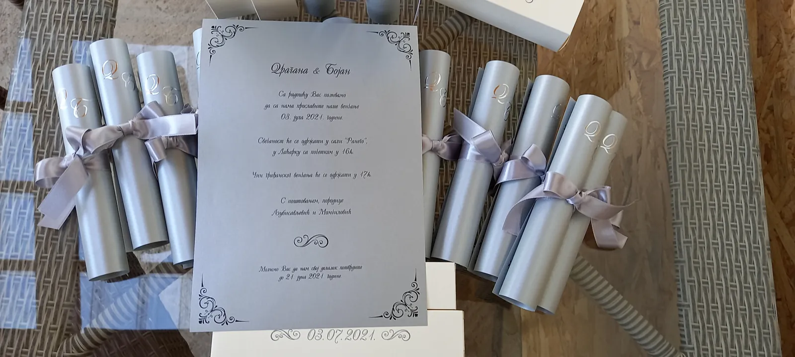 Proizvodimo sve vrste pozivnica i koverata. Svaki model koji je ovde može biti prilagođen vašim željama, može se izraditi od papira u drugoj boji sa drugom bojom satenske trake. Svaka pozivnica i dizajn može imati i svoju elektronsku formu, kako bi se slala Viberom ili WhatsApp-om. Raspolažemo širokim asortimanom specijalnih italijanskih, nemačkih i francuskih papira. Imamo zaista otmene, moderne, luksuzne pozivnice, kao što su: pozivnice na providnim materijalima, pleksiglasu ili tanjoj plastici, pozivnice u kutijima raznih oblika, pozivnice u rolni, pozivnice sa zlatotiskom, srebrotiskom, pozivnice u reljefnim tehnikama štampe: u tehnici letterpress (utisnuta slova) i u tehnici blindruka (ispupčena slova), pozivnice sa čipkom, plišane luksuzne koverte, koverte u svim bojama i u svim formatima.