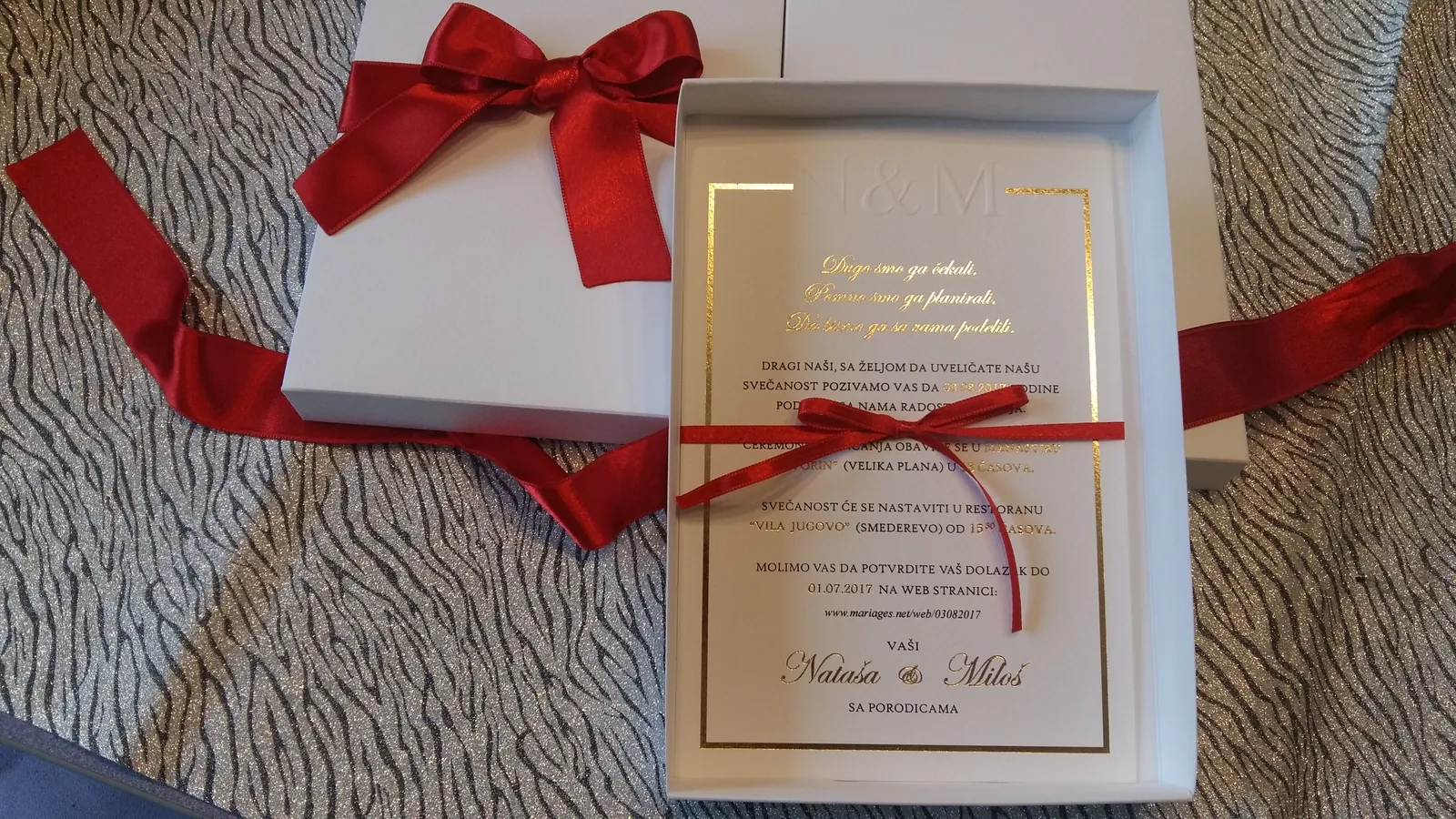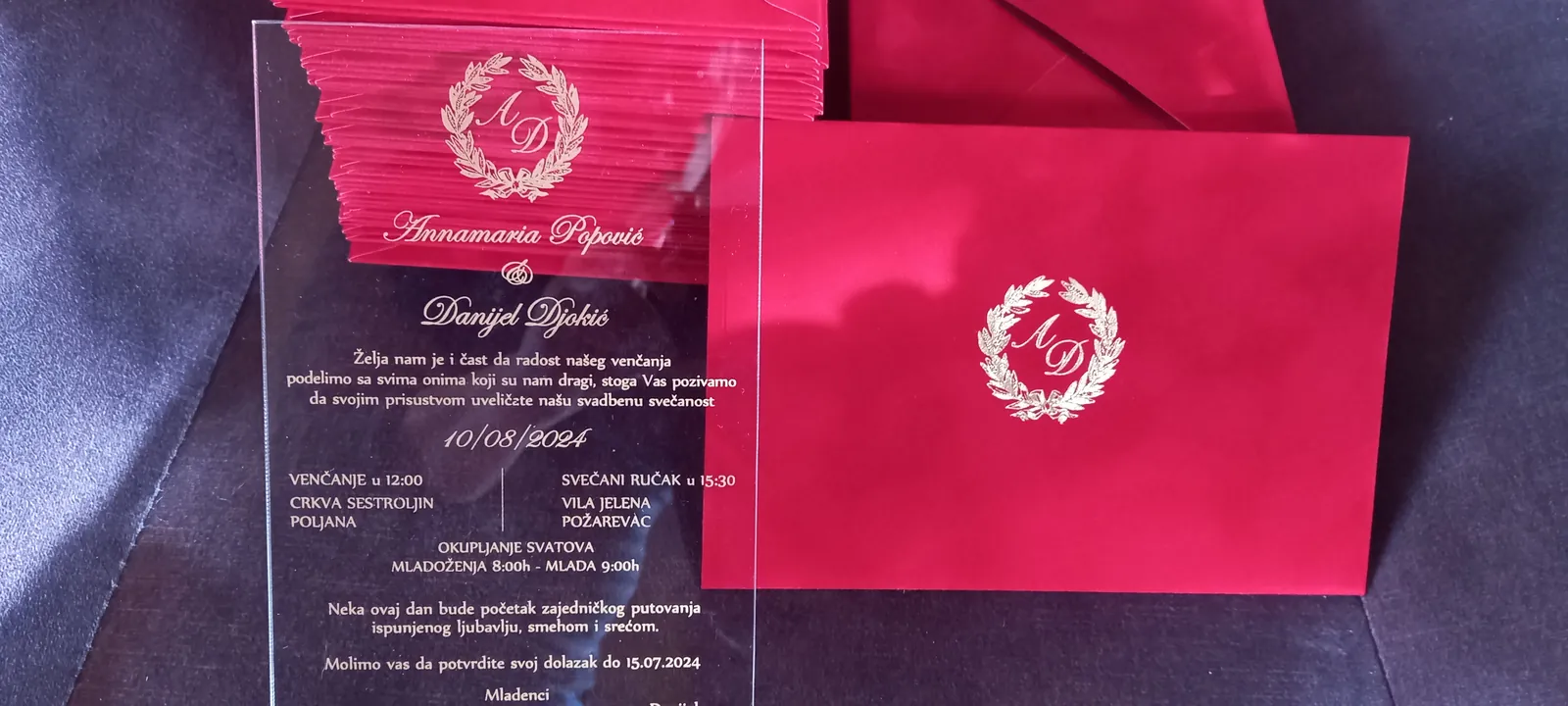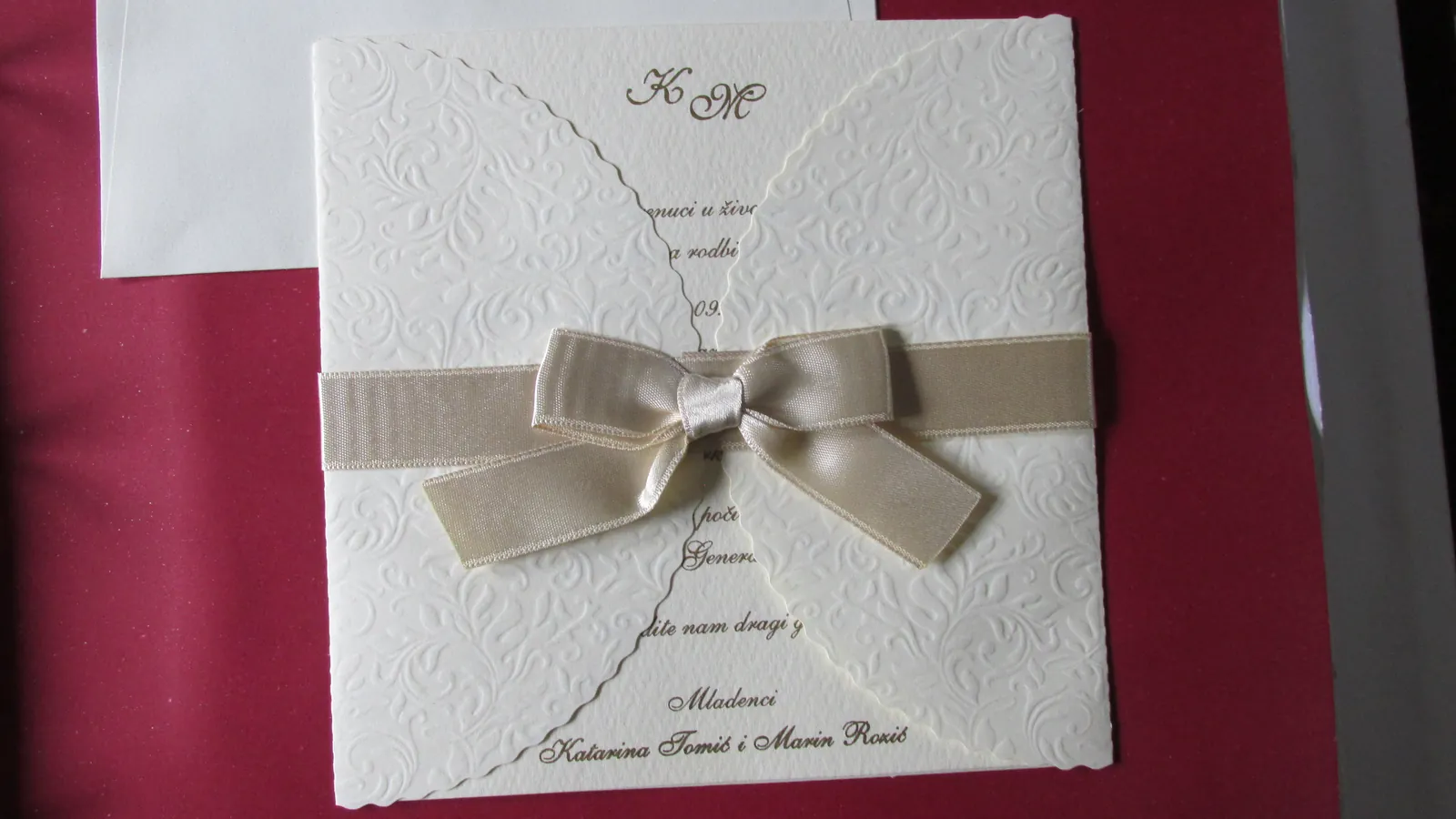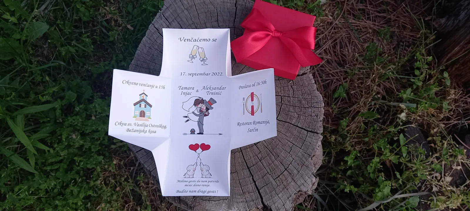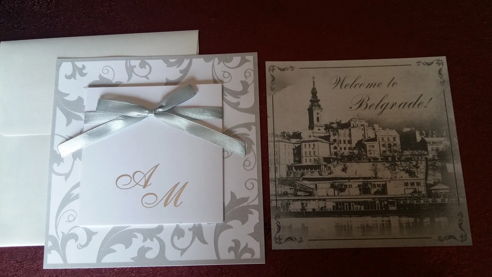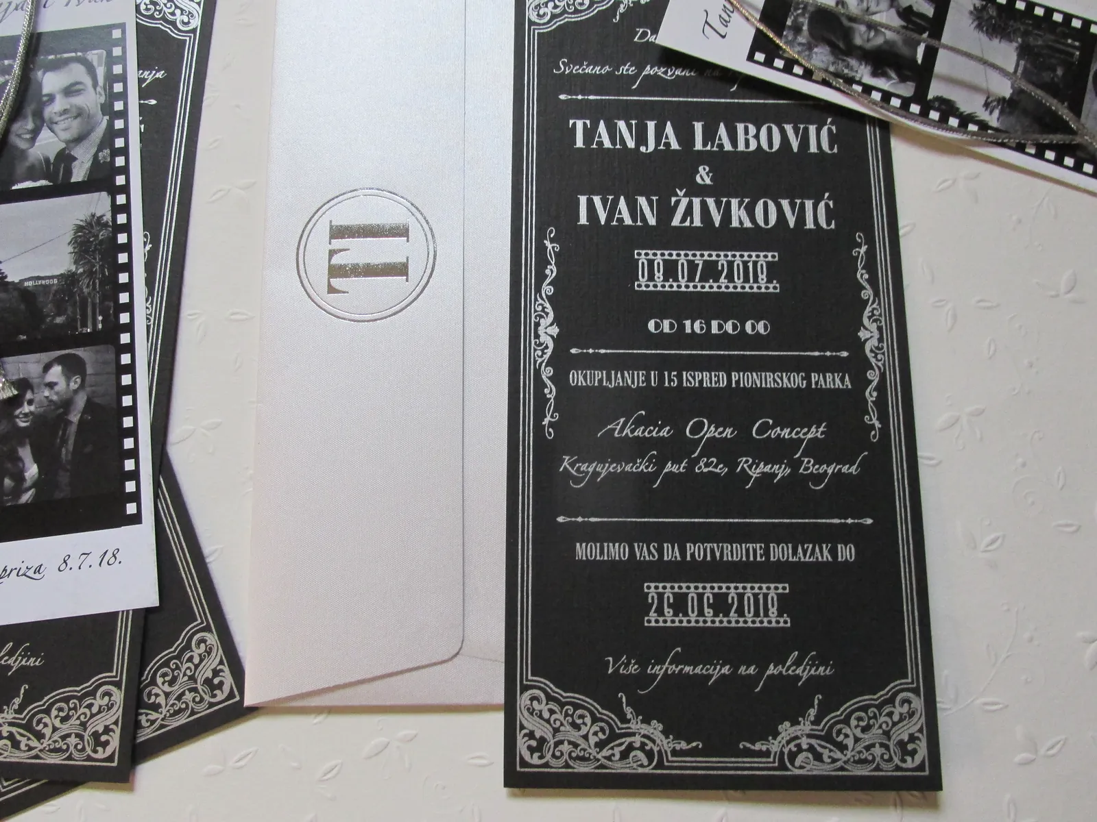 Proizvodimo sve vrste pozivnica i koverata. Svaki model koji je ovde može biti prilagođen vašim željama, može se izraditi od papira u drugoj boji sa drugom bojom satenske trake. Svaka pozivnica i dizajn može imati i svoju elektronsku formu, kako bi se slala Viberom ili WhatsApp-om. Raspolažemo širokim asortimanom specijalnih italijanskih, nemačkih i francuskih papira. Imamo zaista otmene, moderne, luksuzne pozivnice, kao što su: pozivnice na providnim materijalima, pleksiglasu ili tanjoj plastici, pozivnice u kutijima raznih oblika, pozivnice u rolni, pozivnice sa zlatotiskom, srebrotiskom, pozivnice u reljefnim tehnikama štampe: u tehnici letterpress (utisnuta slova) i u tehnici blindruka (ispupčena slova), pozivnice sa čipkom, plišane luksuzne koverte, koverte u svim bojama i u svim formatima.