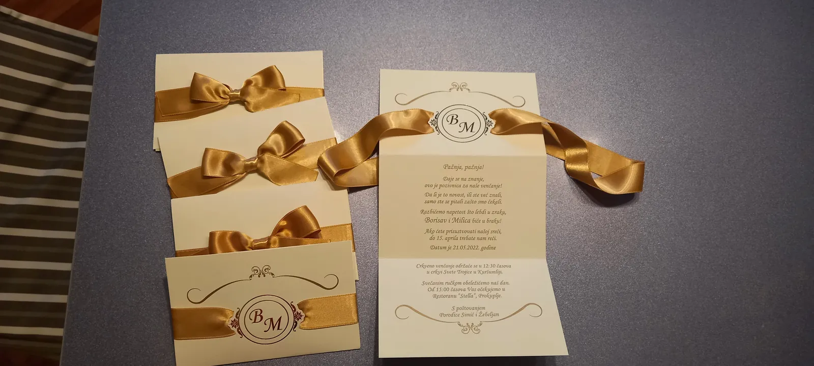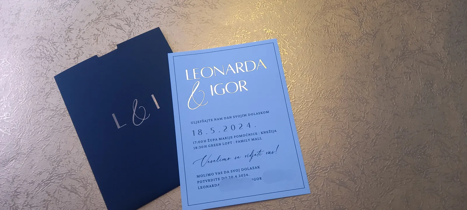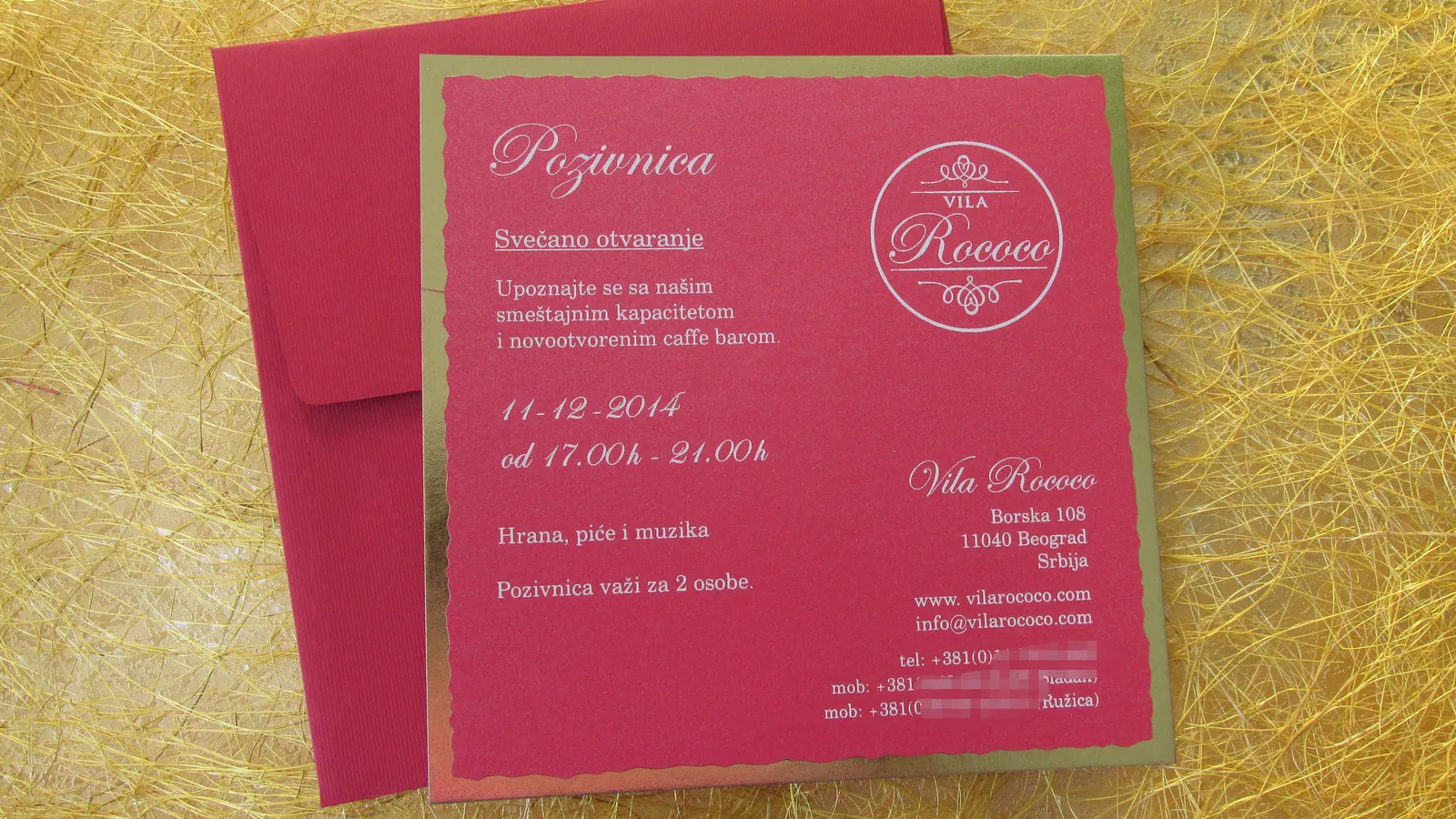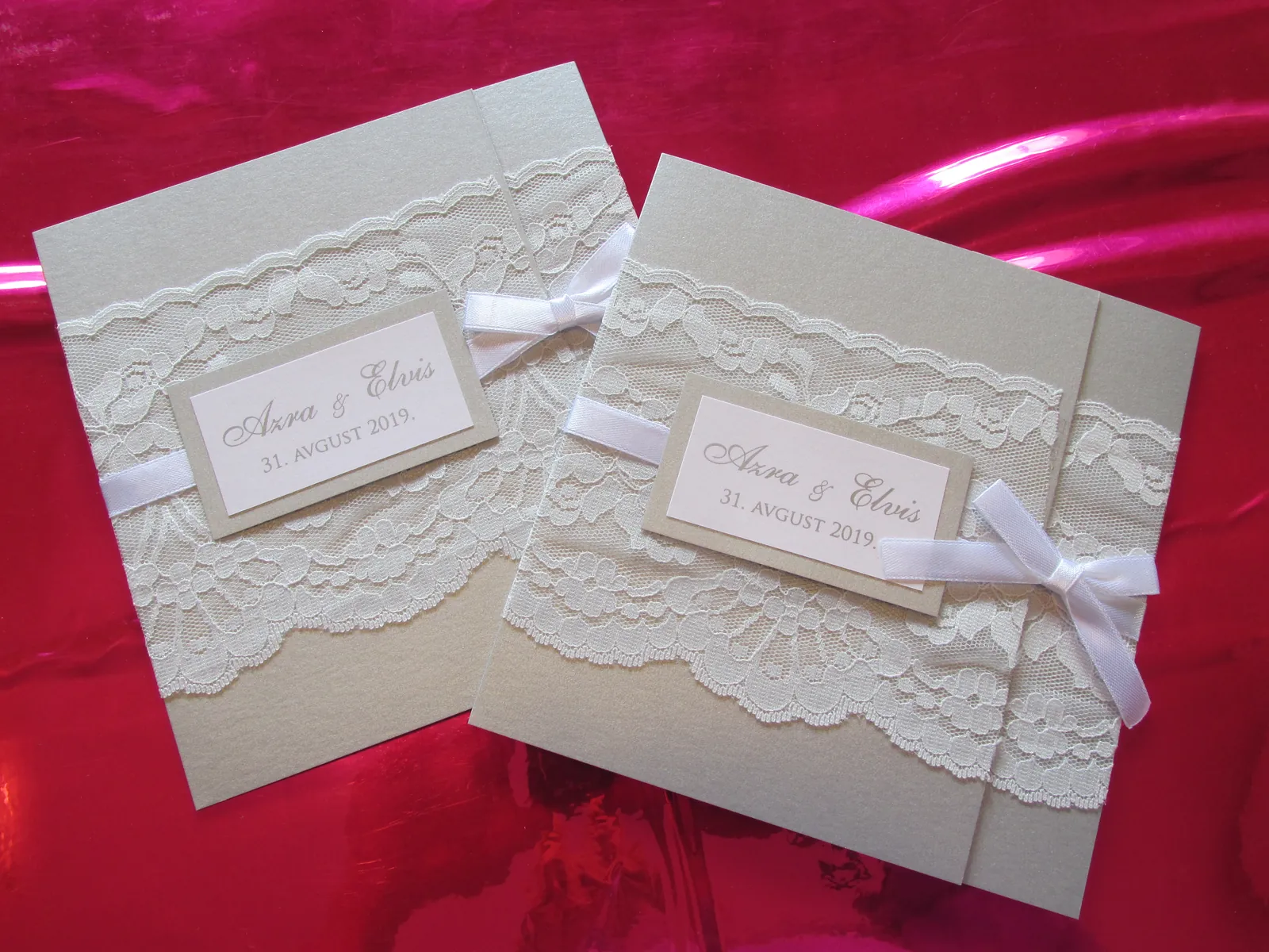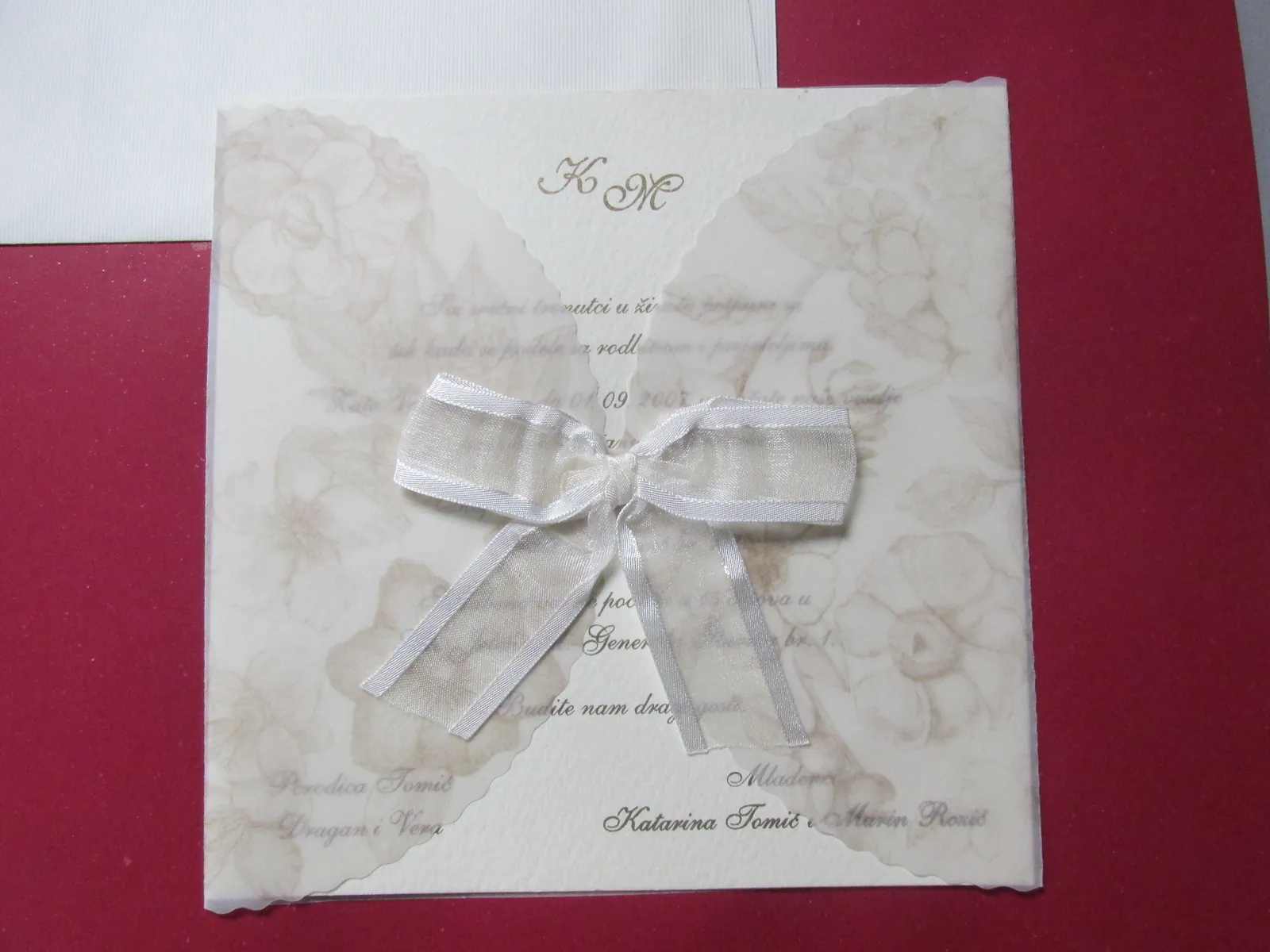 Proizvodimo sve vrste pozivnica i koverata. Svaki model koji je ovde može biti prilagođen vašim željama, može se izraditi od papira u drugoj boji sa drugom bojom satenske trake. Svaka pozivnica i dizajn može imati i svoju elektronsku formu, kako bi se slala Viberom ili WhatsApp-om. Raspolažemo širokim asortimanom specijalnih italijanskih, nemačkih i francuskih papira. Imamo zaista otmene, moderne, luksuzne pozivnice, kao što su: pozivnice na providnim materijalima, pleksiglasu ili tanjoj plastici, pozivnice u kutijima raznih oblika, pozivnice u rolni, pozivnice sa zlatotiskom, srebrotiskom, pozivnice u reljefnim tehnikama štampe: u tehnici letterpress (utisnuta slova) i u tehnici blindruka (ispupčena slova), pozivnice sa čipkom, plišane luksuzne koverte, koverte u svim bojama i u svim formatima.