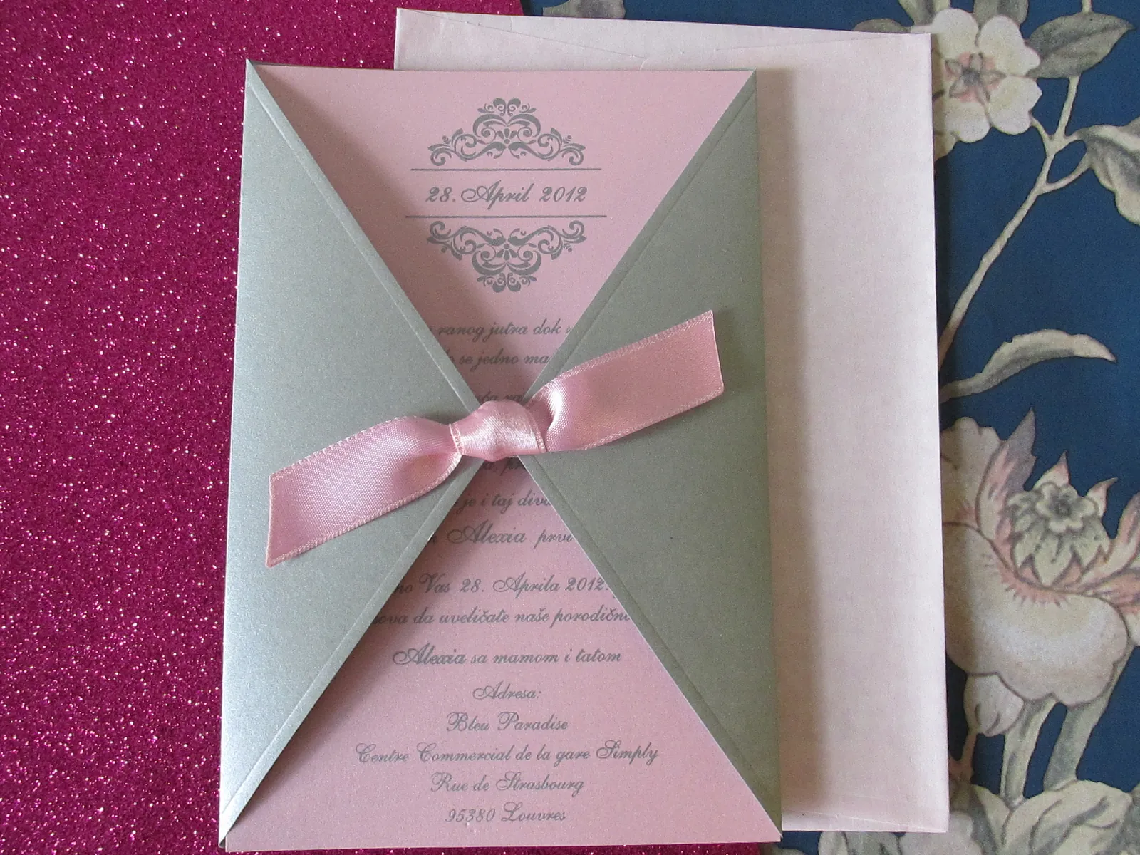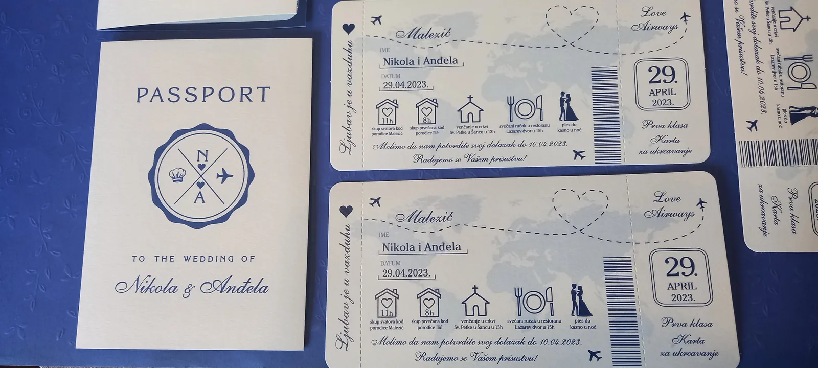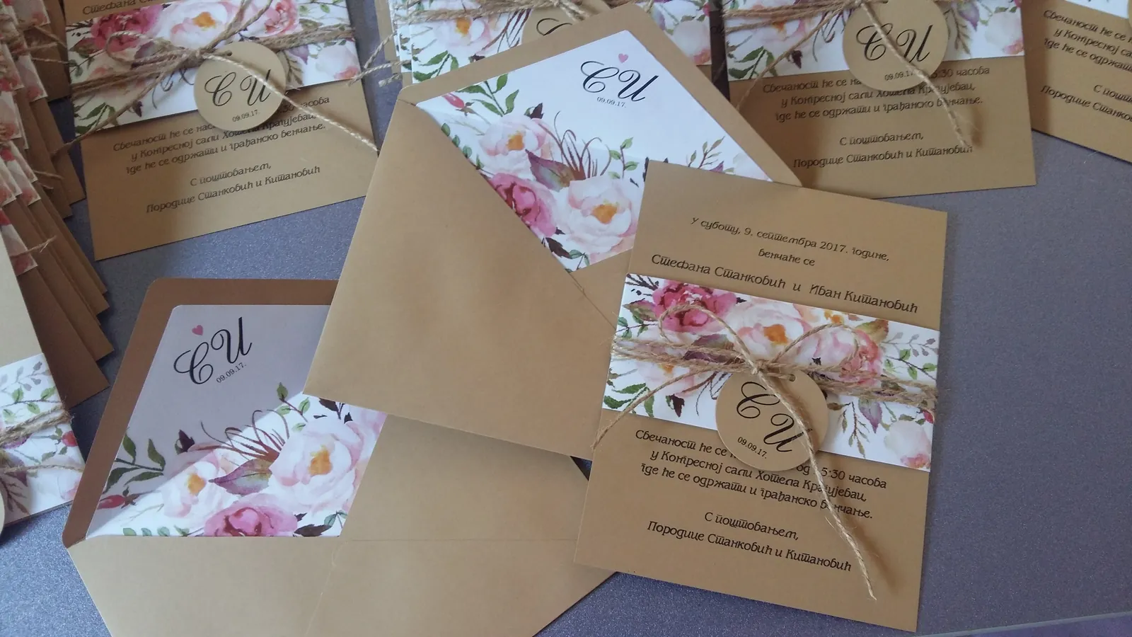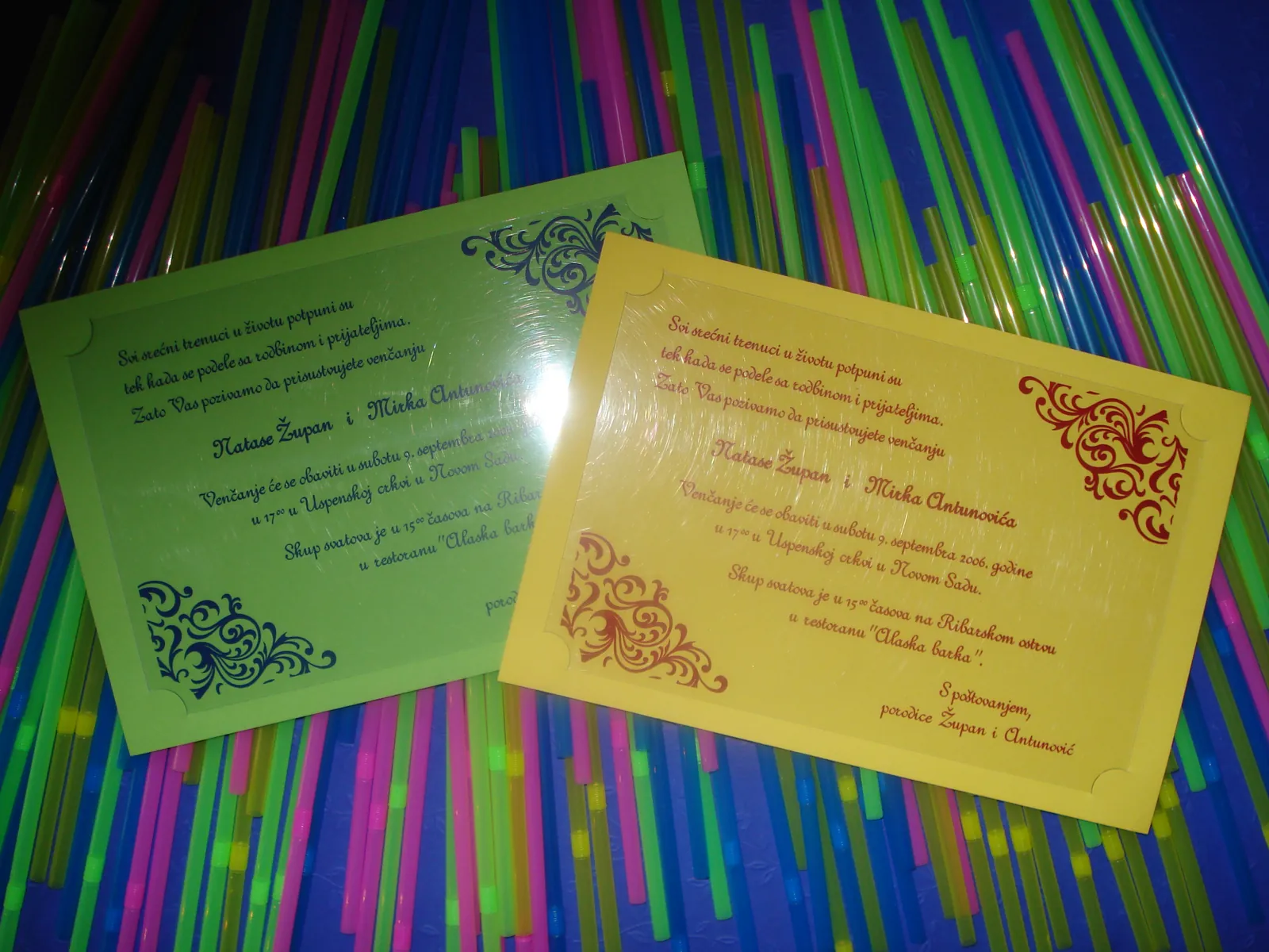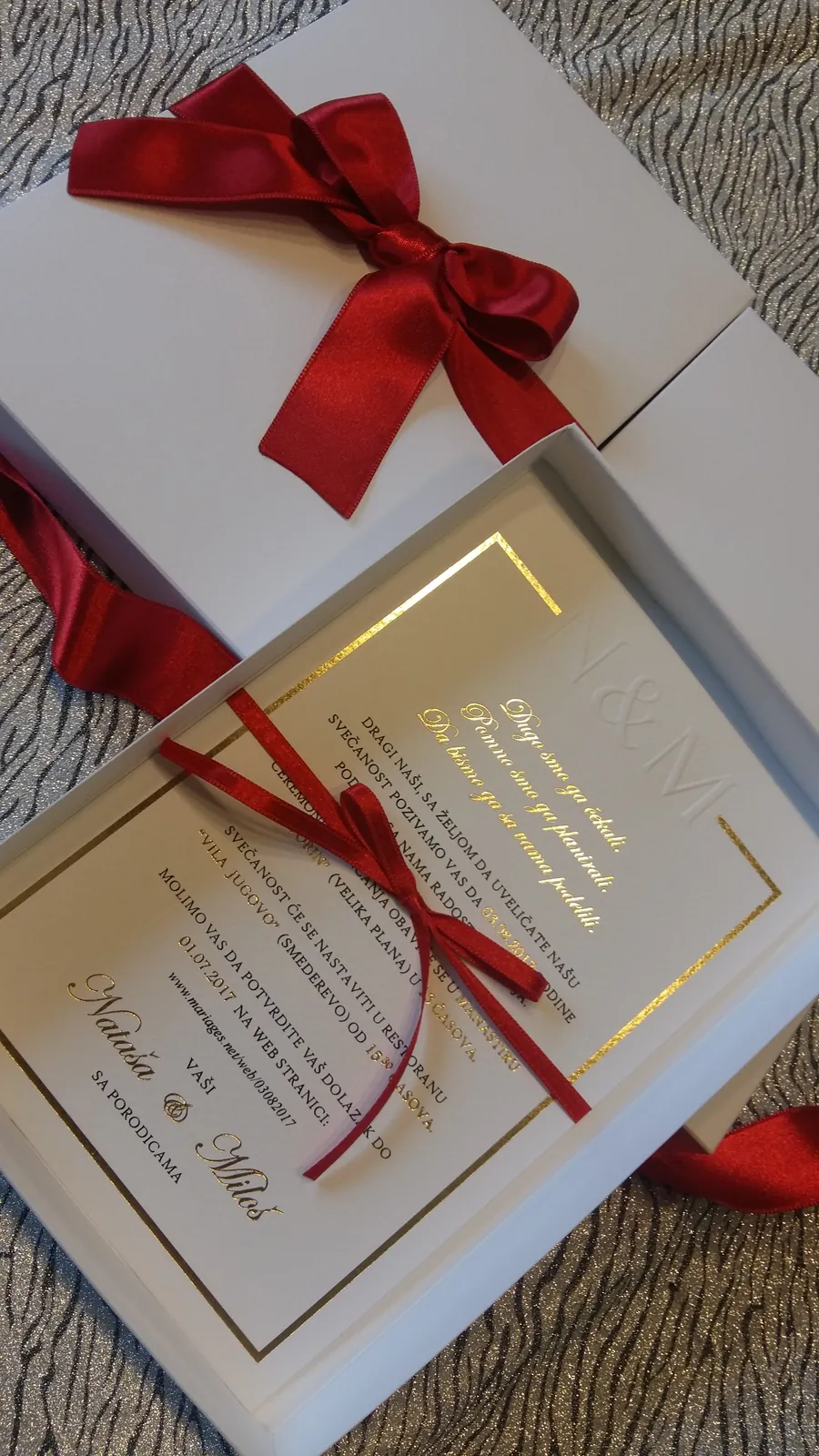 Proizvodimo sve vrste pozivnica i koverata. Svaki model koji je ovde može biti prilagođen vašim željama, može se izraditi od papira u drugoj boji sa drugom bojom satenske trake. Svaka pozivnica i dizajn može imati i svoju elektronsku formu, kako bi se slala Viberom ili WhatsApp-om. Raspolažemo širokim asortimanom specijalnih italijanskih, nemačkih i francuskih papira. Imamo zaista otmene, moderne, luksuzne pozivnice, kao što su: pozivnice na providnim materijalima, pleksiglasu ili tanjoj plastici, pozivnice u kutijima raznih oblika, pozivnice u rolni, pozivnice sa zlatotiskom, srebrotiskom, pozivnice u reljefnim tehnikama štampe: u tehnici letterpress (utisnuta slova) i u tehnici blindruka (ispupčena slova), pozivnice sa čipkom, plišane luksuzne koverte, koverte u svim bojama i u svim formatima.