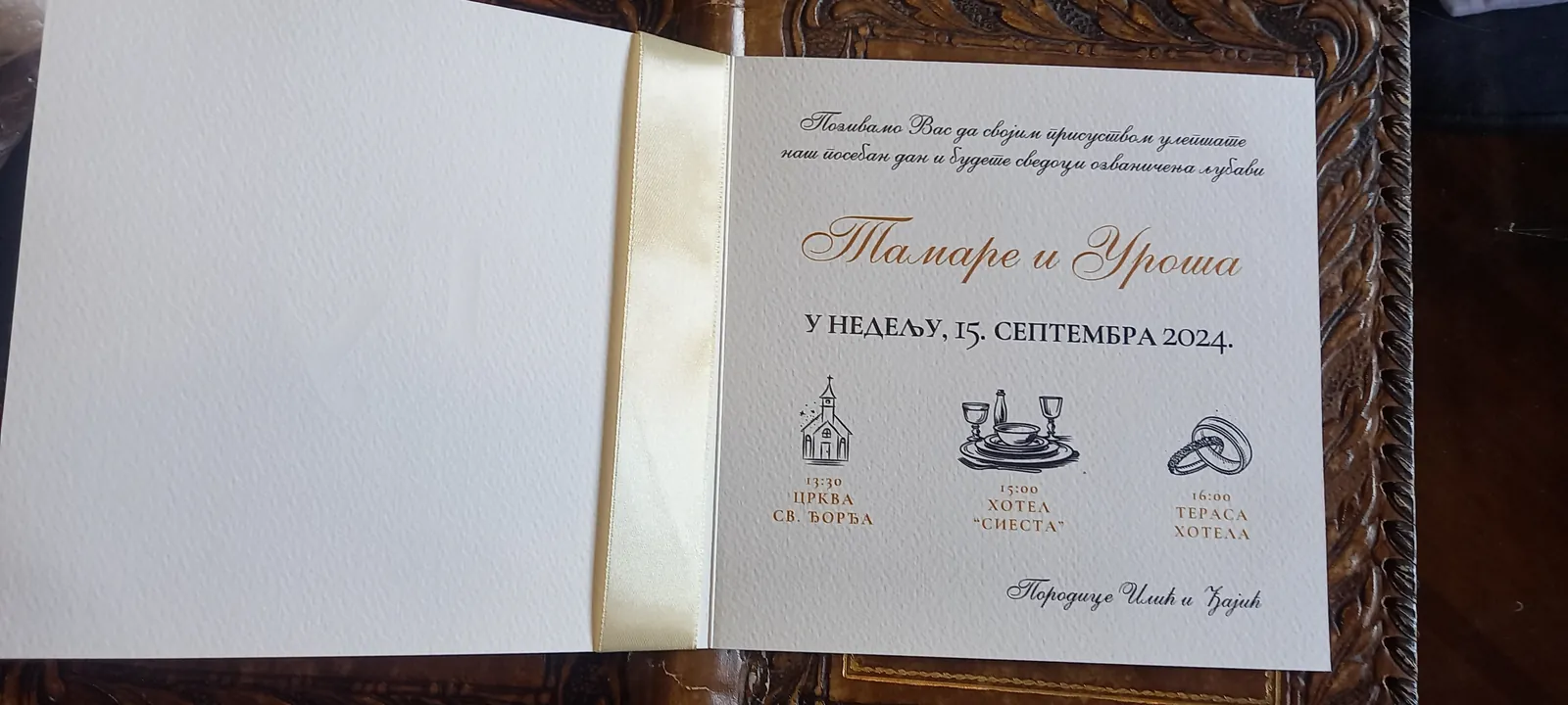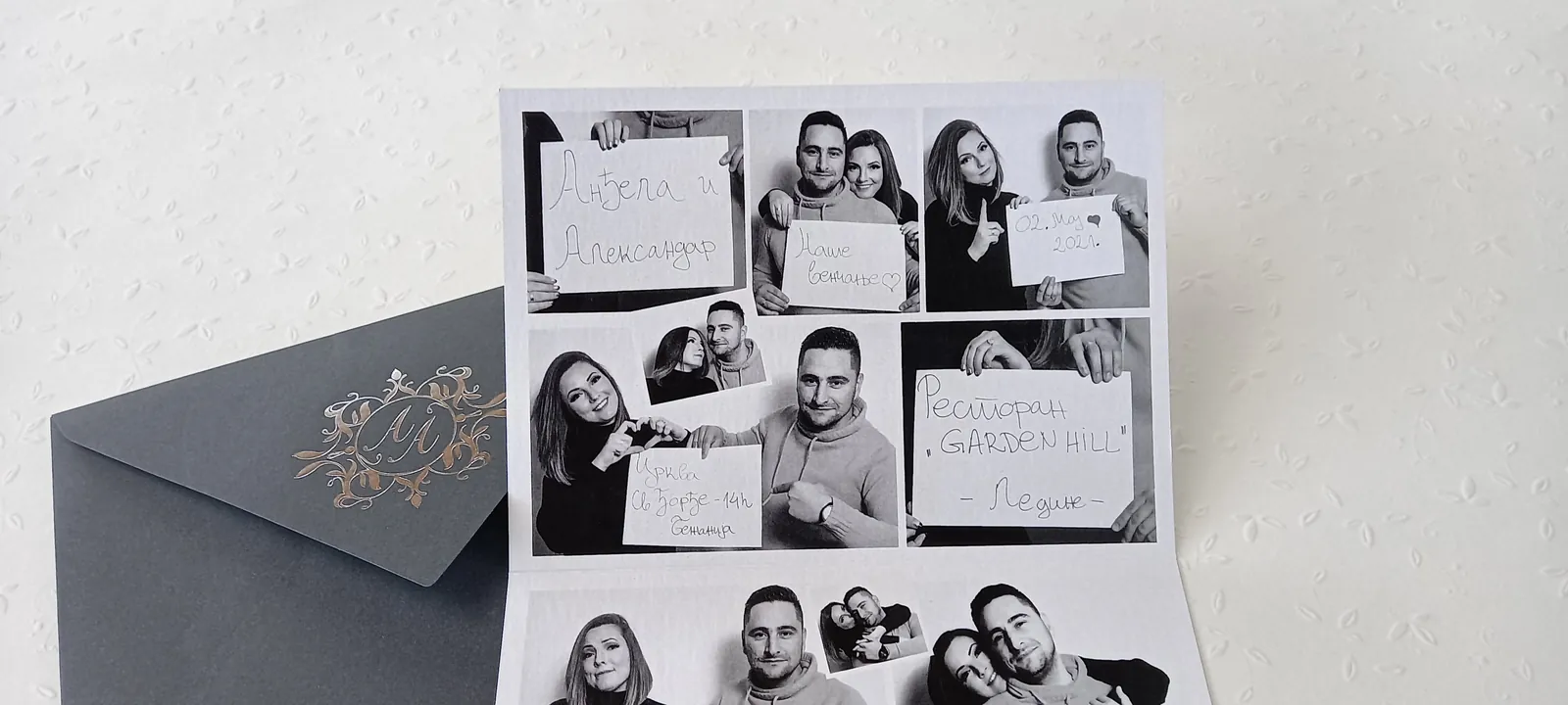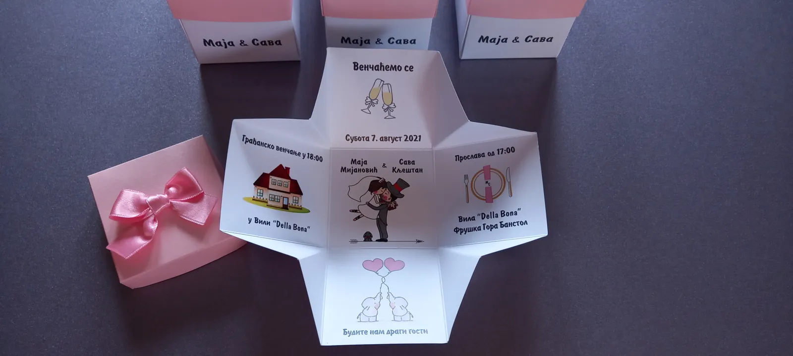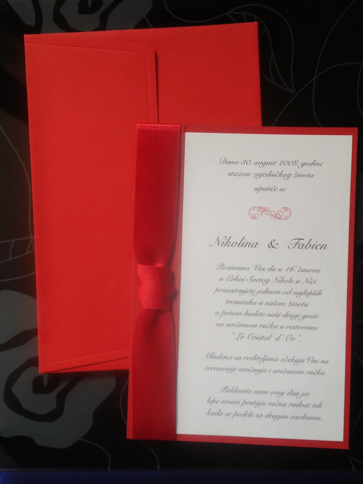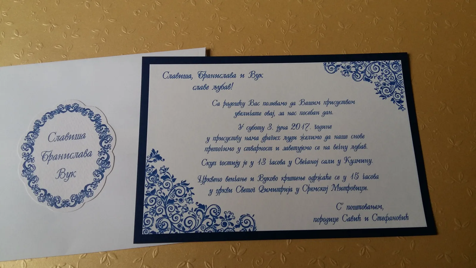 Proizvodimo sve vrste pozivnica i koverata. Svaki model koji je ovde može biti prilagođen vašim željama, može se izraditi od papira u drugoj boji sa drugom bojom satenske trake. Svaka pozivnica i dizajn može imati i svoju elektronsku formu, kako bi se slala Viberom ili WhatsApp-om. Raspolažemo širokim asortimanom specijalnih italijanskih, nemačkih i francuskih papira. Imamo zaista otmene, moderne, luksuzne pozivnice, kao što su: pozivnice na providnim materijalima, pleksiglasu ili tanjoj plastici, pozivnice u kutijima raznih oblika, pozivnice u rolni, pozivnice sa zlatotiskom, srebrotiskom, pozivnice u reljefnim tehnikama štampe: u tehnici letterpress (utisnuta slova) i u tehnici blindruka (ispupčena slova), pozivnice sa čipkom, plišane luksuzne koverte, koverte u svim bojama i u svim formatima.