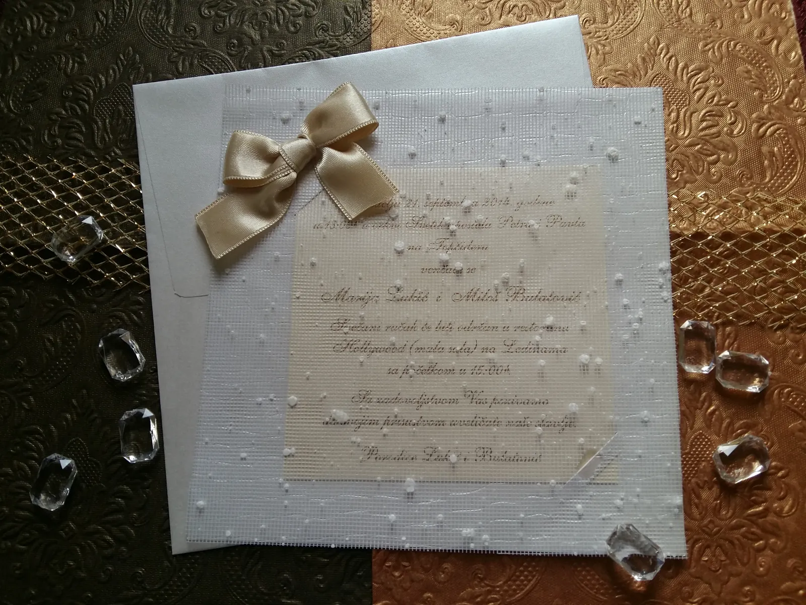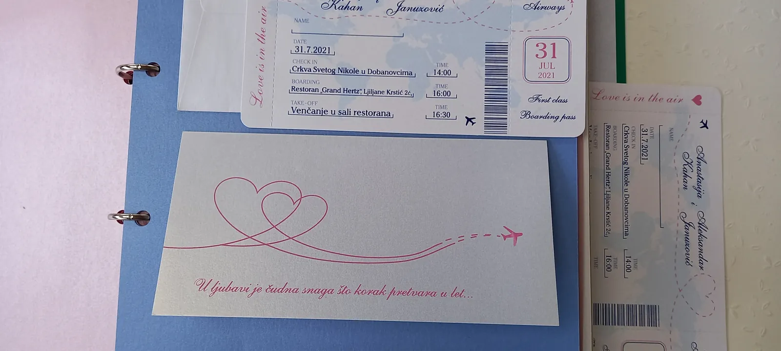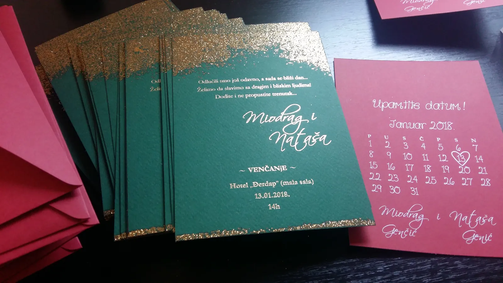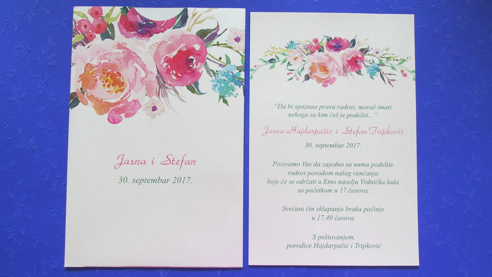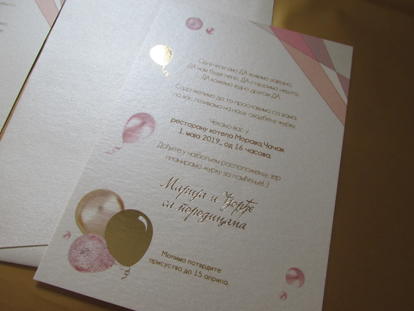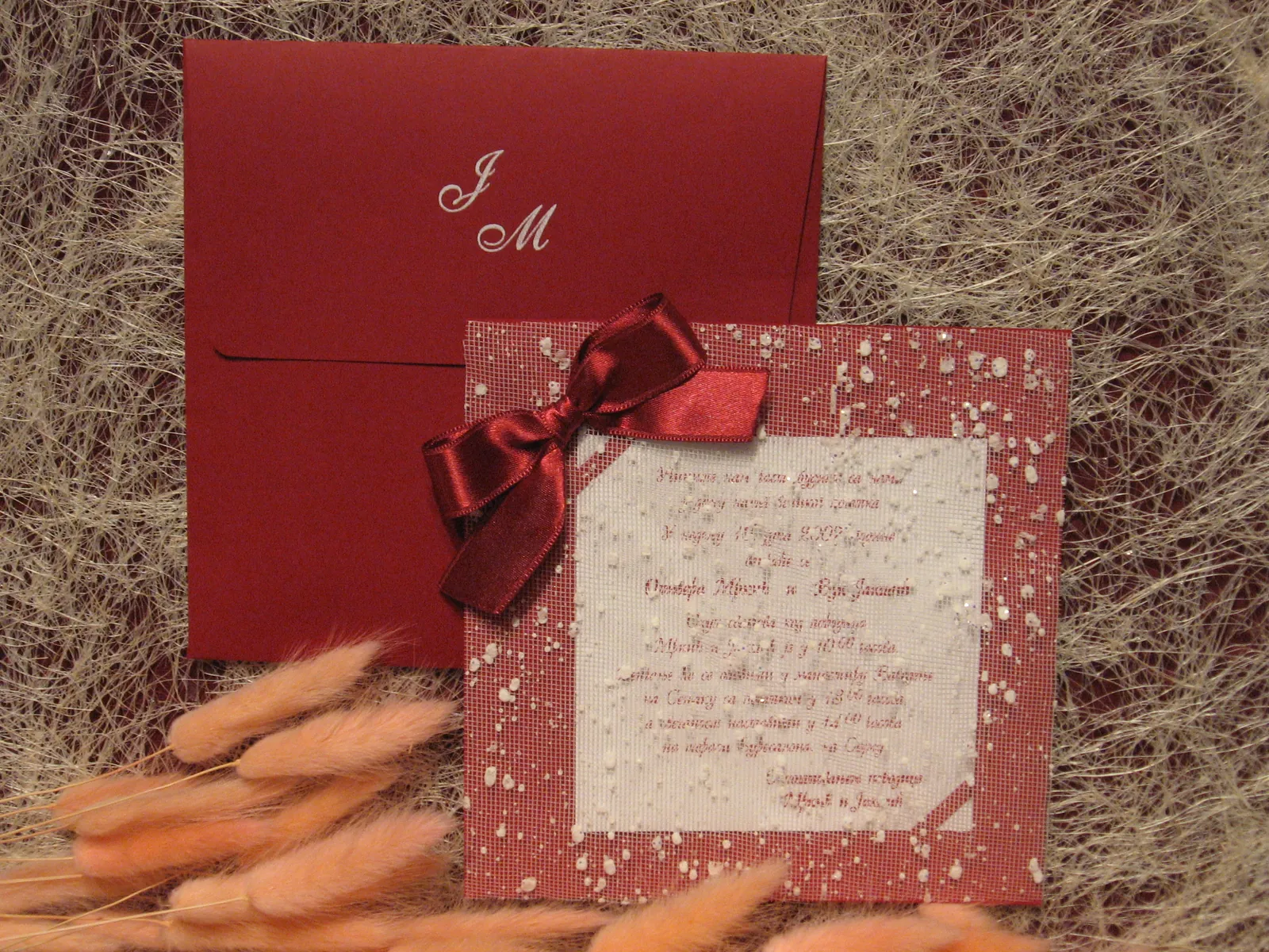 Proizvodimo sve vrste pozivnica i koverata. Svaki model koji je ovde može biti prilagođen vašim željama, može se izraditi od papira u drugoj boji sa drugom bojom satenske trake. Svaka pozivnica i dizajn može imati i svoju elektronsku formu, kako bi se slala Viberom ili WhatsApp-om. Raspolažemo širokim asortimanom specijalnih italijanskih, nemačkih i francuskih papira. Imamo zaista otmene, moderne, luksuzne pozivnice, kao što su: pozivnice na providnim materijalima, pleksiglasu ili tanjoj plastici, pozivnice u kutijima raznih oblika, pozivnice u rolni, pozivnice sa zlatotiskom, srebrotiskom, pozivnice u reljefnim tehnikama štampe: u tehnici letterpress (utisnuta slova) i u tehnici blindruka (ispupčena slova), pozivnice sa čipkom, plišane luksuzne koverte, koverte u svim bojama i u svim formatima.