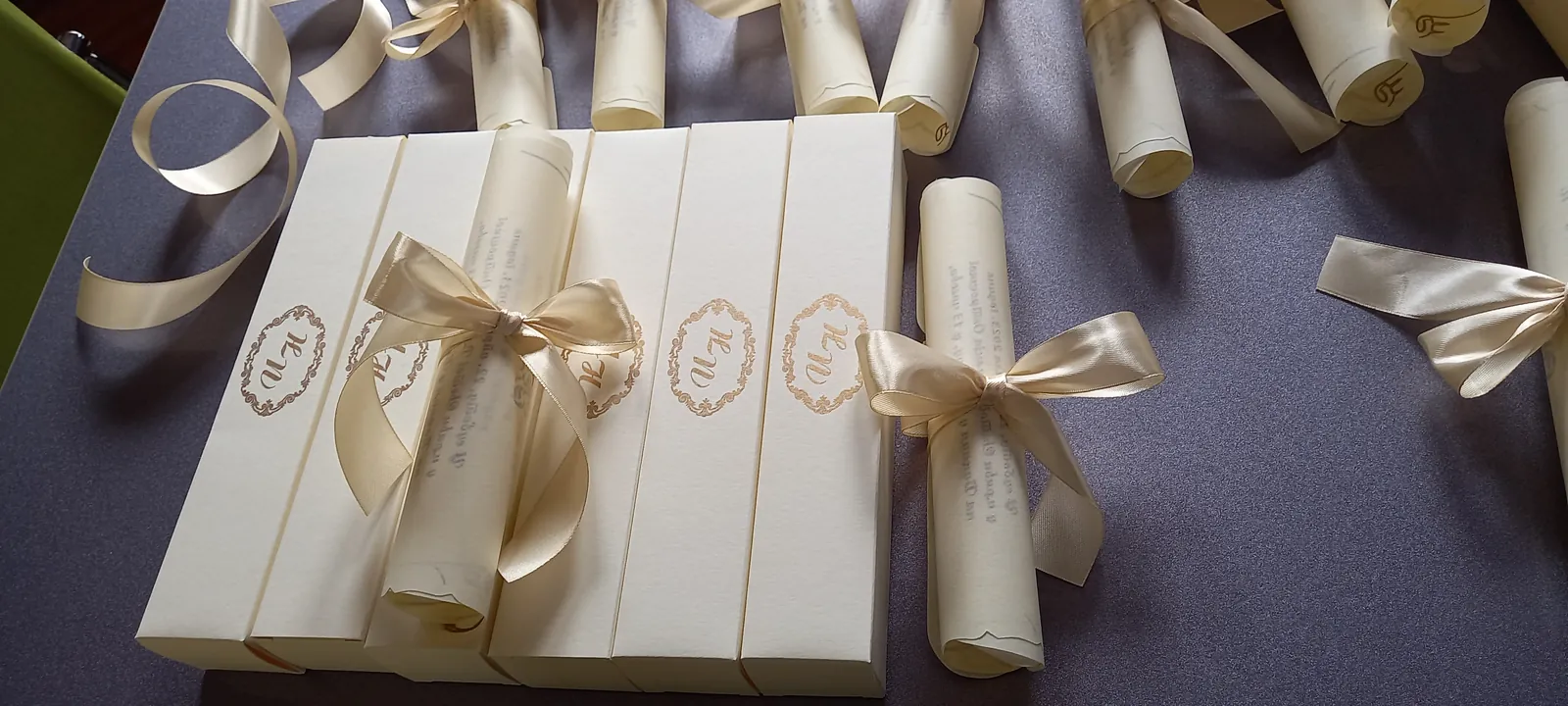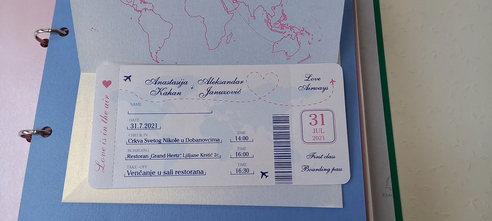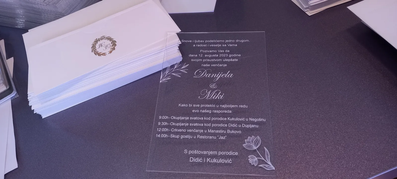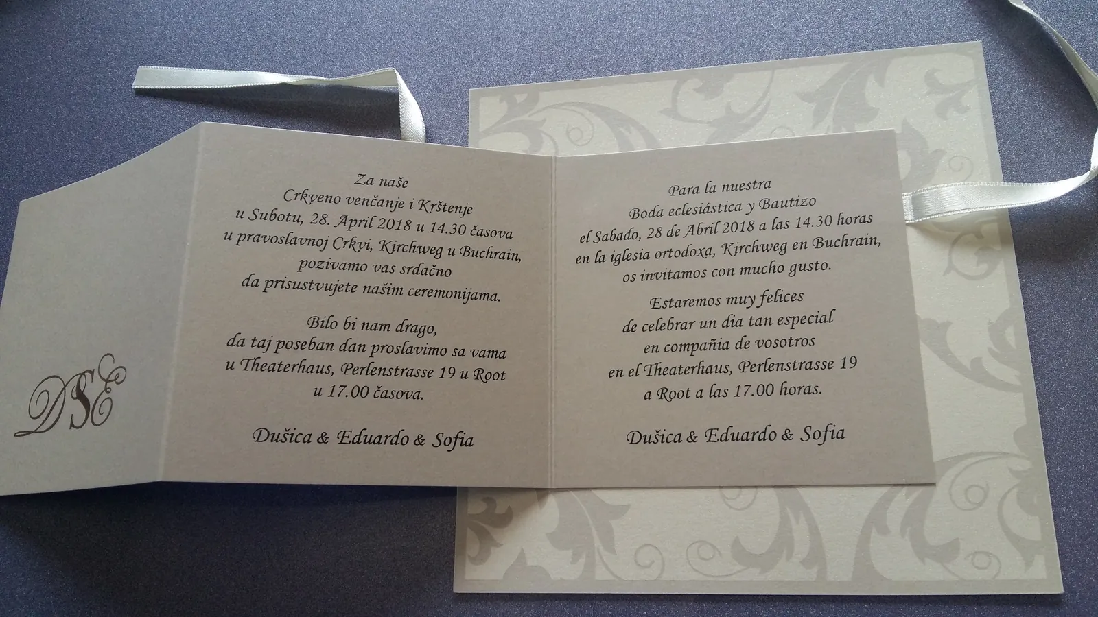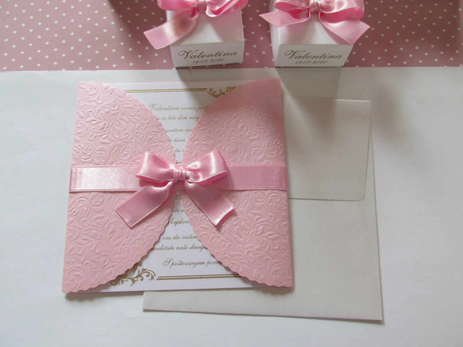 Proizvodimo sve vrste pozivnica i koverata. Svaki model koji je ovde može biti prilagođen vašim željama, može se izraditi od papira u drugoj boji sa drugom bojom satenske trake. Svaka pozivnica i dizajn može imati i svoju elektronsku formu, kako bi se slala Viberom ili WhatsApp-om. Raspolažemo širokim asortimanom specijalnih italijanskih, nemačkih i francuskih papira. Imamo zaista otmene, moderne, luksuzne pozivnice, kao što su: pozivnice na providnim materijalima, pleksiglasu ili tanjoj plastici, pozivnice u kutijima raznih oblika, pozivnice u rolni, pozivnice sa zlatotiskom, srebrotiskom, pozivnice u reljefnim tehnikama štampe: u tehnici letterpress (utisnuta slova) i u tehnici blindruka (ispupčena slova), pozivnice sa čipkom, plišane luksuzne koverte, koverte u svim bojama i u svim formatima.