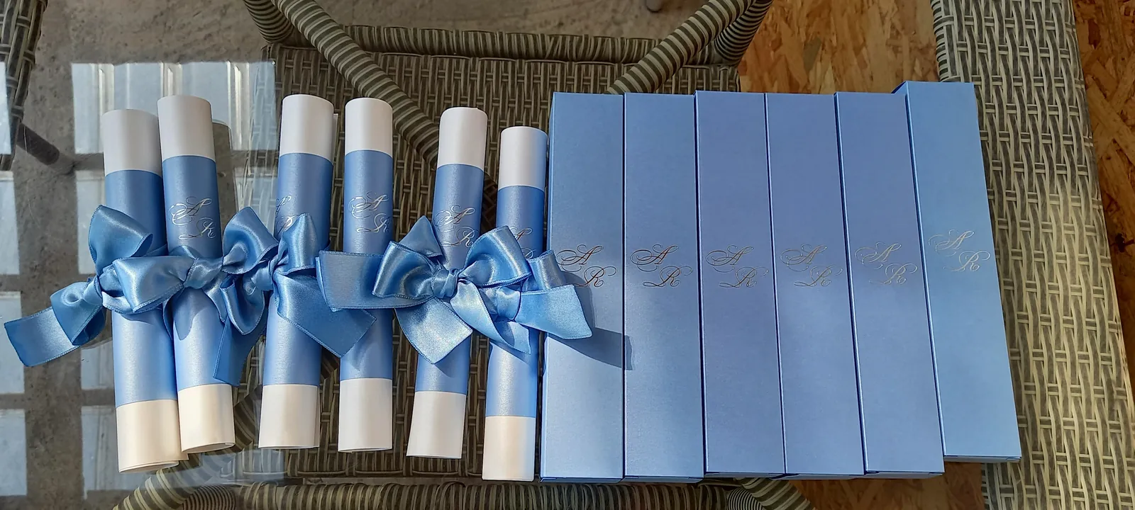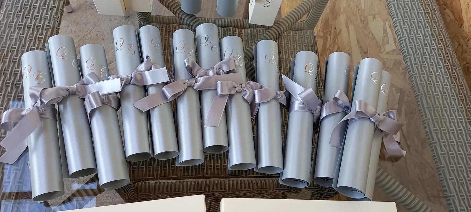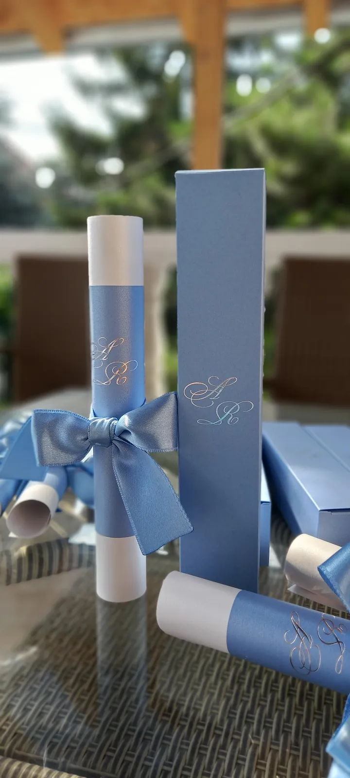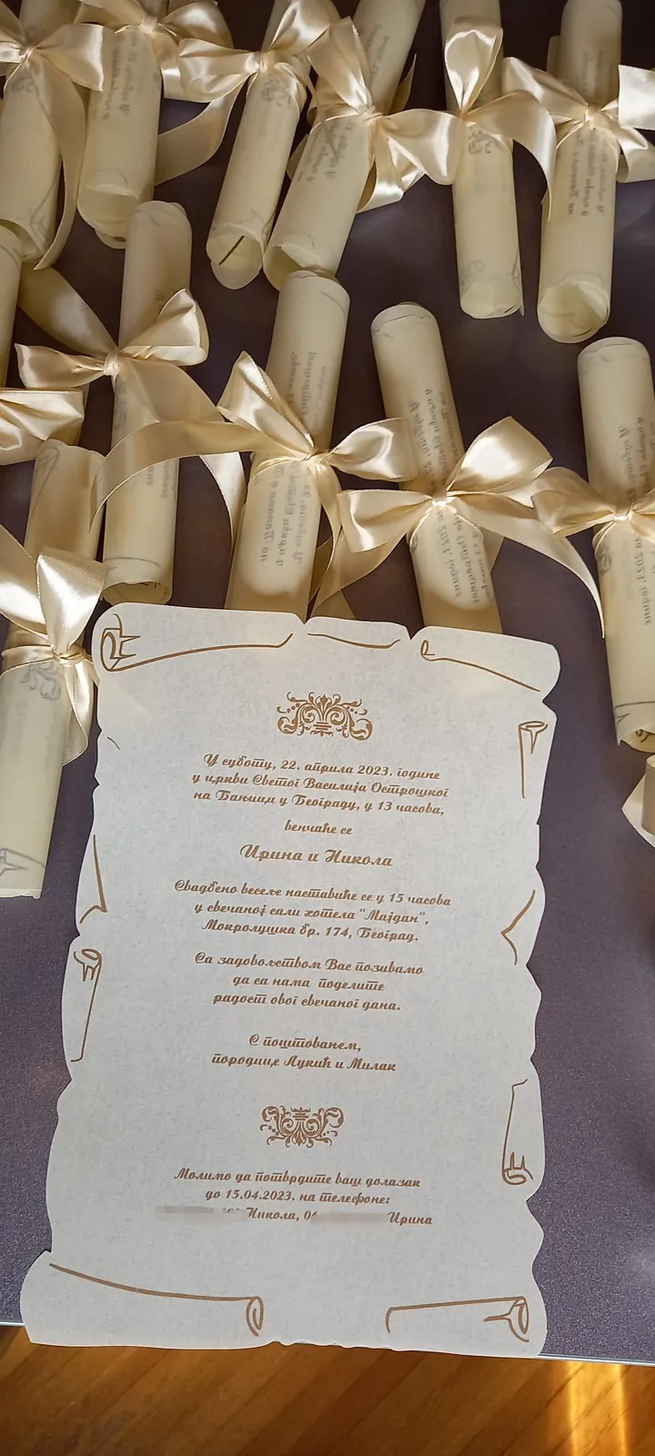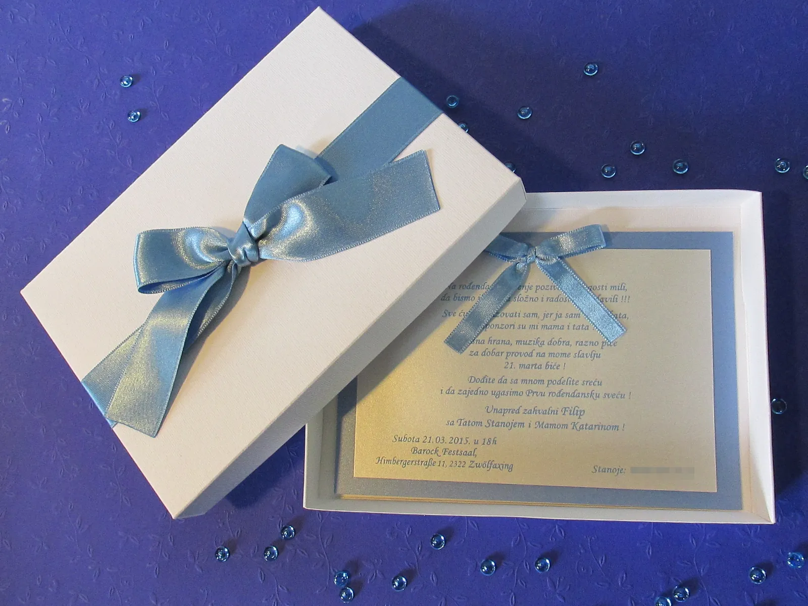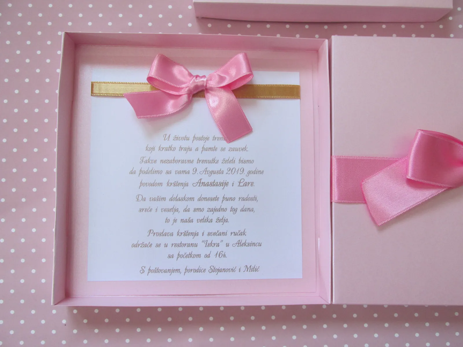 Proizvodimo sve vrste pozivnica i koverata. Svaki model koji je ovde može biti prilagođen vašim željama, može se izraditi od papira u drugoj boji sa drugom bojom satenske trake. Svaka pozivnica i dizajn može imati i svoju elektronsku formu, kako bi se slala Viberom ili WhatsApp-om. Raspolažemo širokim asortimanom specijalnih italijanskih, nemačkih i francuskih papira. Imamo zaista otmene, moderne, luksuzne pozivnice, kao što su: pozivnice na providnim materijalima, pleksiglasu ili tanjoj plastici, pozivnice u kutijima raznih oblika, pozivnice u rolni, pozivnice sa zlatotiskom, srebrotiskom, pozivnice u reljefnim tehnikama štampe: u tehnici letterpress (utisnuta slova) i u tehnici blindruka (ispupčena slova), pozivnice sa čipkom, plišane luksuzne koverte, koverte u svim bojama i u svim formatima.