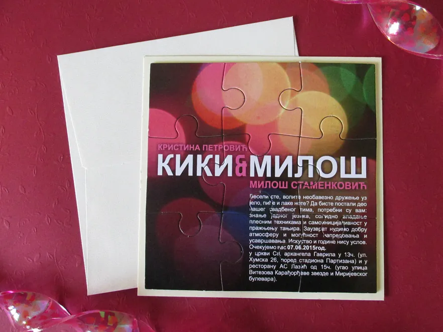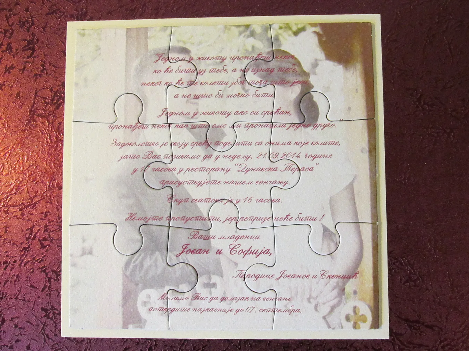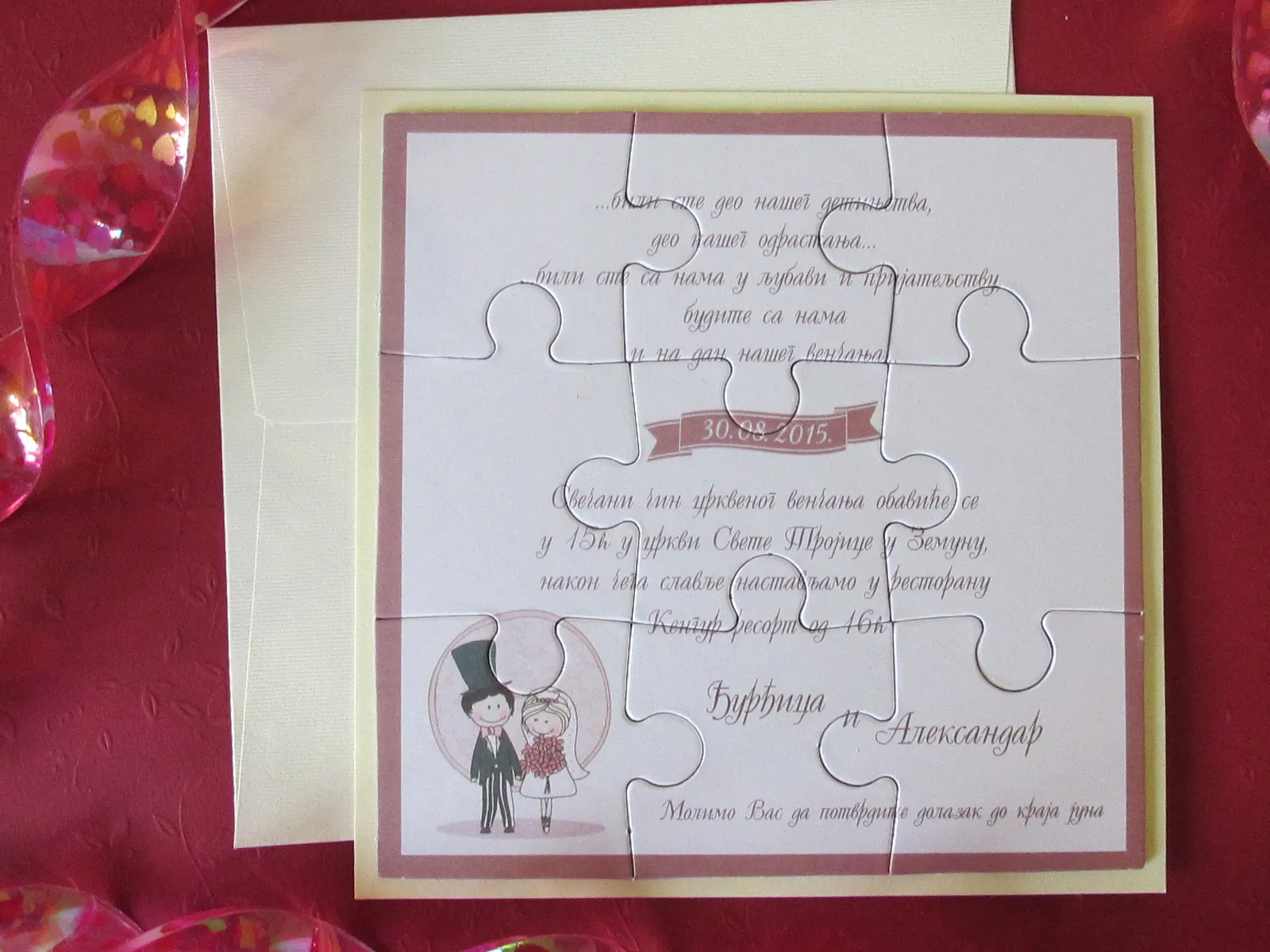 Neobične-originalne pozivnice: puzzle pozivnice sa kovertom ili u kutiji, pozivnice kao avio karta, pozivnica kao pasoš za ljubitelje putovanja, pozivnice u obliku muzičkog CD-a ili muzičke ploče, pozivnice u obliku lepeze, romantične pozivnice sa fotografijama mladenaca, pozivnice za venčanje i krštenje dece, kada par već ima jedno dete ili decu.