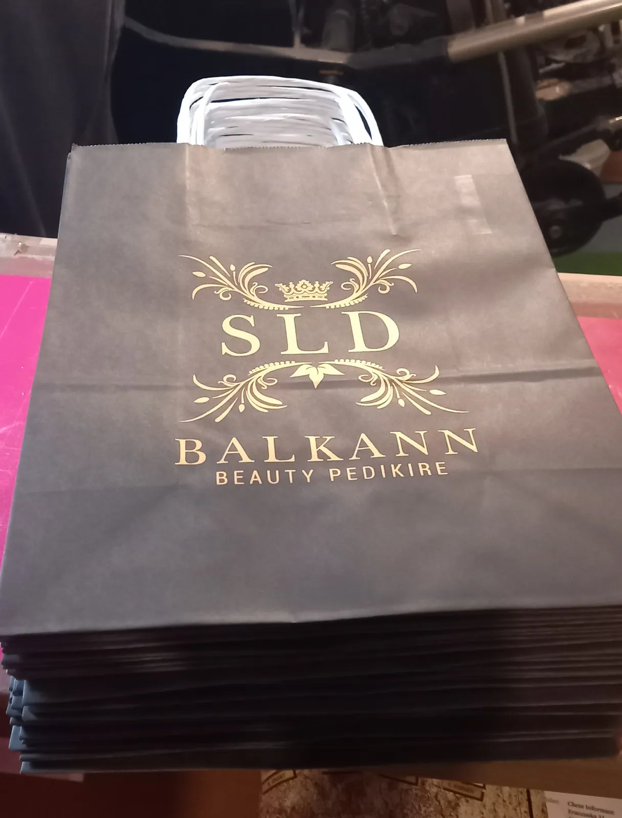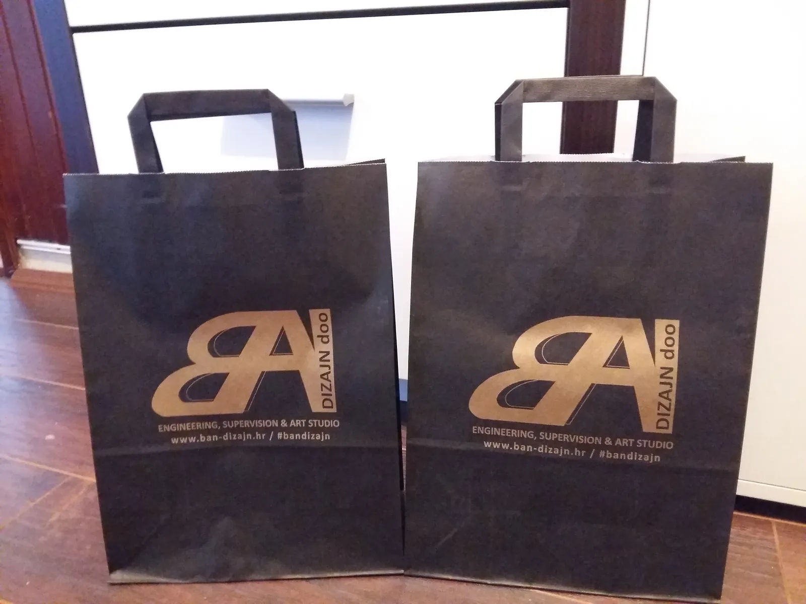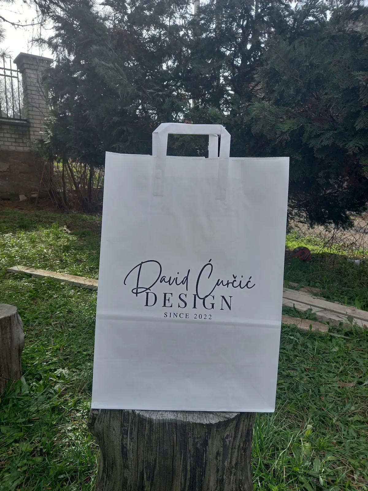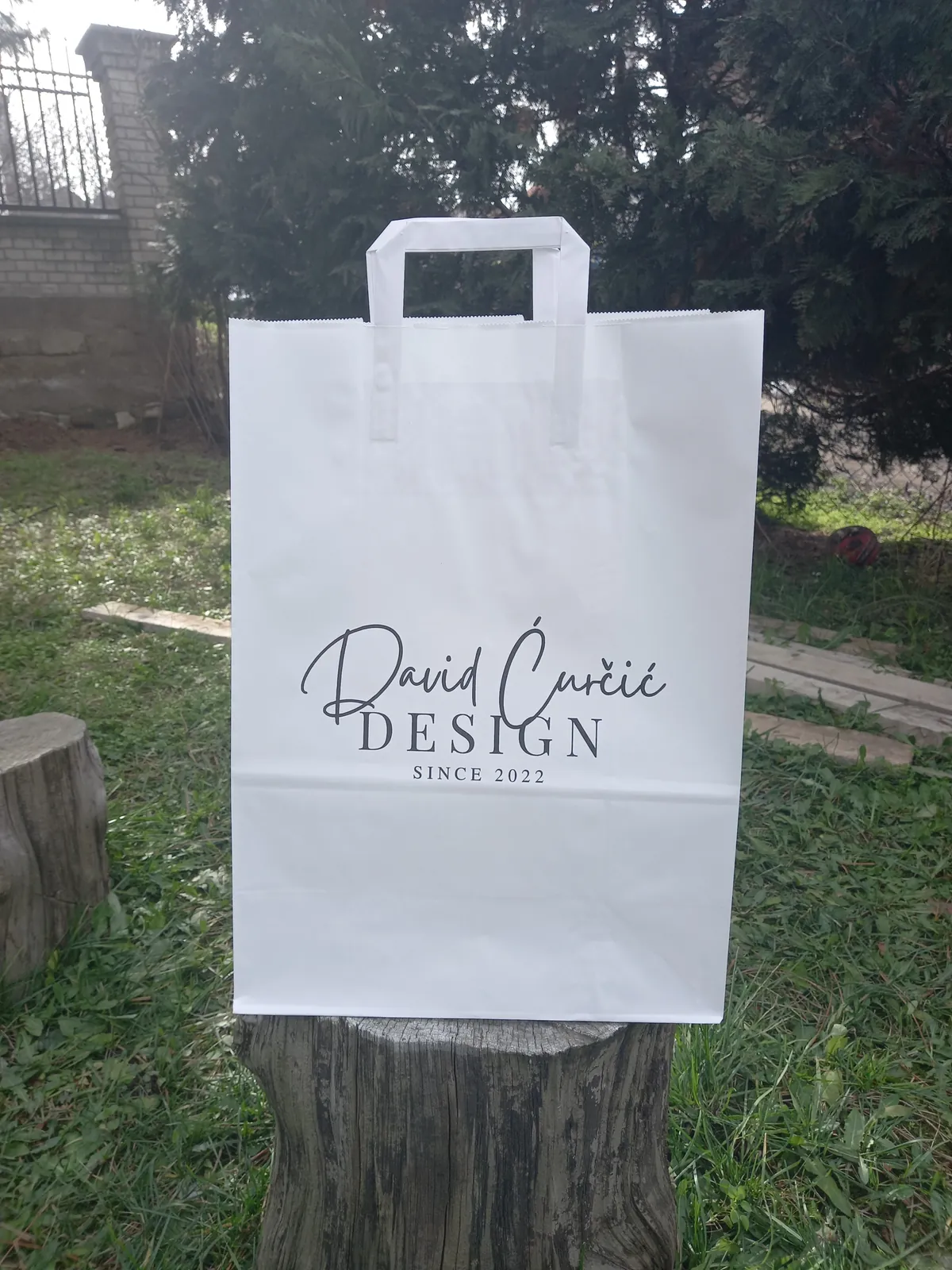 Kada počinjete biznis, ili želite neku manju količinu kesa sa vašim brendom, preporučujemo povoljniju varijantu. Ovo su papirne kese, već urađene, koje mogu da se poruče u količini koja vam je potrebna. Možemo da uštampamo vaš logo u boji po vašoj želji. Na primer crne kese sa zlatnom štampom izgledaju baš lepo, a veoma su povoljne. Takođe za dizajnera koji isporučuje elegantne haljine, štampamo logo u crnoj boji na velikoj beloj kesi.