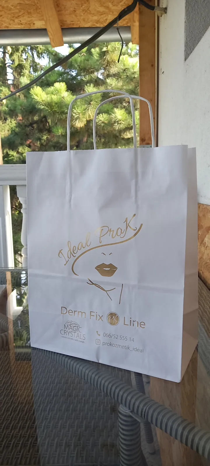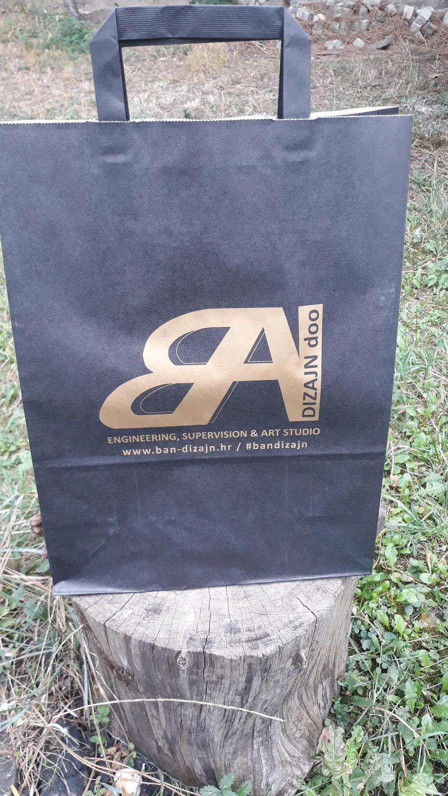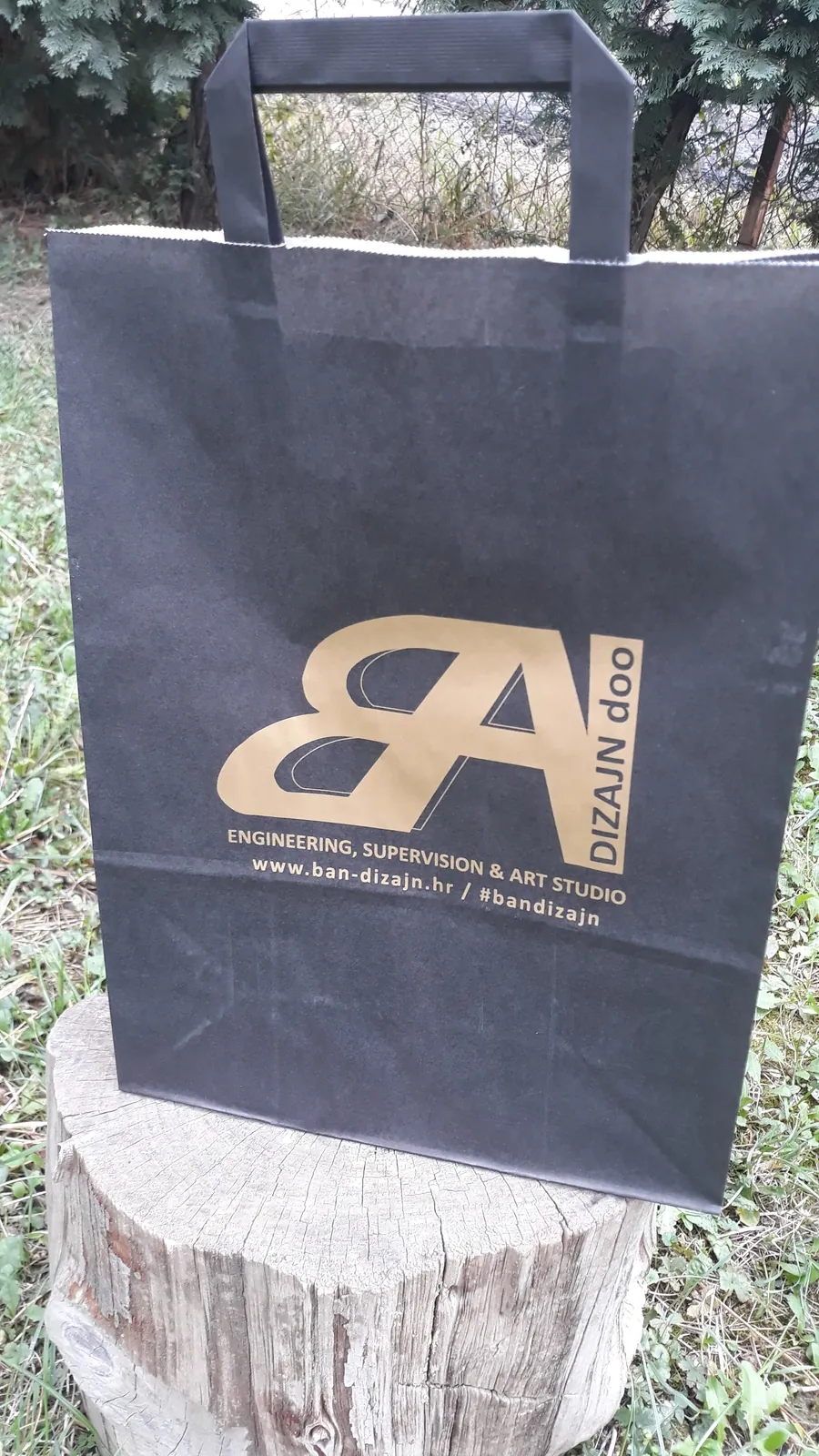 Kada počinjete biznis, ili želite neku manju količinu kesa sa vašim brendom, preporučujemo povoljniju varijantu. Ovo su papirne kese, već urađene, koje mogu da se poruče u količini koja vam je potrebna. Možemo da uštampamo vaš logo u boji po vašoj želji. Na primer crne kese sa zlatnom štampom izgledaju baš lepo, a veoma su povoljne. Takođe za dizajnera koji isporučuje elegantne haljine, štampamo logo u crnoj boji na velikoj beloj kesi.