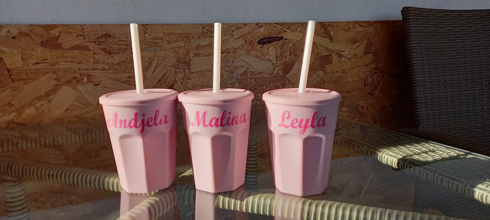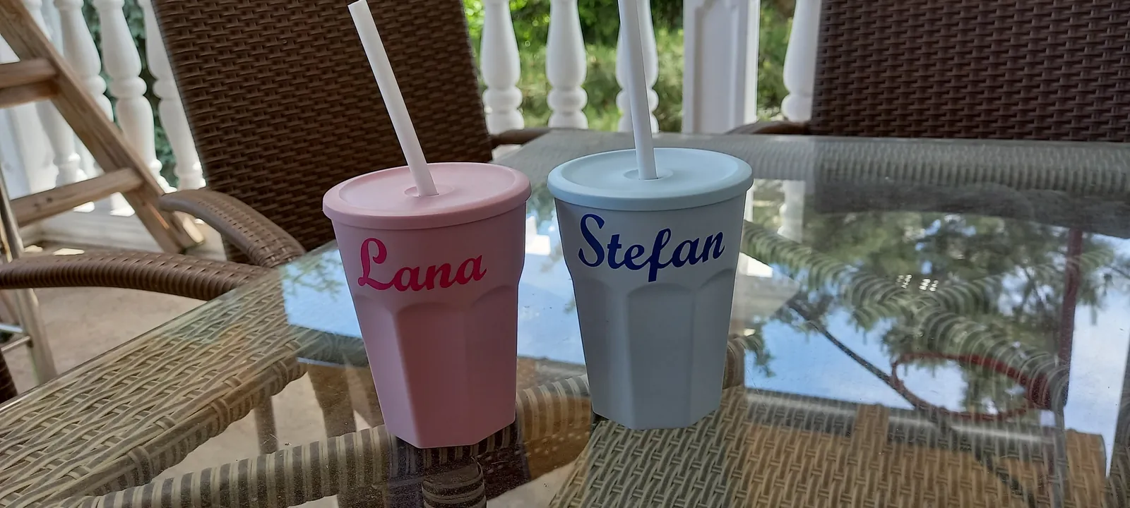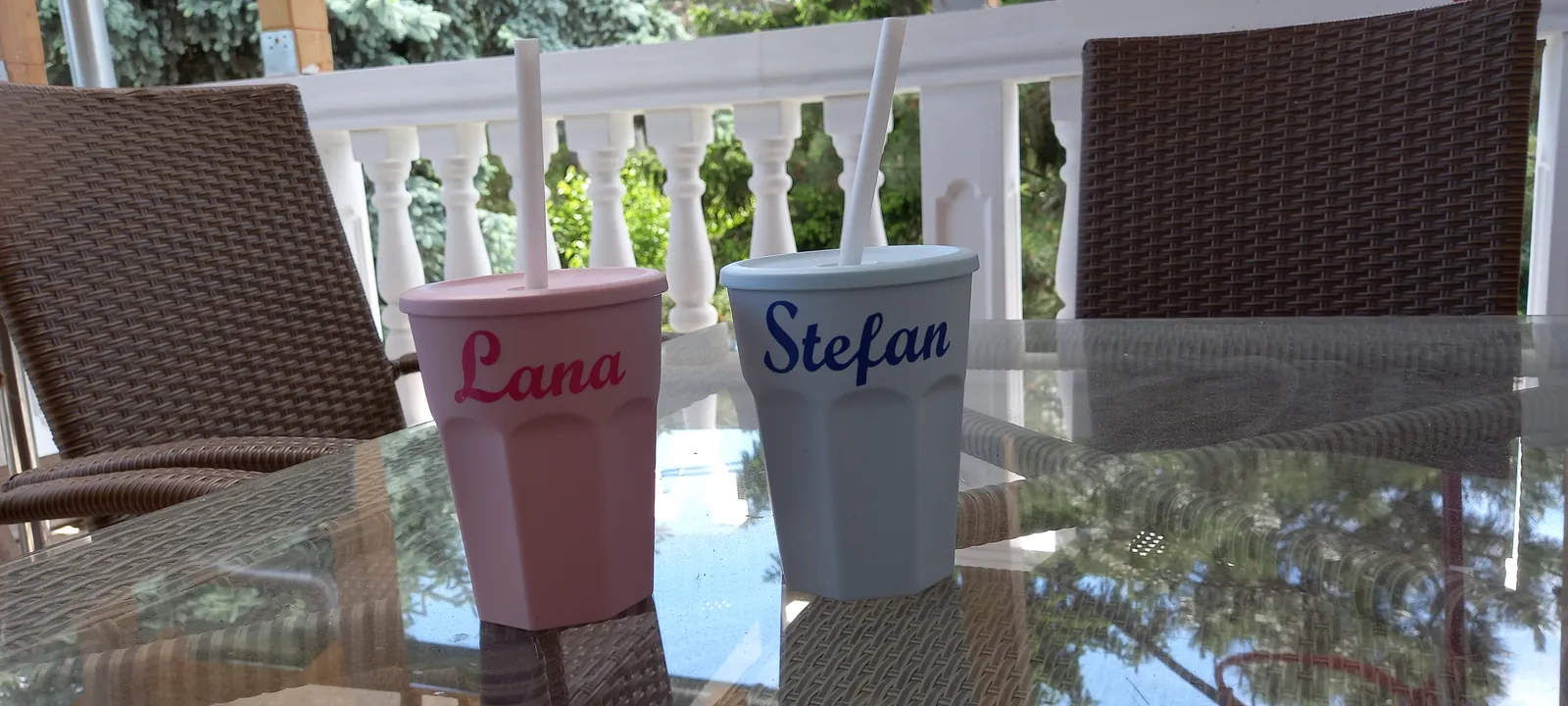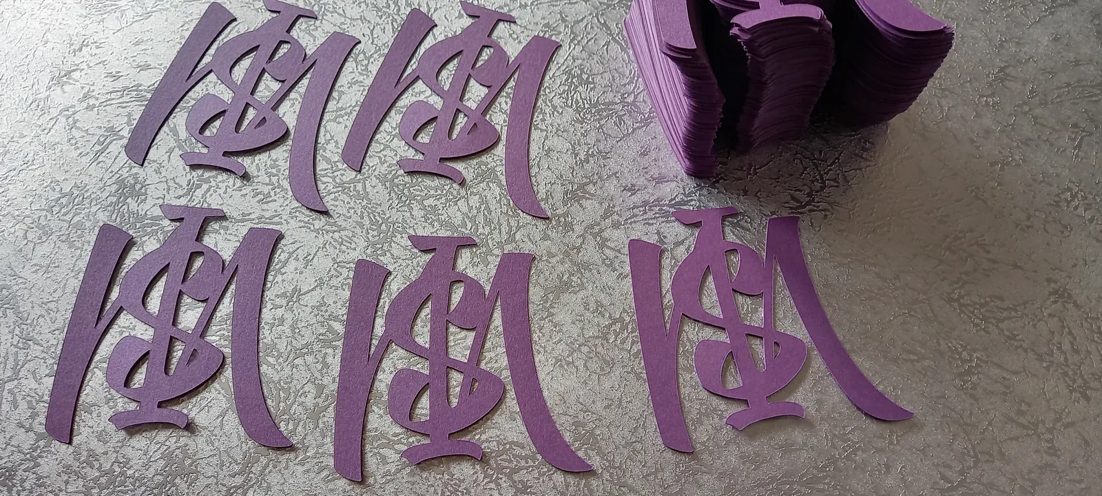 Radimo isecanje slova za imena dece na ukrasnim roze i plavim čašama, zatim sečenje inicijala mladenaca radi dekoracije u restoranu.