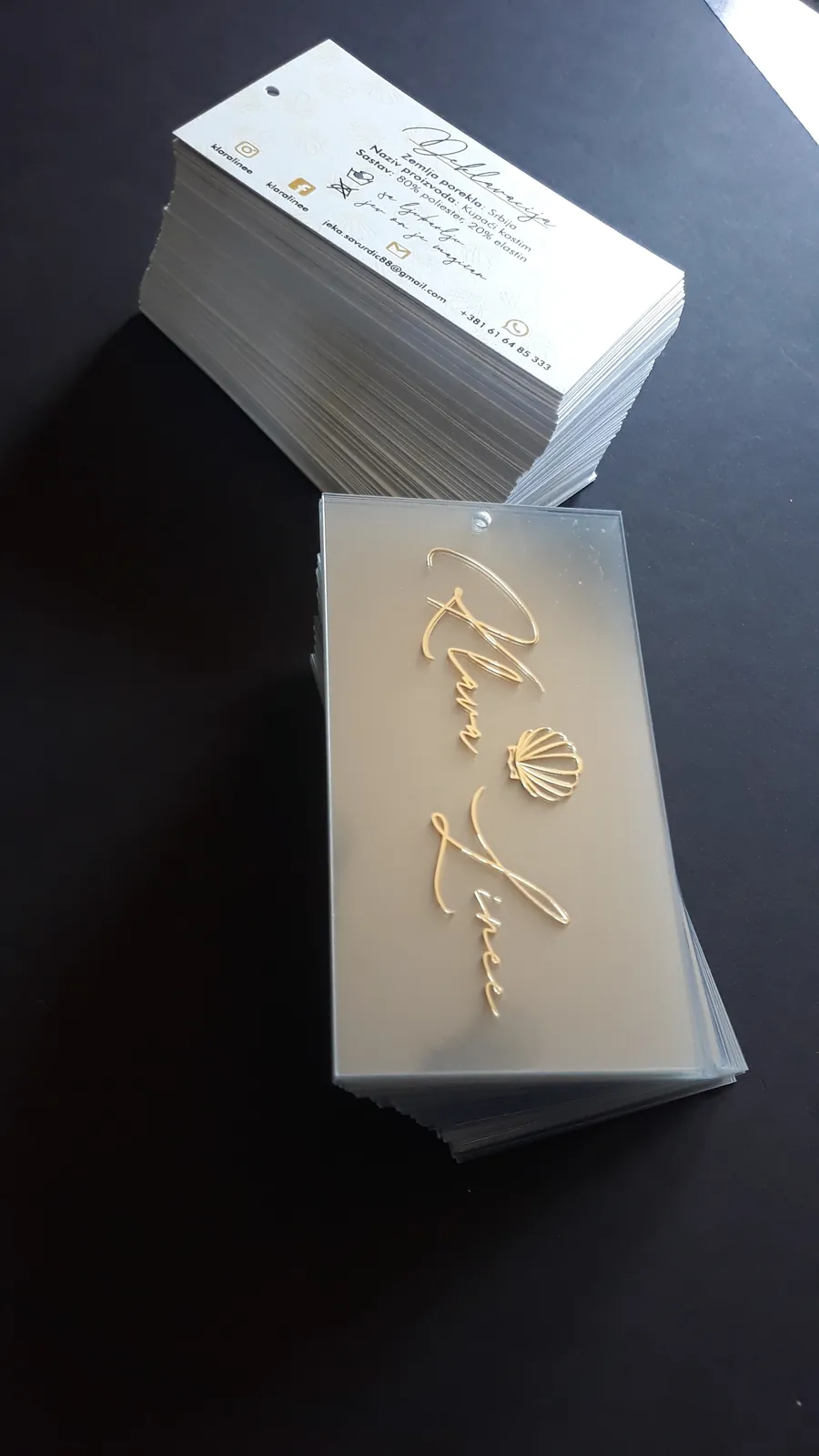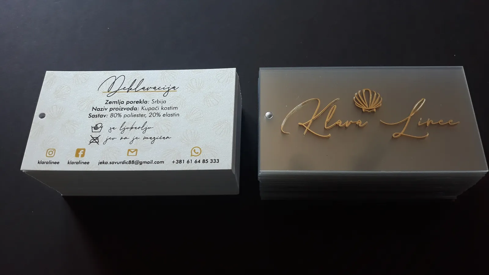 Štampa etiketa: male, velike, kružne, jednostavne, komplikovane...Izrađujemo etikete po želji klijenata za odeću, nakit, razne linije proizvoda. Najlepše su bile etikete urađene u zlatotisku na providnoj tanjoj plastici sa štampanom deklaracijom na sedefastom italijanskom papiru, naravno sa rupicom (foto 7-15), zatim etikete za modnu liniju svečanih haljina u rose gold foliotisku (foto 1-3; foto 22-24).