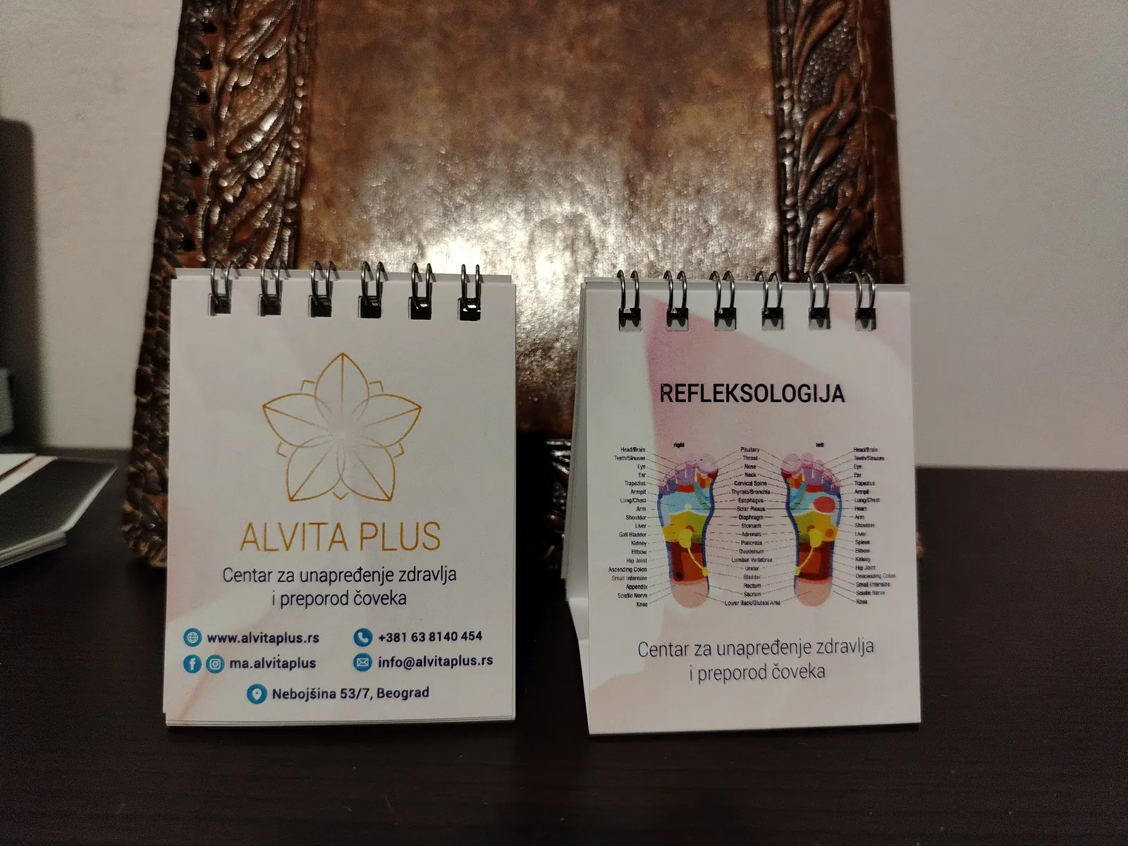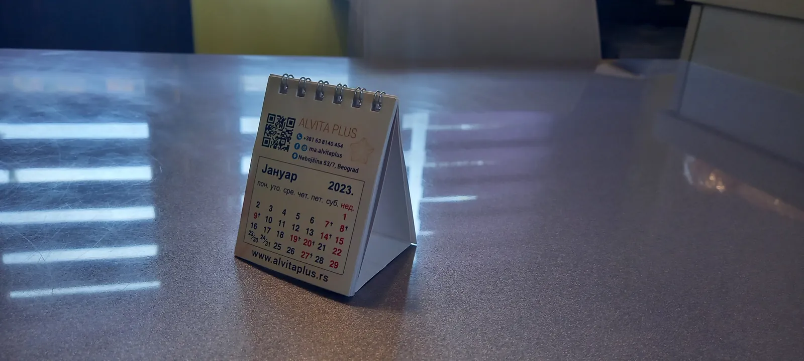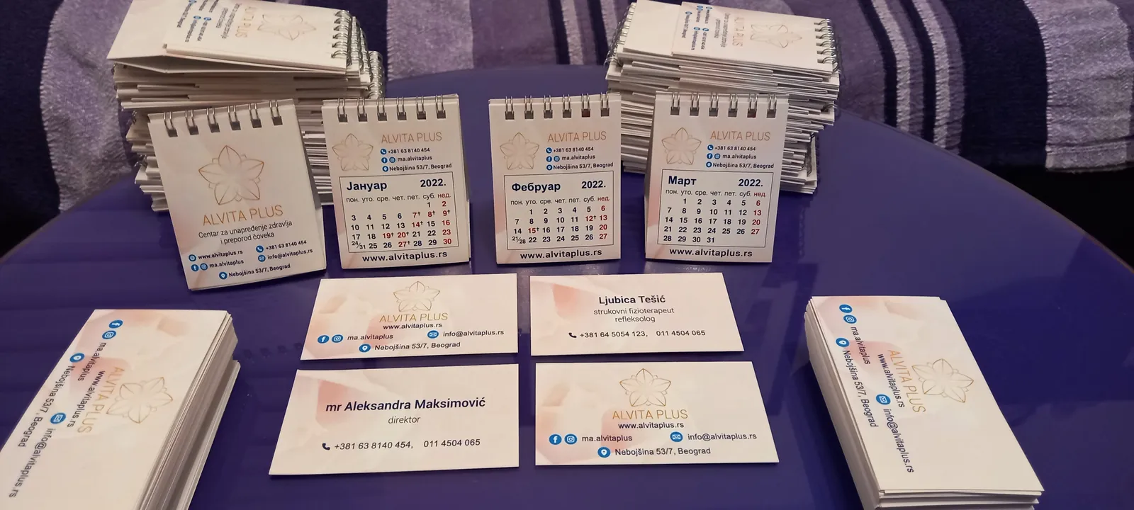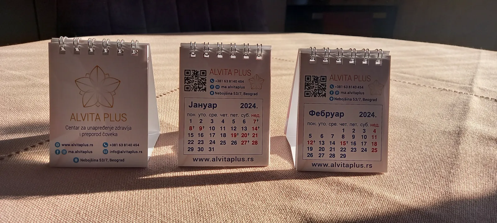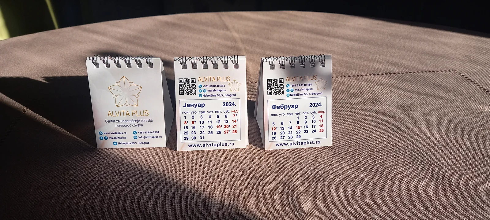 Izrađujemo kalendare po želji klijenata, od komplikovanih, čvrstih, sa fotografijama i logom firme, do jednostavnih štampanih kalendara kao šator, koji sami stoje na stolu, kao i malenih kalendara sa spiralom za 12 meseci za našu dragu doktorku. Postoji mogućnost naručivanja velikih zidnih kalendara Priroda, Znameniti Srbi, Manastiri, pa da se u dnu uštampa logo firme.