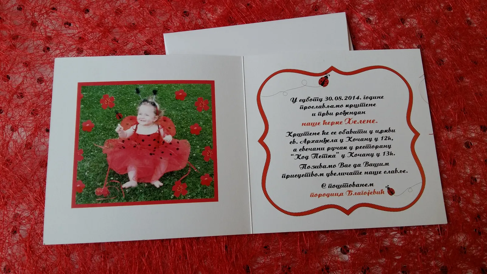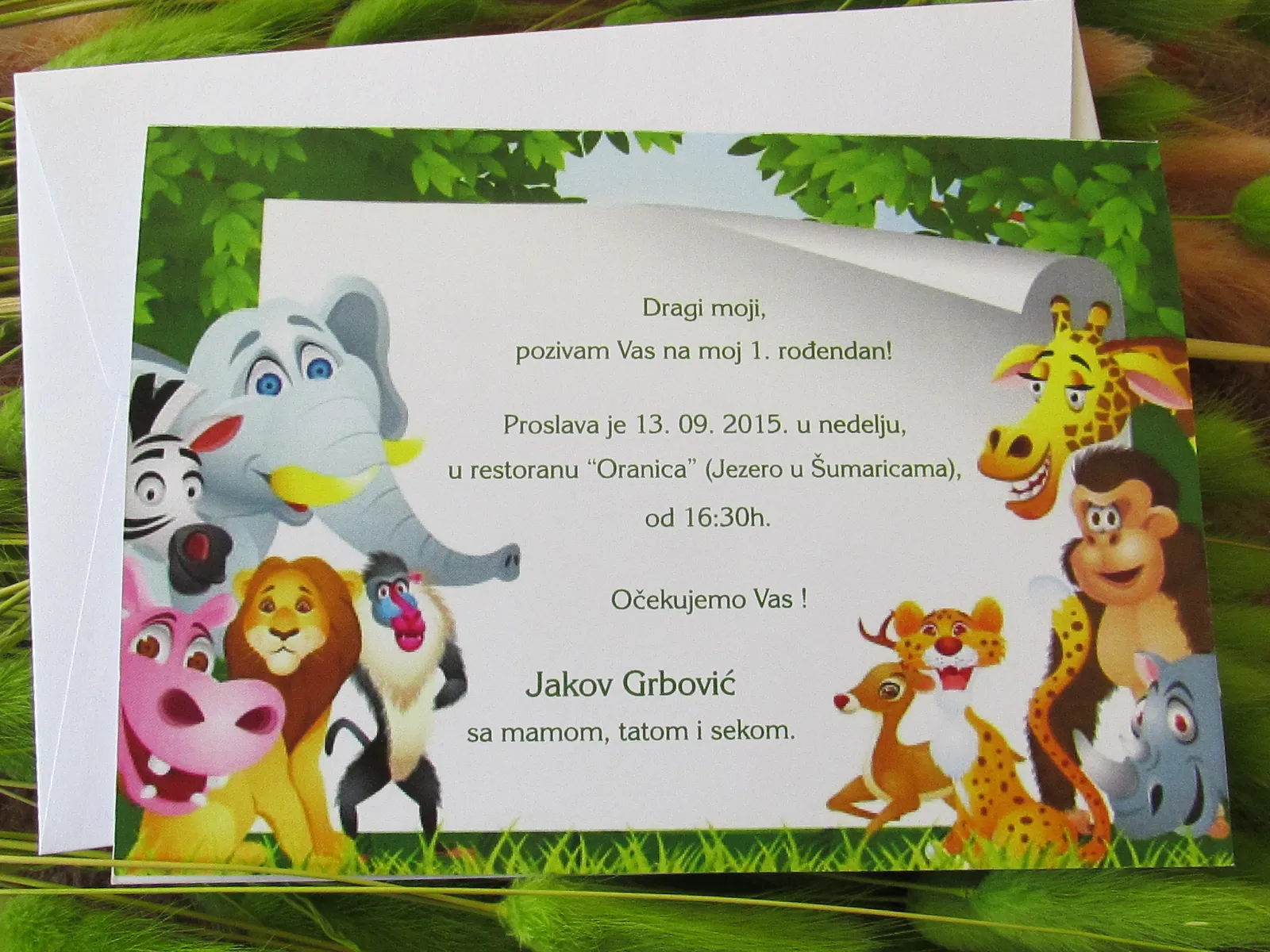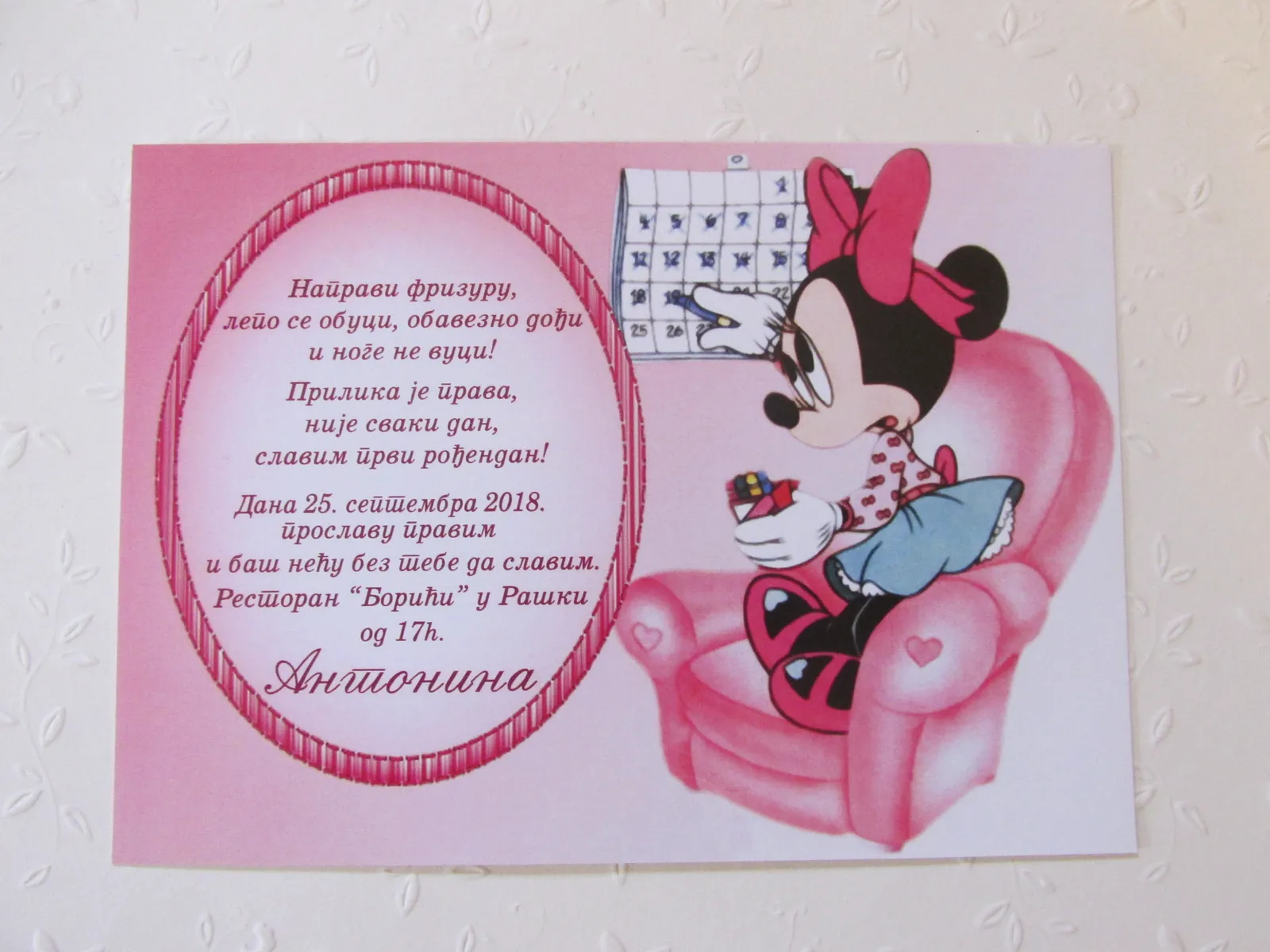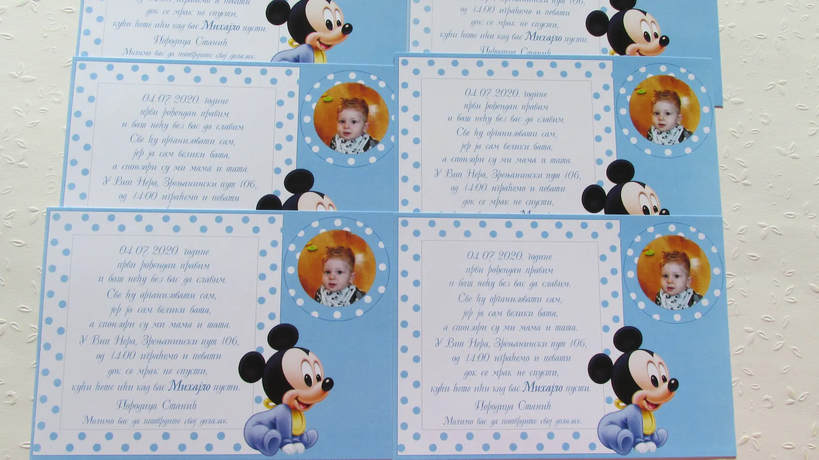 Povoljne pozivnice za proslavu prvog rođendana ili krštenja devojčica i dečaka sa motivima Diznijevih junaka, Minnie Mouse, Mickey Mouse, Winnie Pooh, Stič, Pepa Prase, Mala sirena, Šilja, princeza Sofija, Cars, kamiončići, Patrolne šape, Spiderman, životinjice iz prašume, bubamare...sve što vaše dete voli, može biti na pozivnici. Sve ove pozivnice mogu biti u štampanoj formi ili u ELEKTRONSKOJ FORMI sa vašim tekstom za pozivanje gostiju preko Vibera ili WhatsApp-a. Sve pozivnice mogu biti urađene na jednoj strani ili da se otvaraju, takođe na svakoj se može dodati fotografija vašeg deteta. Možete naručiti pozivnice sa kovertom u beloj ili nekoj boji po želji, ili bez koverte.