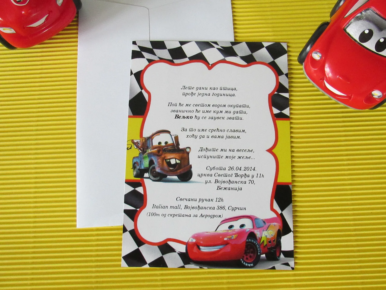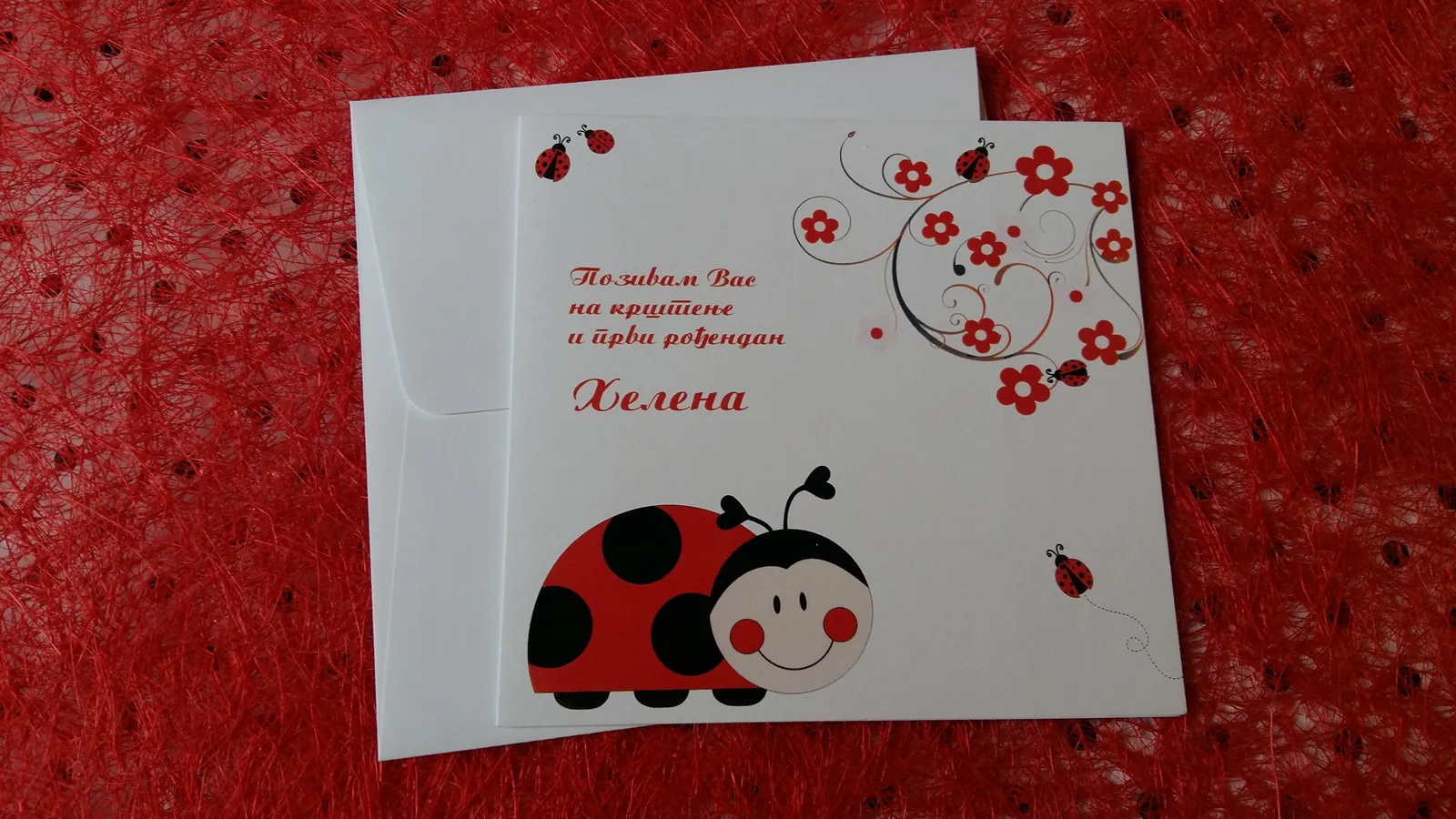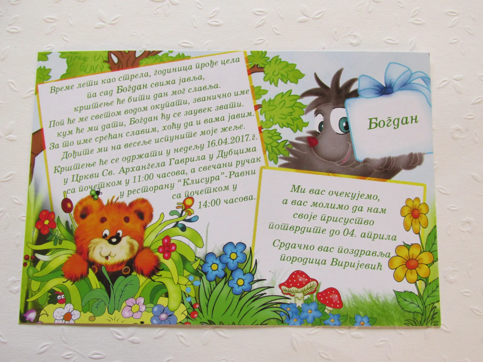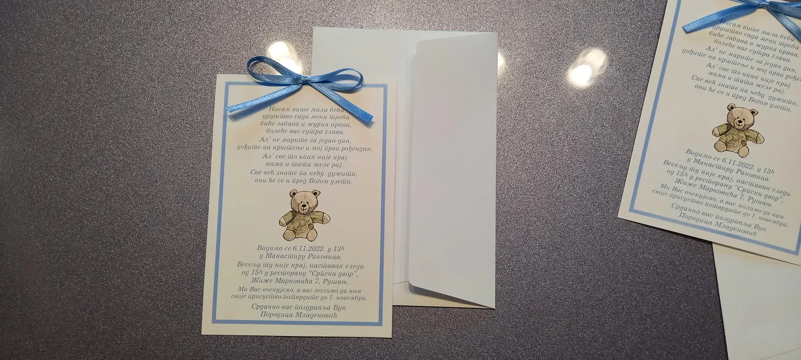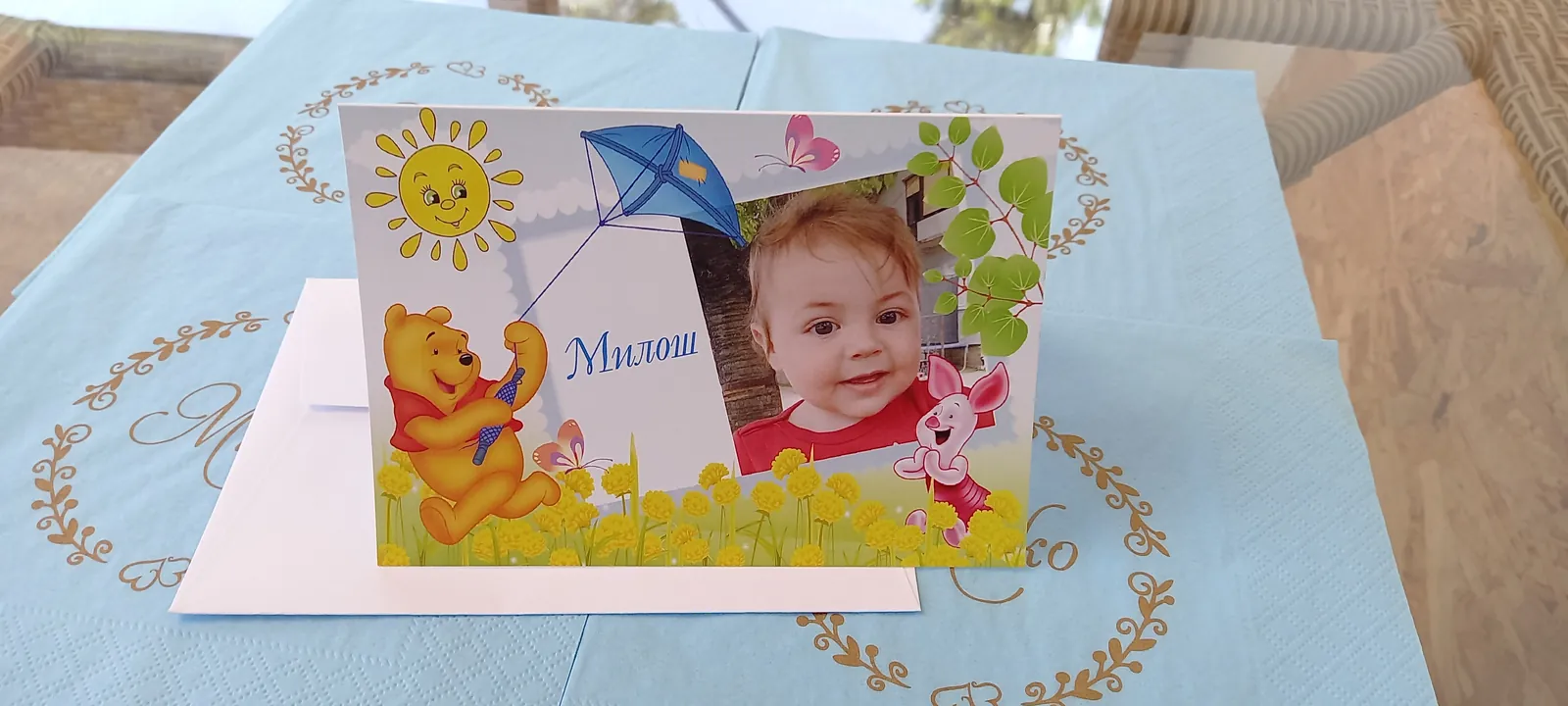 Povoljne pozivnice za proslavu prvog rođendana ili krštenja devojčica i dečaka sa motivima Diznijevih junaka, Minnie Mouse, Mickey Mouse, Winnie Pooh, Stič, Pepa Prase, Mala sirena, Šilja, princeza Sofija, Cars, kamiončići, Patrolne šape, Spiderman, životinjice iz prašume, bubamare...sve što vaše dete voli, može biti na pozivnici. Sve ove pozivnice mogu biti u štampanoj formi ili u ELEKTRONSKOJ FORMI sa vašim tekstom za pozivanje gostiju preko Vibera ili WhatsApp-a. Sve pozivnice mogu biti urađene na jednoj strani ili da se otvaraju, takođe na svakoj se može dodati fotografija vašeg deteta. Možete naručiti pozivnice sa kovertom u beloj ili nekoj boji po želji, ili bez koverte.