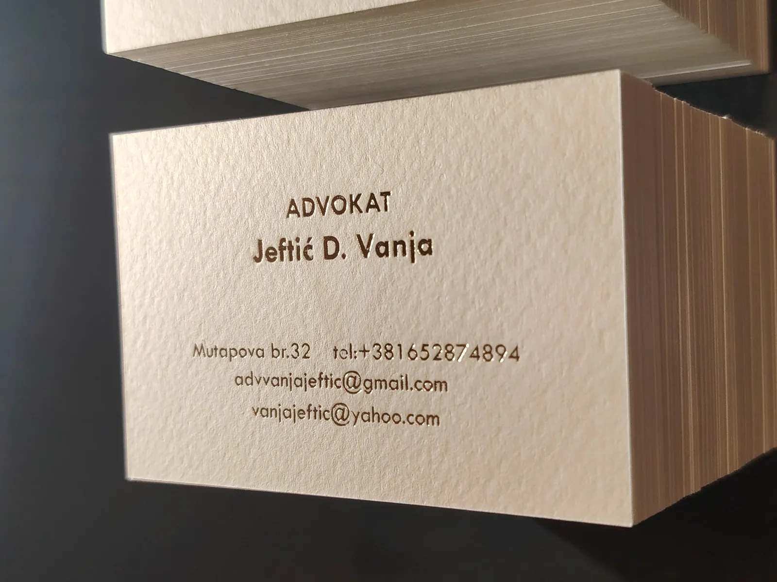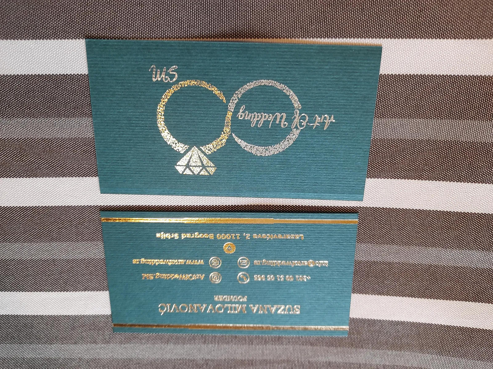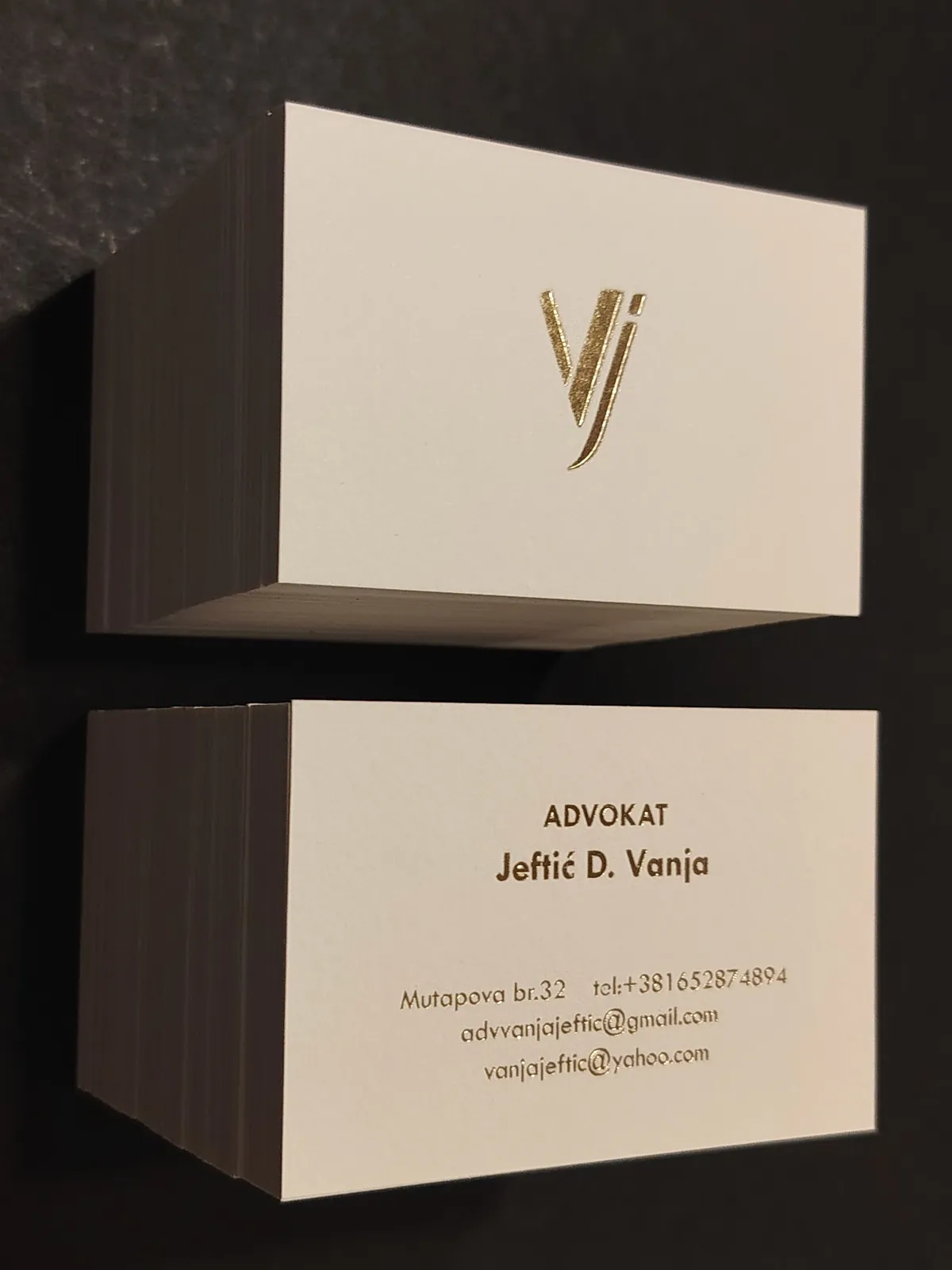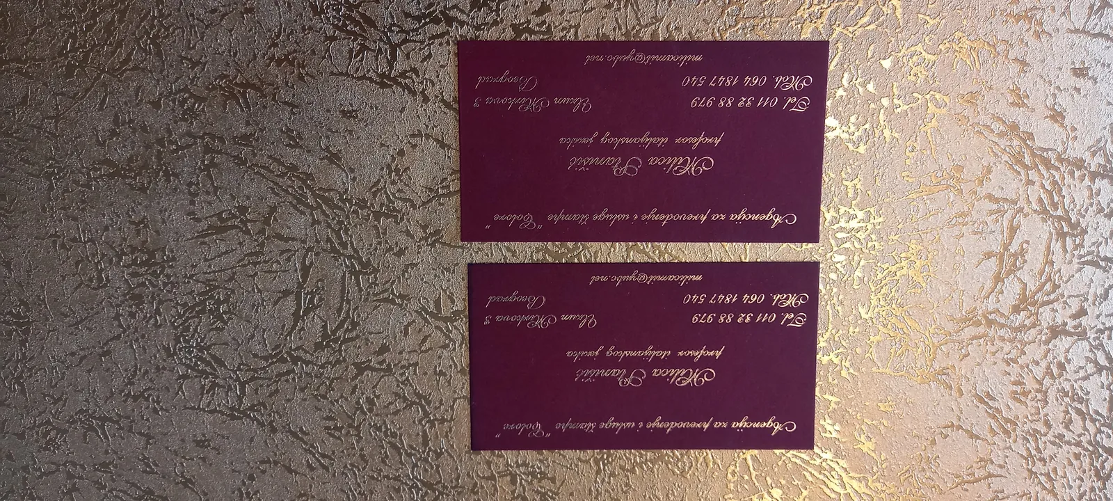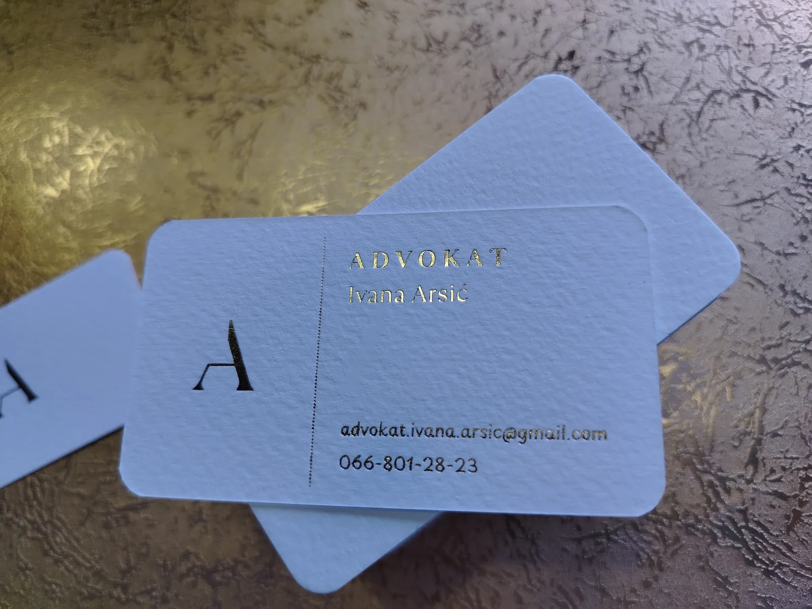 Za vizit karte sa zlatotiskom postali smo pravi stručnjaci, jer godinama najviše radimo baš ovakve vizit karte. Za ove otmene i luksuzne vizit karte u zlatotisku, obavezno se koriste italijanski papiri, boje po želji: bela, bež, crna u zadnje vreme najpopularnija, zelena, ljubičasta, bordo, teget...Grafičku pripremu vam možemo uraditi mi. Ukoliko želite vizit karte u zlatotisku, neophodna je priprema u vektorskom formatu, jer se po njoj prave klišei, a slova se otiskuju u zlatnoj foliji pod viskom temperaturom. Slova imaju izuzetan sjaj. Što se tiče čvrstine papira, u ovoj varijanti je moguće uraditi štampu i na dosta čvršćem papiru do 450 grama jer ova vrsta štampe to dozvoljava. Kao završnu obradu, predlažemo zaobljene ivice, to je stvar izbora, nekome se sviđa, nekome ne. Ceo tekst može se štampati samo na prednjoj strani, što je povoljnije. Naravno, može biti i obostrani zlatotisak.