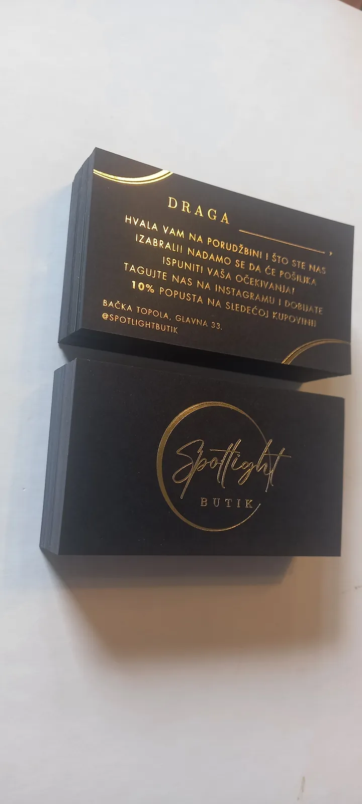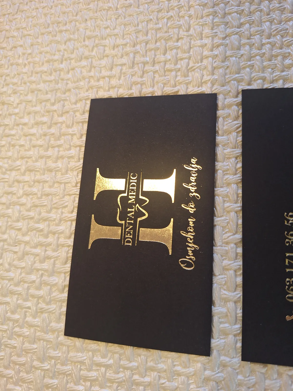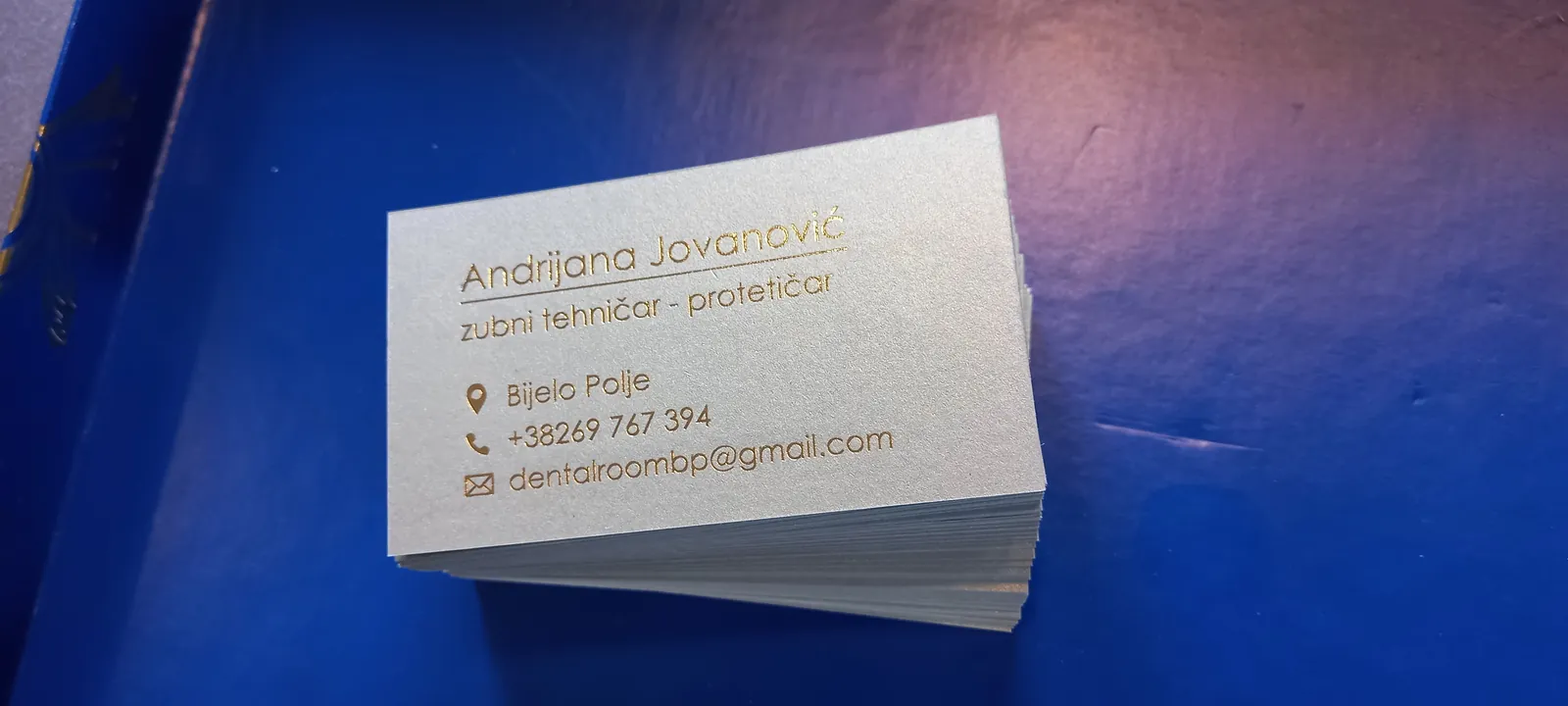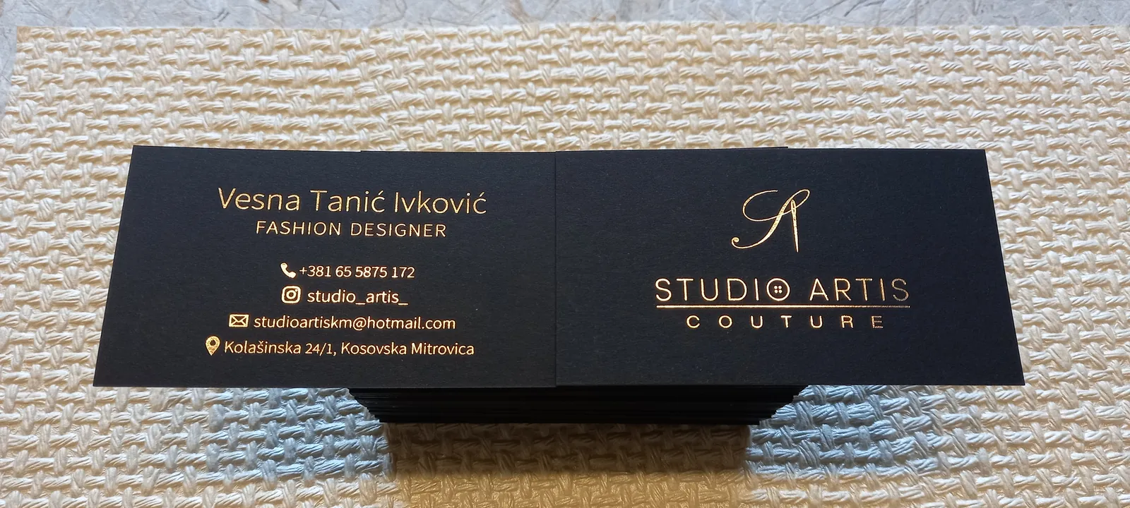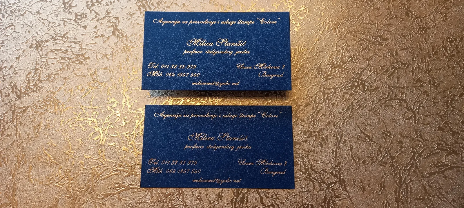 Za vizit karte sa zlatotiskom postali smo pravi stručnjaci, jer godinama najviše radimo baš ovakve vizit karte. Za ove otmene i luksuzne vizit karte u zlatotisku, obavezno se koriste italijanski papiri, boje po želji: bela, bež, crna u zadnje vreme najpopularnija, zelena, ljubičasta, bordo, teget...Grafičku pripremu vam možemo uraditi mi. Ukoliko želite vizit karte u zlatotisku, neophodna je priprema u vektorskom formatu, jer se po njoj prave klišei, a slova se otiskuju u zlatnoj foliji pod viskom temperaturom. Slova imaju izuzetan sjaj. Što se tiče čvrstine papira, u ovoj varijanti je moguće uraditi štampu i na dosta čvršćem papiru do 450 grama jer ova vrsta štampe to dozvoljava. Kao završnu obradu, predlažemo zaobljene ivice, to je stvar izbora, nekome se sviđa, nekome ne. Ceo tekst može se štampati samo na prednjoj strani, što je povoljnije. Naravno, može biti i obostrani zlatotisak.