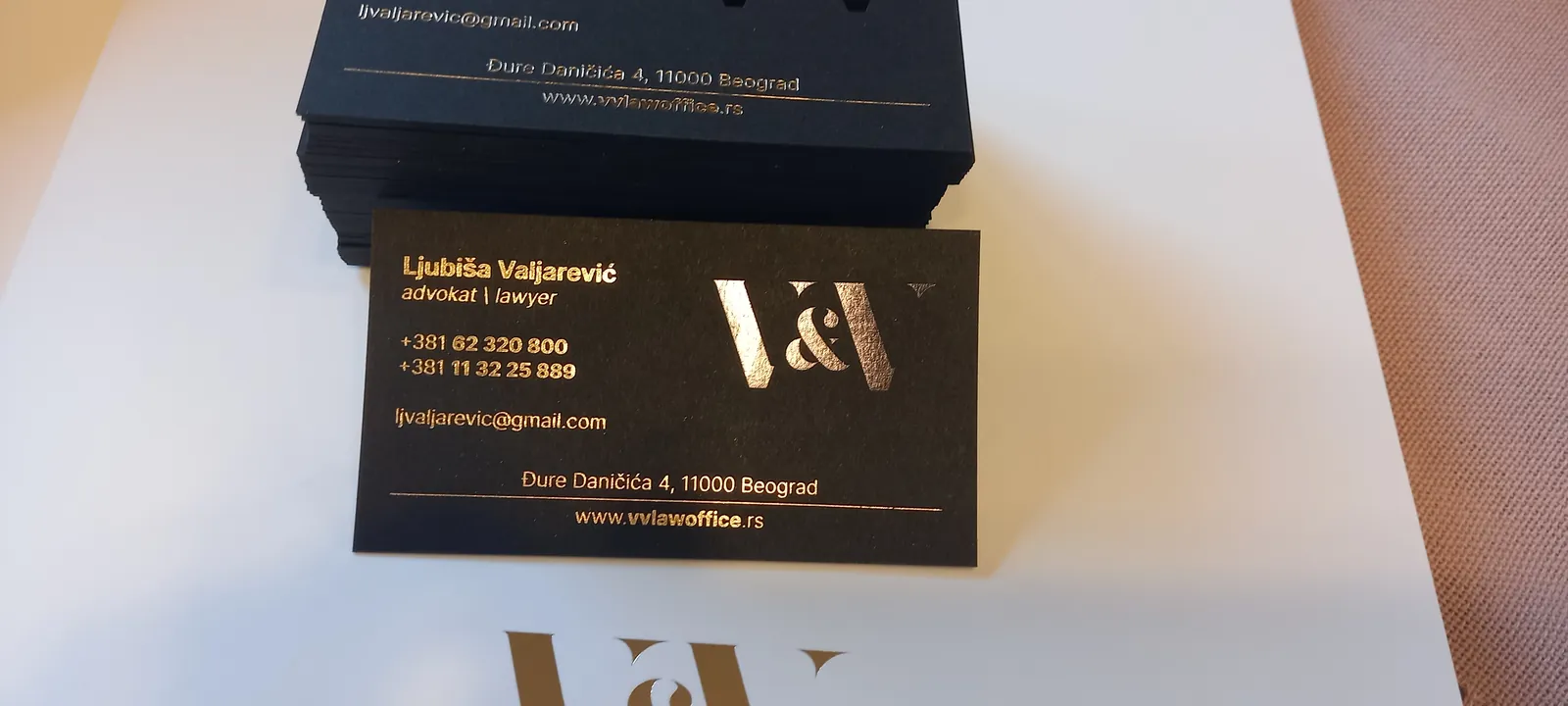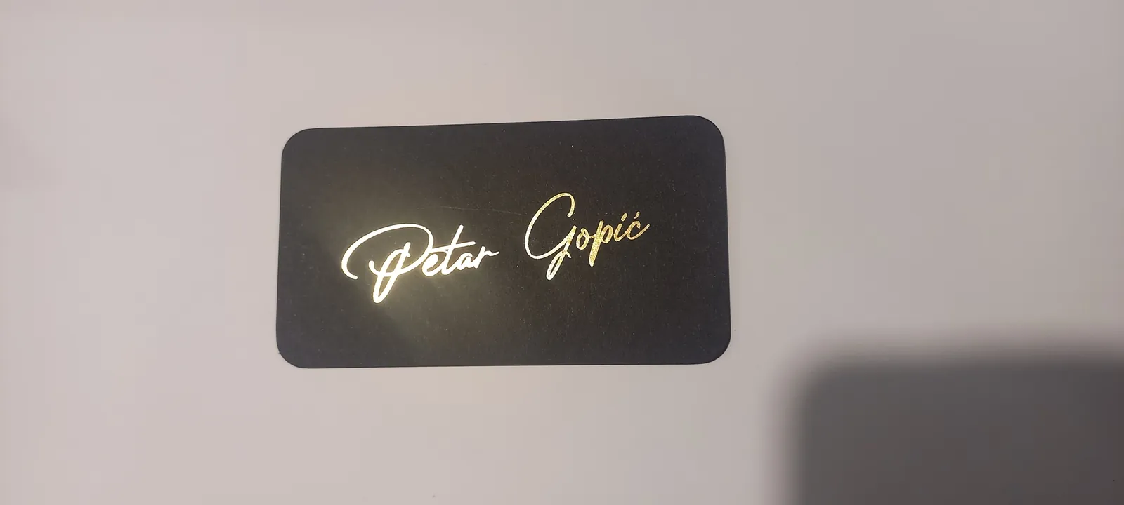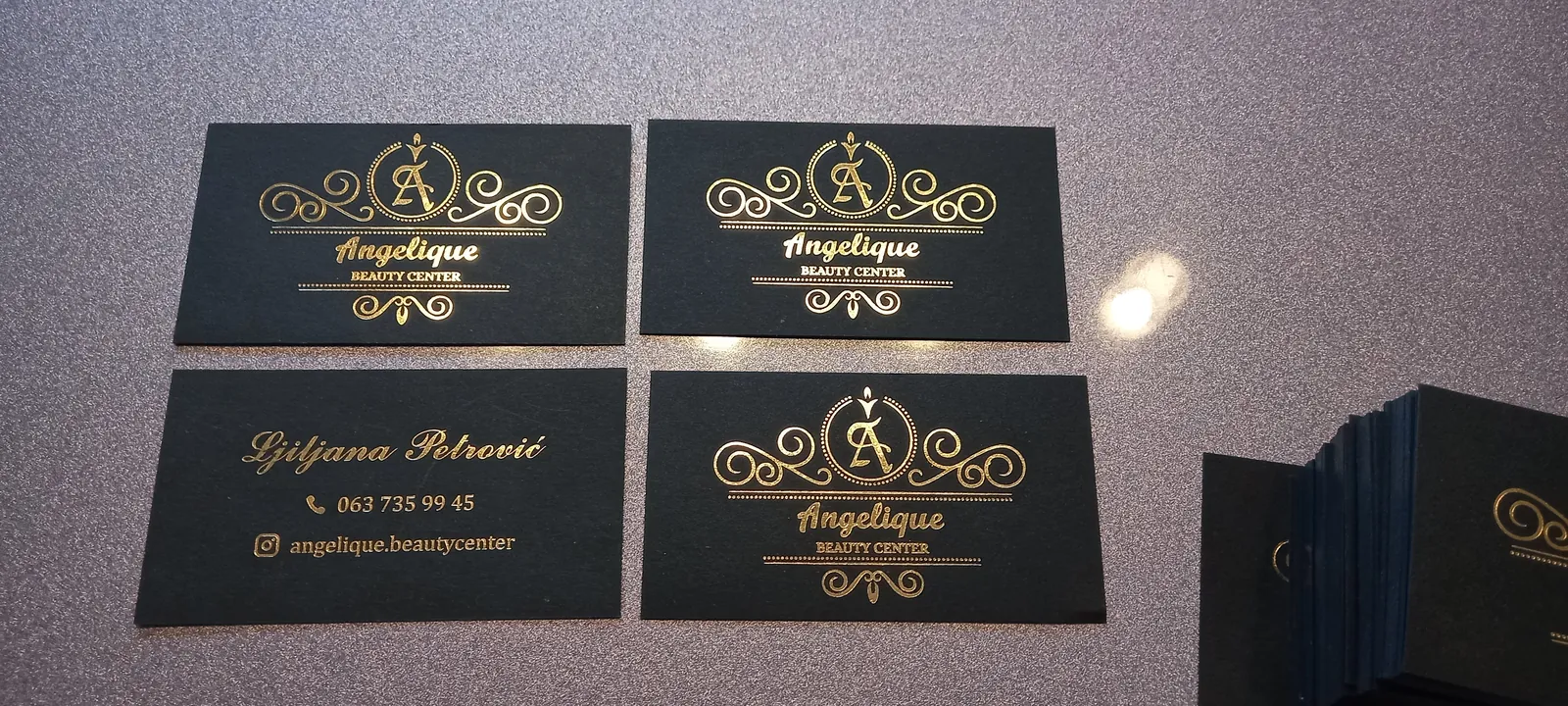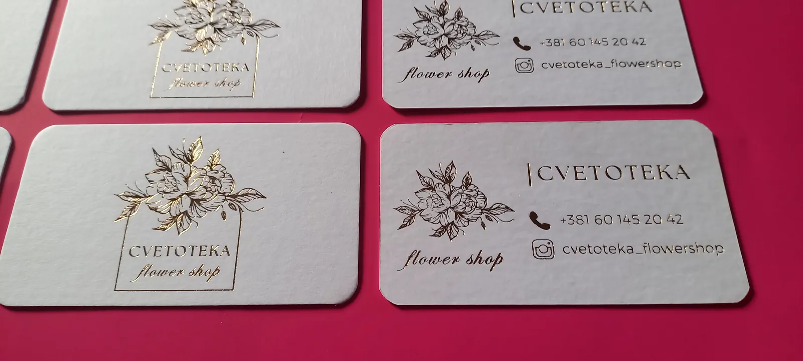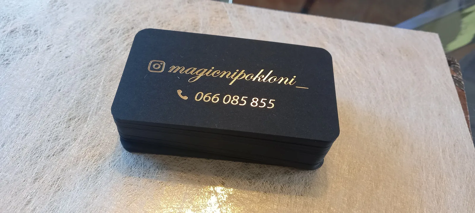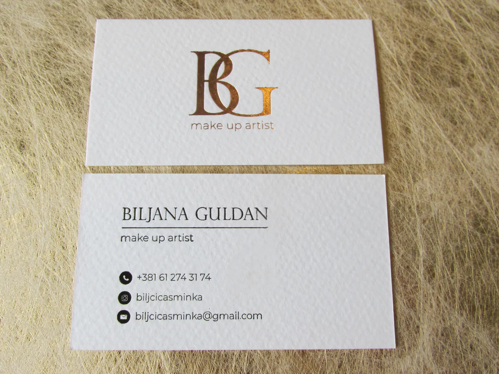 Za vizit karte sa zlatotiskom postali smo pravi stručnjaci, jer godinama najviše radimo baš ovakve vizit karte. Za ove otmene i luksuzne vizit karte u zlatotisku, obavezno se koriste italijanski papiri, boje po želji: bela, bež, crna u zadnje vreme najpopularnija, zelena, ljubičasta, bordo, teget...Grafičku pripremu vam možemo uraditi mi. Ukoliko želite vizit karte u zlatotisku, neophodna je priprema u vektorskom formatu, jer se po njoj prave klišei, a slova se otiskuju u zlatnoj foliji pod viskom temperaturom. Slova imaju izuzetan sjaj. Što se tiče čvrstine papira, u ovoj varijanti je moguće uraditi štampu i na dosta čvršćem papiru do 450 grama jer ova vrsta štampe to dozvoljava. Kao završnu obradu, predlažemo zaobljene ivice, to je stvar izbora, nekome se sviđa, nekome ne. Ceo tekst može se štampati samo na prednjoj strani, što je povoljnije. Naravno, može biti i obostrani zlatotisak.