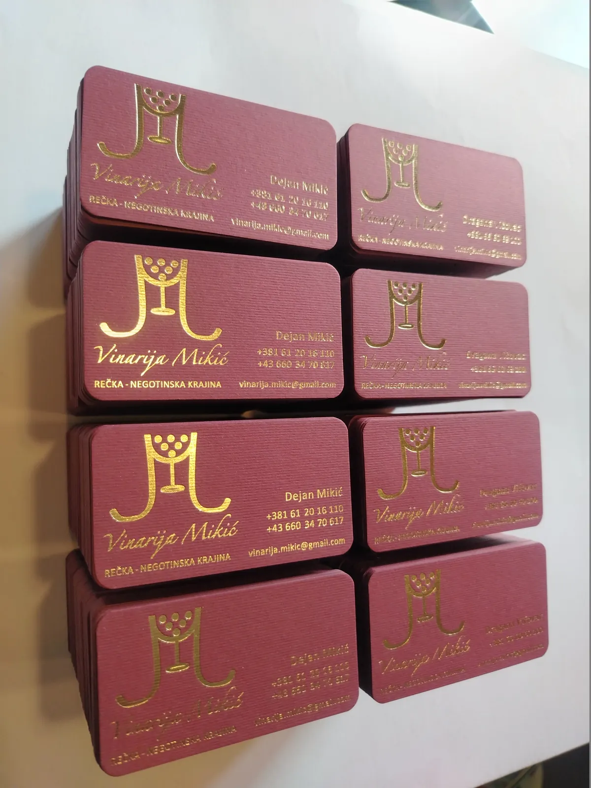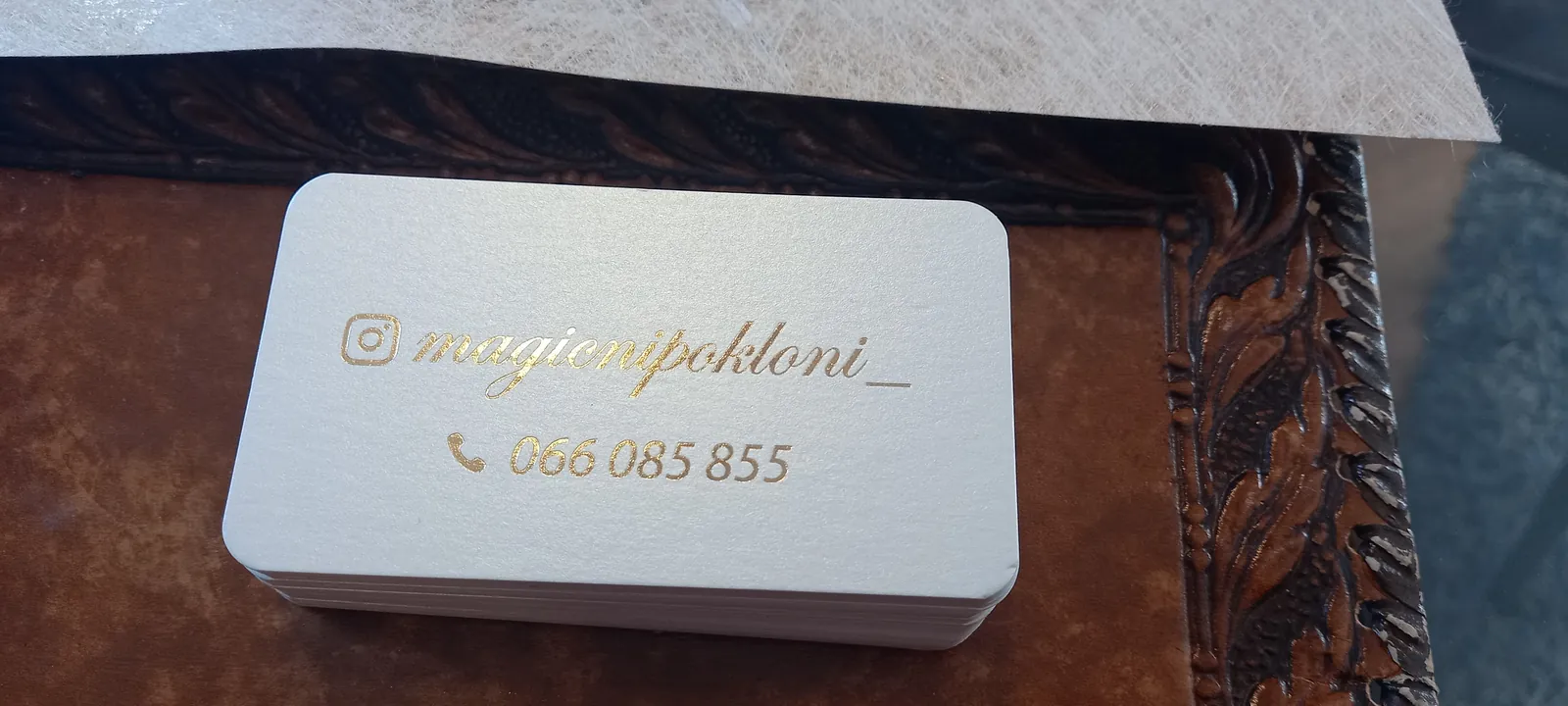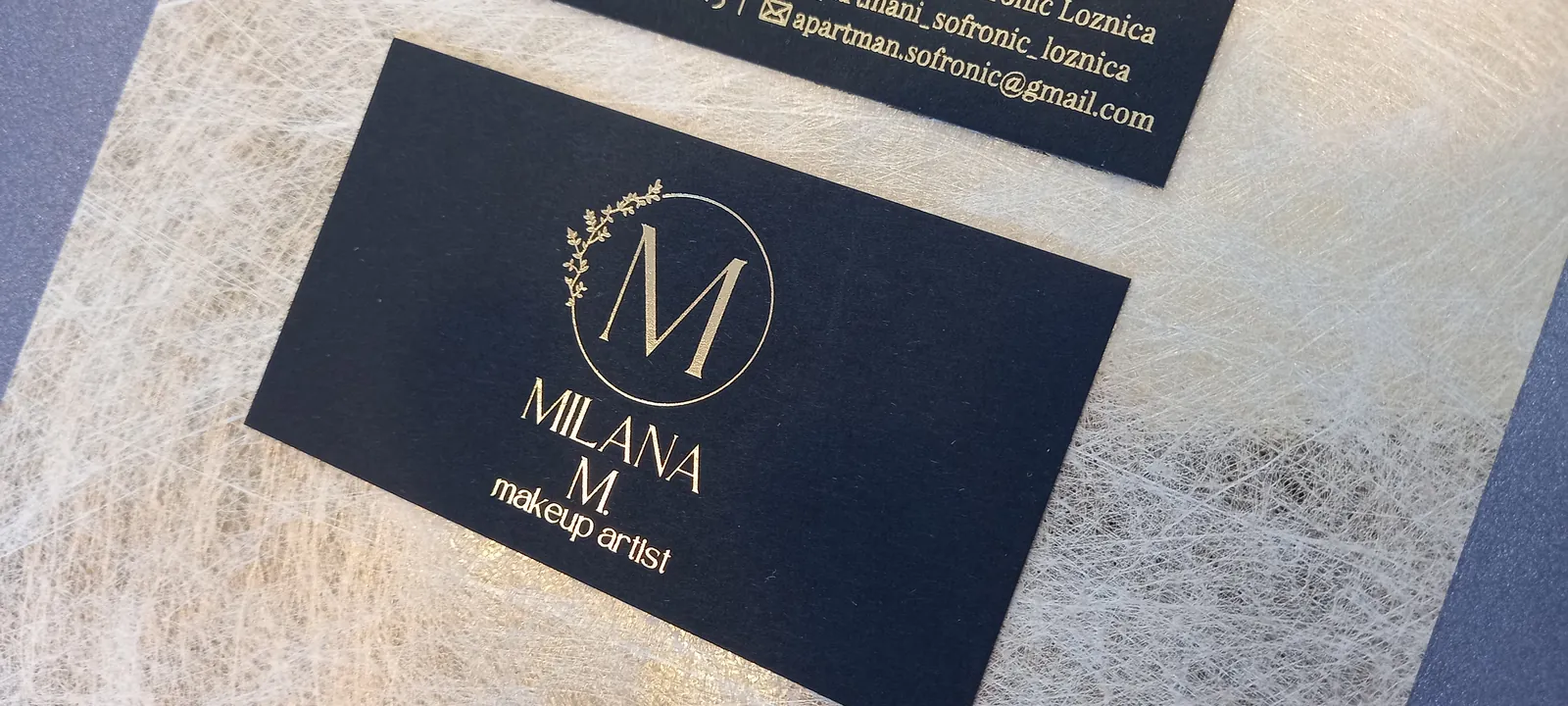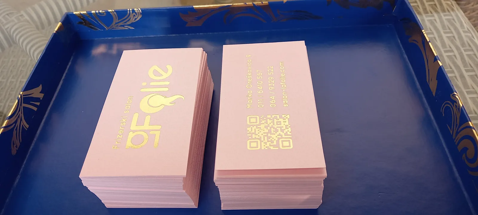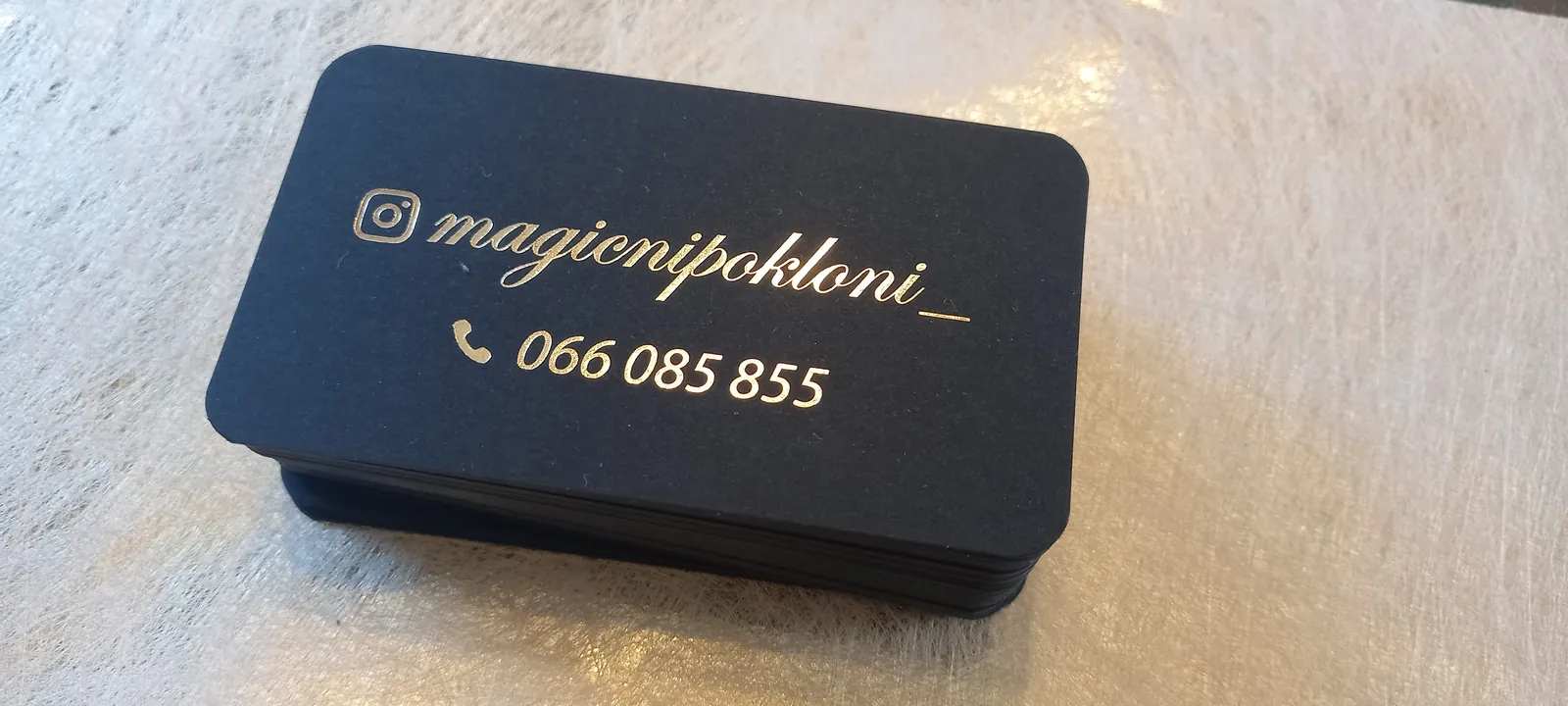 Za vizit karte sa zlatotiskom postali smo pravi stručnjaci, jer godinama najviše radimo baš ovakve vizit karte. Za ove otmene i luksuzne vizit karte u zlatotisku, obavezno se koriste italijanski papiri, boje po želji: bela, bež, crna u zadnje vreme najpopularnija, zelena, ljubičasta, bordo, teget...Grafičku pripremu vam možemo uraditi mi. Ukoliko želite vizit karte u zlatotisku, neophodna je priprema u vektorskom formatu, jer se po njoj prave klišei, a slova se otiskuju u zlatnoj foliji pod viskom temperaturom. Slova imaju izuzetan sjaj. Što se tiče čvrstine papira, u ovoj varijanti je moguće uraditi štampu i na dosta čvršćem papiru do 450 grama jer ova vrsta štampe to dozvoljava. Kao završnu obradu, predlažemo zaobljene ivice, to je stvar izbora, nekome se sviđa, nekome ne. Ceo tekst može se štampati samo na prednjoj strani, što je povoljnije. Naravno, može biti i obostrani zlatotisak.