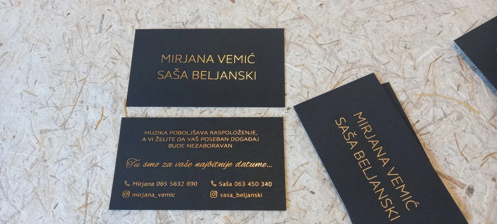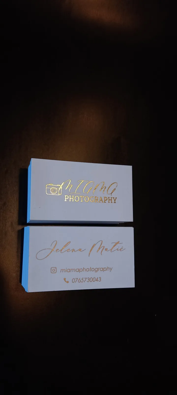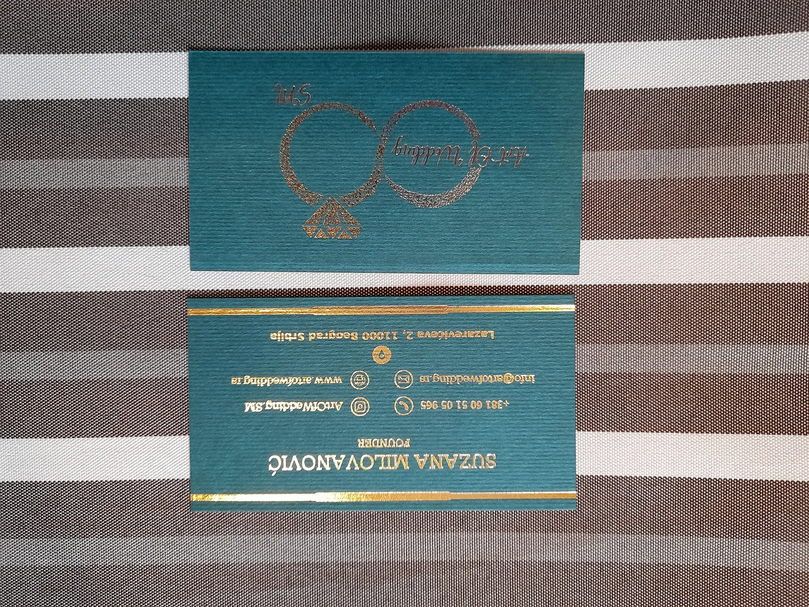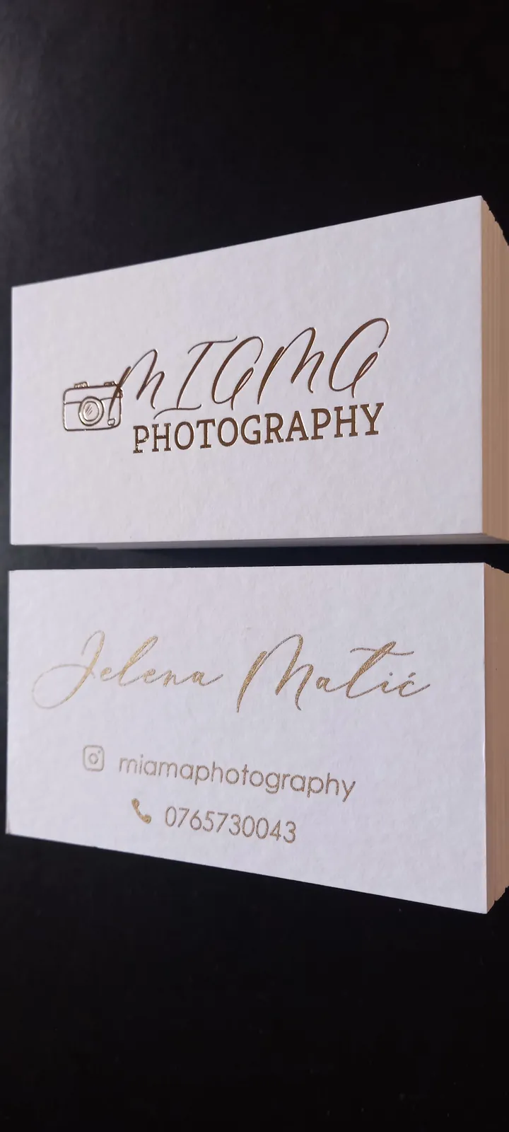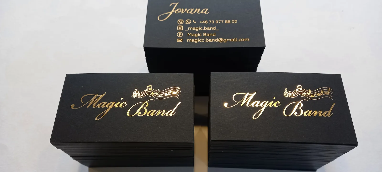 Za vizit karte sa zlatotiskom postali smo pravi stručnjaci, jer godinama najviše radimo baš ovakve vizit karte. Za ove otmene i luksuzne vizit karte u zlatotisku, obavezno se koriste italijanski papiri, boje po želji: bela, bež, crna u zadnje vreme najpopularnija, zelena, ljubičasta, bordo, teget...Grafičku pripremu vam možemo uraditi mi. Ukoliko želite vizit karte u zlatotisku, neophodna je priprema u vektorskom formatu, jer se po njoj prave klišei, a slova se otiskuju u zlatnoj foliji pod viskom temperaturom. Slova imaju izuzetan sjaj. Što se tiče čvrstine papira, u ovoj varijanti je moguće uraditi štampu i na dosta čvršćem papiru do 450 grama jer ova vrsta štampe to dozvoljava. Kao završnu obradu, predlažemo zaobljene ivice, to je stvar izbora, nekome se sviđa, nekome ne. Ceo tekst može se štampati samo na prednjoj strani, što je povoljnije. Naravno, može biti i obostrani zlatotisak.