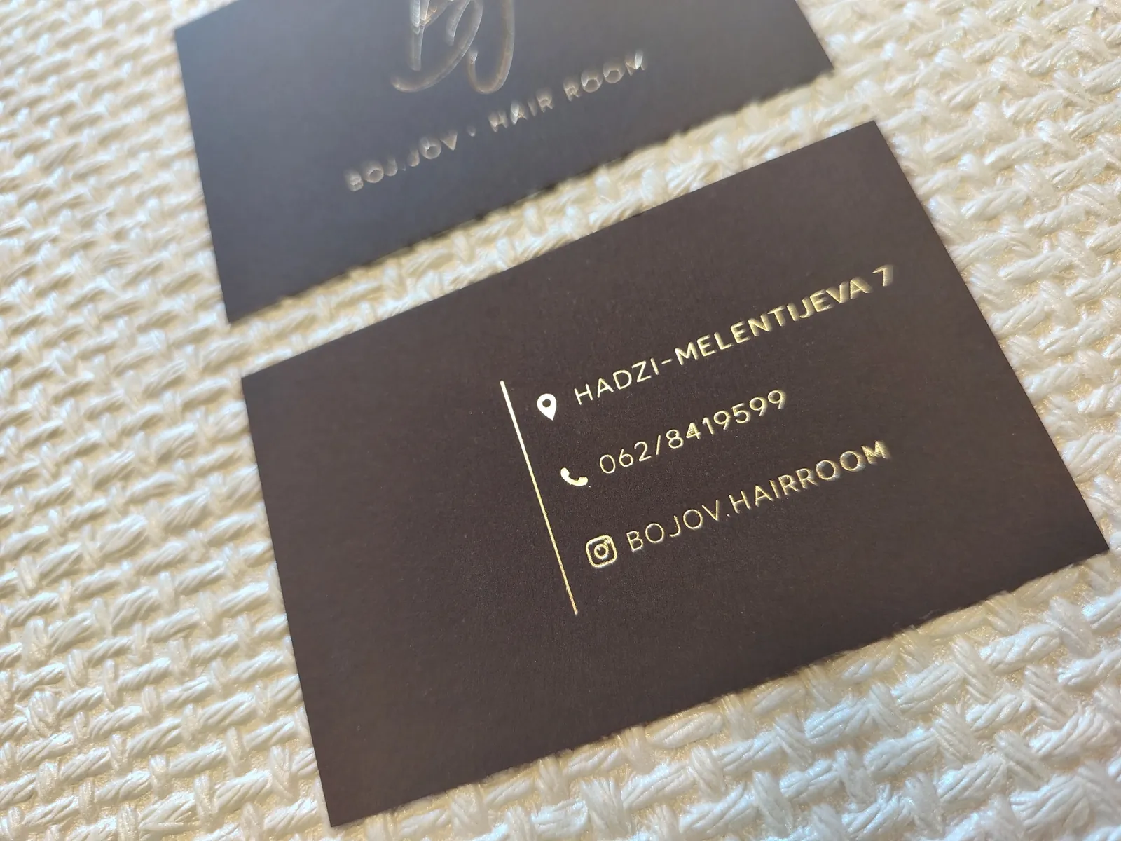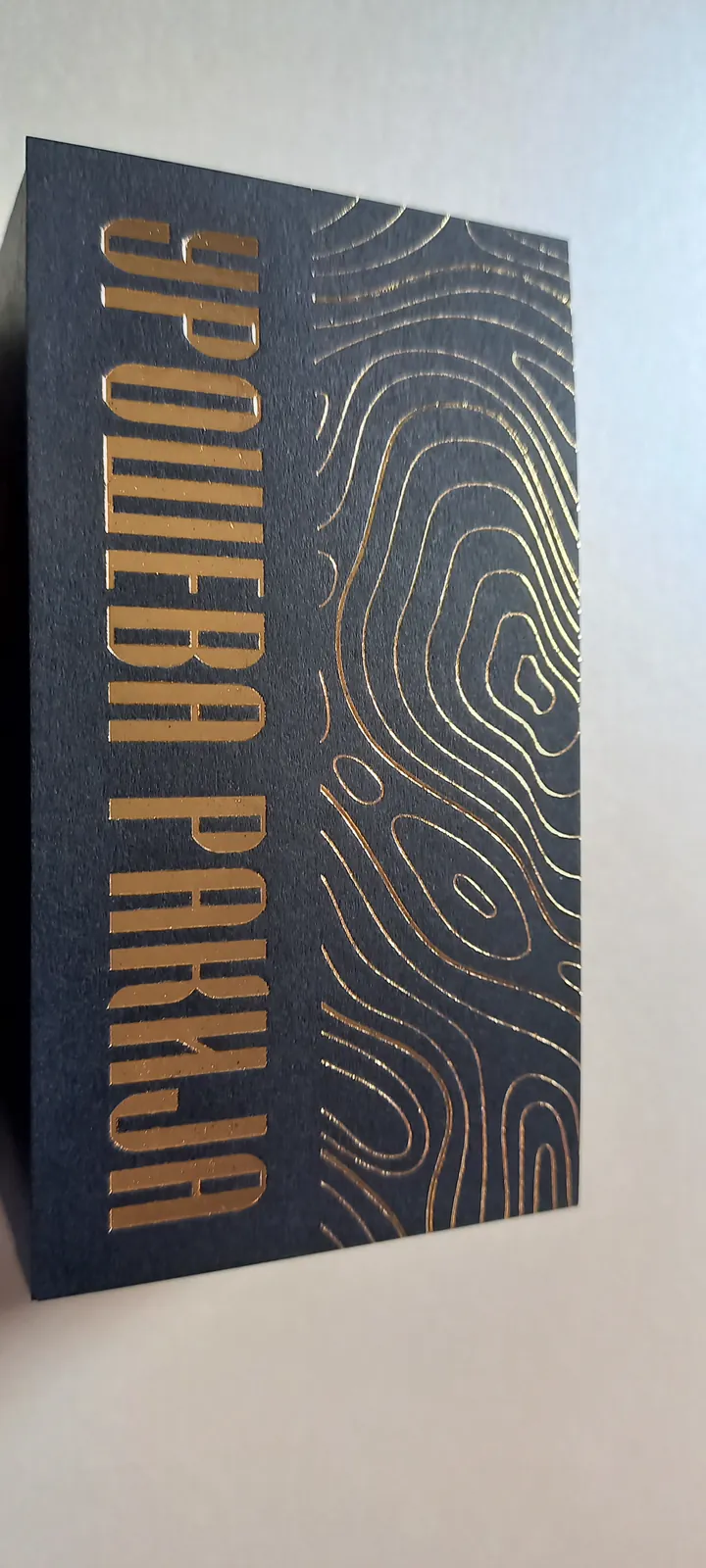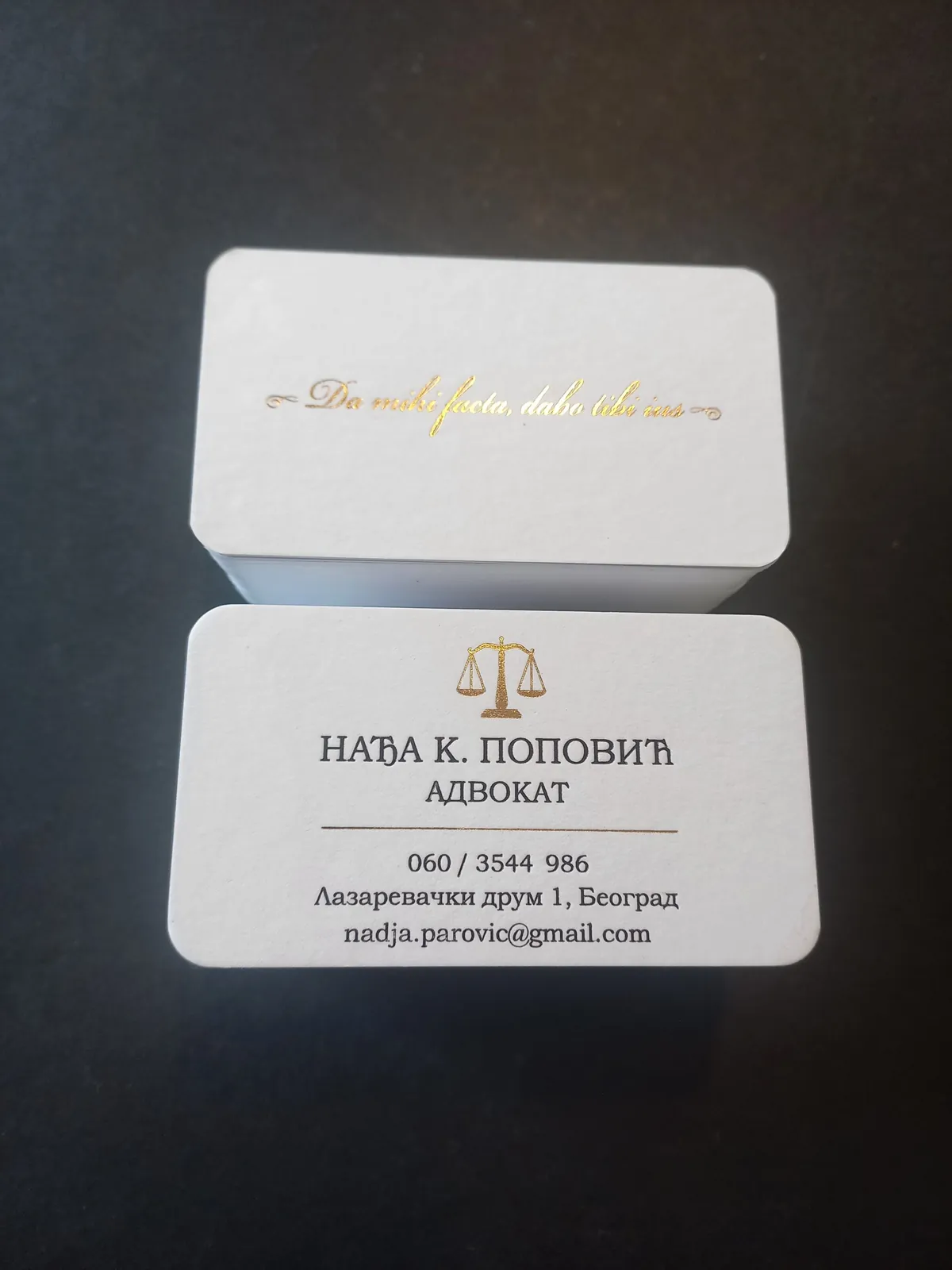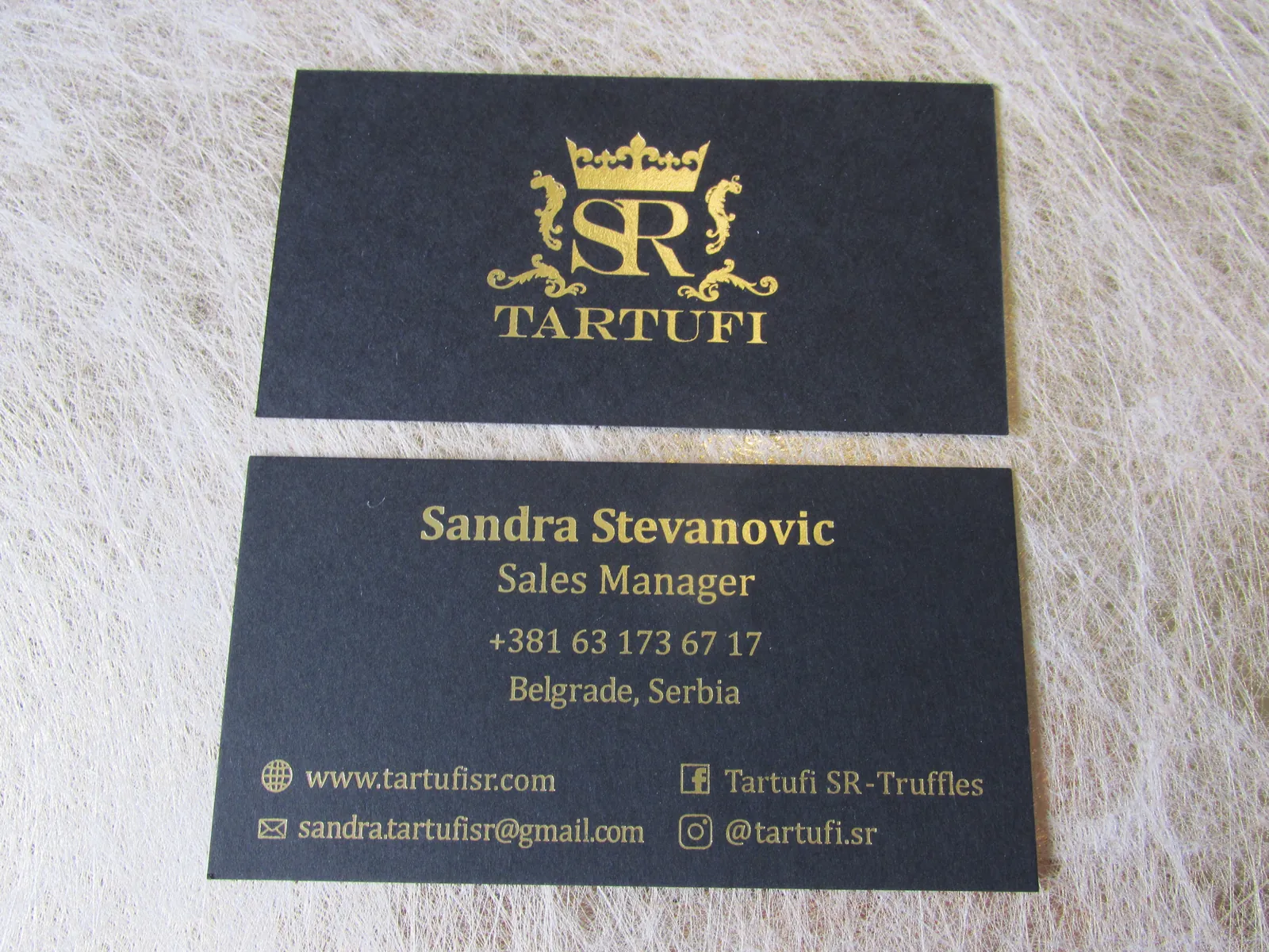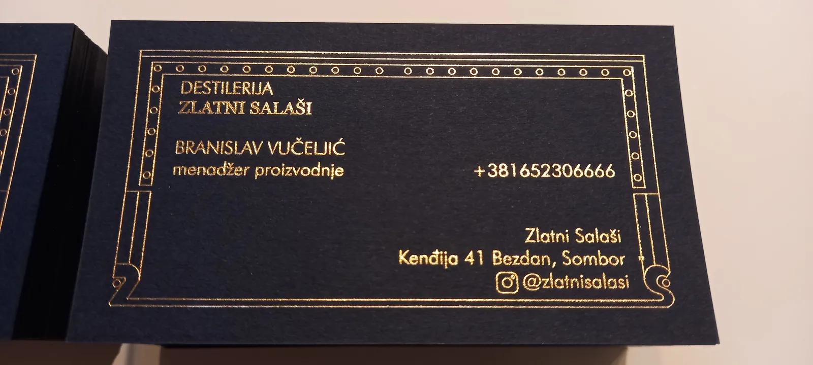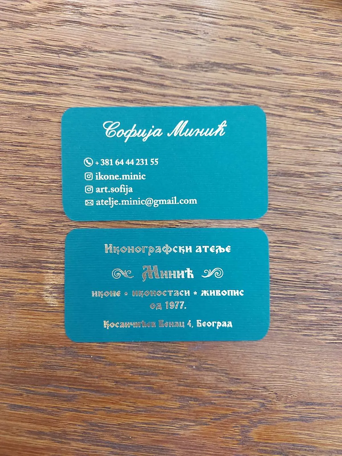 Za vizit karte sa zlatotiskom postali smo pravi stručnjaci, jer godinama najviše radimo baš ovakve vizit karte. Za ove otmene i luksuzne vizit karte u zlatotisku, obavezno se koriste italijanski papiri, boje po želji: bela, bež, crna u zadnje vreme najpopularnija, zelena, ljubičasta, bordo, teget...Grafičku pripremu vam možemo uraditi mi. Ukoliko želite vizit karte u zlatotisku, neophodna je priprema u vektorskom formatu, jer se po njoj prave klišei, a slova se otiskuju u zlatnoj foliji pod viskom temperaturom. Slova imaju izuzetan sjaj. Što se tiče čvrstine papira, u ovoj varijanti je moguće uraditi štampu i na dosta čvršćem papiru do 450 grama jer ova vrsta štampe to dozvoljava. Kao završnu obradu, predlažemo zaobljene ivice, to je stvar izbora, nekome se sviđa, nekome ne. Ceo tekst može se štampati samo na prednjoj strani, što je povoljnije. Naravno, može biti i obostrani zlatotisak.