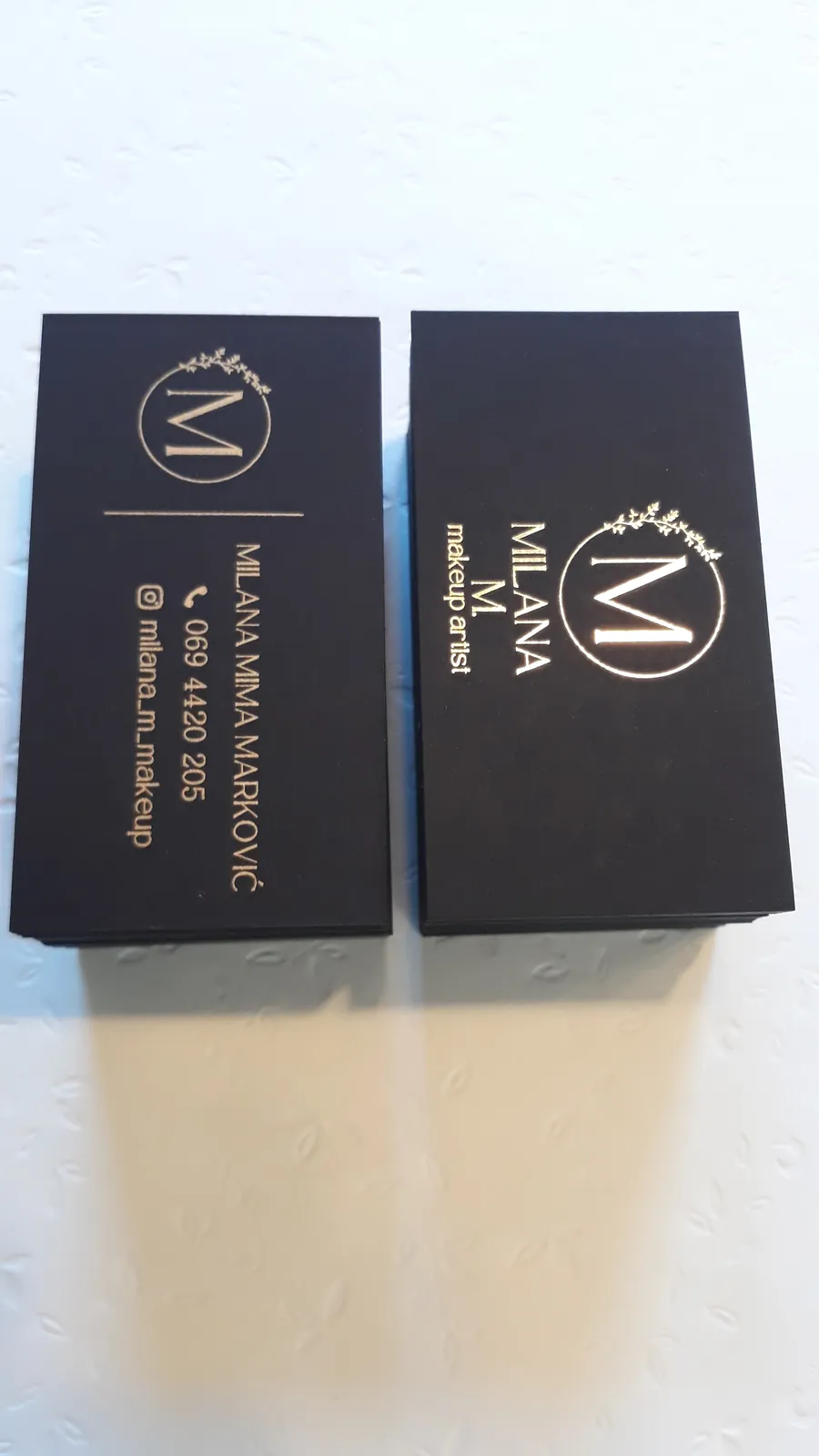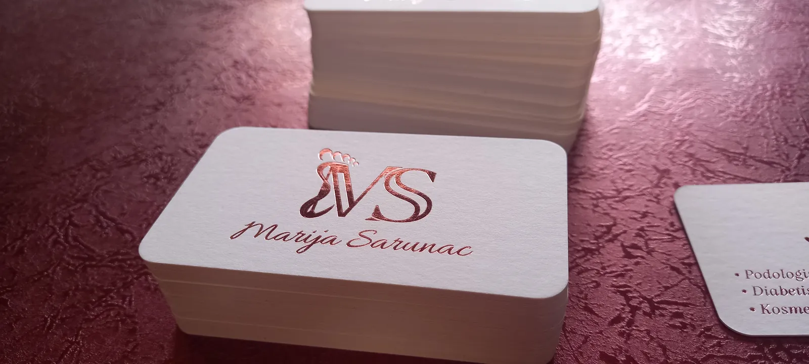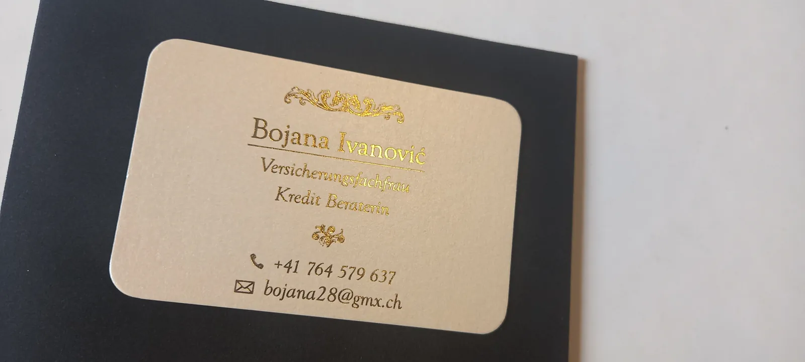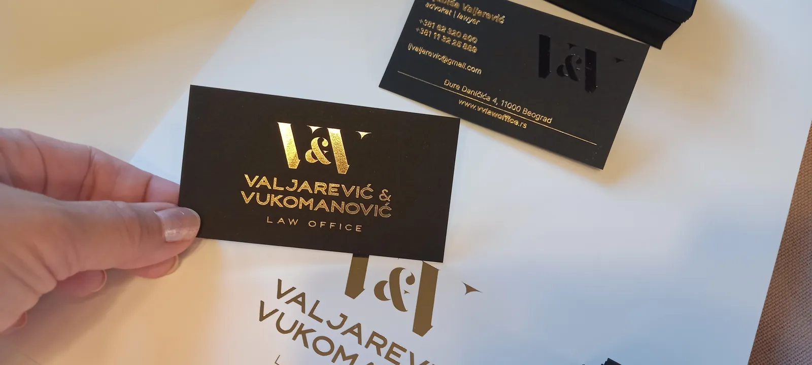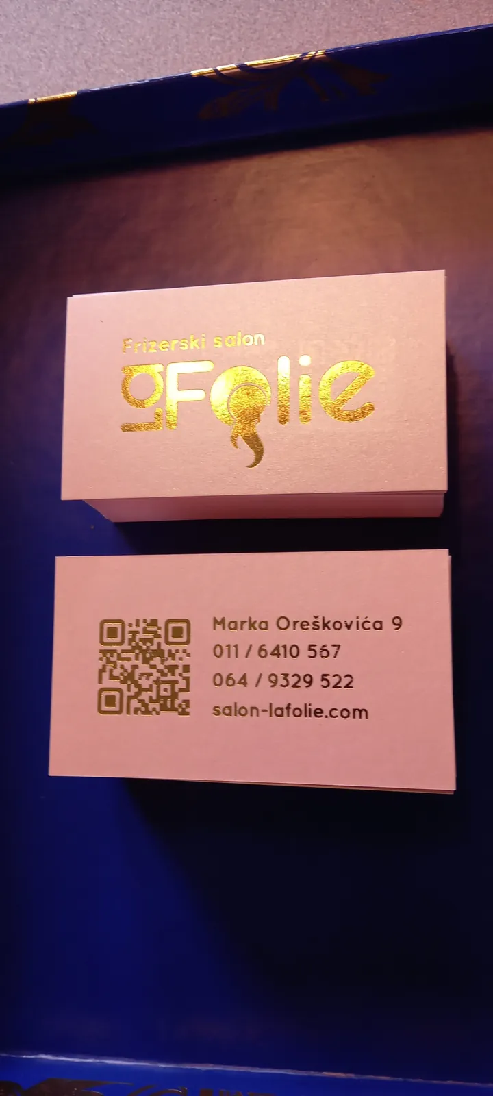 Za vizit karte sa zlatotiskom postali smo pravi stručnjaci, jer godinama najviše radimo baš ovakve vizit karte. Za ove otmene i luksuzne vizit karte u zlatotisku, obavezno se koriste italijanski papiri, boje po želji: bela, bež, crna u zadnje vreme najpopularnija, zelena, ljubičasta, bordo, teget...Grafičku pripremu vam možemo uraditi mi. Ukoliko želite vizit karte u zlatotisku, neophodna je priprema u vektorskom formatu, jer se po njoj prave klišei, a slova se otiskuju u zlatnoj foliji pod viskom temperaturom. Slova imaju izuzetan sjaj. Što se tiče čvrstine papira, u ovoj varijanti je moguće uraditi štampu i na dosta čvršćem papiru do 450 grama jer ova vrsta štampe to dozvoljava. Kao završnu obradu, predlažemo zaobljene ivice, to je stvar izbora, nekome se sviđa, nekome ne. Ceo tekst može se štampati samo na prednjoj strani, što je povoljnije. Naravno, može biti i obostrani zlatotisak.