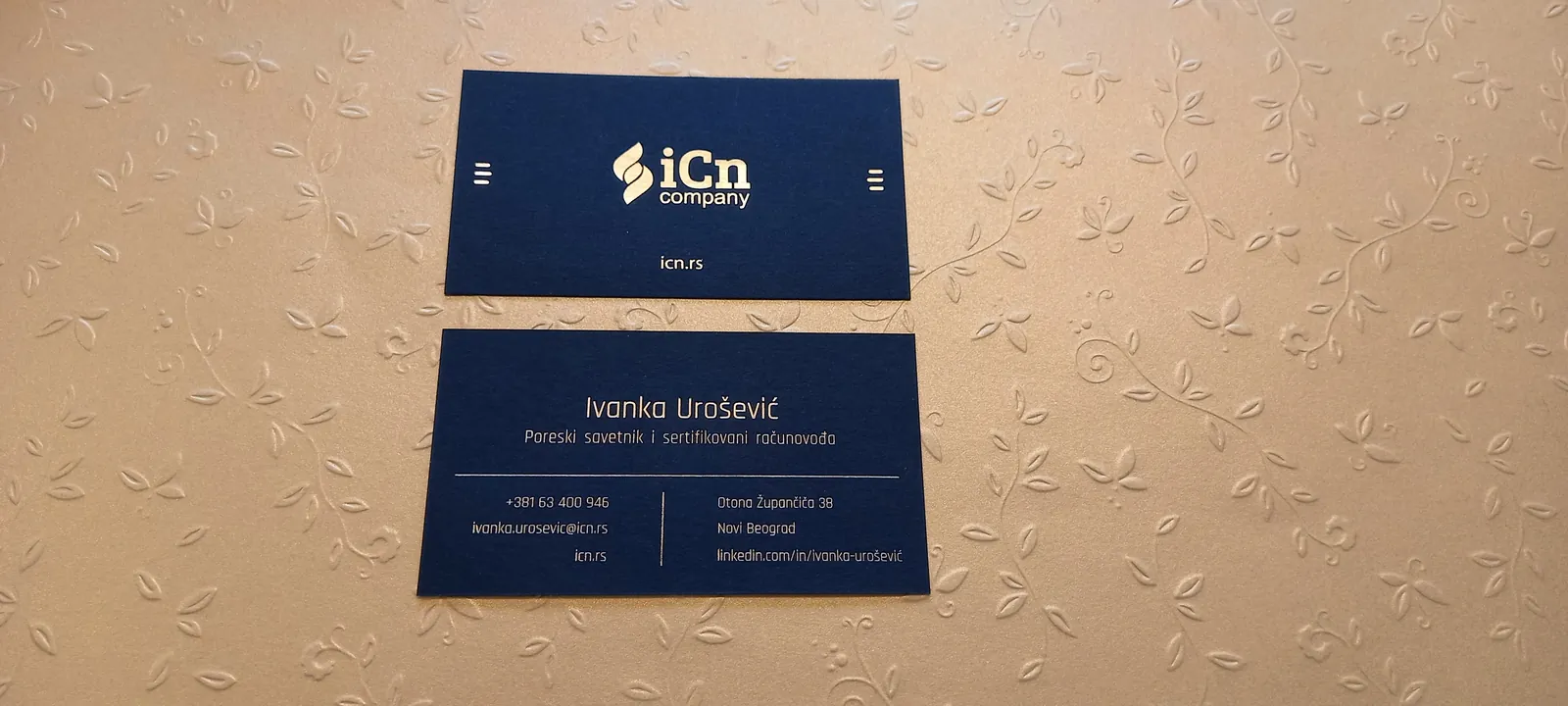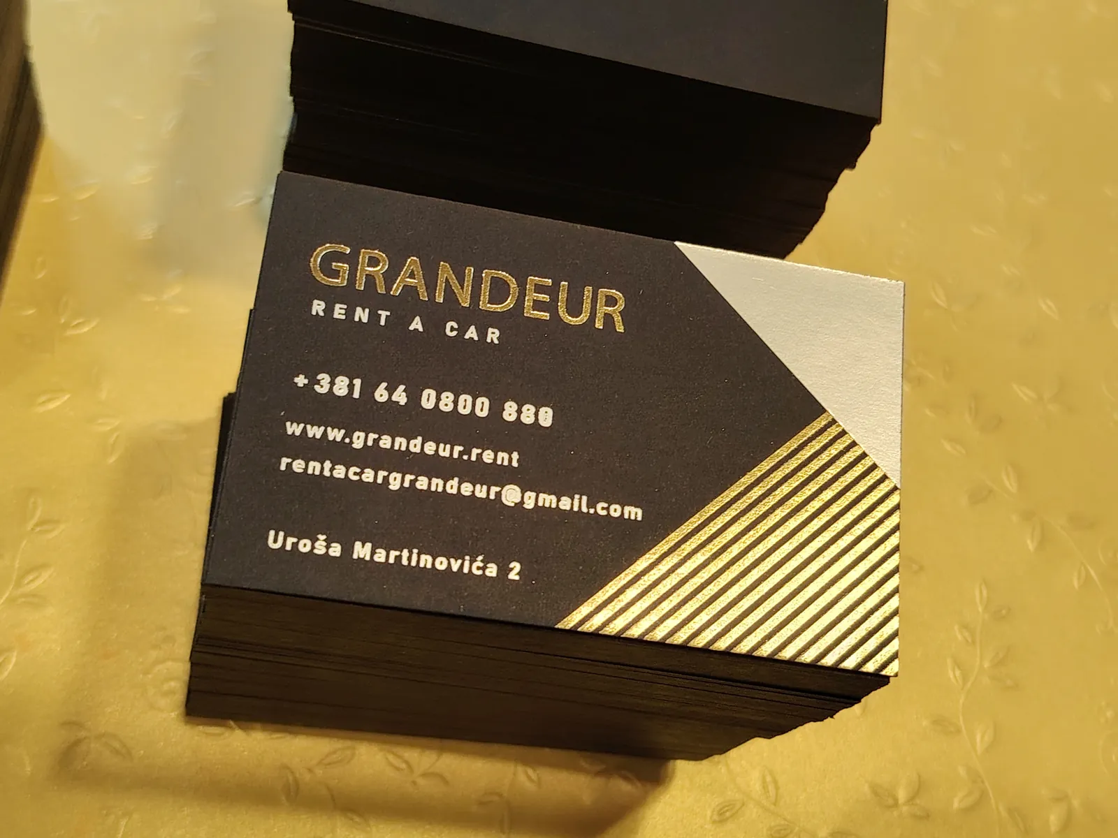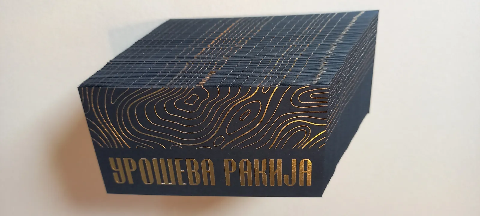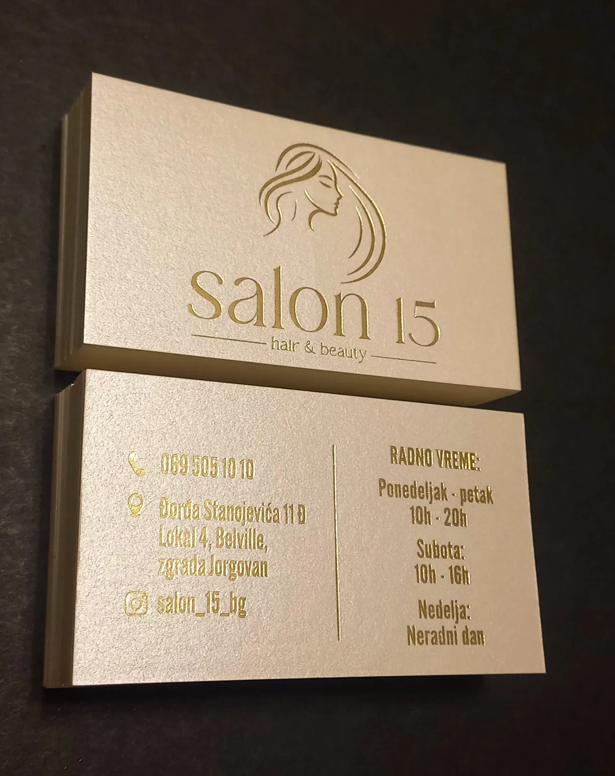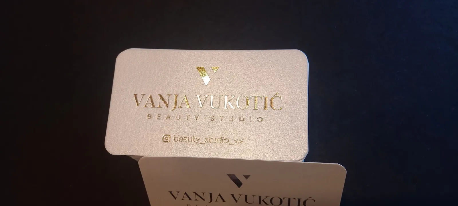 Za vizit karte sa zlatotiskom postali smo pravi stručnjaci, jer godinama najviše radimo baš ovakve vizit karte. Za ove otmene i luksuzne vizit karte u zlatotisku, obavezno se koriste italijanski papiri, boje po želji: bela, bež, crna u zadnje vreme najpopularnija, zelena, ljubičasta, bordo, teget...Grafičku pripremu vam možemo uraditi mi. Ukoliko želite vizit karte u zlatotisku, neophodna je priprema u vektorskom formatu, jer se po njoj prave klišei, a slova se otiskuju u zlatnoj foliji pod viskom temperaturom. Slova imaju izuzetan sjaj. Što se tiče čvrstine papira, u ovoj varijanti je moguće uraditi štampu i na dosta čvršćem papiru do 450 grama jer ova vrsta štampe to dozvoljava. Kao završnu obradu, predlažemo zaobljene ivice, to je stvar izbora, nekome se sviđa, nekome ne. Ceo tekst može se štampati samo na prednjoj strani, što je povoljnije. Naravno, može biti i obostrani zlatotisak.