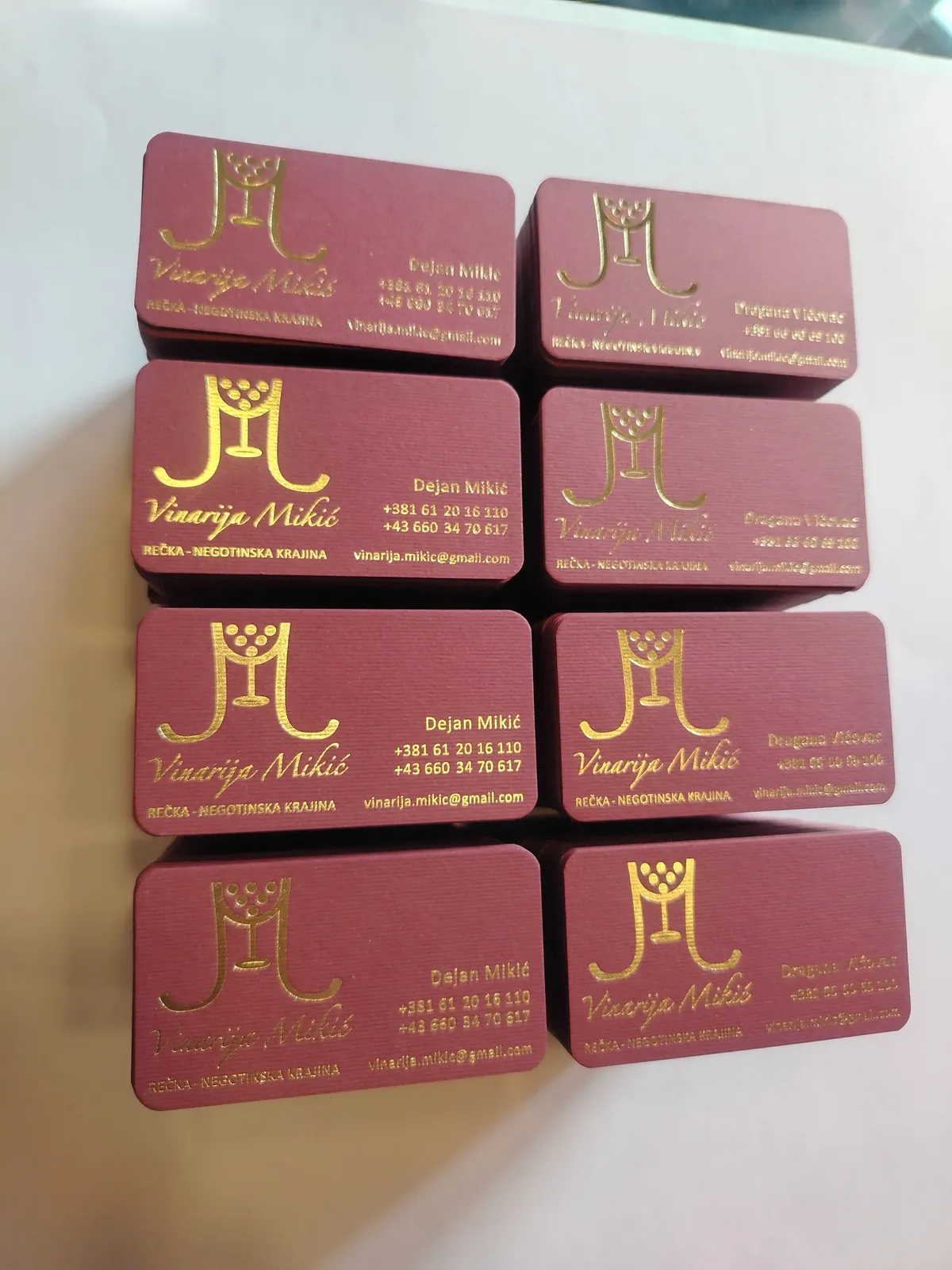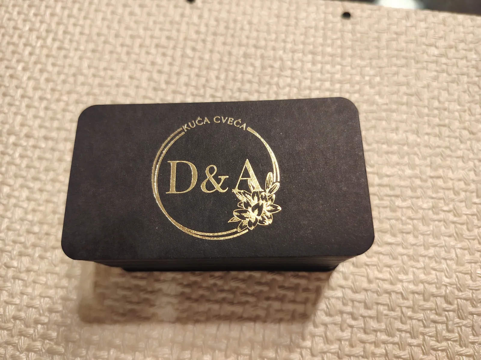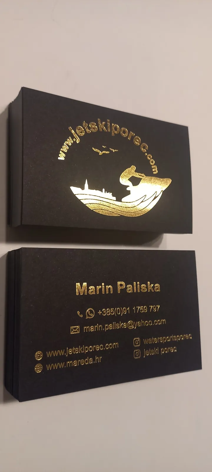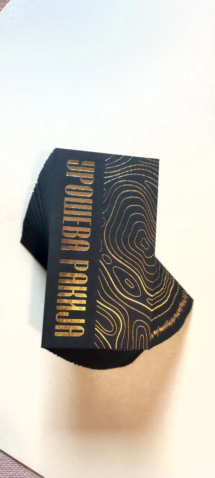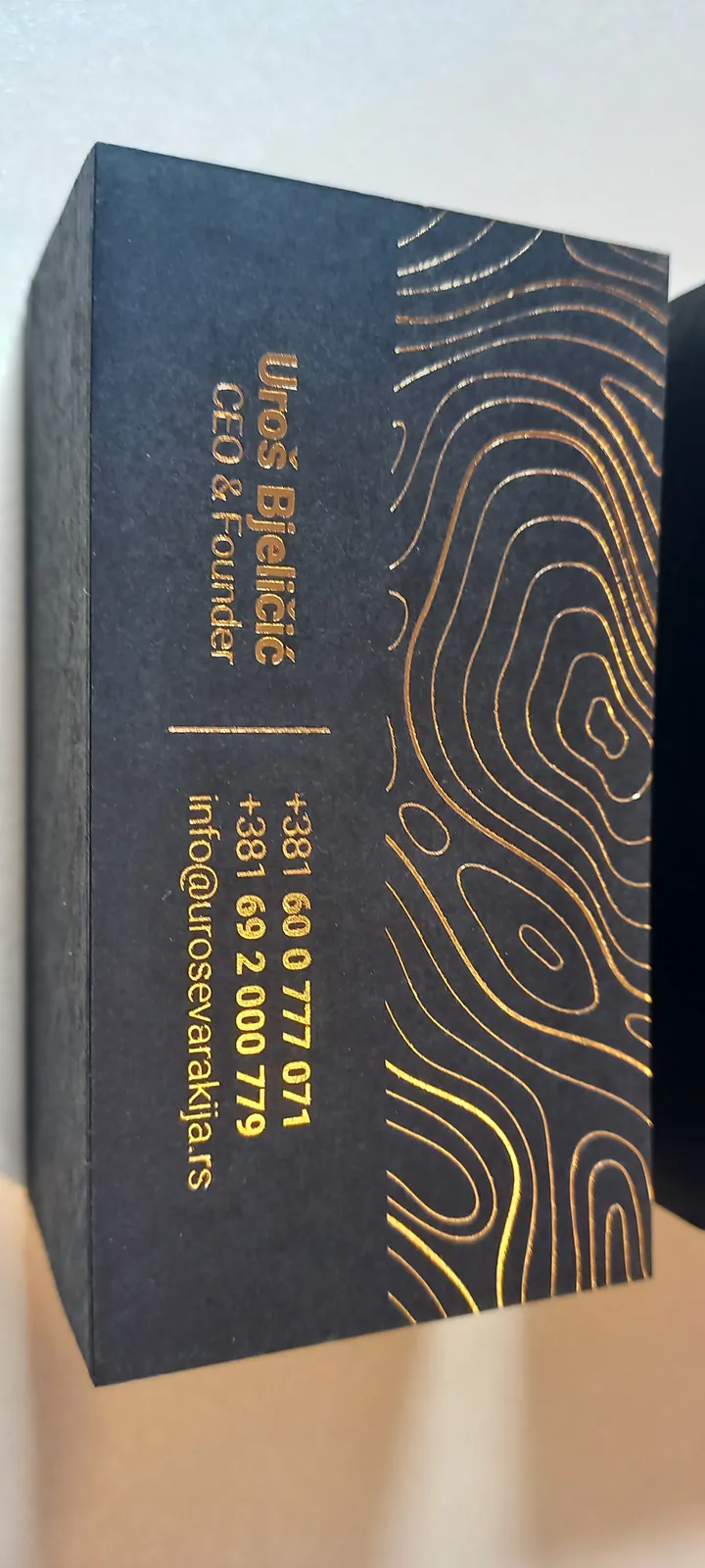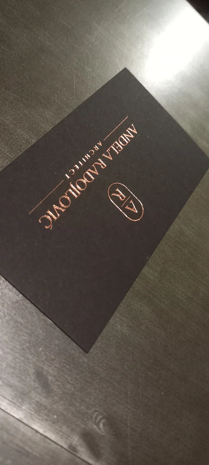 Za vizit karte sa zlatotiskom postali smo pravi stručnjaci, jer godinama najviše radimo baš ovakve vizit karte. Za ove otmene i luksuzne vizit karte u zlatotisku, obavezno se koriste italijanski papiri, boje po želji: bela, bež, crna u zadnje vreme najpopularnija, zelena, ljubičasta, bordo, teget...Grafičku pripremu vam možemo uraditi mi. Ukoliko želite vizit karte u zlatotisku, neophodna je priprema u vektorskom formatu, jer se po njoj prave klišei, a slova se otiskuju u zlatnoj foliji pod viskom temperaturom. Slova imaju izuzetan sjaj. Što se tiče čvrstine papira, u ovoj varijanti je moguće uraditi štampu i na dosta čvršćem papiru do 450 grama jer ova vrsta štampe to dozvoljava. Kao završnu obradu, predlažemo zaobljene ivice, to je stvar izbora, nekome se sviđa, nekome ne. Ceo tekst može se štampati samo na prednjoj strani, što je povoljnije. Naravno, može biti i obostrani zlatotisak.