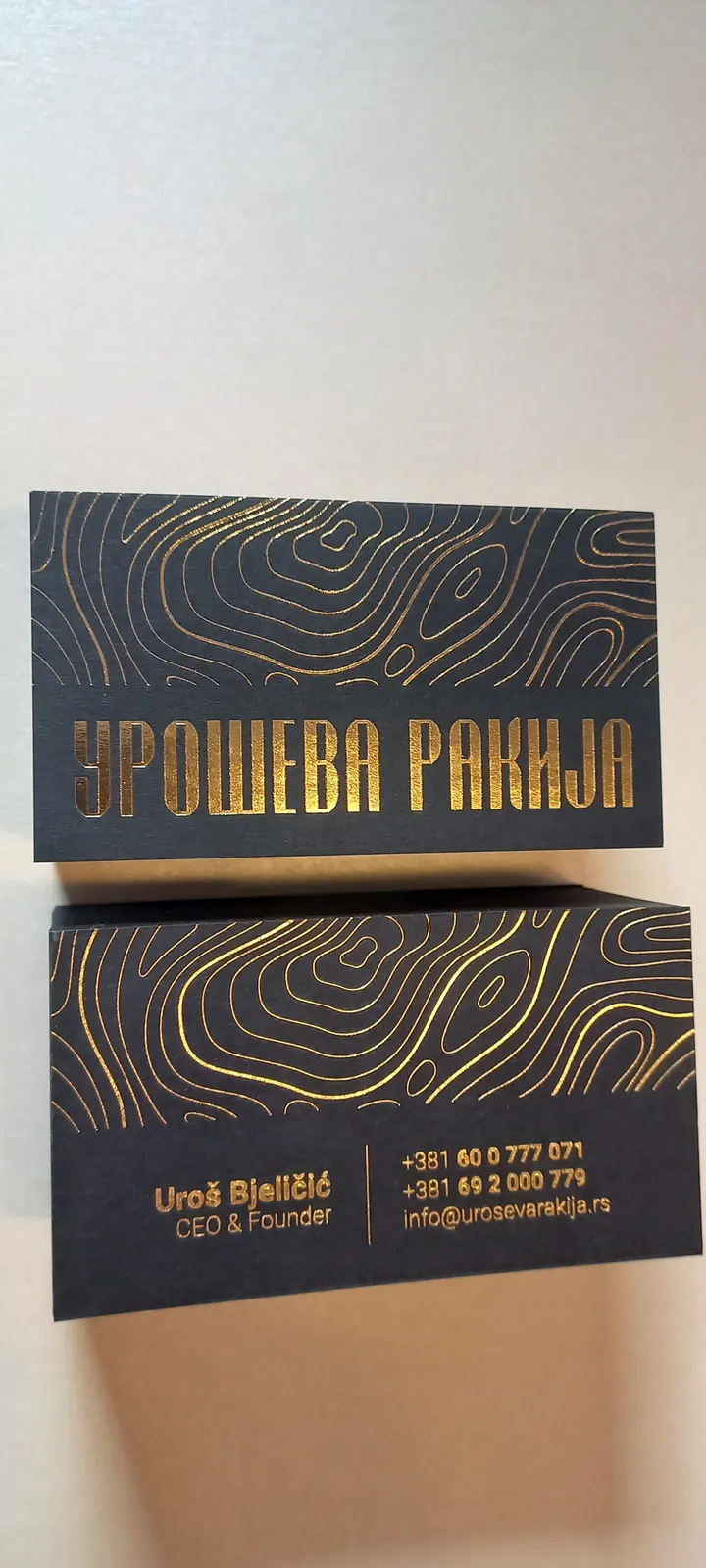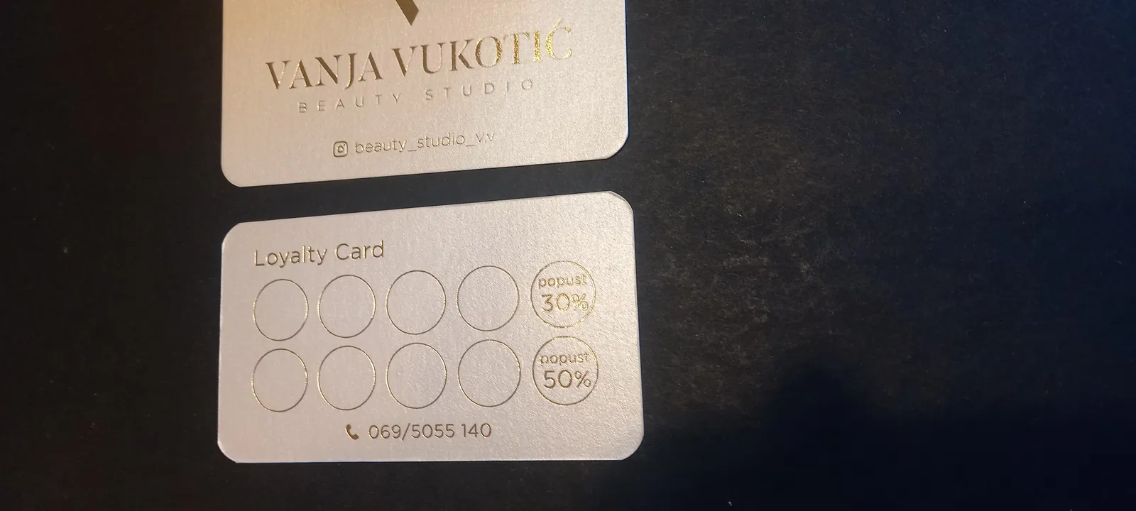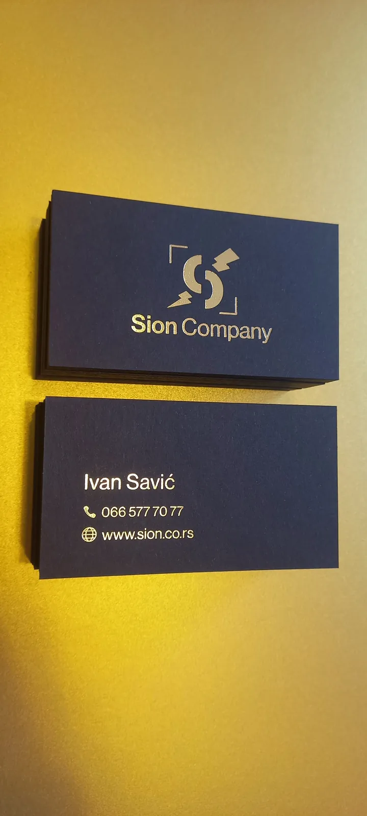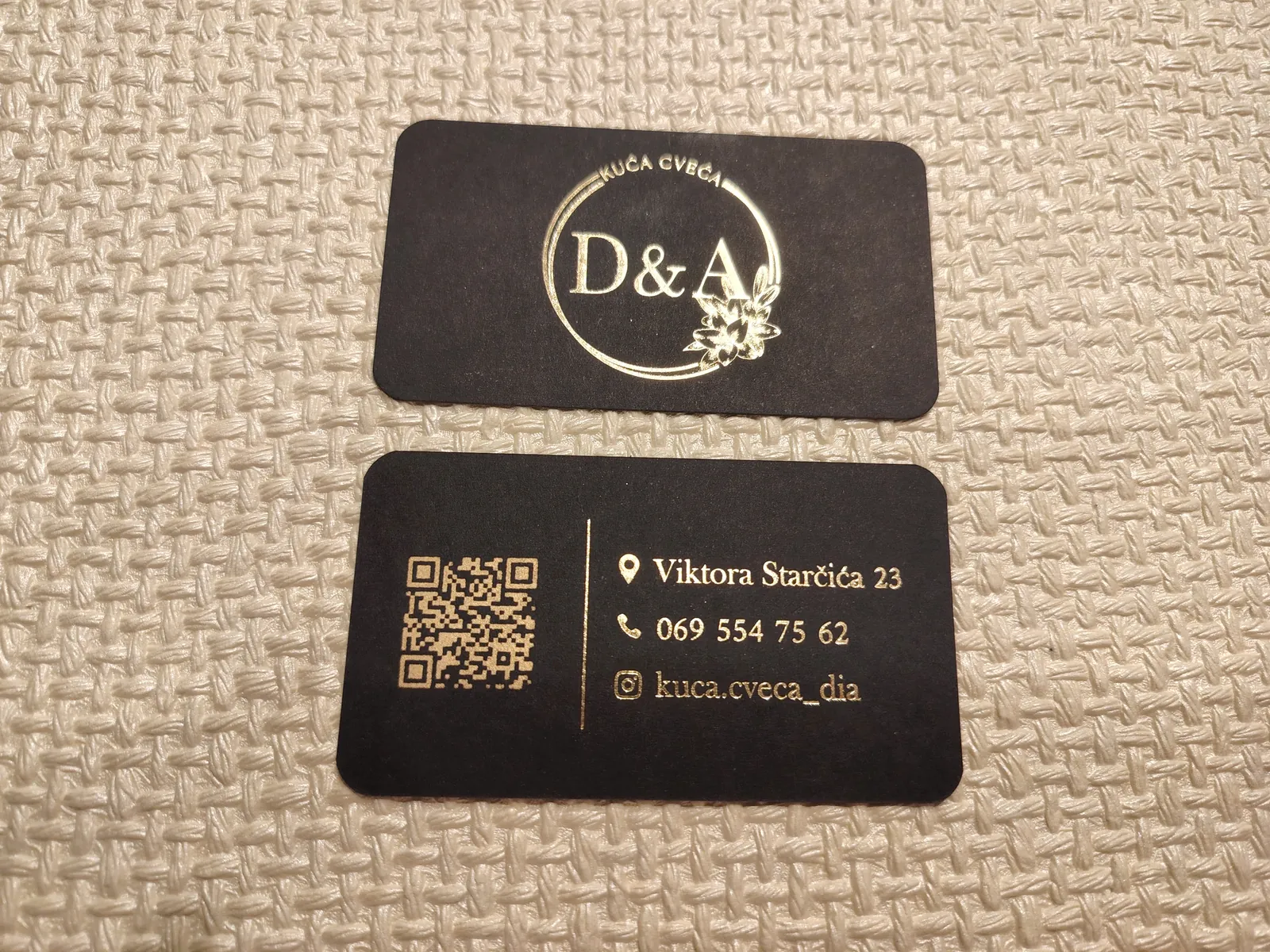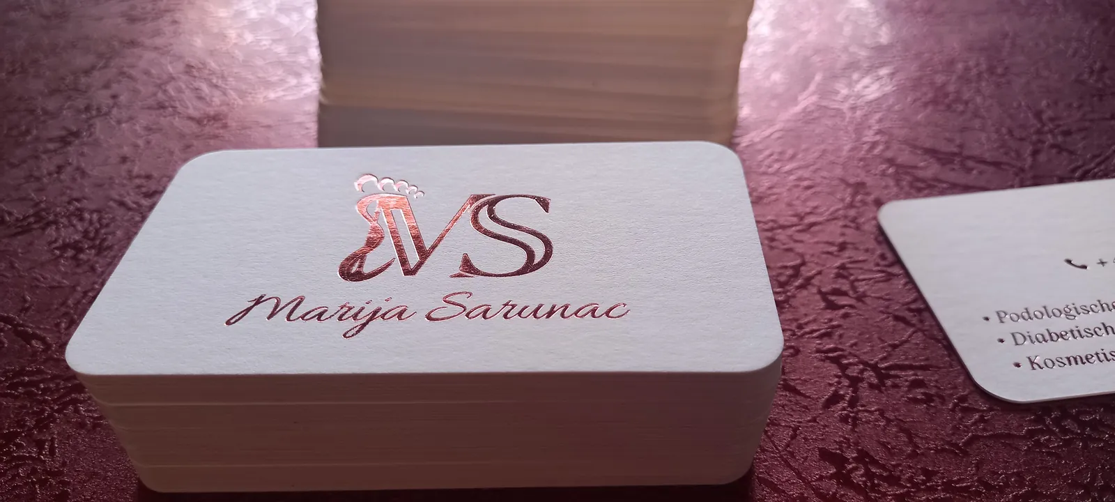 Za vizit karte sa zlatotiskom postali smo pravi stručnjaci, jer godinama najviše radimo baš ovakve vizit karte. Za ove otmene i luksuzne vizit karte u zlatotisku, obavezno se koriste italijanski papiri, boje po želji: bela, bež, crna u zadnje vreme najpopularnija, zelena, ljubičasta, bordo, teget...Grafičku pripremu vam možemo uraditi mi. Ukoliko želite vizit karte u zlatotisku, neophodna je priprema u vektorskom formatu, jer se po njoj prave klišei, a slova se otiskuju u zlatnoj foliji pod viskom temperaturom. Slova imaju izuzetan sjaj. Što se tiče čvrstine papira, u ovoj varijanti je moguće uraditi štampu i na dosta čvršćem papiru do 450 grama jer ova vrsta štampe to dozvoljava. Kao završnu obradu, predlažemo zaobljene ivice, to je stvar izbora, nekome se sviđa, nekome ne. Ceo tekst može se štampati samo na prednjoj strani, što je povoljnije. Naravno, može biti i obostrani zlatotisak.