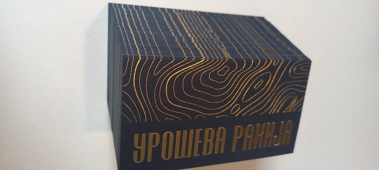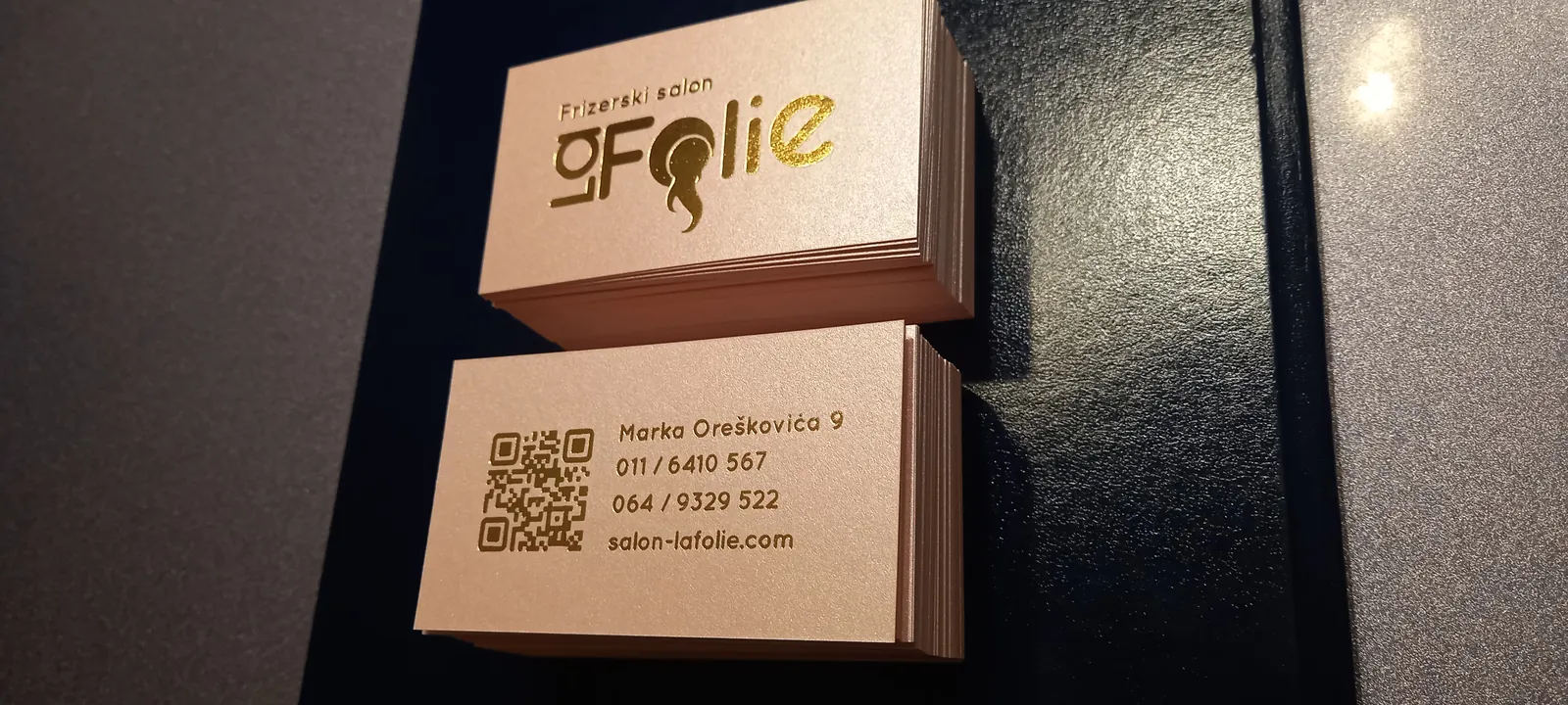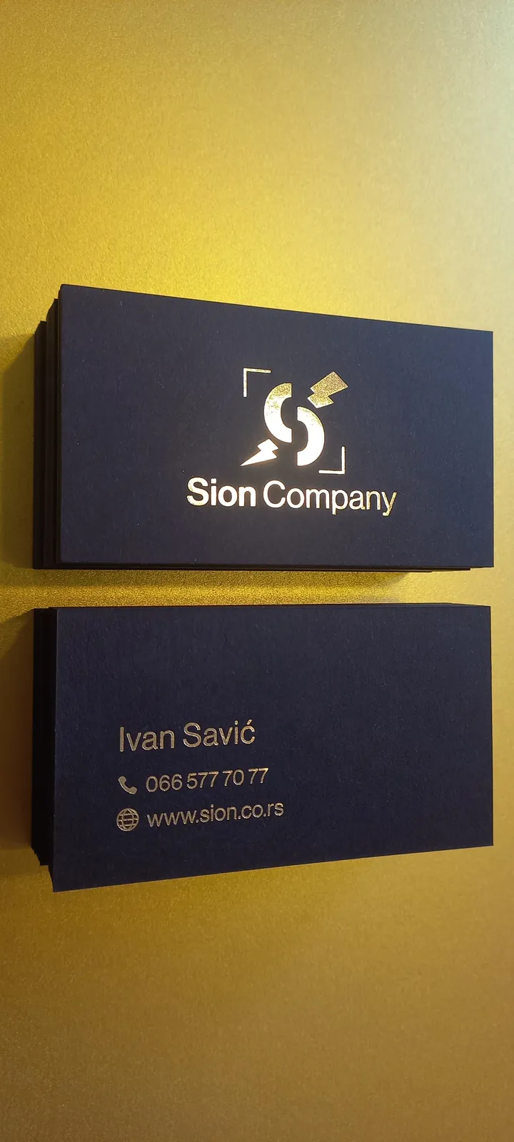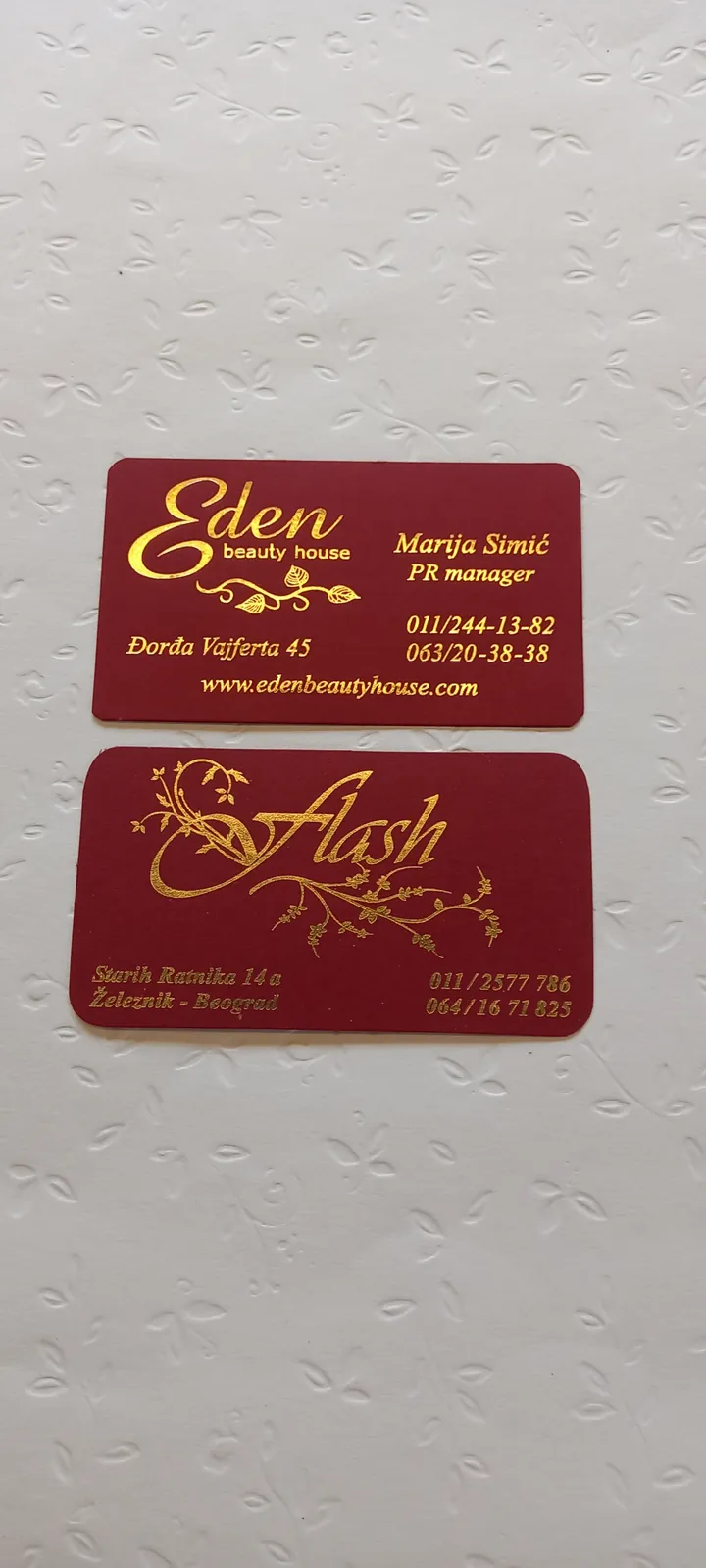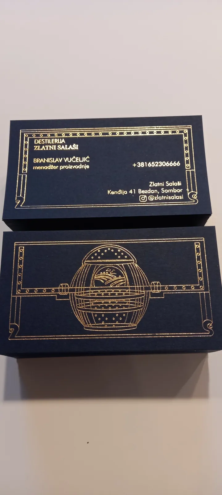 Za vizit karte sa zlatotiskom postali smo pravi stručnjaci, jer godinama najviše radimo baš ovakve vizit karte. Za ove otmene i luksuzne vizit karte u zlatotisku, obavezno se koriste italijanski papiri, boje po želji: bela, bež, crna u zadnje vreme najpopularnija, zelena, ljubičasta, bordo, teget...Grafičku pripremu vam možemo uraditi mi. Ukoliko želite vizit karte u zlatotisku, neophodna je priprema u vektorskom formatu, jer se po njoj prave klišei, a slova se otiskuju u zlatnoj foliji pod viskom temperaturom. Slova imaju izuzetan sjaj. Što se tiče čvrstine papira, u ovoj varijanti je moguće uraditi štampu i na dosta čvršćem papiru do 450 grama jer ova vrsta štampe to dozvoljava. Kao završnu obradu, predlažemo zaobljene ivice, to je stvar izbora, nekome se sviđa, nekome ne. Ceo tekst može se štampati samo na prednjoj strani, što je povoljnije. Naravno, može biti i obostrani zlatotisak.