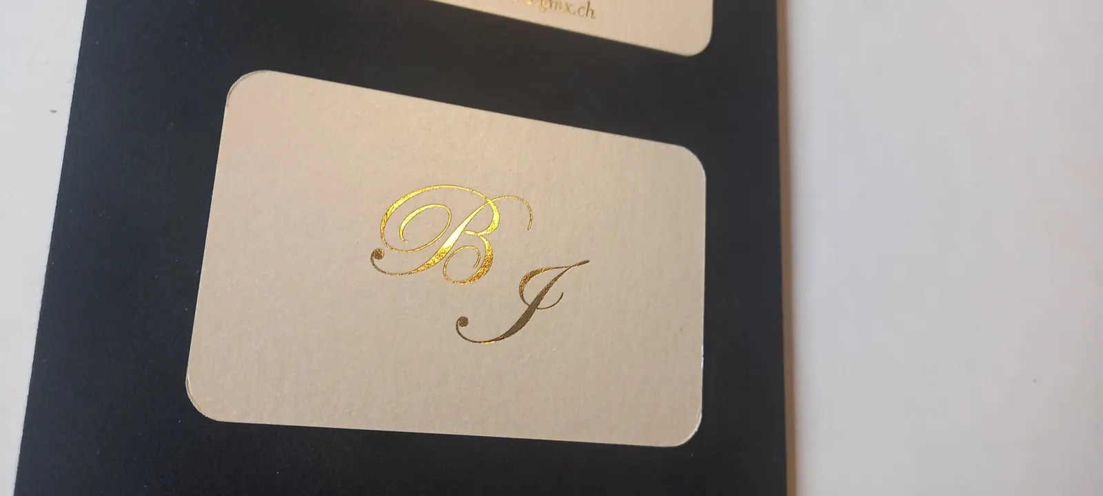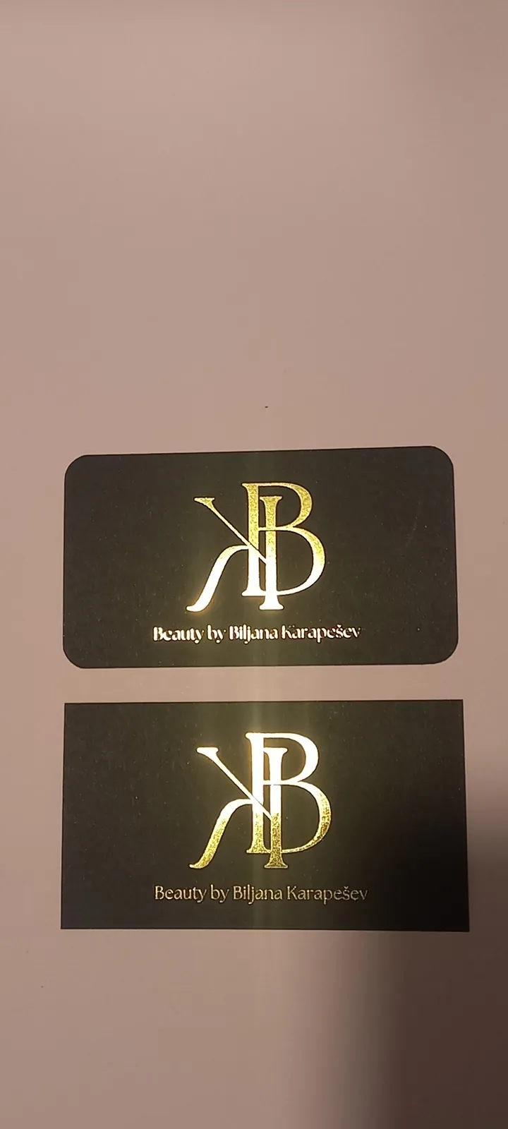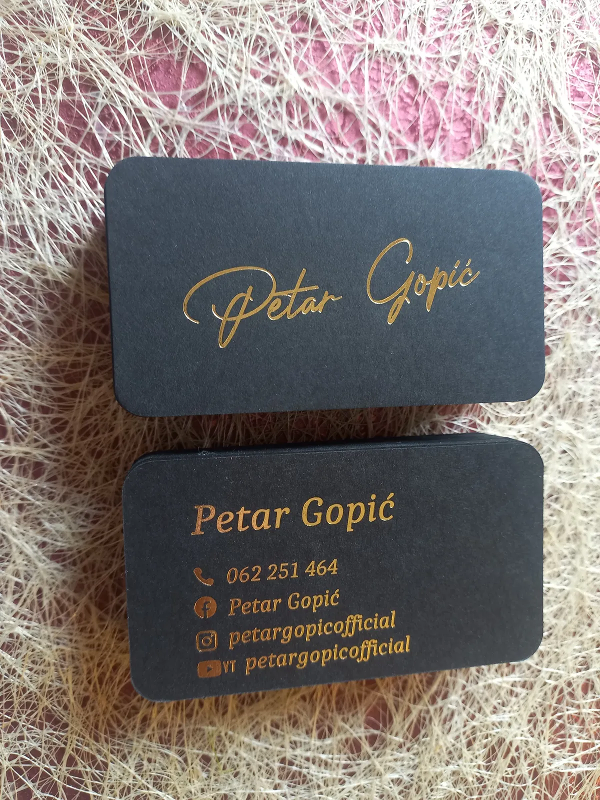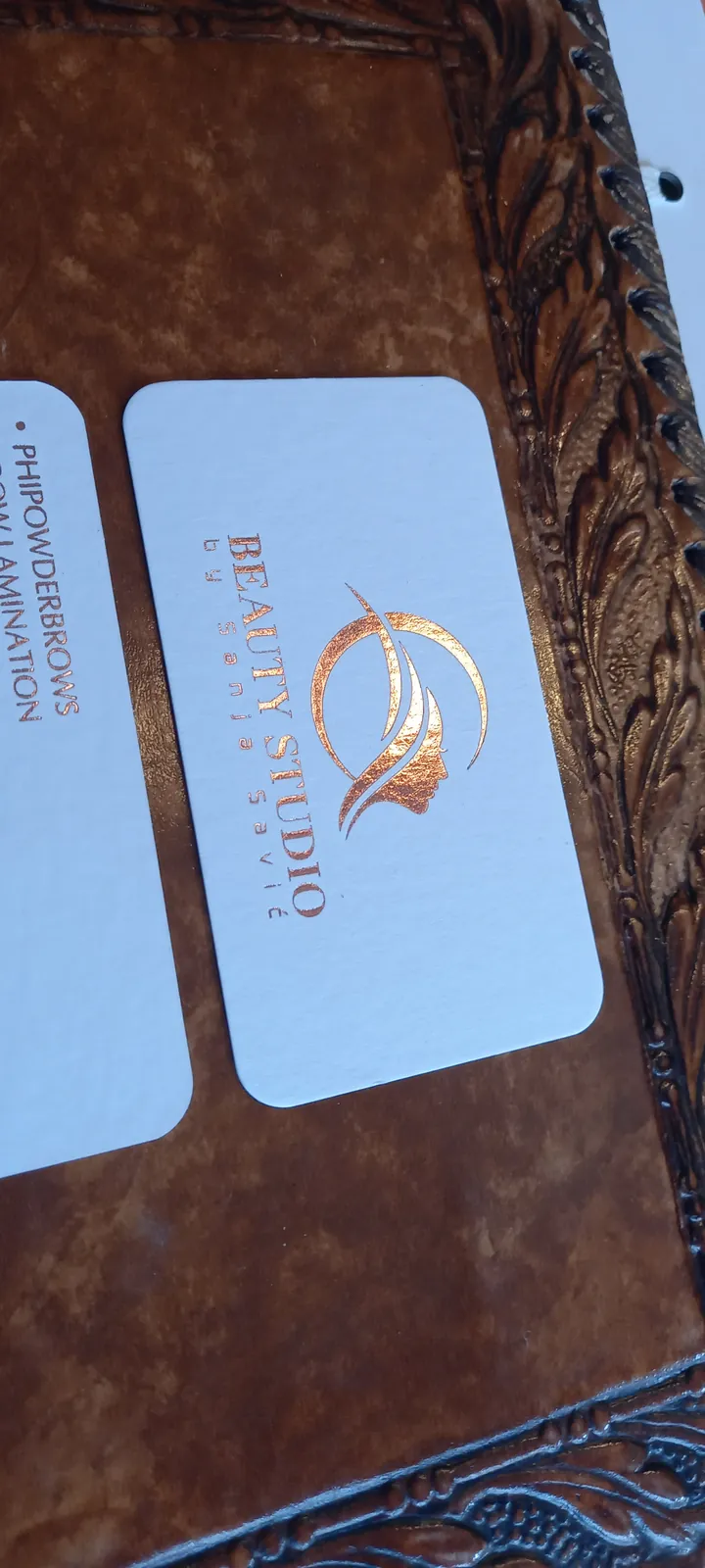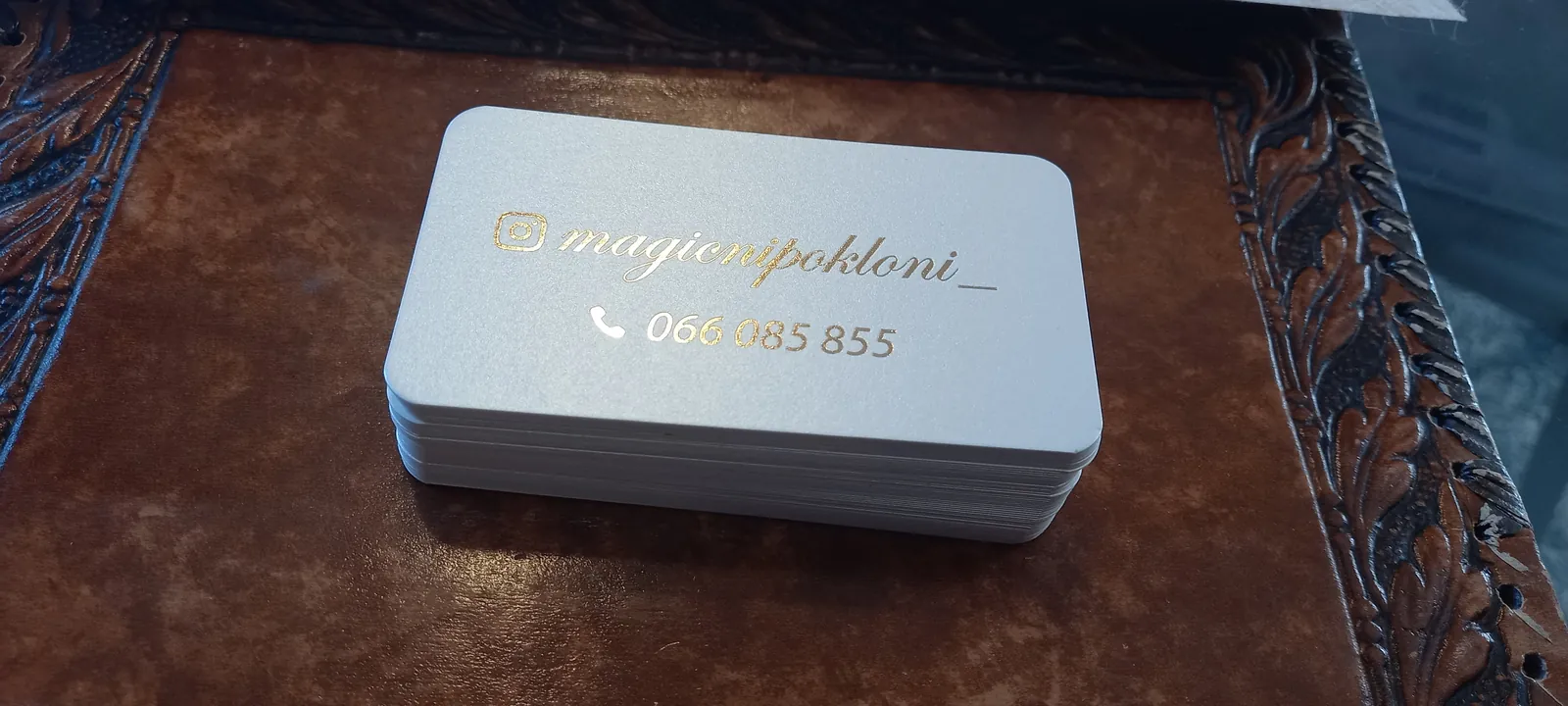 Za vizit karte sa zlatotiskom postali smo pravi stručnjaci, jer godinama najviše radimo baš ovakve vizit karte. Za ove otmene i luksuzne vizit karte u zlatotisku, obavezno se koriste italijanski papiri, boje po želji: bela, bež, crna u zadnje vreme najpopularnija, zelena, ljubičasta, bordo, teget...Grafičku pripremu vam možemo uraditi mi. Ukoliko želite vizit karte u zlatotisku, neophodna je priprema u vektorskom formatu, jer se po njoj prave klišei, a slova se otiskuju u zlatnoj foliji pod viskom temperaturom. Slova imaju izuzetan sjaj. Što se tiče čvrstine papira, u ovoj varijanti je moguće uraditi štampu i na dosta čvršćem papiru do 450 grama jer ova vrsta štampe to dozvoljava. Kao završnu obradu, predlažemo zaobljene ivice, to je stvar izbora, nekome se sviđa, nekome ne. Ceo tekst može se štampati samo na prednjoj strani, što je povoljnije. Naravno, može biti i obostrani zlatotisak.